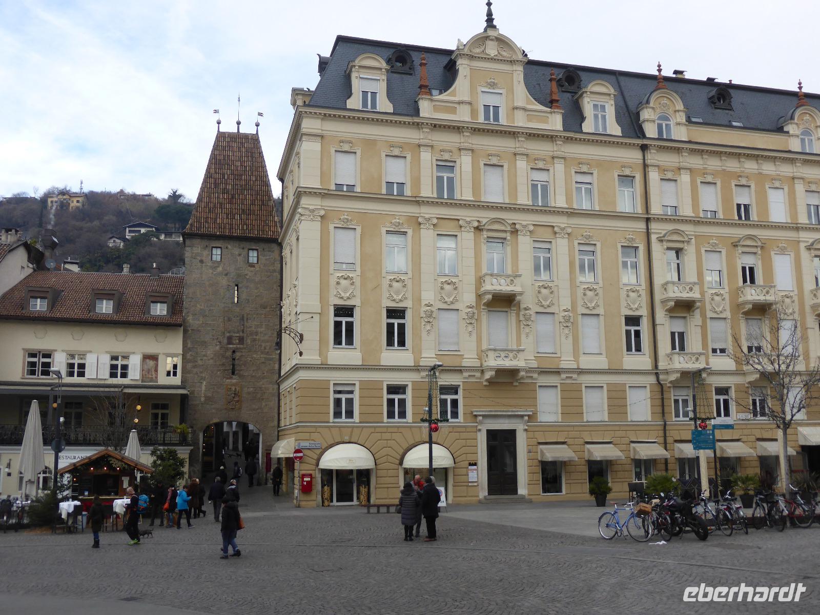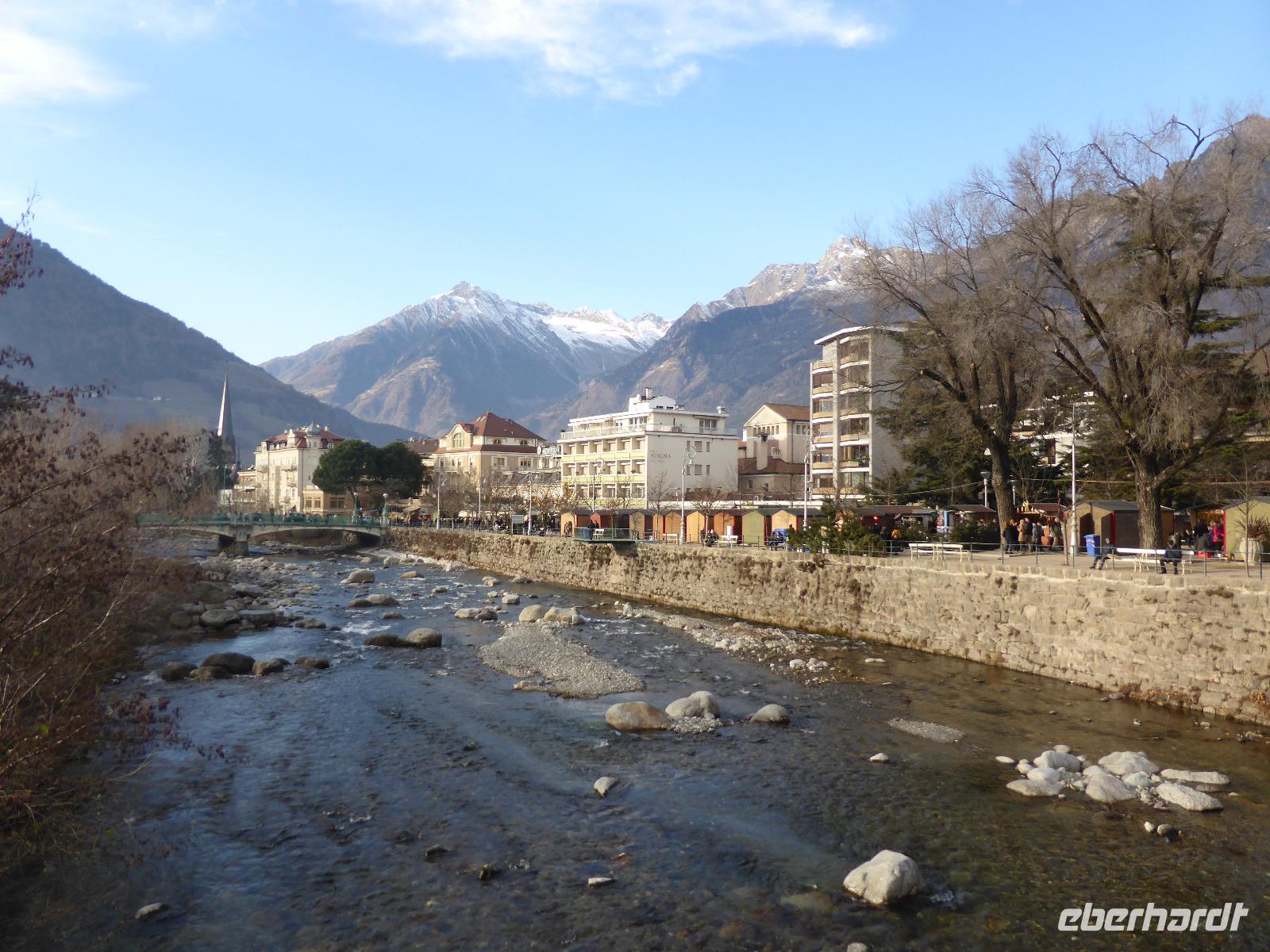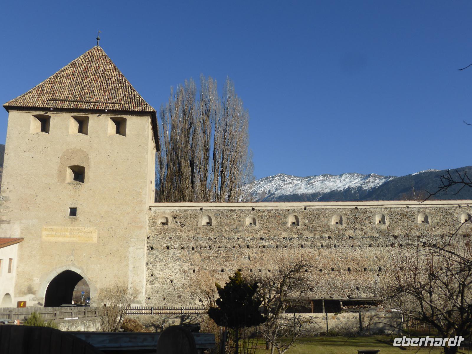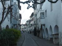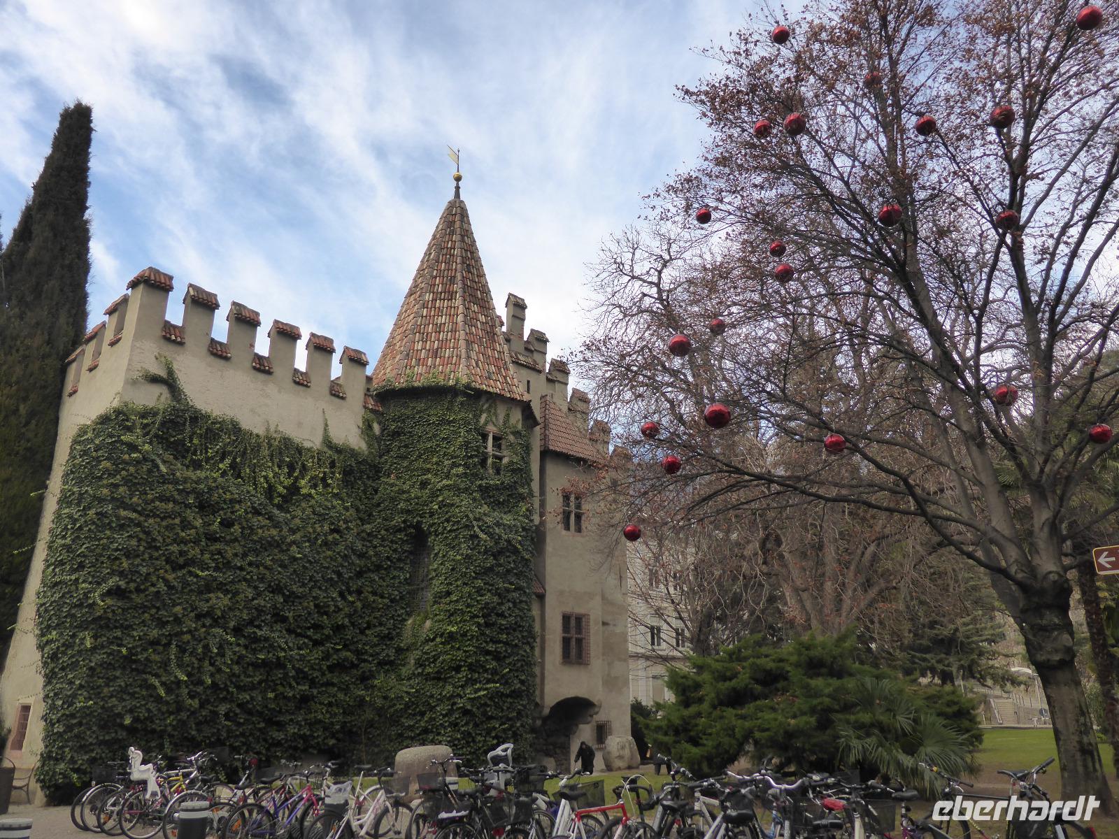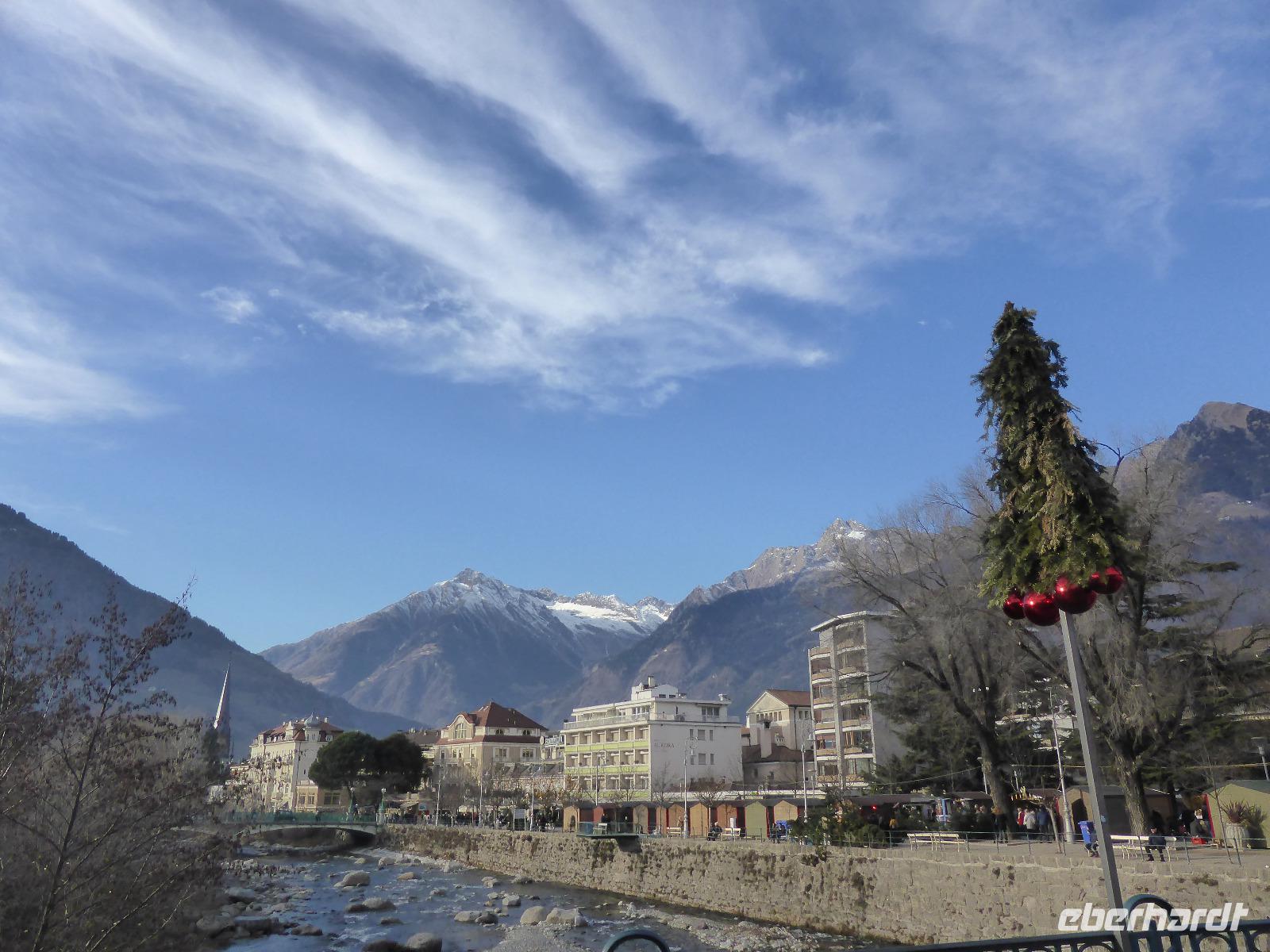 Über den Schlossweg und den Besuch der Pfarrkirche gelangten wir zurück zum Bus. Nach einer kurzen Fahrt erreichten wir die einstige Hauptstadt Tirols - Meran. In Meran unternahmen wir ein Stadtspaziergang entlang der Kurpromenade zum Bozner Tor. Das Bozner Tor ist eines von noch drei erhaltenen Stadttoren und mit Reliefwappen von Östereich, Tirol und Meran geschmückt. Am Pfarrplatz besuchten wir die Kirche St. Nikolaus mit dem 80 m hohen Turm. Durch die berühmte Laubengasse erreichten wir den Weihnachtsmarkt. Die weihnachtliche Stimmung in Meran ging sehr schnell auf uns über. Nach der Zeit zur freien Verfügung spazierten wir über das Stadttheater zurück zur modernen Therme. An diesem architektonischen Glanzstück aus Stahl und Glas erwartete uns bereits Bernd zur Fahrt ins Hotel.
