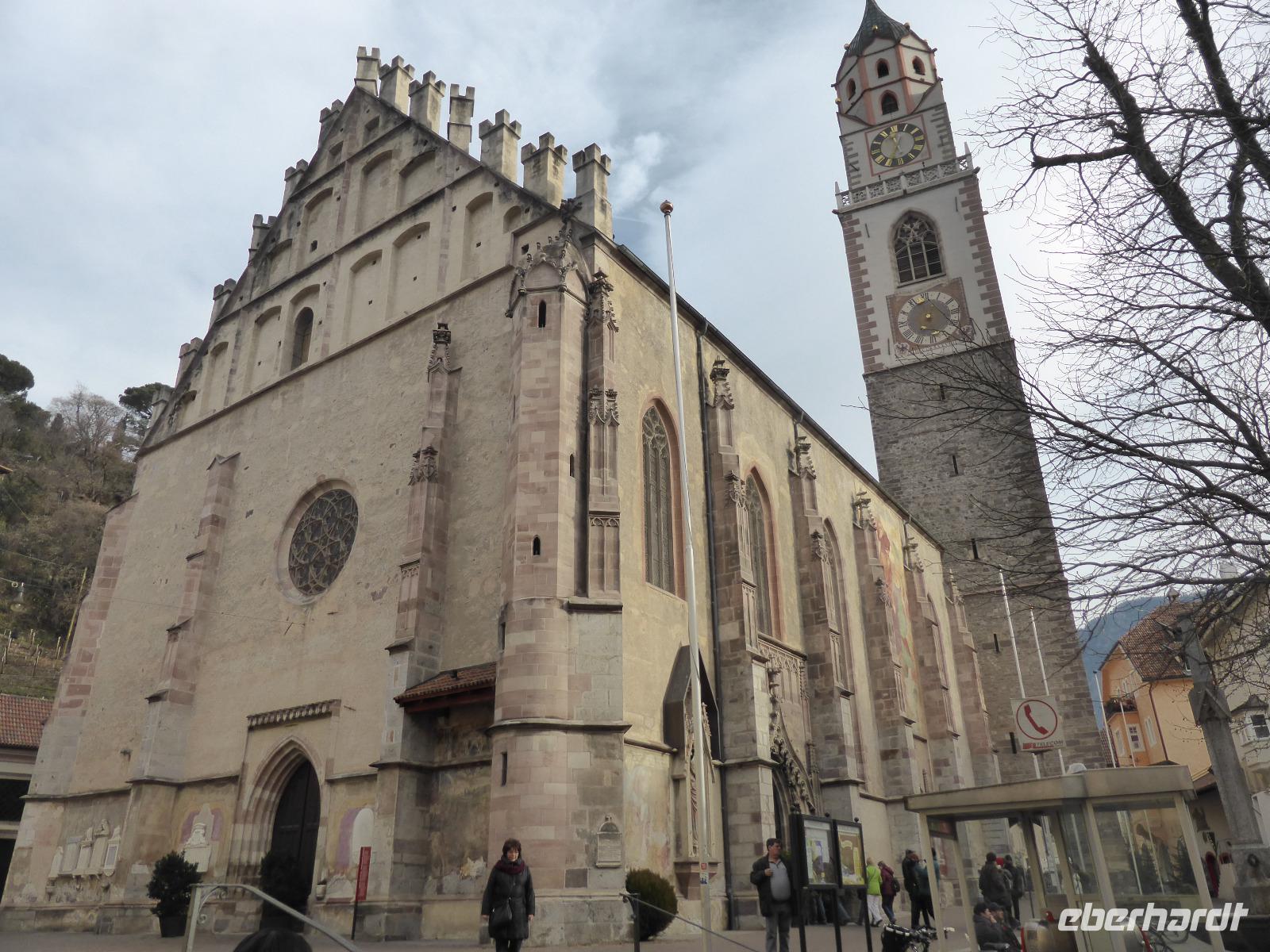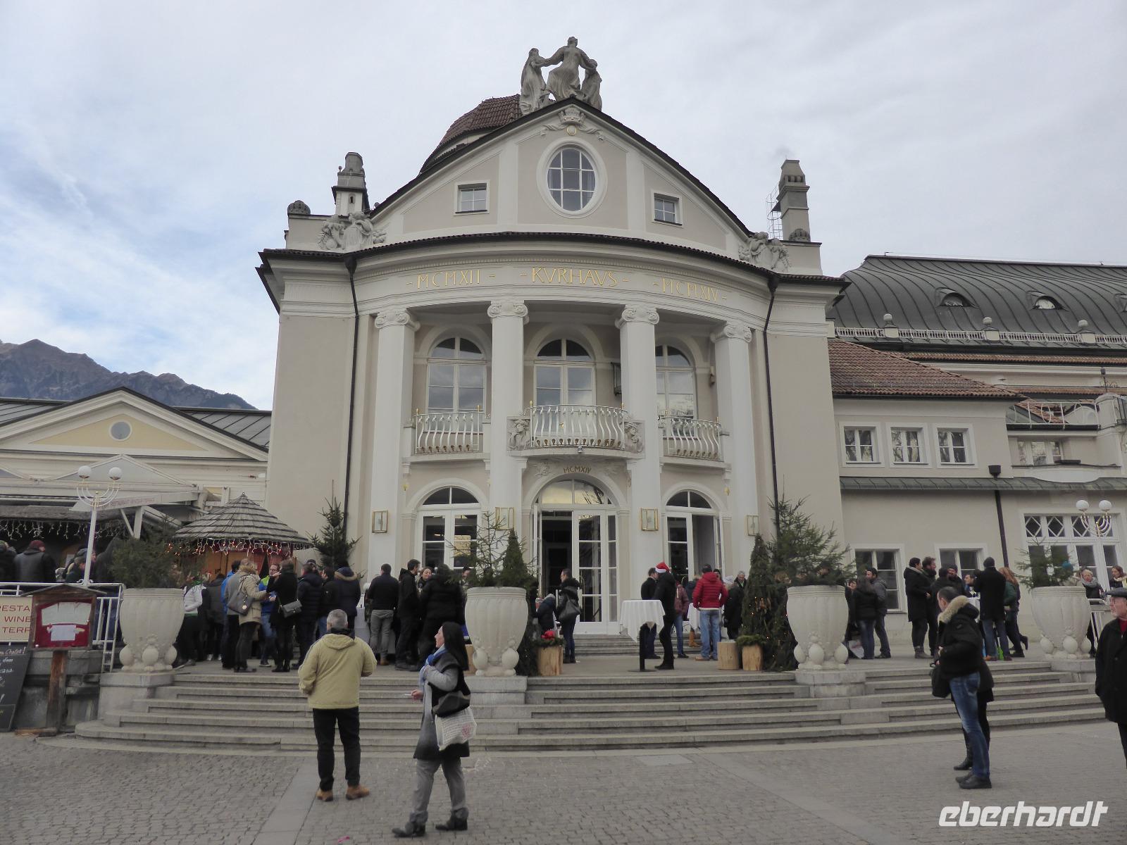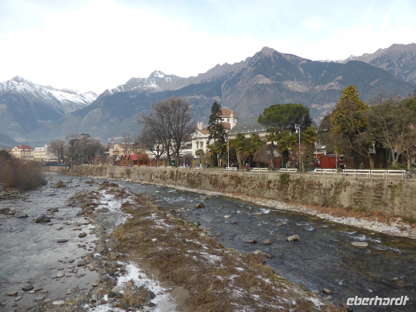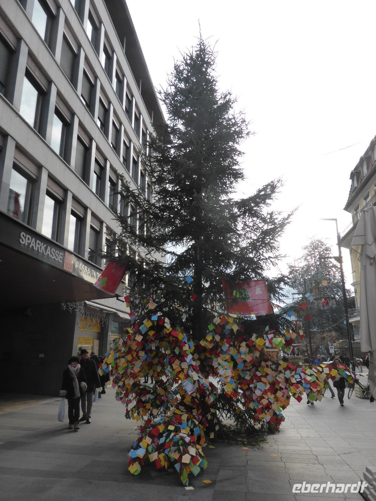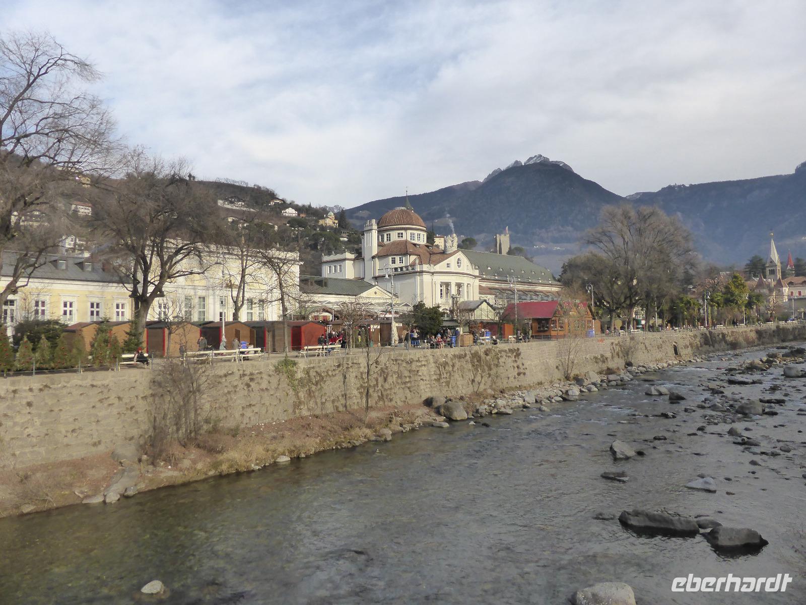 Über den Schlossweg und den Besuch der Pfarrkirche gelangten wir zurück zum Bus. Nach einer kurzen Fahrt erreichten wir die einstige Hauptstadt Tirols - Meran. In Meran unternahmen wir ein Stadtspaziergang entlang der Kurpromenade zum Bozner Tor. Das Bozner Tor ist eines von noch drei erhaltenen Stadttoren und mit Reliefwappen von Östereich, Tirol und Meran geschmückt. Am Pfarrplatz besuchten wir die Kirche St. Nikolaus mit dem 80 m hohen Turm. Durch die berühmte Laubengasse erreichten wir den Weihnachtsmarkt. Die weihnachtliche Stimmung in Meran ging sehr schnell auf uns über. Nach der Zeit zur freien Verfügung spazierten wir über das Stadttheater zurück zur modernen Therme. An diesem architektonischen Glanzstück aus Stahl und Glas erwartete uns bereits Bernd zur Fahrt ins Hotel.