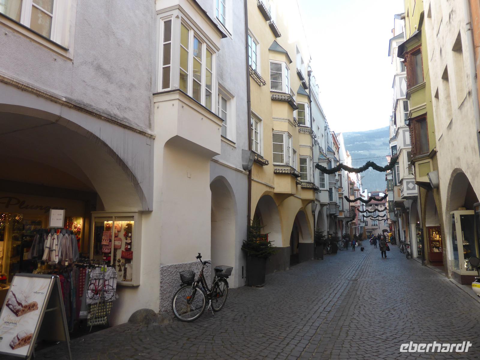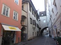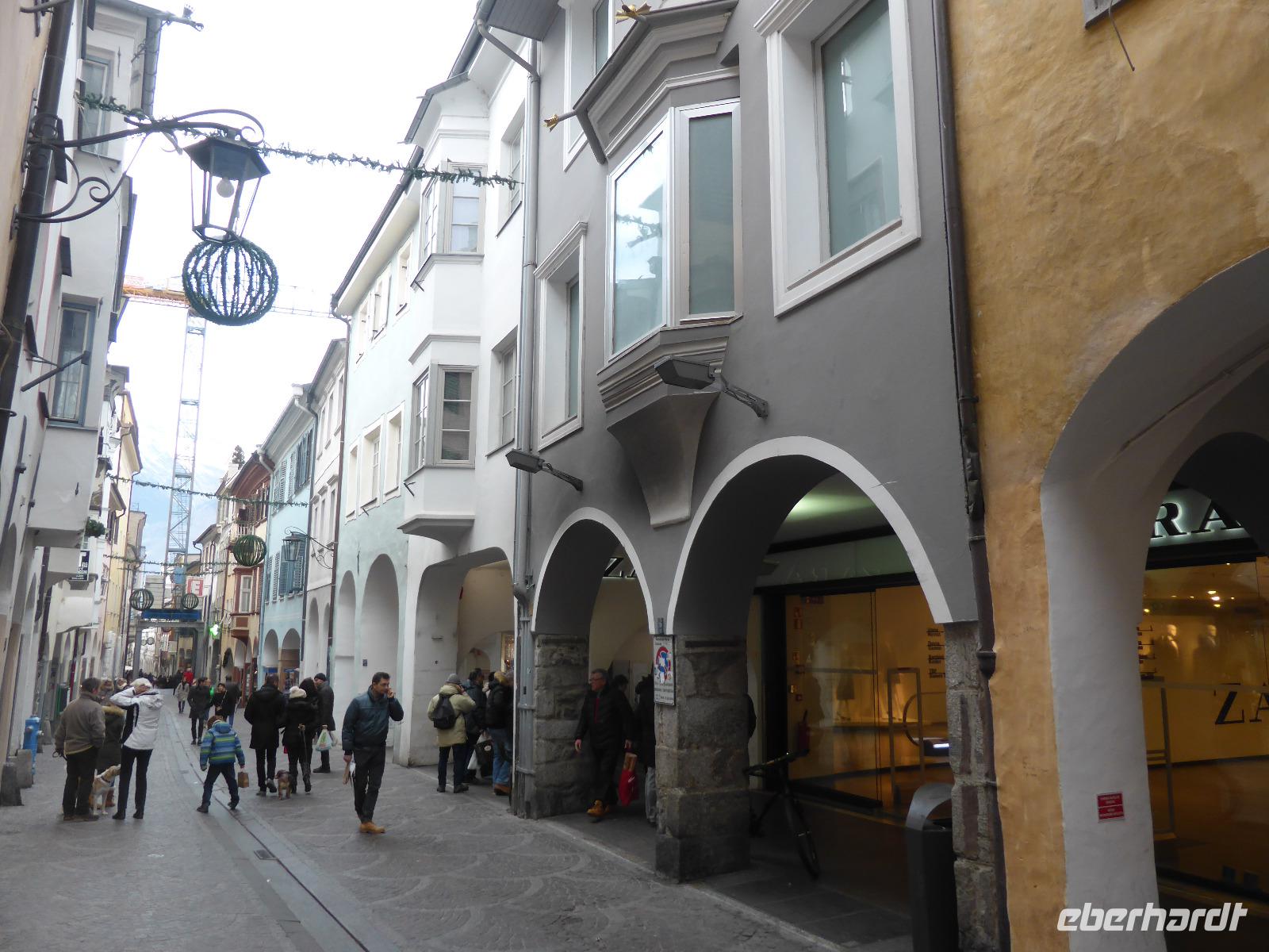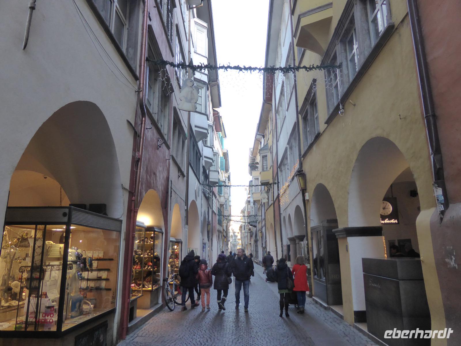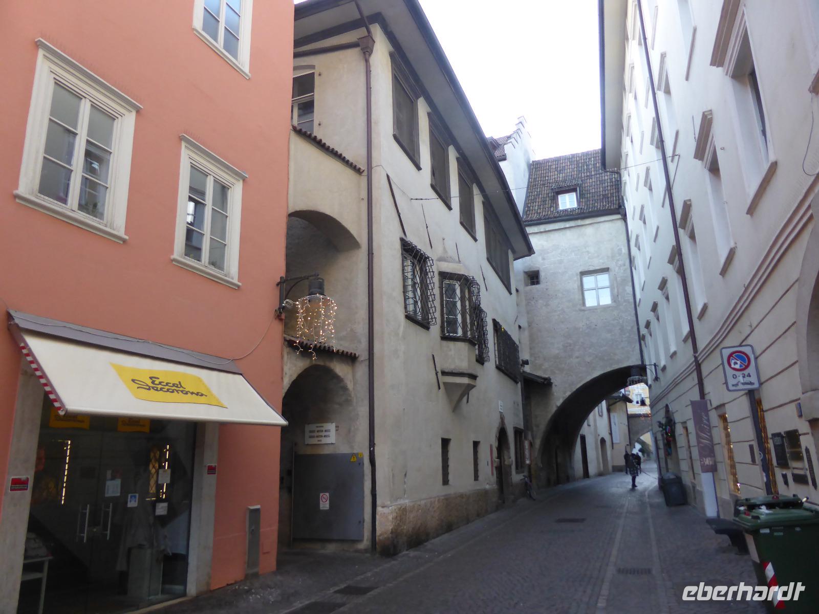 Nach einem kurzen Spaziergang erreichten wir das Südtiroler Archäologiemuseum. Bei einer fachkundigen Führungen erfuhren wir viel Wissenswertes über den Fund vom „Ötzi" am 19.09.1991. Nach zahlreichen Forschungen kann man heute den Lebensraum vom Ötzi recht gut nachvollziehen. Natürlich konnten wir Ötzi, die Feuchtmumie, auch persönlich bestaunen. Nach einer kurzen Erholungspause zur Stärkung auf dem Weihnachtsmarkt erwartete uns Frau Serena Motta zum Stadtrundgang durch die Altstadt Wir starteten am Dom und dem Walterplatz. Der Walterplatz ist der zentrale Platz in Bozen und nach dem Minnesänger Walther von der Vogelweide benannt. Sein Geburtsort soll auf der Vogelweide bei Lajen gewesen sein. Der Dom Maria Himmelfahrt, eine dreischiffige Halle im spätgotischen Stil ist seit 1964 Bischofskirche. Am Heiligabend war der Altbischof verstorben, sodass alles schwarz geflaggt war. Durch die Laubengasse gelangten wir zum Franziskanerkloster. Besonders sehenswert ist der Kreuzgang mit gotischen Fresken aus dem 14. Jahrhundert.