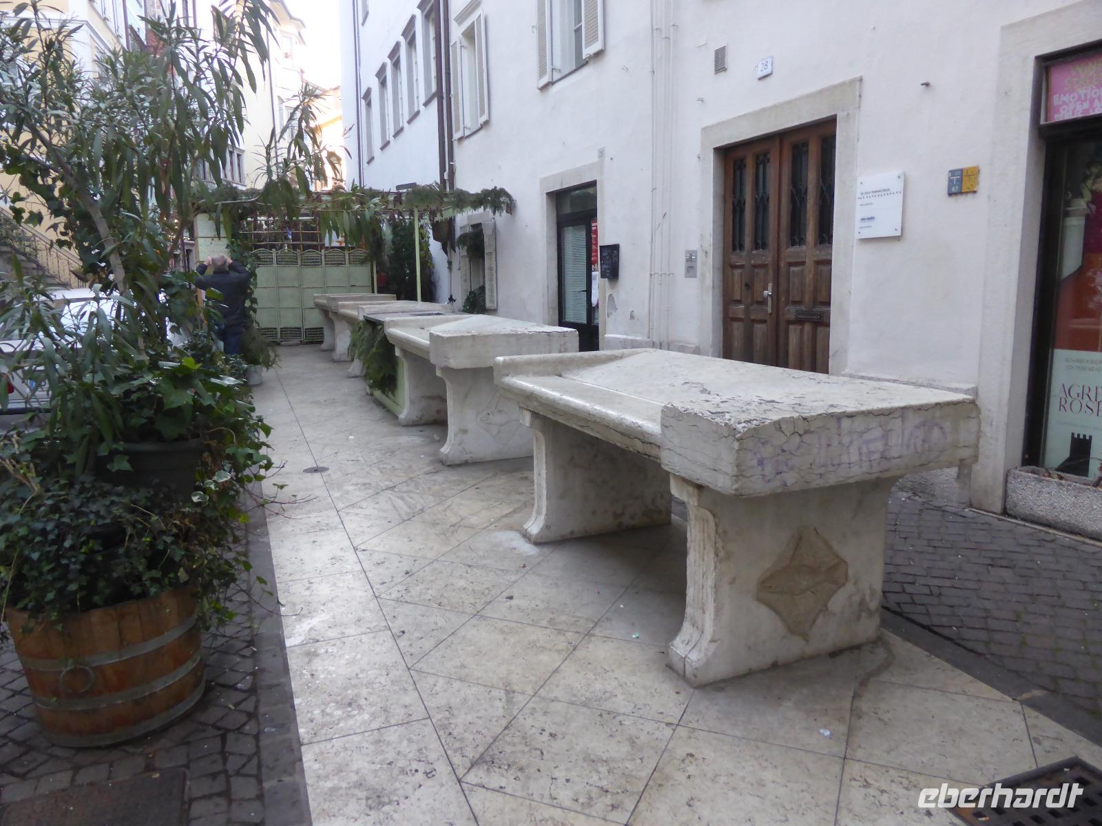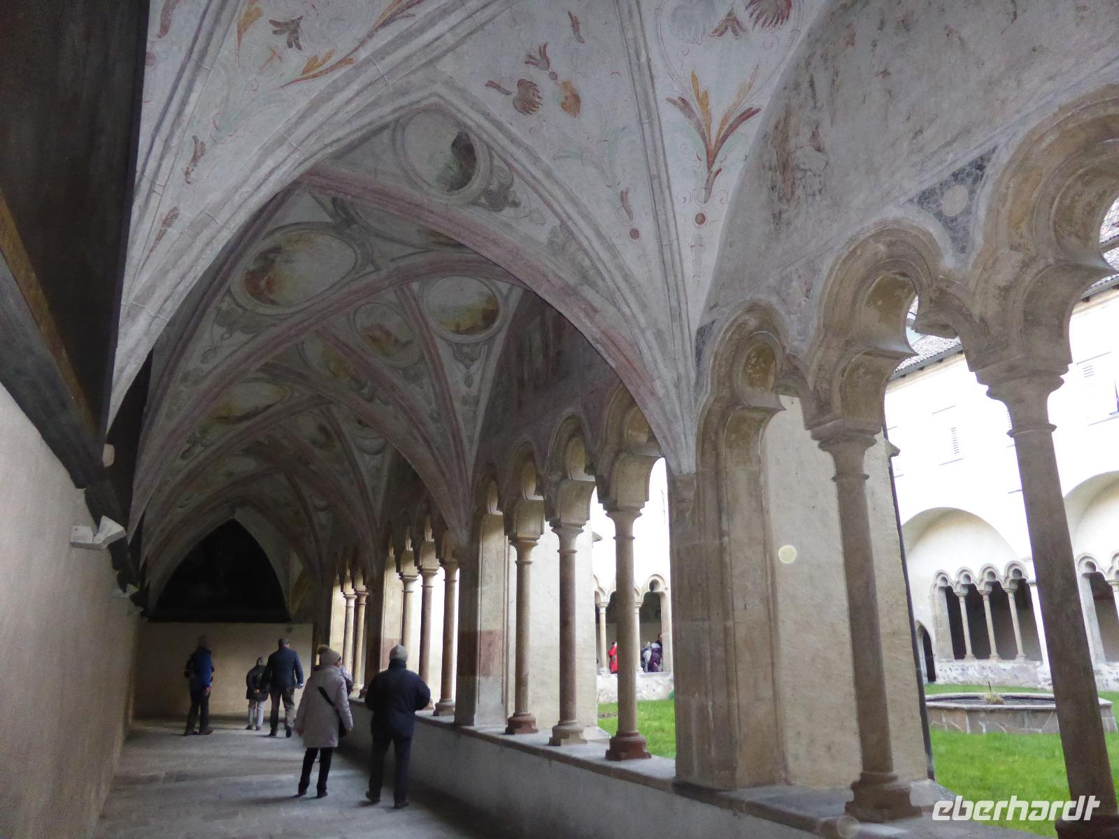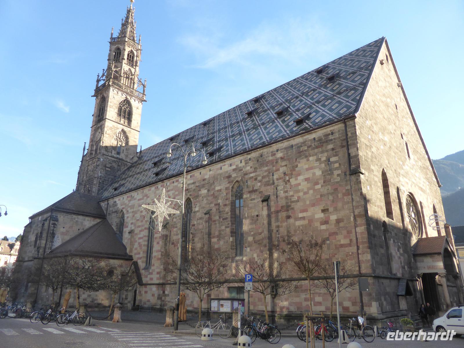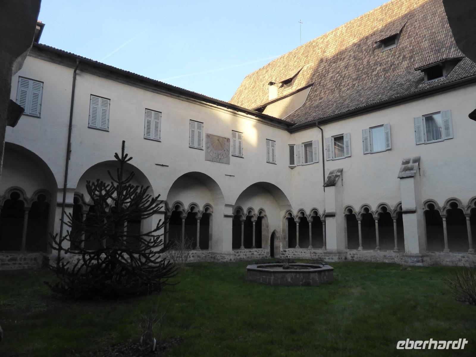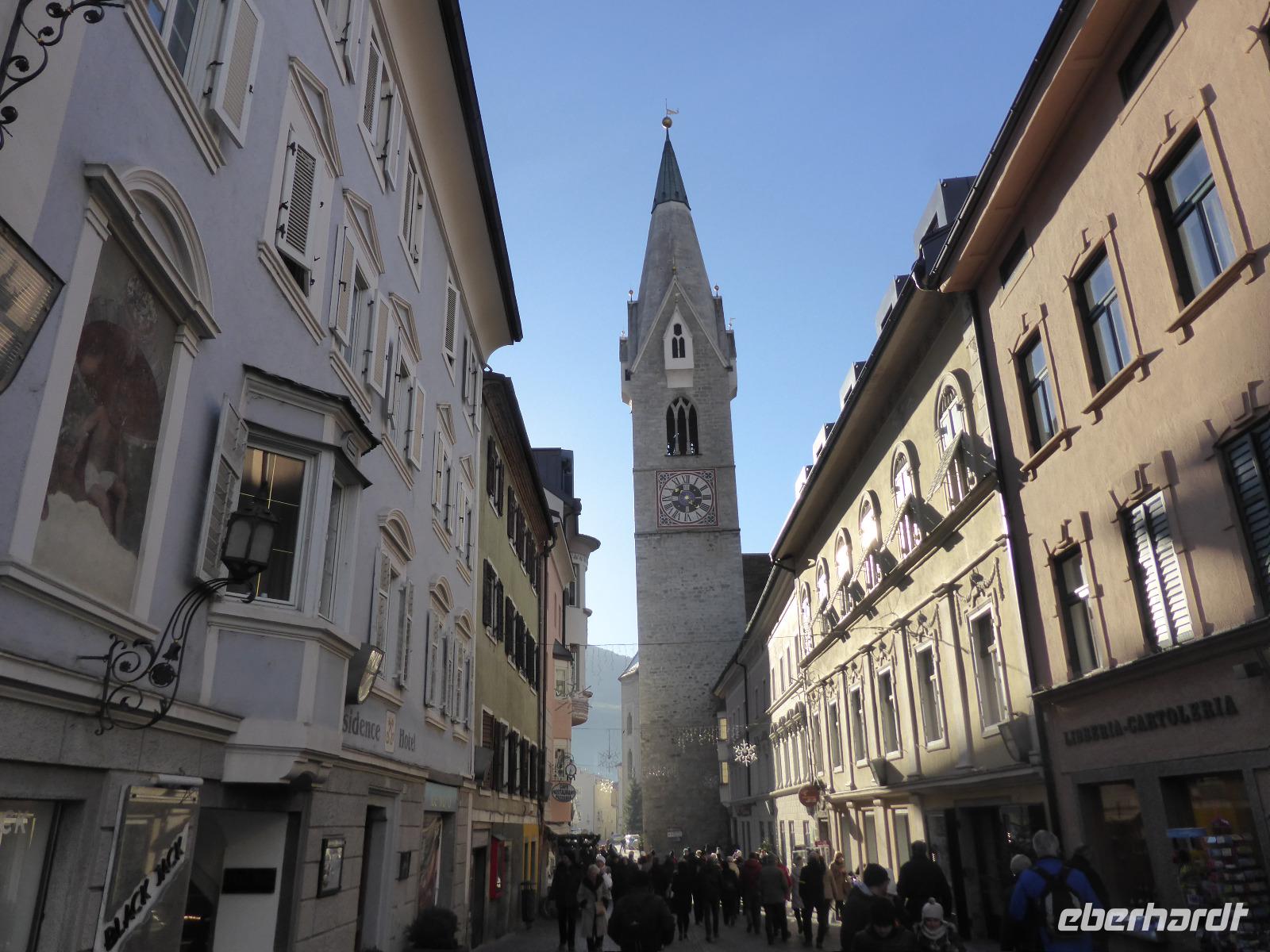 Nach einem kurzen Spaziergang erreichten wir das Südtiroler Archäologiemuseum. Bei einer fachkundigen Führungen erfuhren wir viel Wissenswertes über den Fund vom „Ötzi" am 19.09.1991. Nach zahlreichen Forschungen kann man heute den Lebensraum vom Ötzi recht gut nachvollziehen. Natürlich konnten wir Ötzi, die Feuchtmumie, auch persönlich bestaunen. Nach einer kurzen Erholungspause zur Stärkung auf dem Weihnachtsmarkt erwartete uns Frau Serena Motta zum Stadtrundgang durch die Altstadt Wir starteten am Dom und dem Walterplatz. Der Walterplatz ist der zentrale Platz in Bozen und nach dem Minnesänger Walther von der Vogelweide benannt. Sein Geburtsort soll auf der Vogelweide bei Lajen gewesen sein. Der Dom Maria Himmelfahrt, eine dreischiffige Halle im spätgotischen Stil ist seit 1964 Bischofskirche. Am Heiligabend war der Altbischof verstorben, sodass alles schwarz geflaggt war. Durch die Laubengasse gelangten wir zum Franziskanerkloster. Besonders sehenswert ist der Kreuzgang mit gotischen Fresken aus dem 14. Jahrhundert.