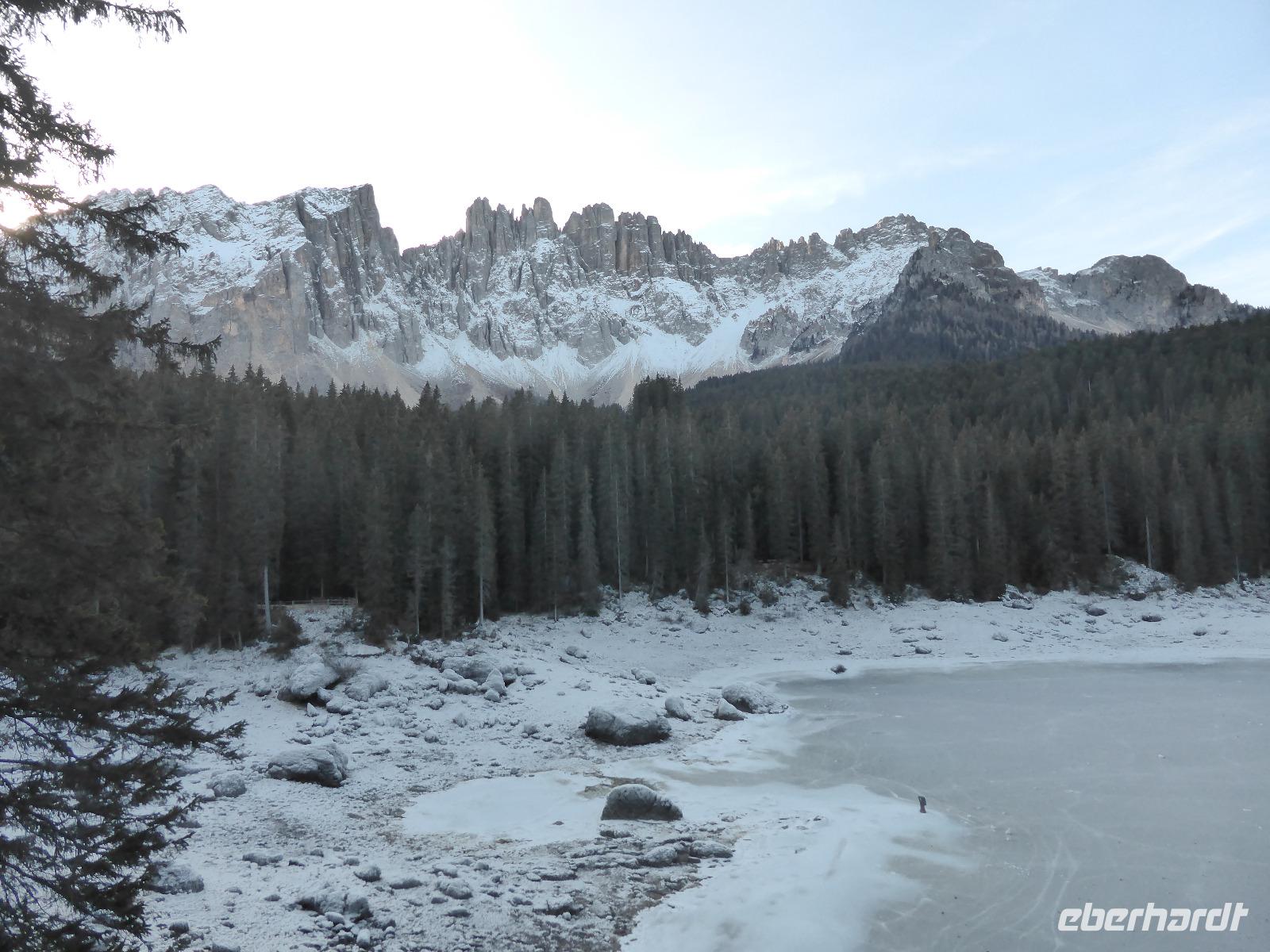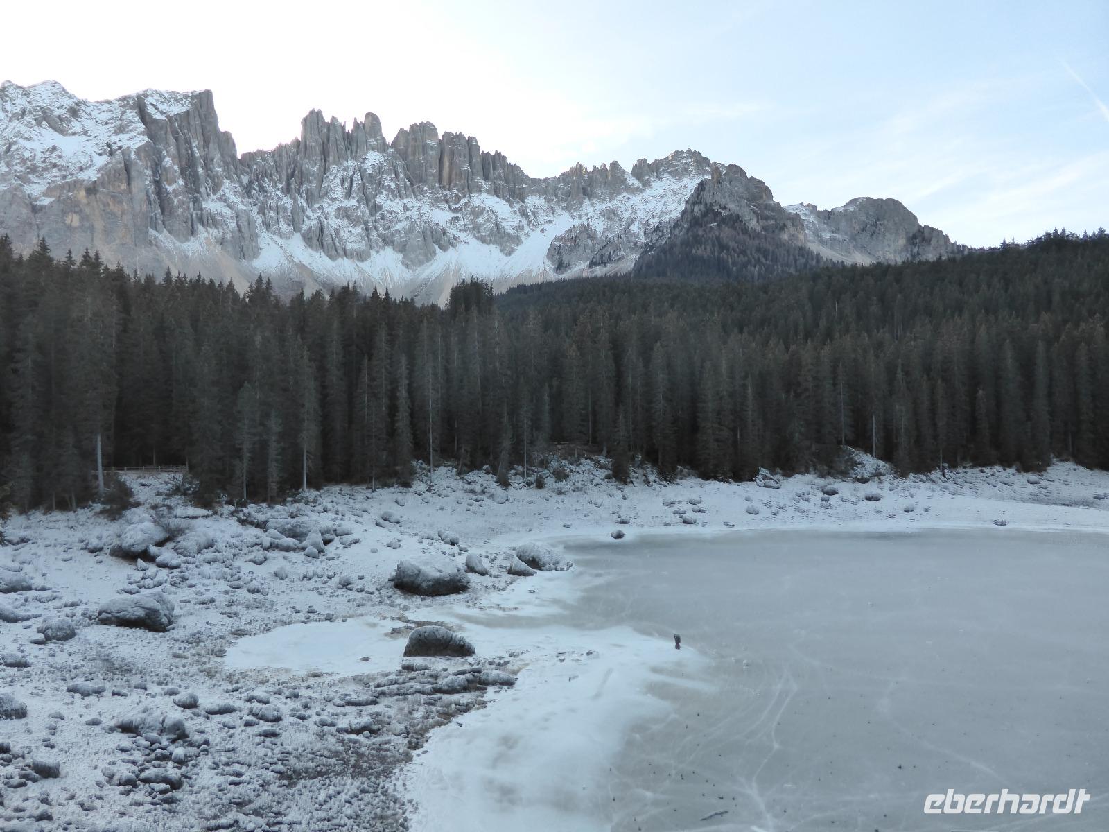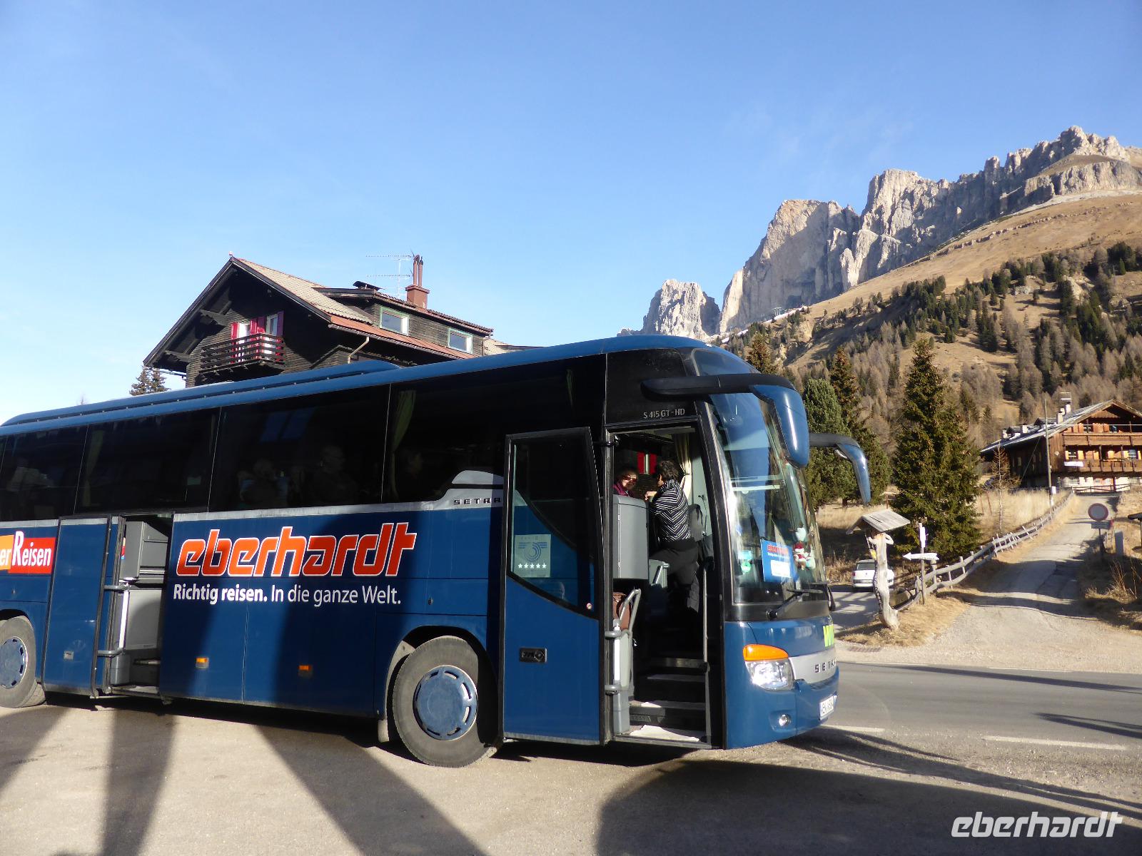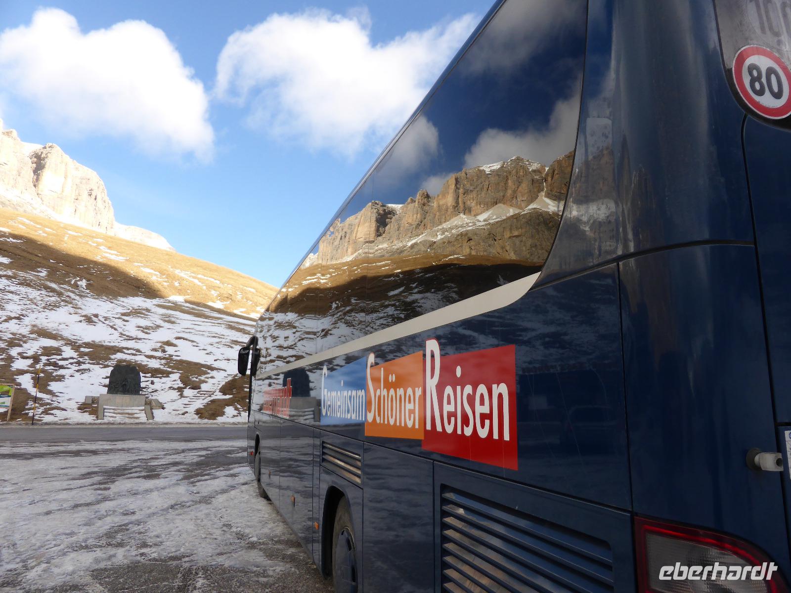 Zur heutigen Dolomitenrundfahrt begrüßte uns Frau Rainer am Hotel bei strahlendem Sonnenschein. Über Meran, Bozen und Welschnofen erreichten wir den Karersee vor der Kulisse des Latemarmassivs. Dieser abflusslose See, welcher durch unterseeische Karstquellen gespeist wird, liegt inmitten dunkler Fichtenwälder auf einer Höhe von 1520 m. Nach einem kurzen Stopp mit einem Spaziergang zum Aussichtspunkt und einer großen Eisskulptur fuhren wir über den Karerpass und das Fassatal auf den Pordoipass. Bernd meisterte die 27 Kurven hinauf und die 33 Kurven runter mit Bravour. Auf dem Pass Pordoi legten wir unsere Mittagspause ein. Bei wunderschönem Wetter umrundeten wir den Sellastock. Auf dem Grödnerjoch war es dann schon recht kalt und keinem hielt es lange im Freien. Durch das Grödnertal vorbei an St. Christina und St. Ulrich erreichten wir Kastelruth. In Kastelruth unternahmen wir einen kleinen Spaziergang durch den Dorfkern. Während der Rundfahrt waren wir über den fehlenden Schnee erstaunt. Nur die beschneiten Pisten waren ein Zeichen des Winters. Mit unvergesslichen Eindrücken sowie zahlreichen Information über Südtirol, den Apfelanbau sowie das Leben der Menschen kehrten wir ins Hotel zurück.
