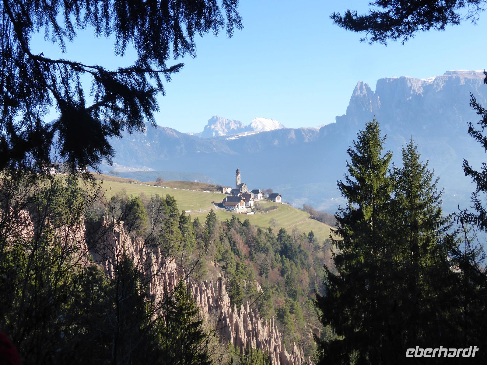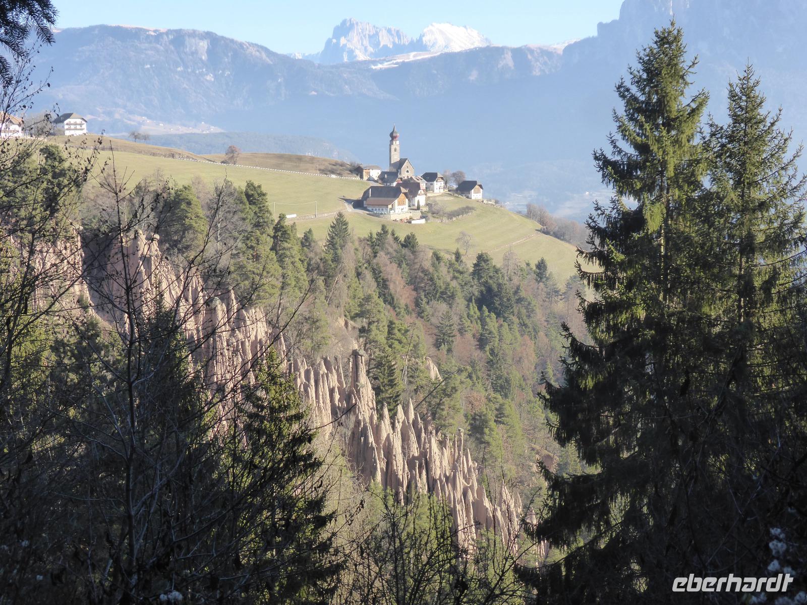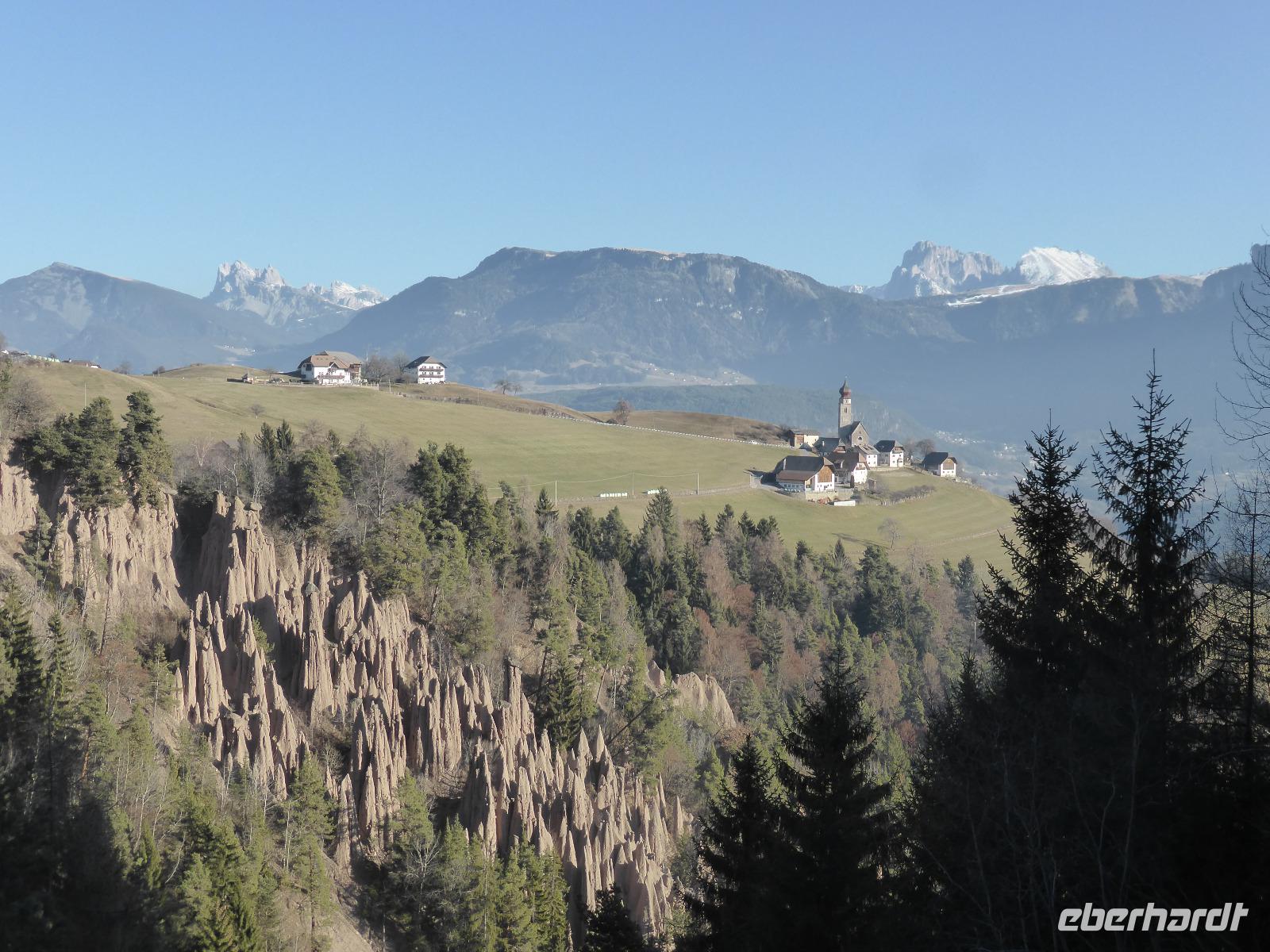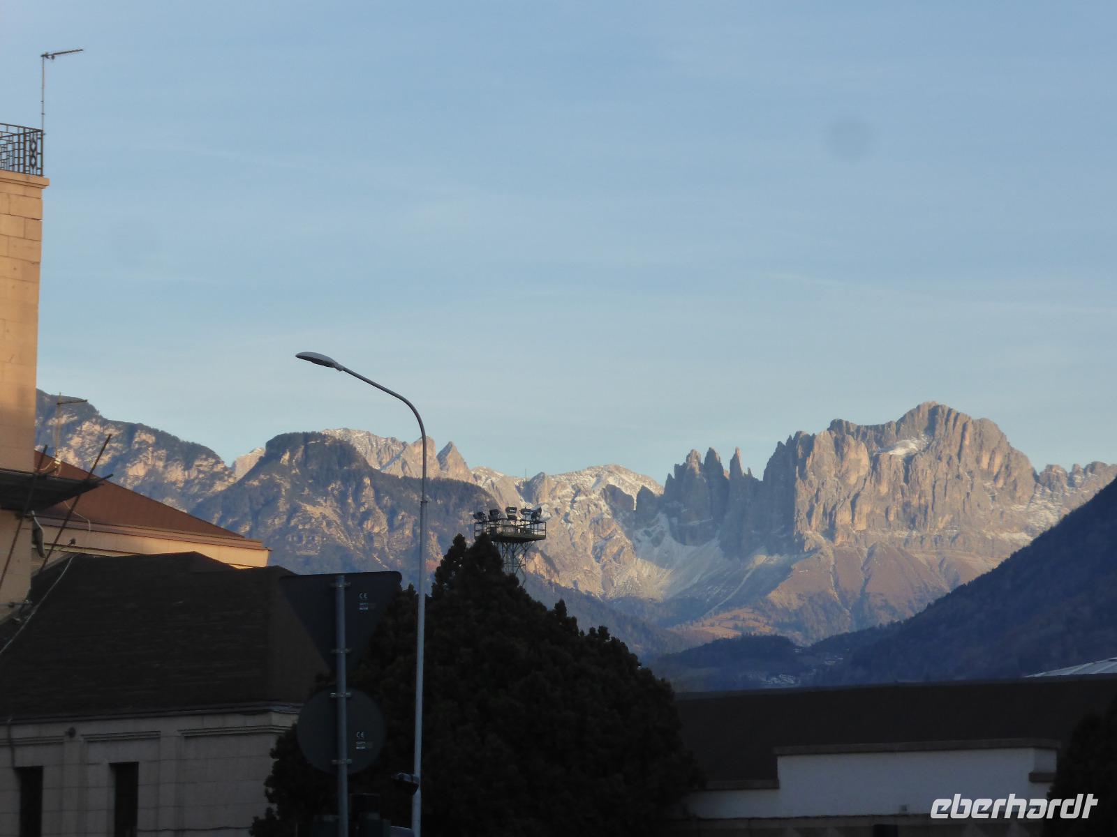 Der heutige Ausflugstag führte uns wieder in die Landeshauptstadt nach Bozen. Von Bozen aus starteten wir mit der Seilbahn auf das Sonnenplateau Ritten nach Oberbozen. Innerhalb von 12 min legten wir einen Höhenunterschied von 1000 m zurück. In Oberbozen erwartete uns neben strahlendem Sonnenschein ein kleiner Weihnachtsmarkt. Mit der Schmalspurbahn fuhren wir von Oberbozen nach Klobenstein. Auch nach Klobenstein zog es die Sommerfrischler aus Bozen. Das Rittner Plateau ist ein sehr beliebtes Wandergebiet. Wir ließen es uns nicht nehmen und unternahmen eine Wanderung entlang der Fennpromenade nach Lengmoos. Während diesem Spaziergang genossen wir immer wieder fantastische Ausblicke auf das Eisacktal sowie die Dolomiten. In der Nähe der Kommende des Deutschen Ordens in Lengmoos holte uns Bern ab. Nach einer kleine Toilettenpause im Sporthotel Spögler fuhren wir zu den berühmten Erdpyramiden. Bei dieser Besonderheit des Ritten handelt es sich um kegelförmige Erosionsformen aus eiszeitlichem Moränenlehm. Die aufliegenden Gesteinsblöcke verhindern das Abtragen des Moränenlehms. Diese Säulen sind am Ritten besonders grandios. Vom Erdpyramidenweg ab Maria Saal spazierten wir zurück zum Restaurant Spögler, wo uns ein Apfelstrudel mit Kaffee erwartete. Die Rückfahrt erfolgte mit unserem Bus die zahlreichen Serpentinen hinunter nach Bozen.