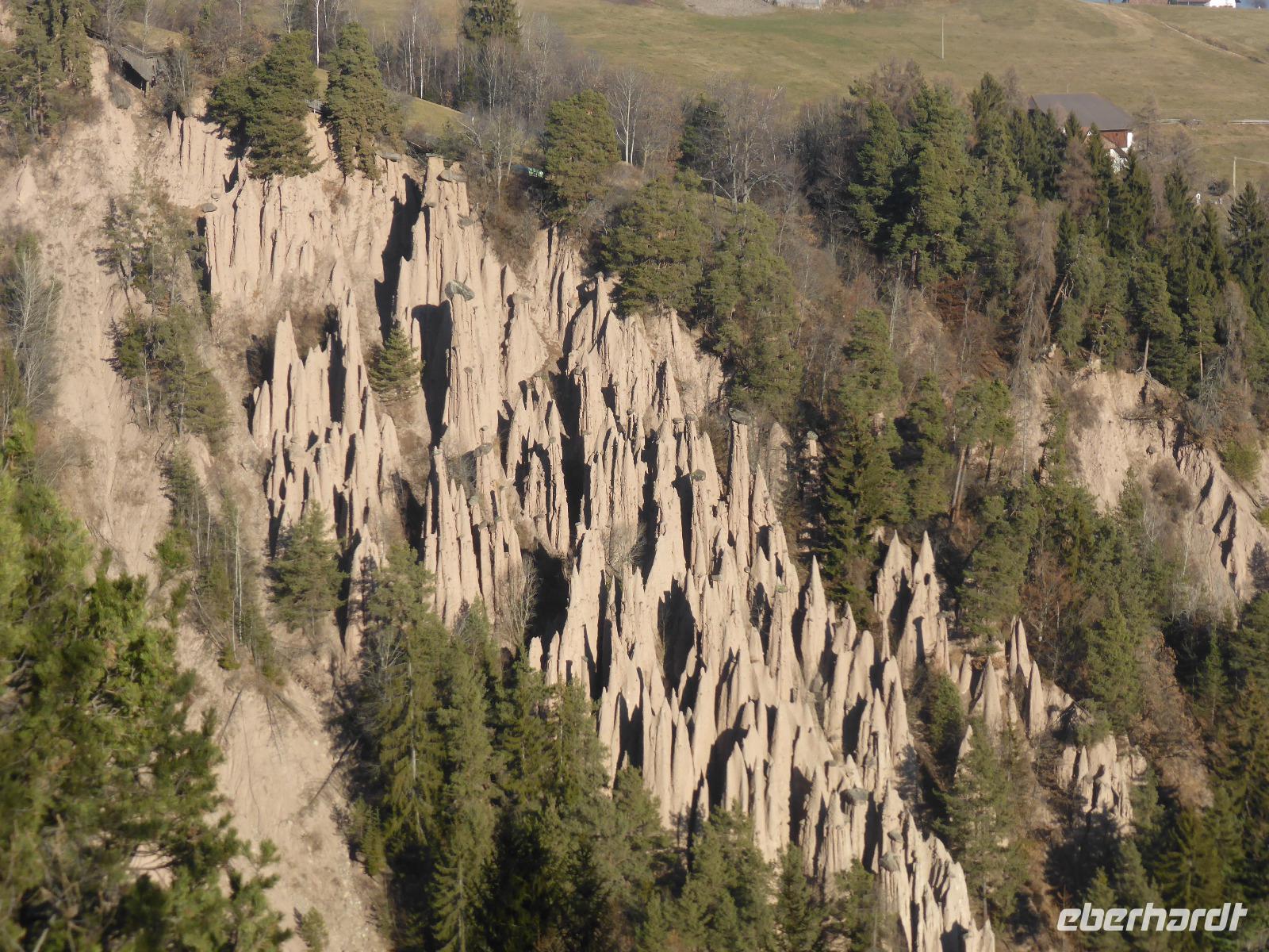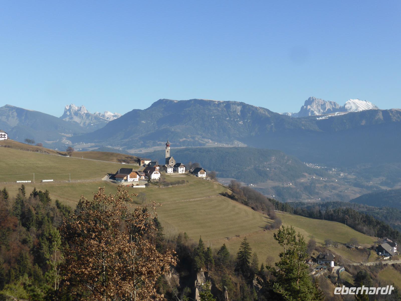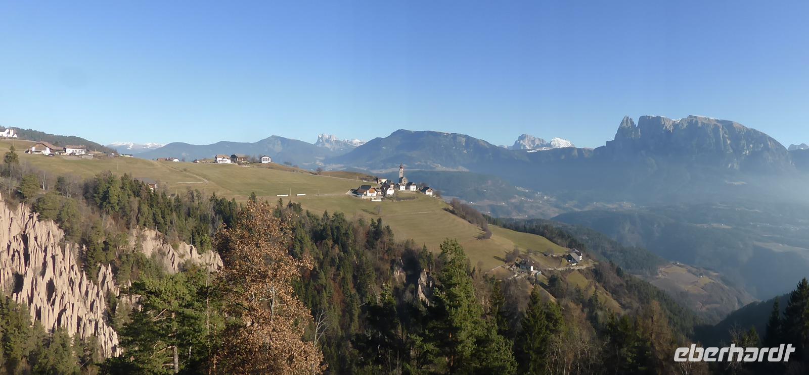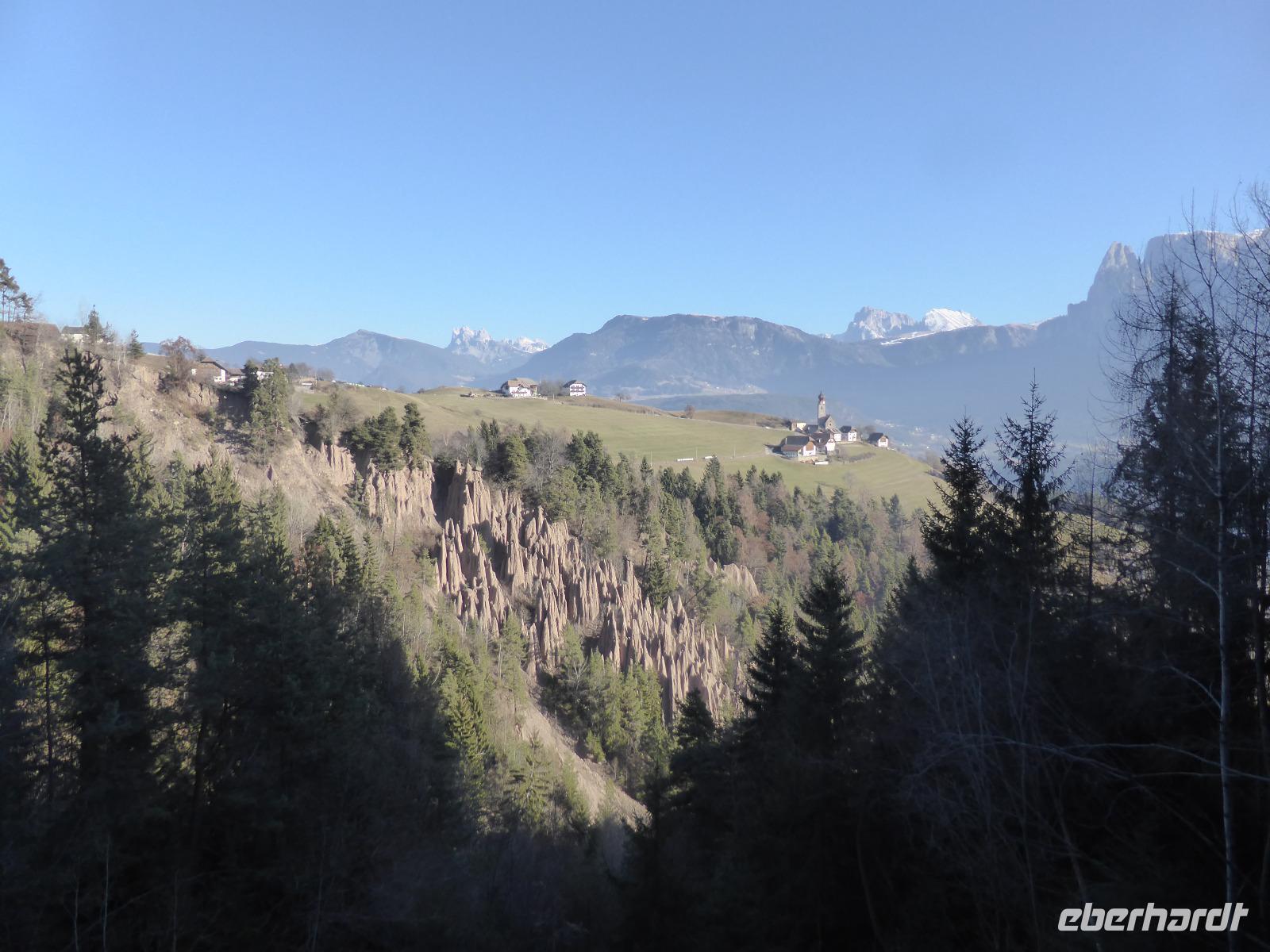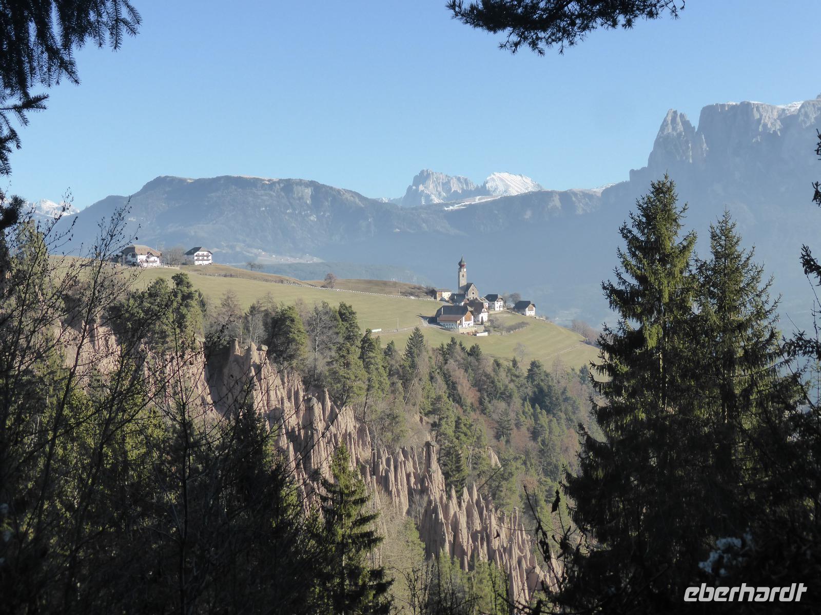 Der heutige Ausflugstag führte uns wieder in die Landeshauptstadt nach Bozen. Von Bozen aus starteten wir mit der Seilbahn auf das Sonnenplateau Ritten nach Oberbozen. Innerhalb von 12 min legten wir einen Höhenunterschied von 1000 m zurück. In Oberbozen erwartete uns neben strahlendem Sonnenschein ein kleiner Weihnachtsmarkt. Mit der Schmalspurbahn fuhren wir von Oberbozen nach Klobenstein. Auch nach Klobenstein zog es die Sommerfrischler aus Bozen. Das Rittner Plateau ist ein sehr beliebtes Wandergebiet. Wir ließen es uns nicht nehmen und unternahmen eine Wanderung entlang der Fennpromenade nach Lengmoos. Während diesem Spaziergang genossen wir immer wieder fantastische Ausblicke auf das Eisacktal sowie die Dolomiten. In der Nähe der Kommende des Deutschen Ordens in Lengmoos holte uns Bern ab. Nach einer kleine Toilettenpause im Sporthotel Spögler fuhren wir zu den berühmten Erdpyramiden. Bei dieser Besonderheit des Ritten handelt es sich um kegelförmige Erosionsformen aus eiszeitlichem Moränenlehm. Die aufliegenden Gesteinsblöcke verhindern das Abtragen des Moränenlehms. Diese Säulen sind am Ritten besonders grandios. Vom Erdpyramidenweg ab Maria Saal spazierten wir zurück zum Restaurant Spögler, wo uns ein Apfelstrudel mit Kaffee erwartete. Die Rückfahrt erfolgte mit unserem Bus die zahlreichen Serpentinen hinunter nach Bozen.