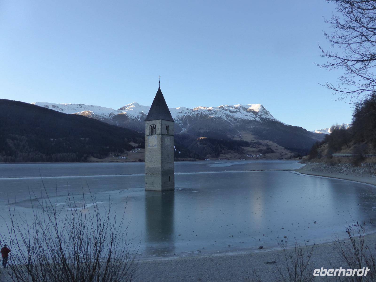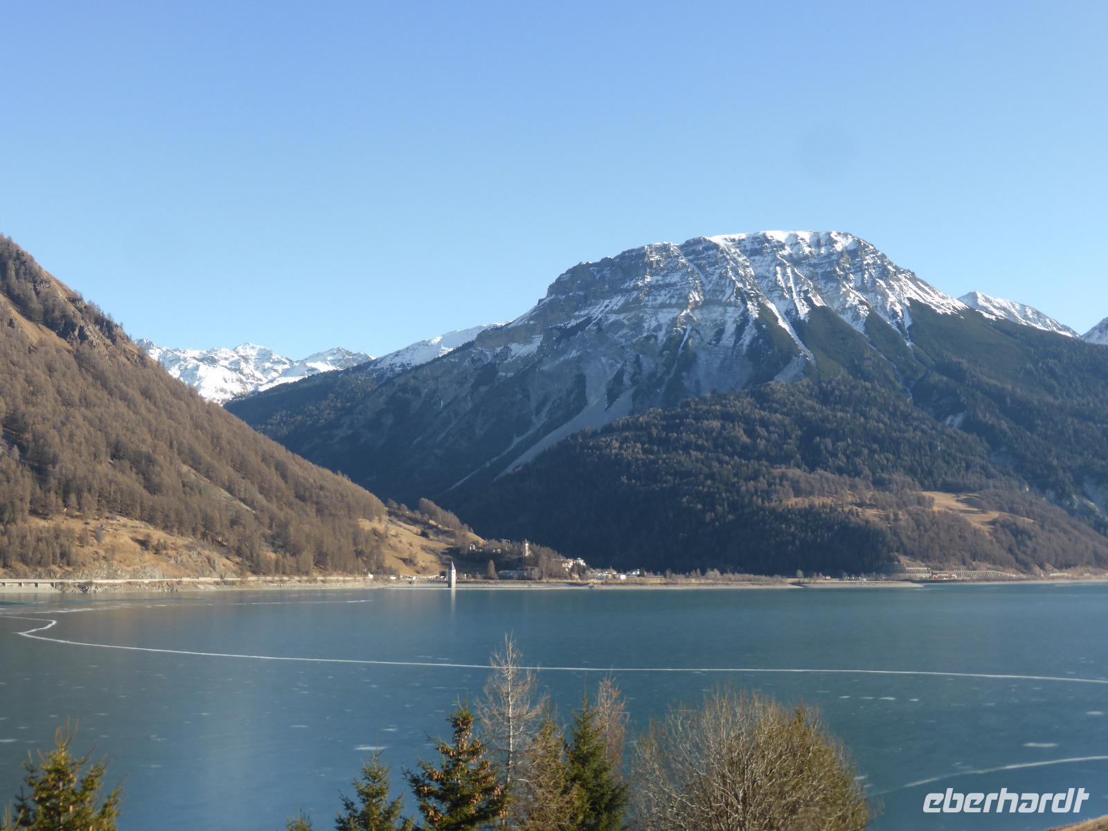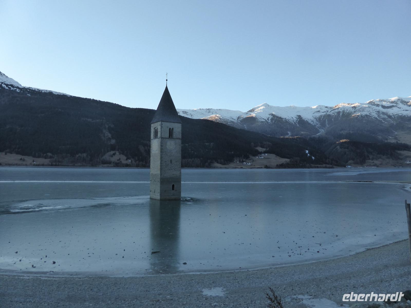 Nach dieser interessanten, aber auch recht langen Führung sehnten wir uns nach unserem warmen Bus. Bernd erwartete uns auch schon. Nach kurzer Fahrt gelangen wir zur Talstation der Schönebenbahn. Ein kurzer Spaziergang am Ufer des Reschensees gelangten wir zum Giernhof. Hier erwartete uns eine deftige Jause mit Kaminwurz, Schinken, Brot und Käse. Während dieser Jause genossen wir den fantastischen Blick auf den Reschensee. Der Reschensee wurde 1950 aufgestaut. Dabei verschwanden einige Dörfer. Im Juli 1950 läuteten die Glocken des heute aus dem Wasser ragenden Kirchturm das letzte Mal. An diesem beliebten Fotomotiv legten wir auf der Rückfahrt einen Fotostopp ein. Der See ist heute ein Eldorado für Angler, Kitesurfer sowie Eissegler.