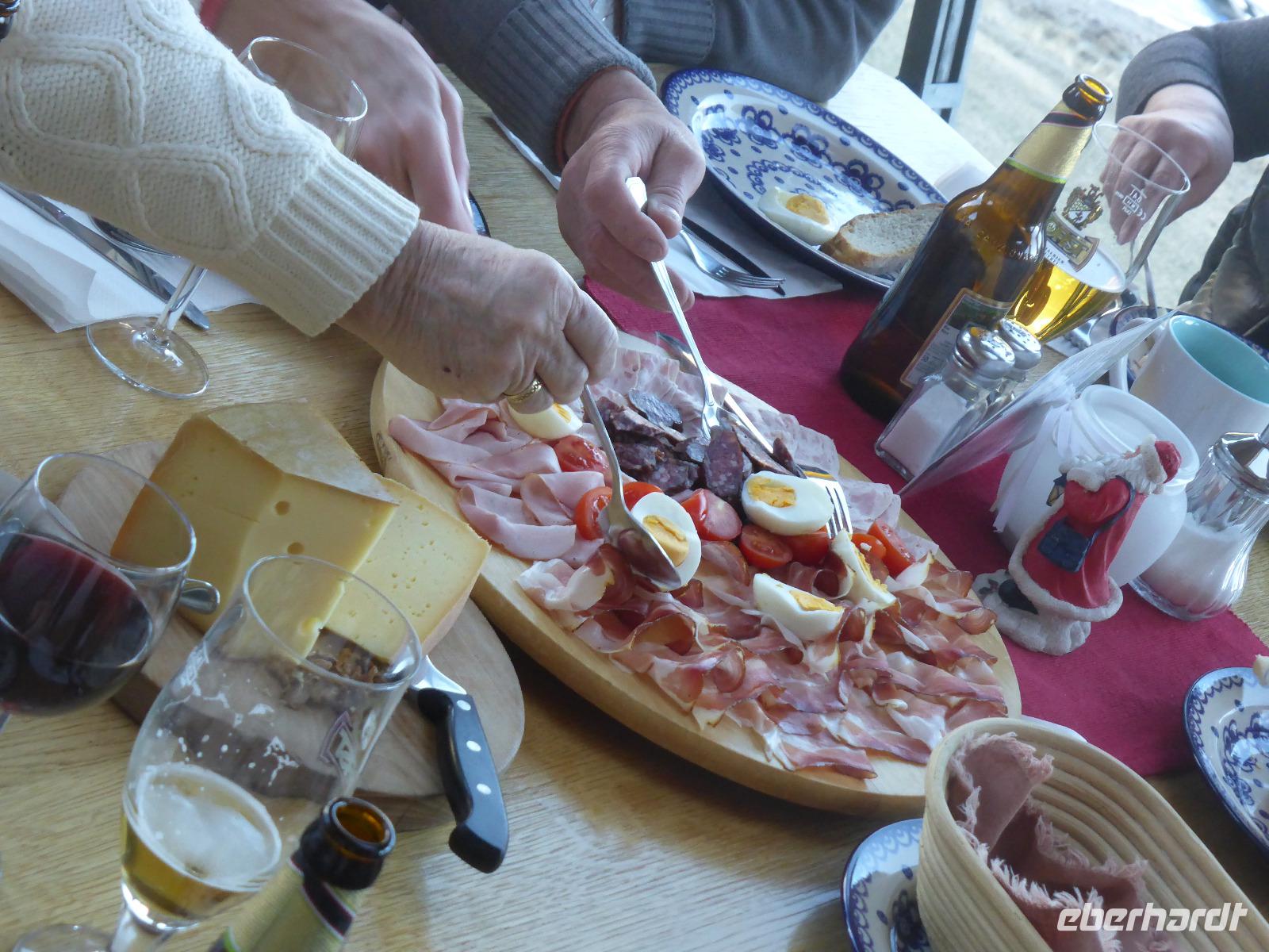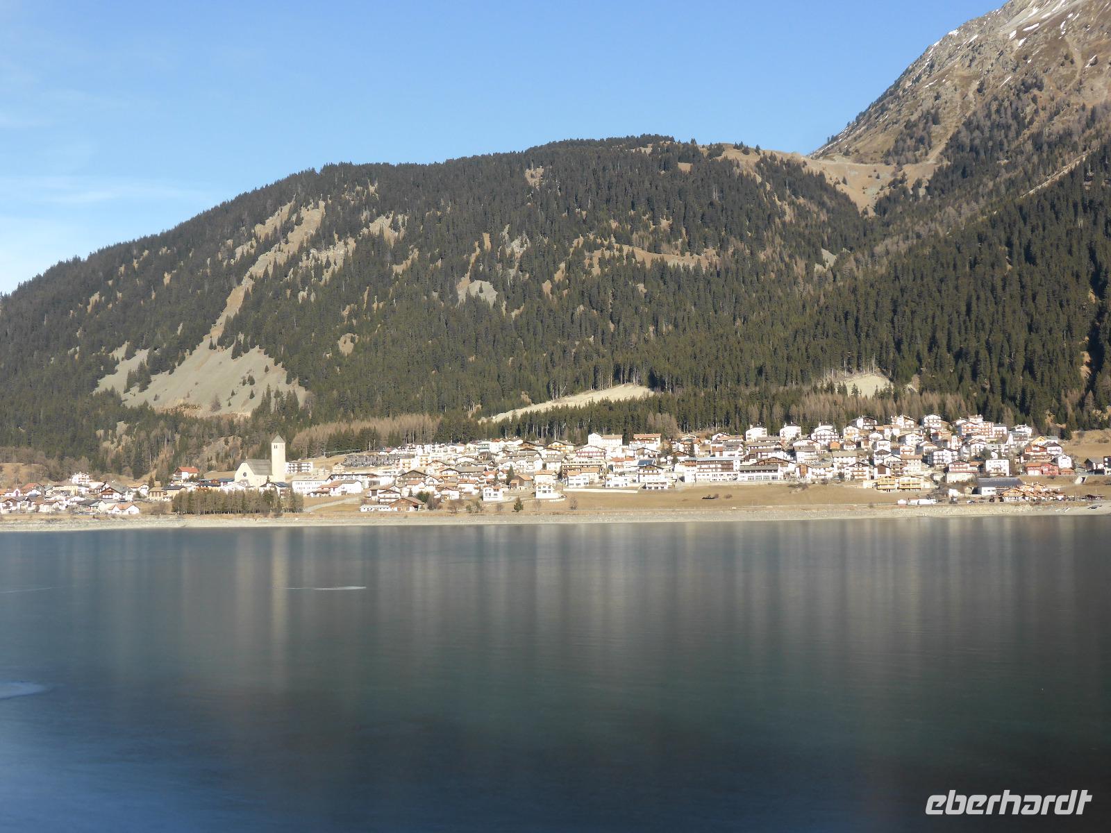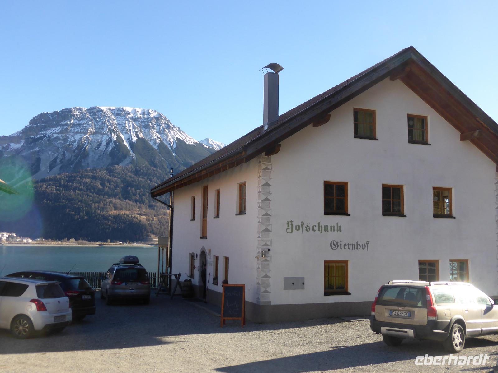 Nach dieser interessanten, aber auch recht langen Führung sehnten wir uns nach unserem warmen Bus. Bernd erwartete uns auch schon. Nach kurzer Fahrt gelangen wir zur Talstation der Schönebenbahn. Ein kurzer Spaziergang am Ufer des Reschensees gelangten wir zum Giernhof. Hier erwartete uns eine deftige Jause mit Kaminwurz, Schinken, Brot und Käse. Während dieser Jause genossen wir den fantastischen Blick auf den Reschensee. Der Reschensee wurde 1950 aufgestaut. Dabei verschwanden einige Dörfer. Im Juli 1950 läuteten die Glocken des heute aus dem Wasser ragenden Kirchturm das letzte Mal. An diesem beliebten Fotomotiv legten wir auf der Rückfahrt einen Fotostopp ein. Der See ist heute ein Eldorado für Angler, Kitesurfer sowie Eissegler.