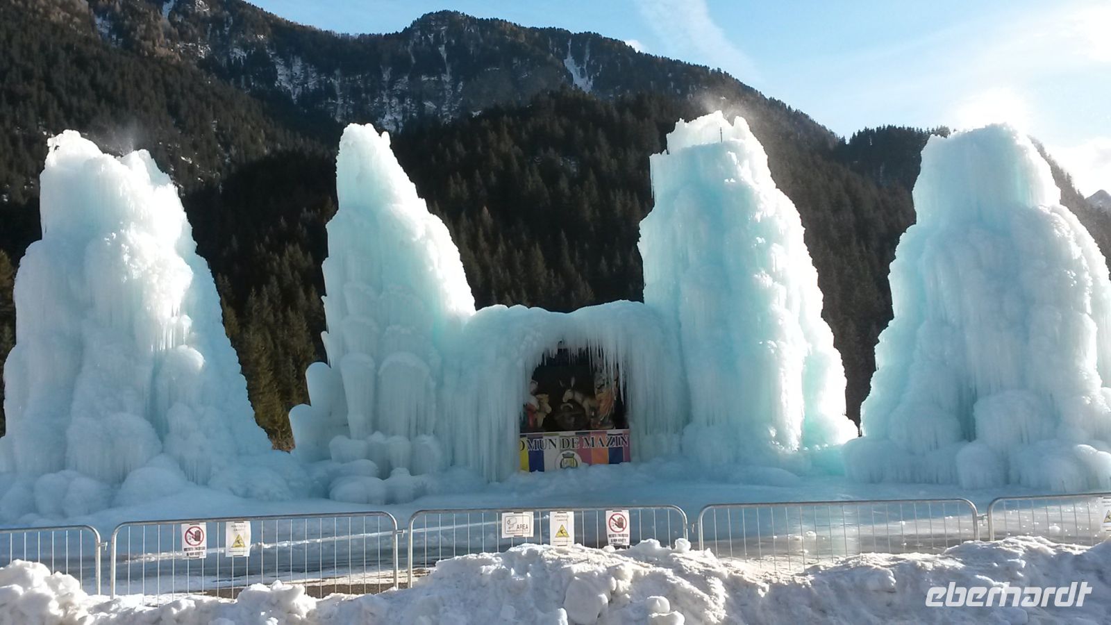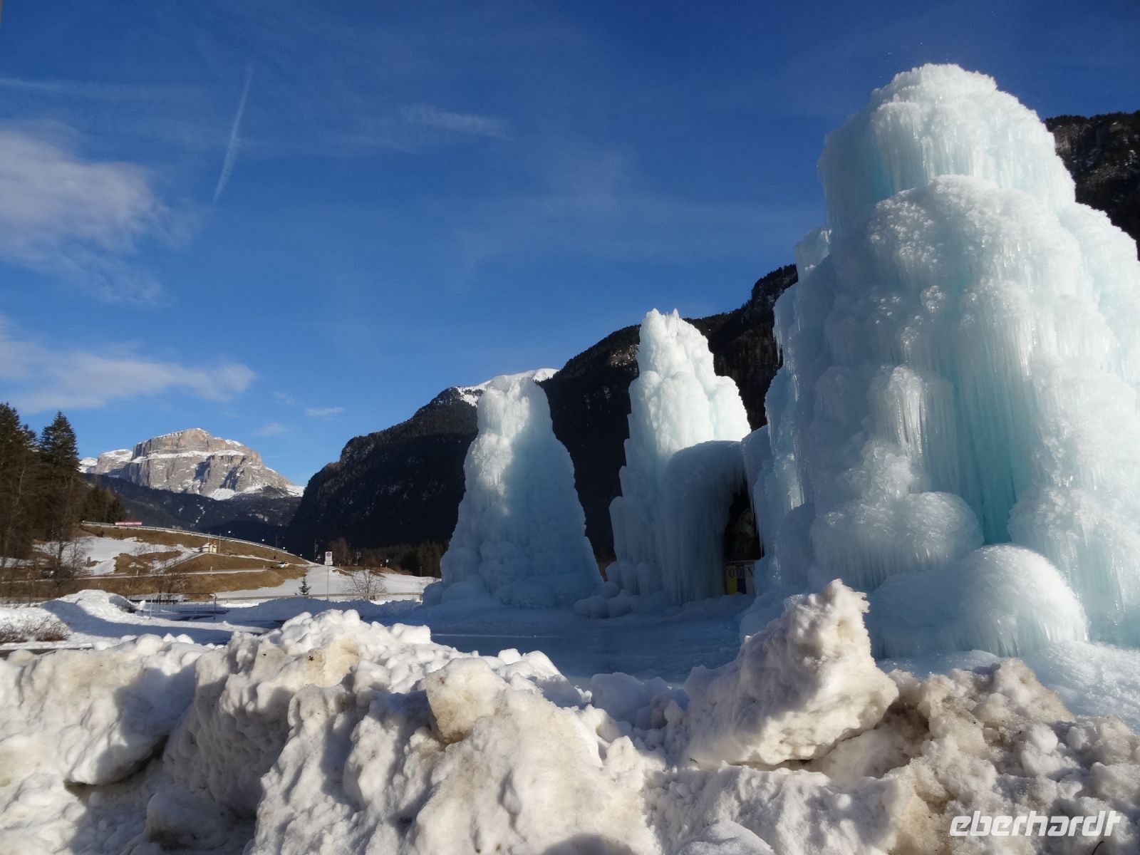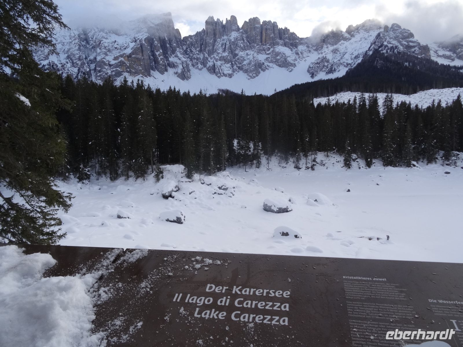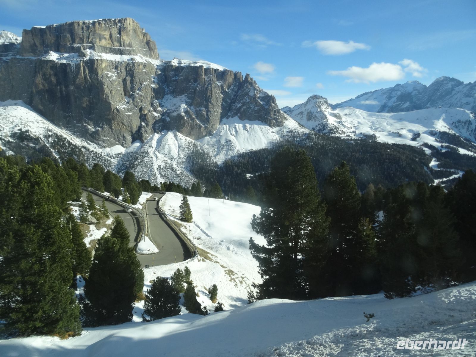 Unser Bus startete auf zu den Passstraßen – sehr kurvenreich ging es in die Höhe zum Sellajoch. Beste Aussichten auf die Dolomiten – Langkofel, Fünffingerspitze, Plattkofel, Sellastock - größter Berg der Dolomiten die Marmolada und viele mehr. Ein Rundumblick war uns bei schönstem Wetter vergönnt. Bei der Abfahrt ins Fassatal waren noch viele schöne Fotos möglich. In Canazei gab es einen Eisbaum mit Krippe. Diese vier künstlich erstellten Eisbäume waren mit Krippe ein besonderes Motiv. Wir fuhren weiter entlang der großen Dolomitenstrasse zum Karerpass und Karersee. Der See tief gefroren zu Füßen des Lattemar. Der Rosengarten hüllte sich bereits in eine obere Nebelschicht. Mit den schönsten Fotos im Gepäck ging es über die Eggentaler Schlucht nach Bozen und wir erreichten am Abend wieder das Hotel.