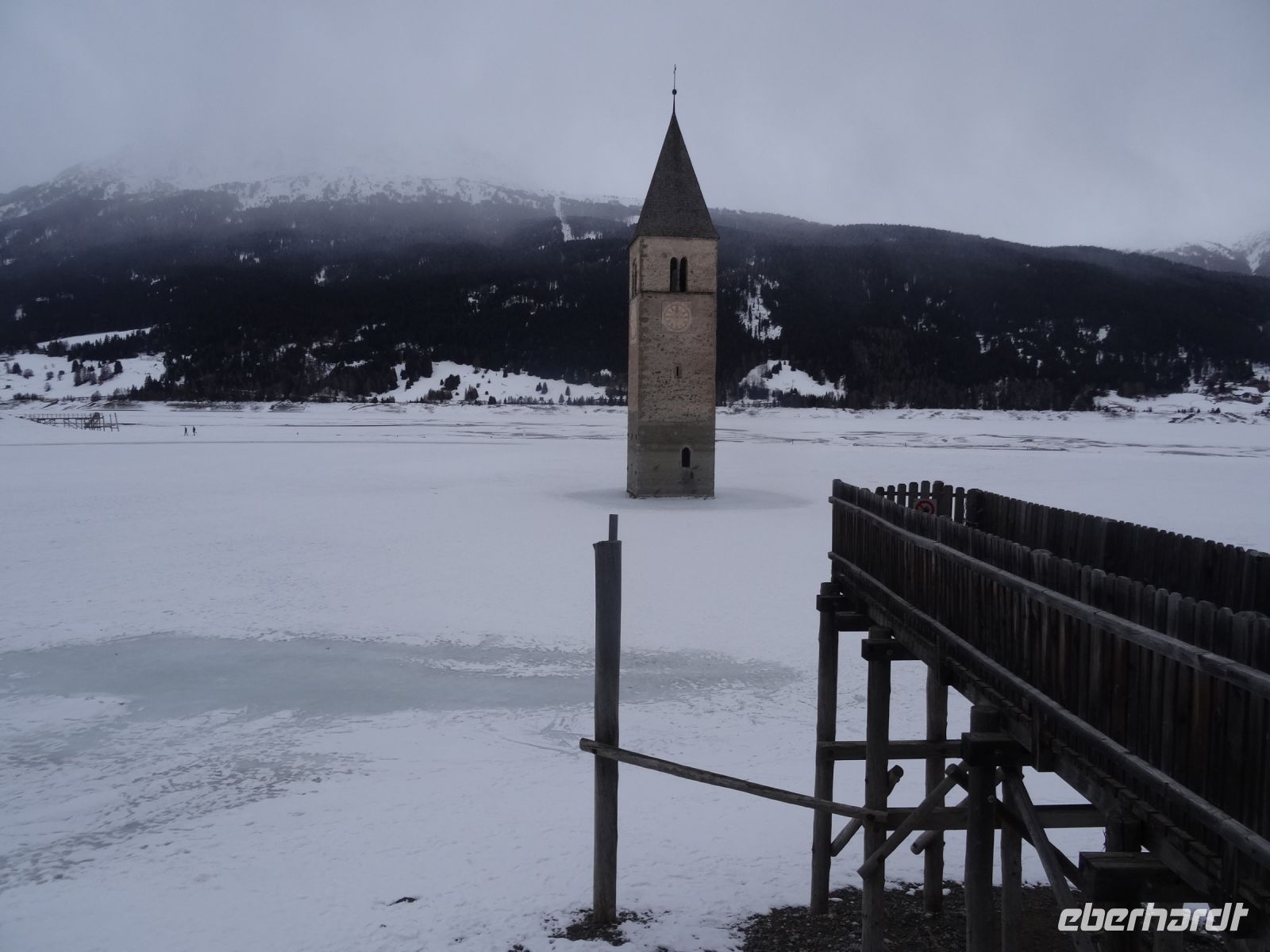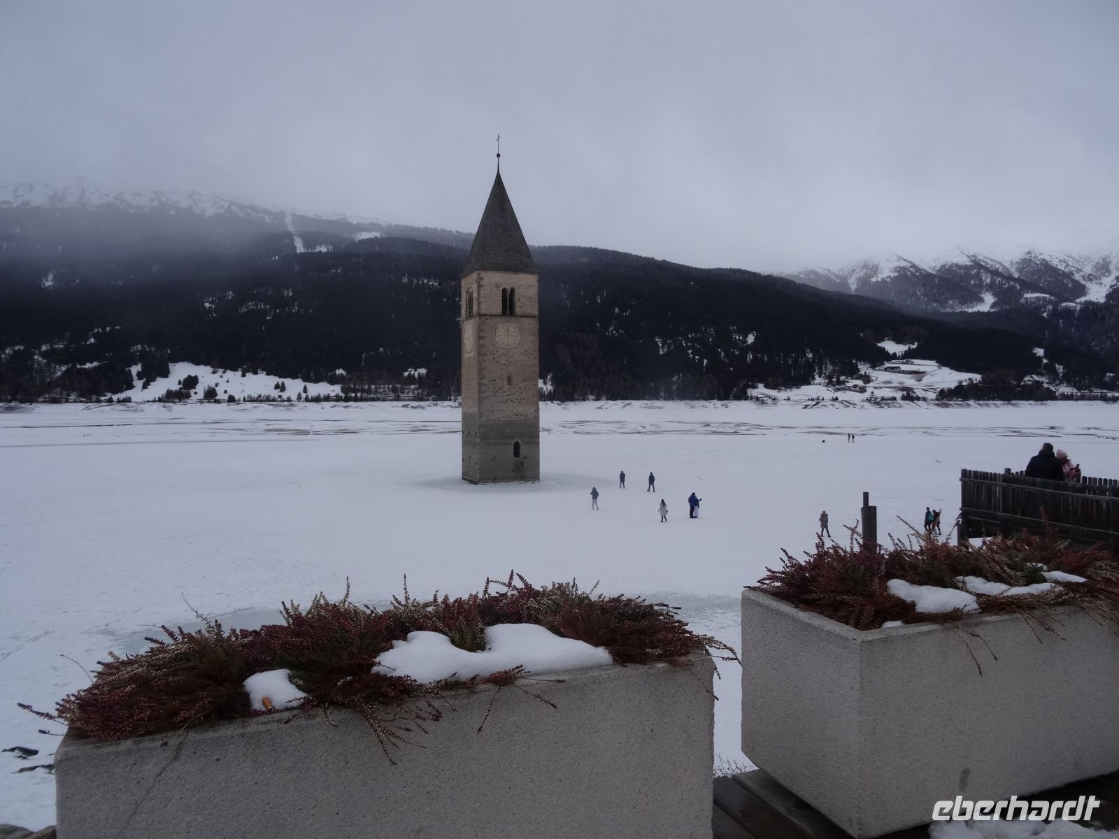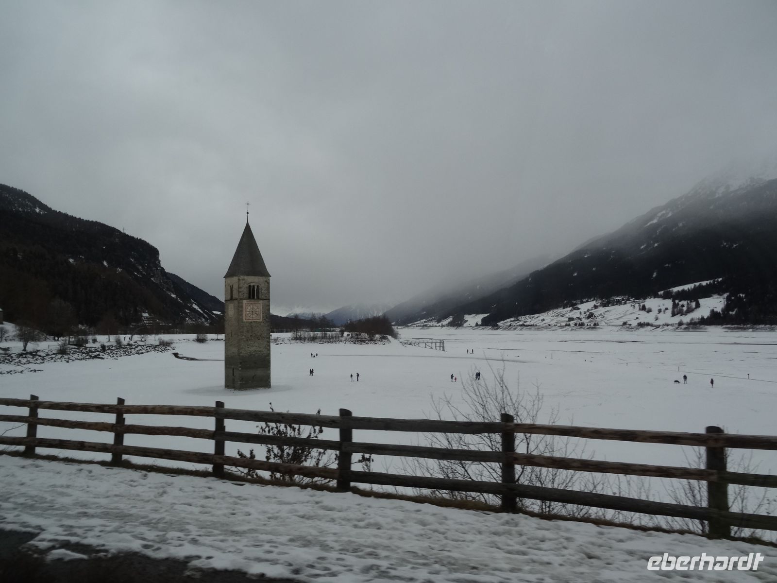 Kurz vor dem Mittag hieß es dann weiter durchzustarten. Es ging in den Vinschgau bis zum Reschensee. Vorbei an vielen kleineren oder größeren Orten, Naturns - bedeutenster Ort für die Obstkulturen mit Burg, Tschars – Abzweig ins Schnalstal mit den Wanderungen für die Wallwege oder Schloss/Burg Juval, Kastellbell mit Schloss, Schlanders - wirtschaftliches-kulturelles Zentrum im unteren Vinschgau, Schluders - mit dem bedeutensten Bau der Churburg, Mals - Hauptort des Obervinschgaus, Burgeis - Fürstenburg und Kloster/Benedektinerabtei Marienberg, St. Valentin auf der Haide – 2 km langer Haidersee und Skigebiet, Graun - Reschensee 6,5 km lang bis zu 1,5 km breiter Speicher - entstand 1949 durch Aufstauung des ursprünglichen großen Reschensees mit dem Grauner See als diese vereinigt wurden. In den Fluten versank das Dorf Altgraun mit über 100 Häusern, nur der alte Kirchturm (14.Jhd) ragt noch aus dem Wasser – ein groteskes Bild, das manchen auch nachdenklich stimmen mag. Für uns als Reisegäste ein besonders Fotomotiv mit dem zugefrorenen See. Damit konnte man den Turm erreichen und anfassen oder sogar lt. Foto wegschieben !