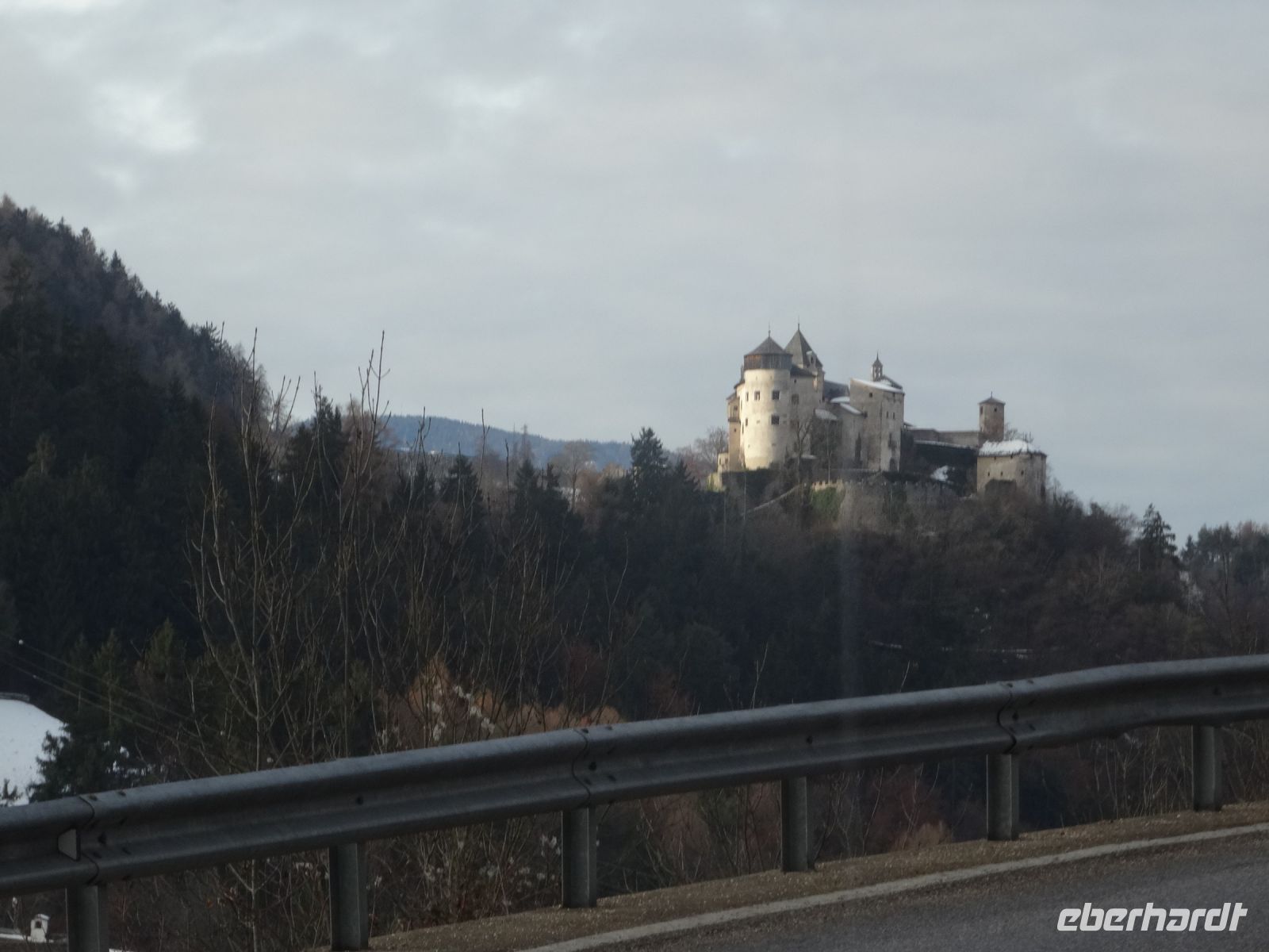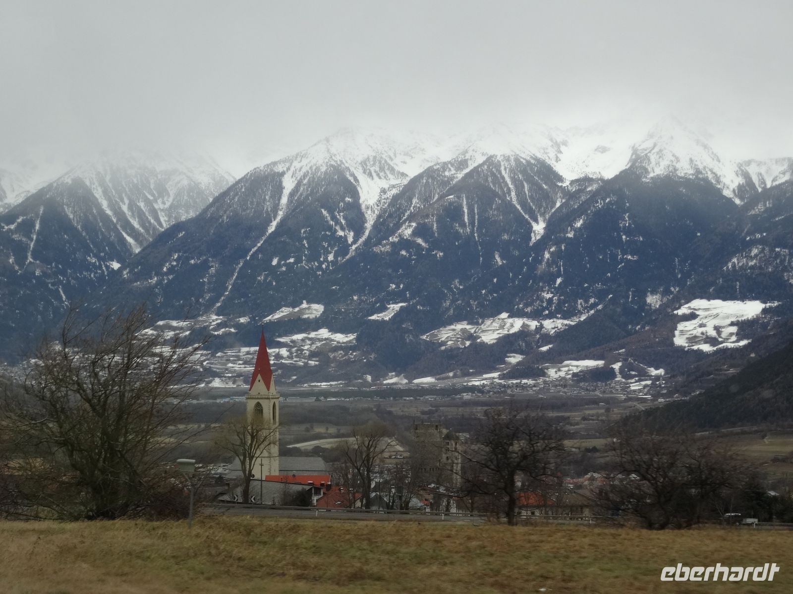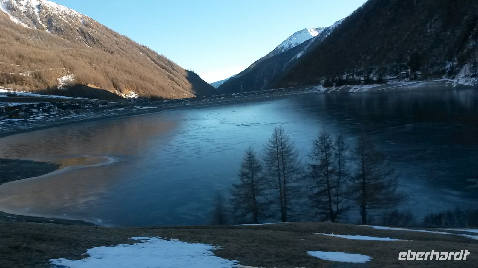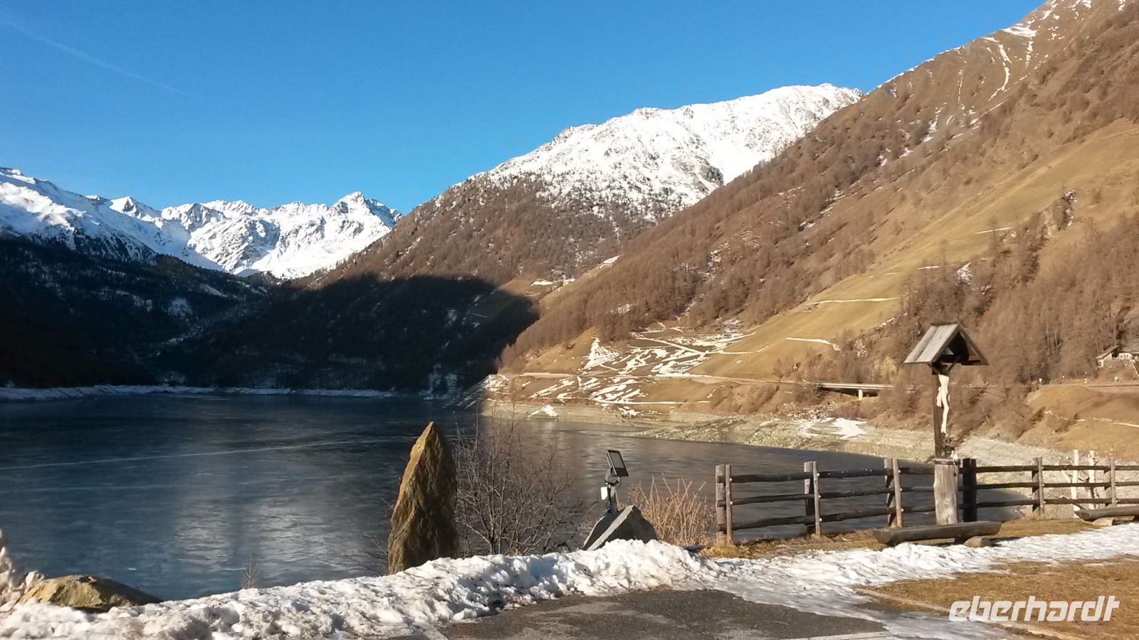 Kurz vor dem Mittag hieß es dann weiter durchzustarten. Es ging in den Vinschgau bis zum Reschensee. Vorbei an vielen kleineren oder größeren Orten, Naturns - bedeutenster Ort für die Obstkulturen mit Burg, Tschars – Abzweig ins Schnalstal mit den Wanderungen für die Wallwege oder Schloss/Burg Juval, Kastellbell mit Schloss, Schlanders - wirtschaftliches-kulturelles Zentrum im unteren Vinschgau, Schluders - mit dem bedeutensten Bau der Churburg, Mals - Hauptort des Obervinschgaus, Burgeis - Fürstenburg und Kloster/Benedektinerabtei Marienberg, St. Valentin auf der Haide – 2 km langer Haidersee und Skigebiet, Graun - Reschensee 6,5 km lang bis zu 1,5 km breiter Speicher - entstand 1949 durch Aufstauung des ursprünglichen großen Reschensees mit dem Grauner See als diese vereinigt wurden. In den Fluten versank das Dorf Altgraun mit über 100 Häusern, nur der alte Kirchturm (14.Jhd) ragt noch aus dem Wasser – ein groteskes Bild, das manchen auch nachdenklich stimmen mag. Für uns als Reisegäste ein besonders Fotomotiv mit dem zugefrorenen See. Damit konnte man den Turm erreichen und anfassen oder sogar lt. Foto wegschieben !