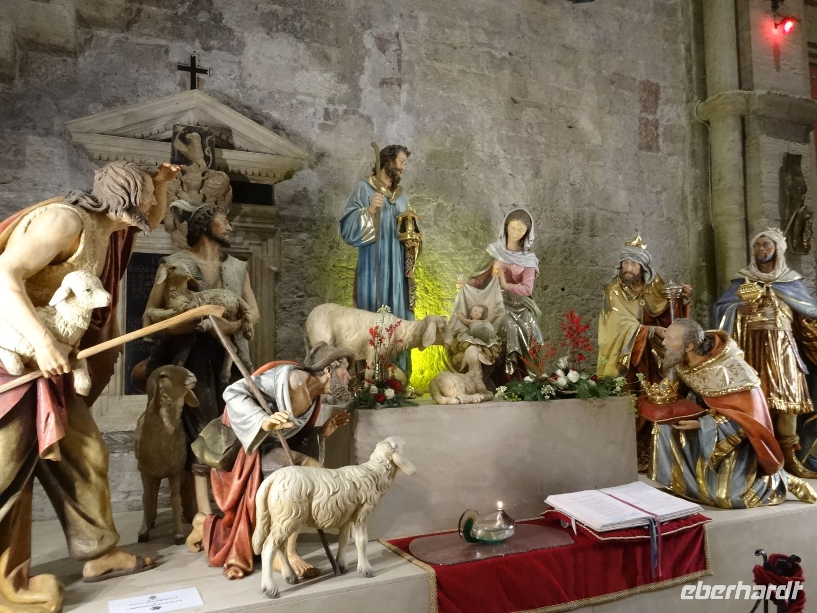 Mit vielen interessanten Informationen über Italien-Südtirol erreichten wir schnell die Stadt Bozen. Von hier fuhren wir in die Bergwelt hinein nach Seis und Kastelruth. In Kastelruth war der erste Fotostop. Wir spazierten zum Dorfplatz. Es war Zeit für einen Bummel durch die kleinen Gassen und wer wollte konnte einen Blick auch ins Kircheninnere werfen. Musikalische Klänge und einige Stände luden zum verweilen ein. Die großartige Gebirgskulisse des Schlern hatte einen besonderen Charakter. Weiter fuhren wir über den Paniedersattel ins Grödnertal. Bei St. Ulrich besuchten wir die Schnitzkunst-Dolfi-Land. DOLFI schnitzt seit über 130 Jahren in seiner Heimat das Grödner Tal im Herzen Südtirols aus diesem herrlichen Naturprodukt dem Holz, traumhafte Holzfiguren, wunderschöne Holzkrippen, Holzengel und Christbaumschmuck.