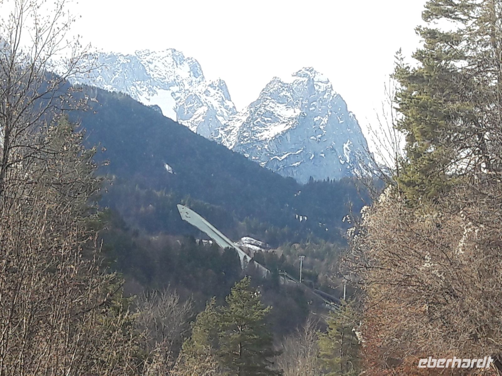 Diese Anreise erwies sich als sehr günstig, keine Staus oder Verzögerungen waren auf der Strecke. Sonnige Aussichten ermöglichten uns den Blick zur Zugspitze - Deutschlands höchste Erhebung im Wettersteingebirge dem Werdenfelser Land. Blick zur Schanzenanlage – 1. Informationen auch auf die bevorstehende 4 Schanzentournee.