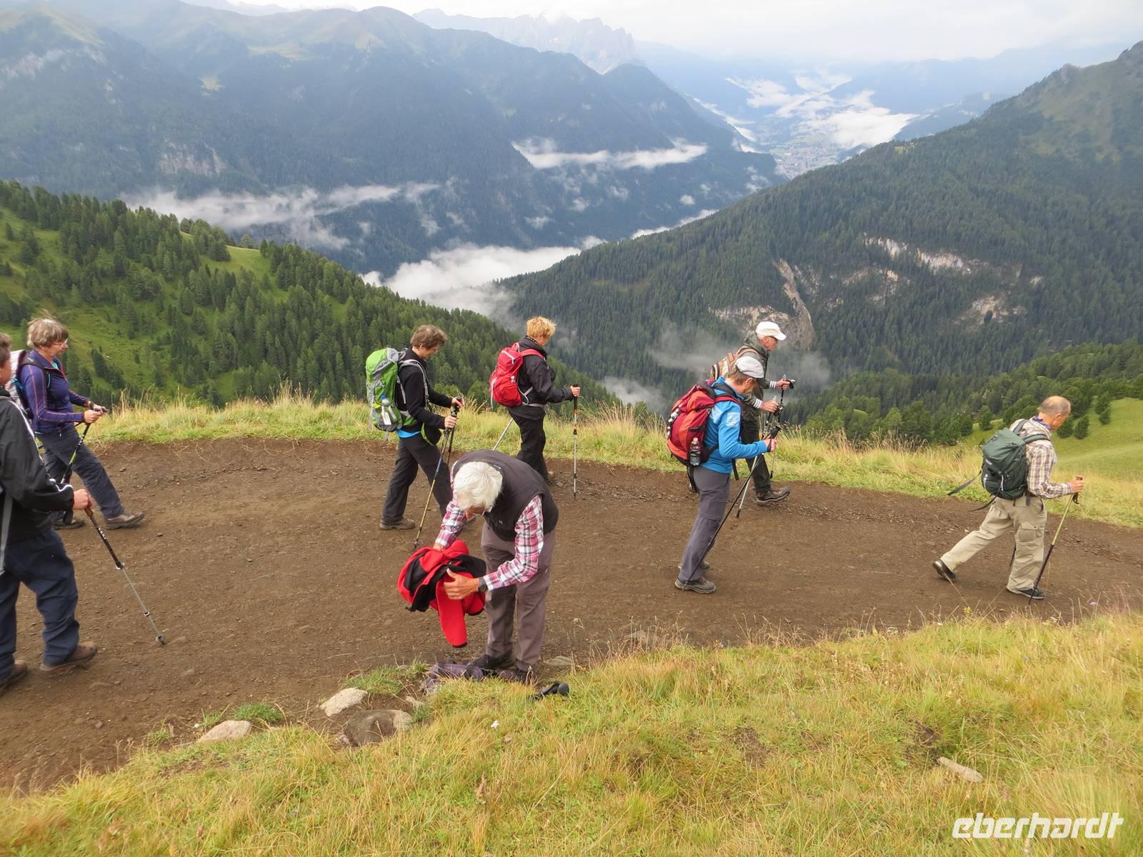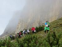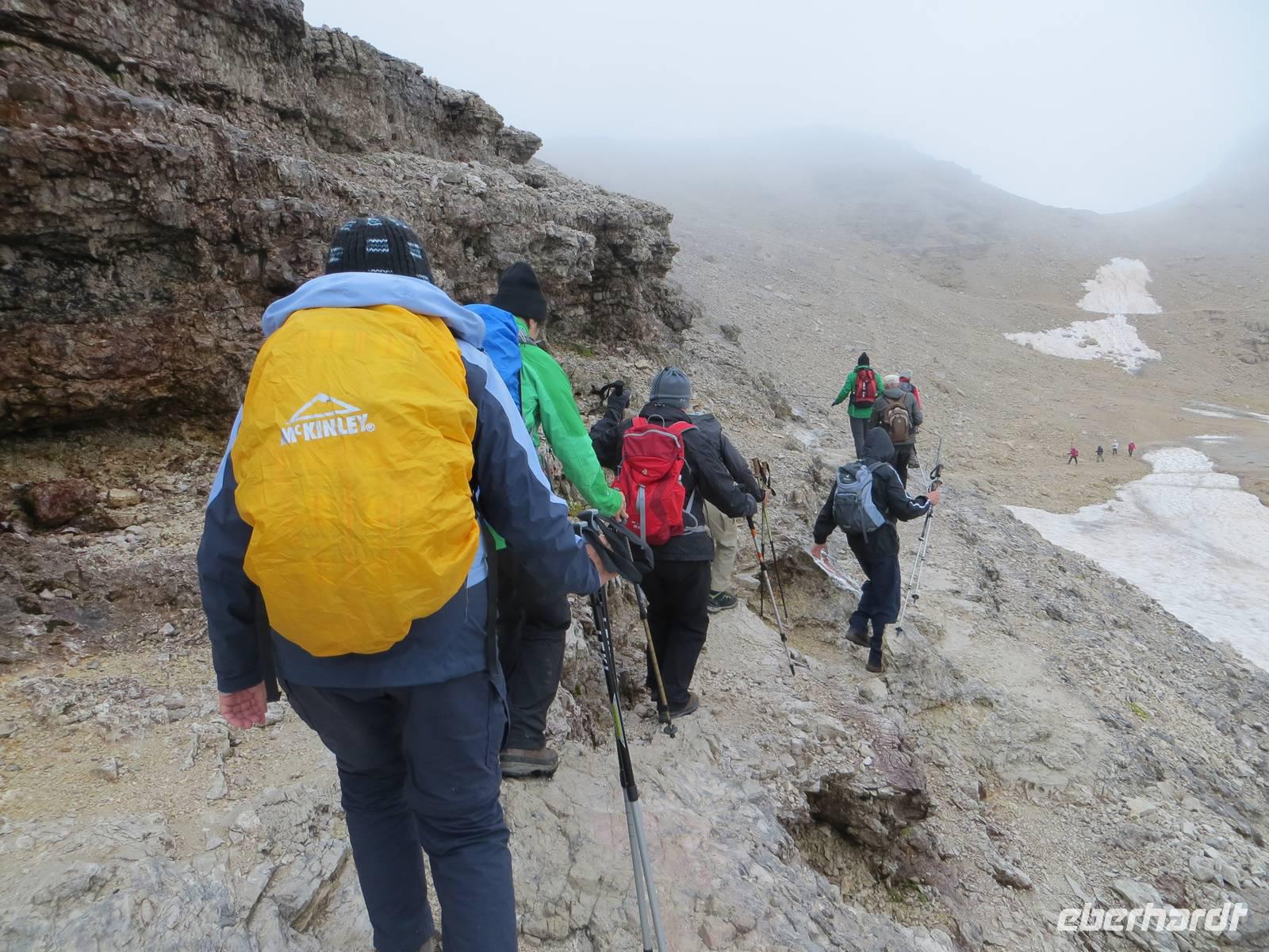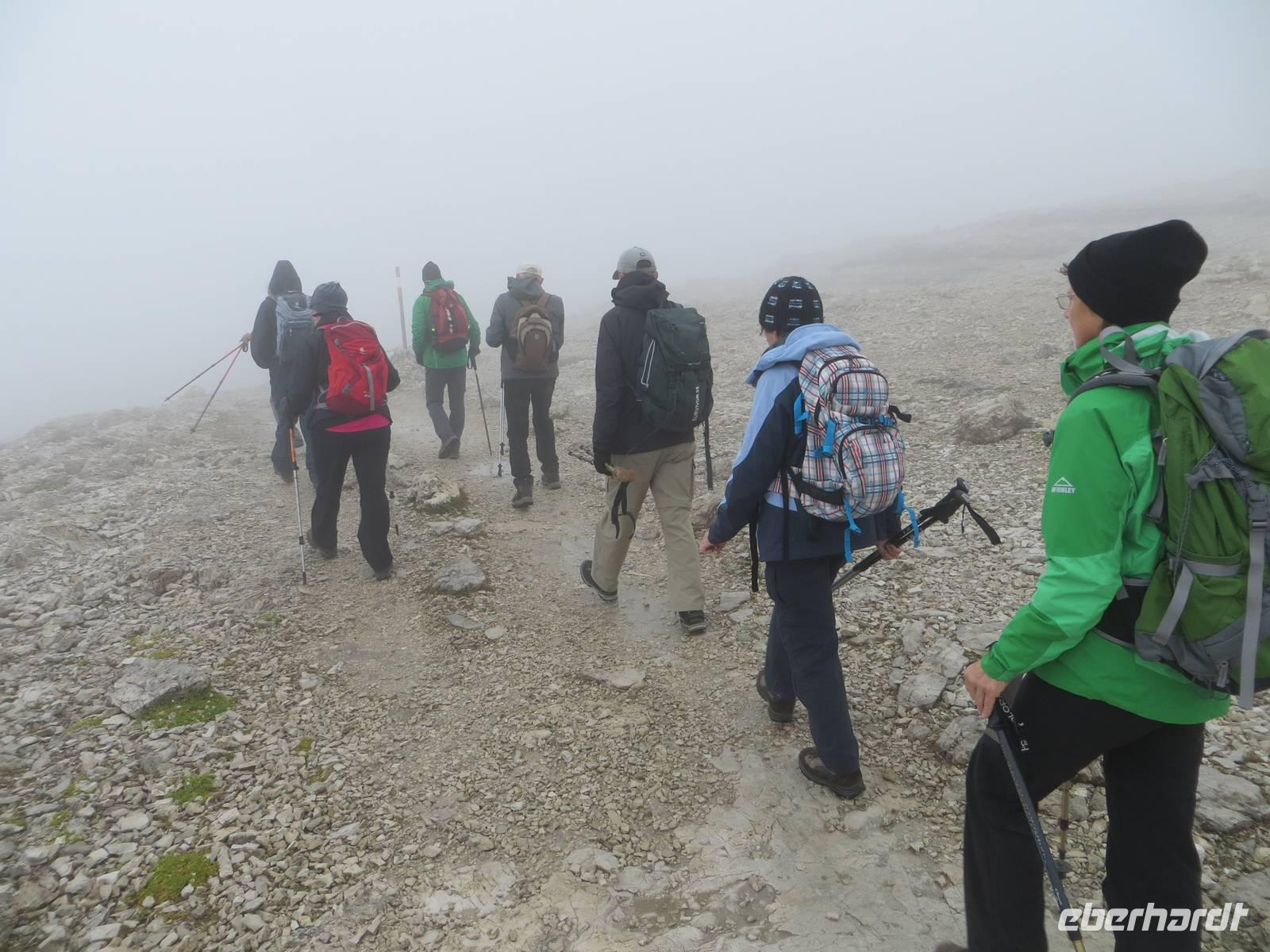 Über Alta Badia und den Hauptort Corvara fuhren wir direkt zum Pardoi Pass. Tief hingen die Wolken bei 2400 Meter, kein Gipfel war zu sehen. So wurde die „gemütlichere Tour" - geplant als Alternativtour - zur einzig möglichen Wanderung auf der Sella. Die Kabinenseilbahn brachte die Gäste vom Pardoi-Pass in 2952 Meter Höhe auf die Pardoi-Scharte. Bei einer Sicht von 50 Metern, scharfem Wind und vier Grad Celsius holten wir unsere Pullover und Wollmützen heraus, stülpten die Kapuzen über und schlüpften in die Handschuhe. Im Nebel und Wolkendunst entpuppte sich der Weg zur Boe-Hütte durchaus als anspruchsvoll. Gut zweihundert Höhenmeter mussten über manche Stufe und zwei Kettensicherungen genommen werden. Wo oft eine traumhafte Sicht über die Dolomiten möglich ist, im Norden eine Sicht bis zum höchsten Berg Österreichs dem Großglockner und dem gletscherbedeckten Großvenediger, im Süden die Marmolada und im Westen der König Friedrich August Weg und der Langkofel möglich ist: heute nur Nebel. Nach einer Kaffeepause auf der Boe-Hütte, dann Rückweg auf gleichem Wege. Die Sicht hatte sich von fünfig auf manchmal fünfhundert Meter erweitert. Als wir im Rückblick sahen, wo wir offenkundig entlang gingen, staunten wir doch mächtig - das sah aus Entfernung abschüssiger aus als beim direkten Gehen. Von der sonst so übervölkerten Sonnenterasse der Dolomiten ging es mit der Seilbahn hinab zum Bus. Zum Tagesausklang dann eine angenehme Busfahrt durch Hochabtei und Pustertal; bei Corvara noch einmal Hinaufblick zum Piz Boe im Nebel - wir hatten nichts verpasst.