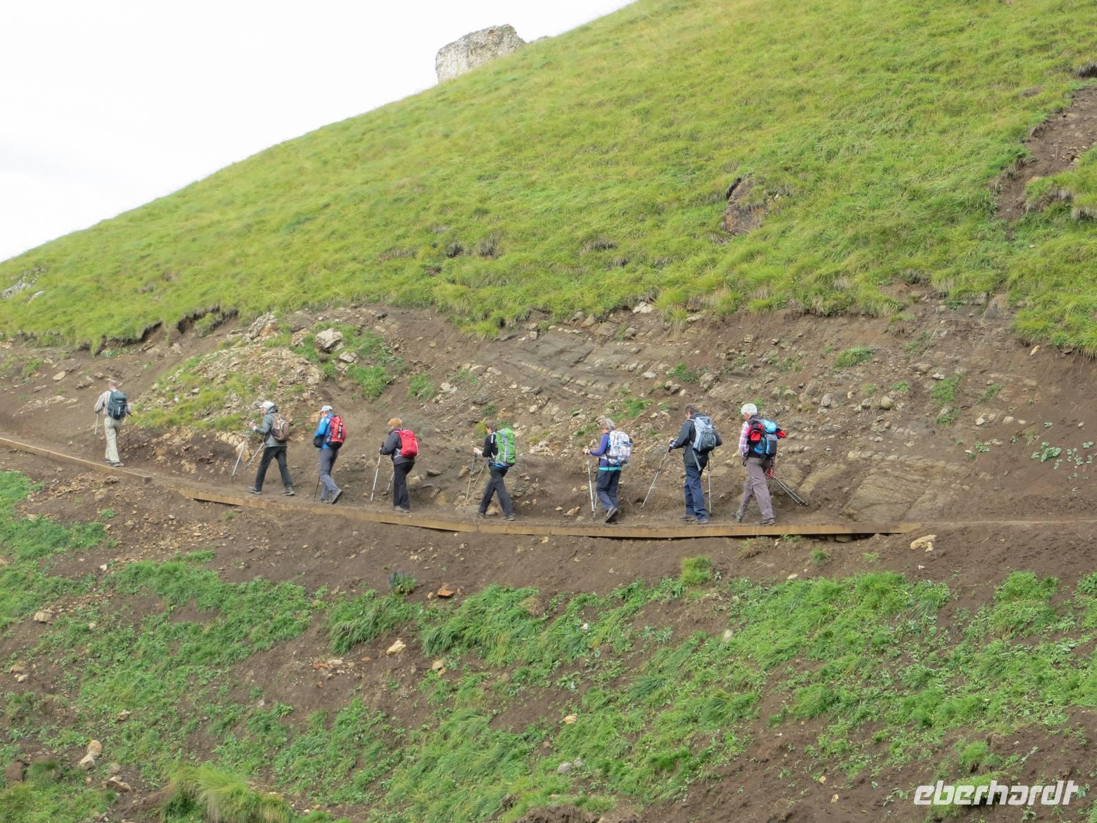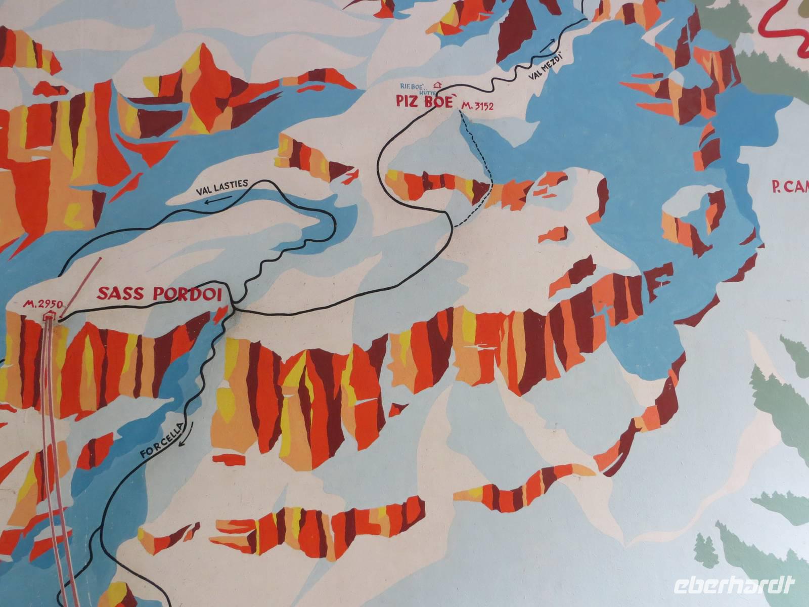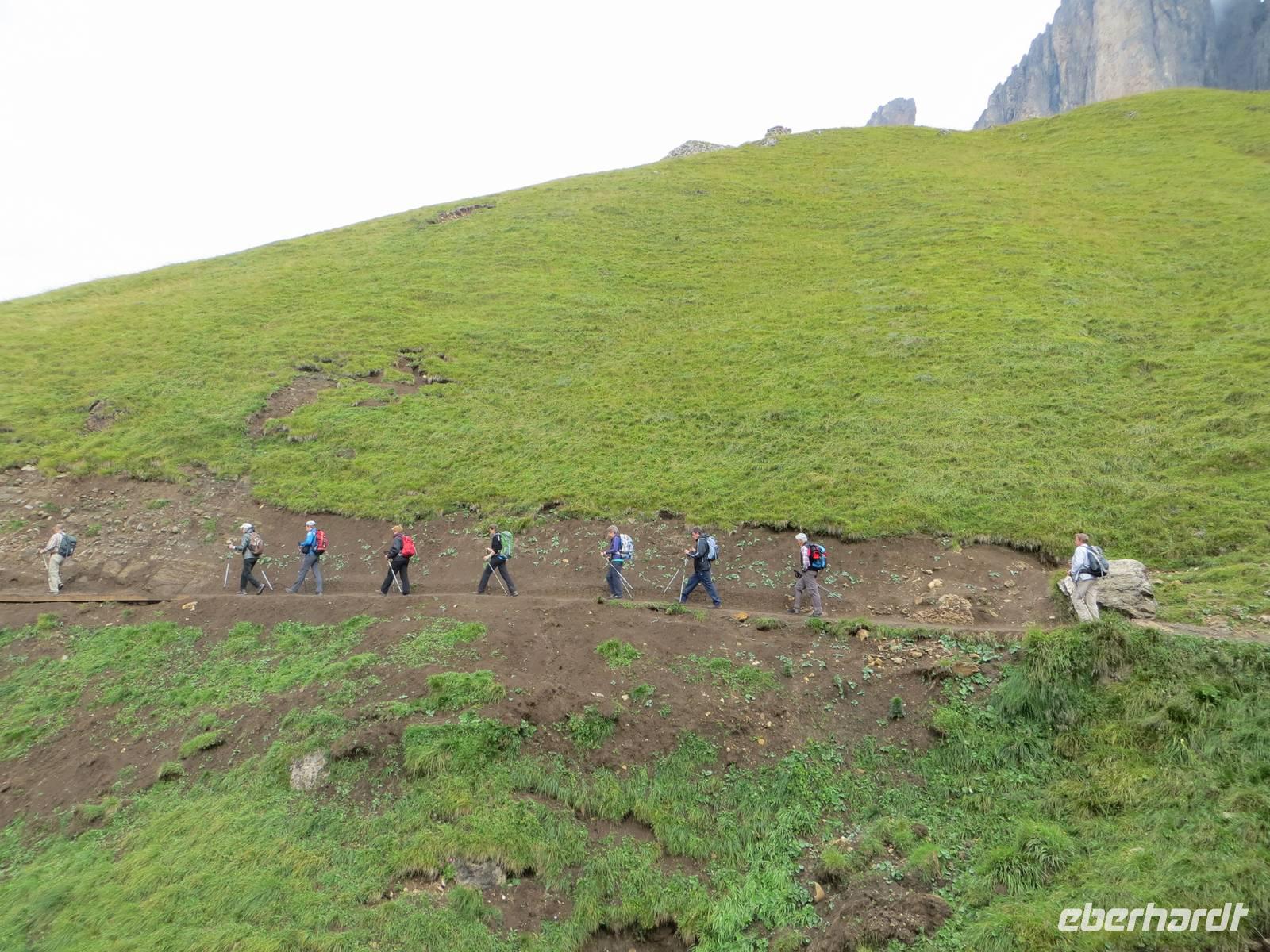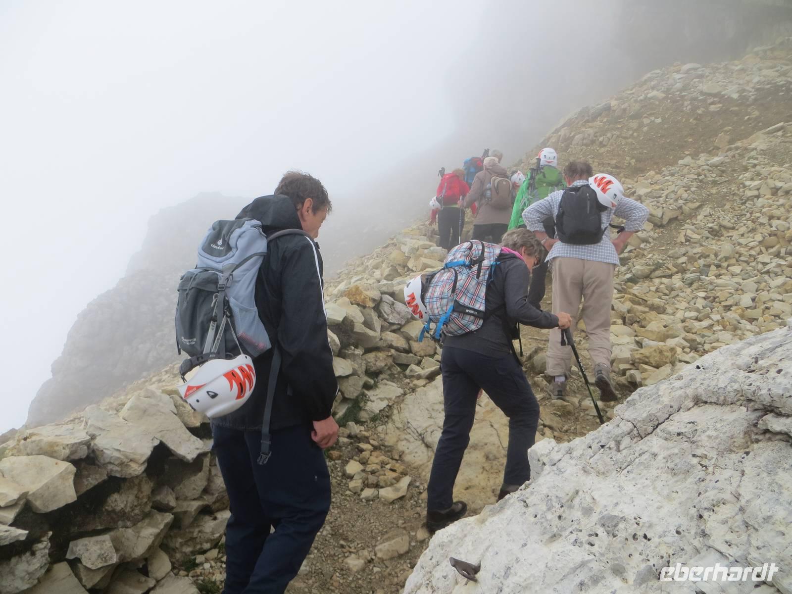 Über Alta Badia und den Hauptort Corvara fuhren wir direkt zum Pardoi Pass. Tief hingen die Wolken bei 2400 Meter, kein Gipfel war zu sehen. So wurde die „gemütlichere Tour" - geplant als Alternativtour - zur einzig möglichen Wanderung auf der Sella. Die Kabinenseilbahn brachte die Gäste vom Pardoi-Pass in 2952 Meter Höhe auf die Pardoi-Scharte. Bei einer Sicht von 50 Metern, scharfem Wind und vier Grad Celsius holten wir unsere Pullover und Wollmützen heraus, stülpten die Kapuzen über und schlüpften in die Handschuhe. Im Nebel und Wolkendunst entpuppte sich der Weg zur Boe-Hütte durchaus als anspruchsvoll. Gut zweihundert Höhenmeter mussten über manche Stufe und zwei Kettensicherungen genommen werden. Wo oft eine traumhafte Sicht über die Dolomiten möglich ist, im Norden eine Sicht bis zum höchsten Berg Österreichs dem Großglockner und dem gletscherbedeckten Großvenediger, im Süden die Marmolada und im Westen der König Friedrich August Weg und der Langkofel möglich ist: heute nur Nebel. Nach einer Kaffeepause auf der Boe-Hütte, dann Rückweg auf gleichem Wege. Die Sicht hatte sich von fünfig auf manchmal fünfhundert Meter erweitert. Als wir im Rückblick sahen, wo wir offenkundig entlang gingen, staunten wir doch mächtig - das sah aus Entfernung abschüssiger aus als beim direkten Gehen. Von der sonst so übervölkerten Sonnenterasse der Dolomiten ging es mit der Seilbahn hinab zum Bus. Zum Tagesausklang dann eine angenehme Busfahrt durch Hochabtei und Pustertal; bei Corvara noch einmal Hinaufblick zum Piz Boe im Nebel - wir hatten nichts verpasst.