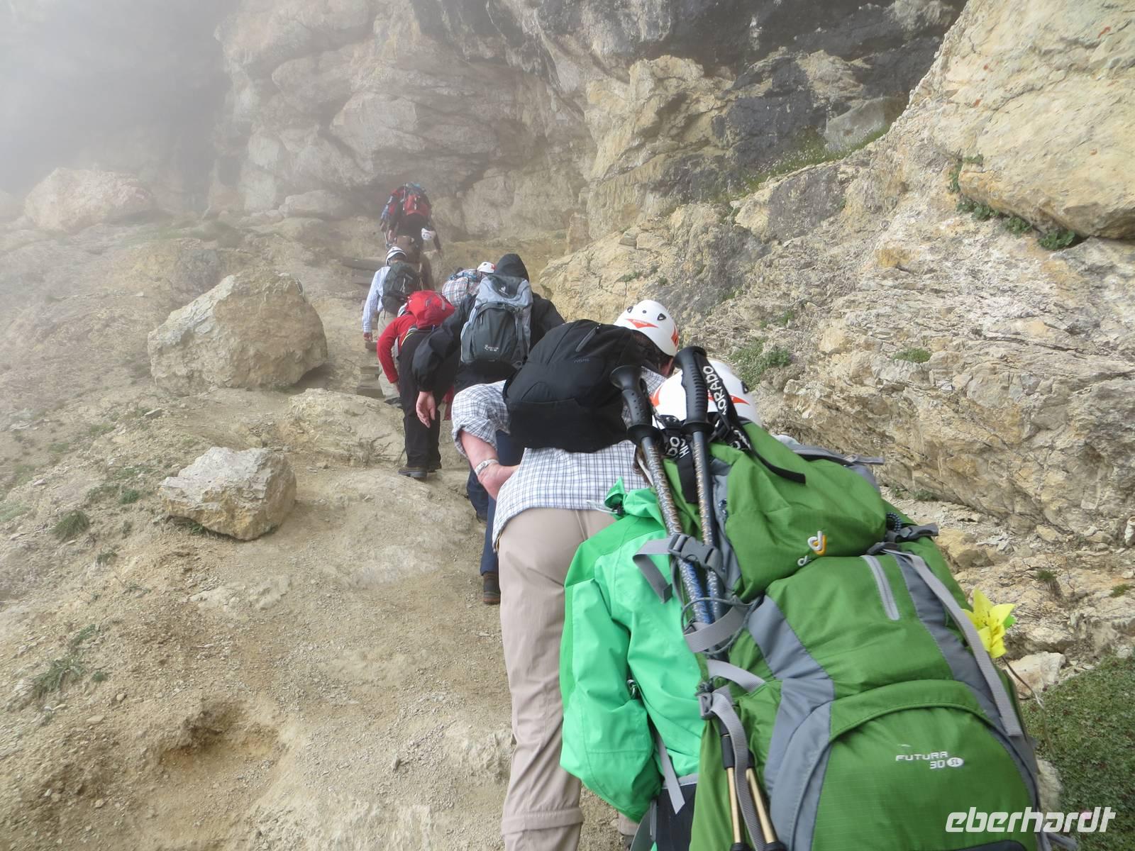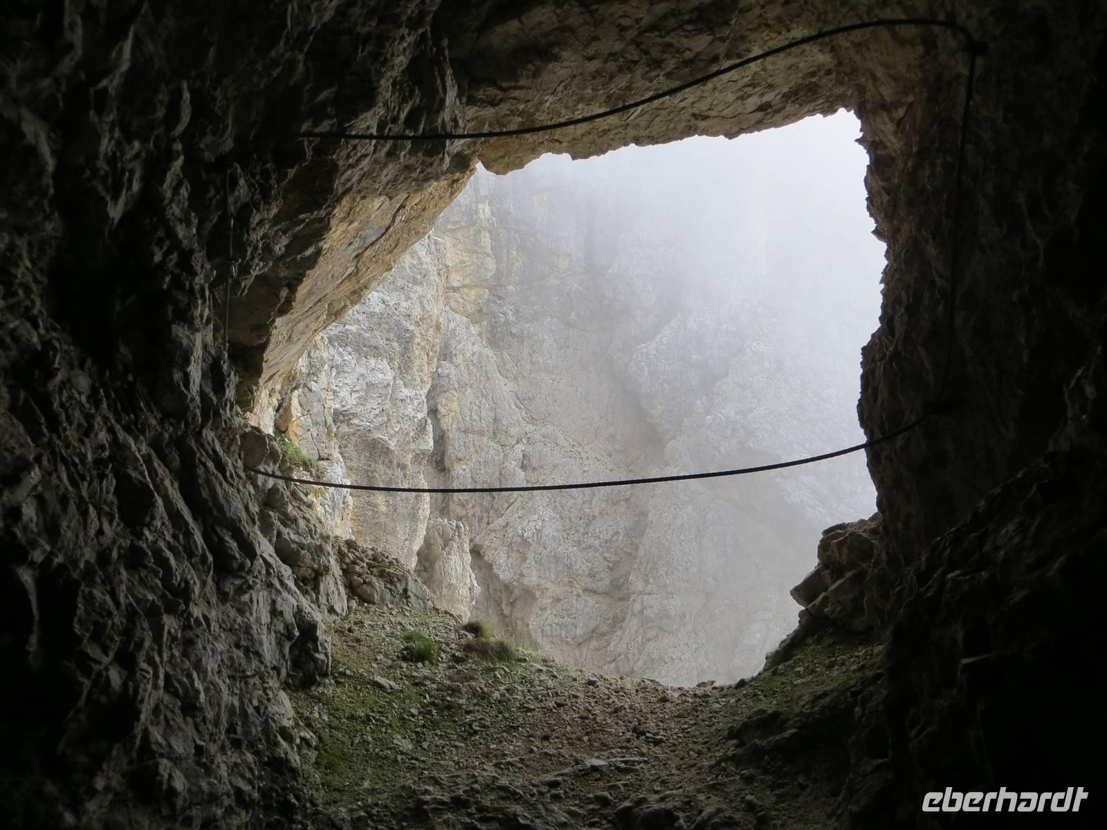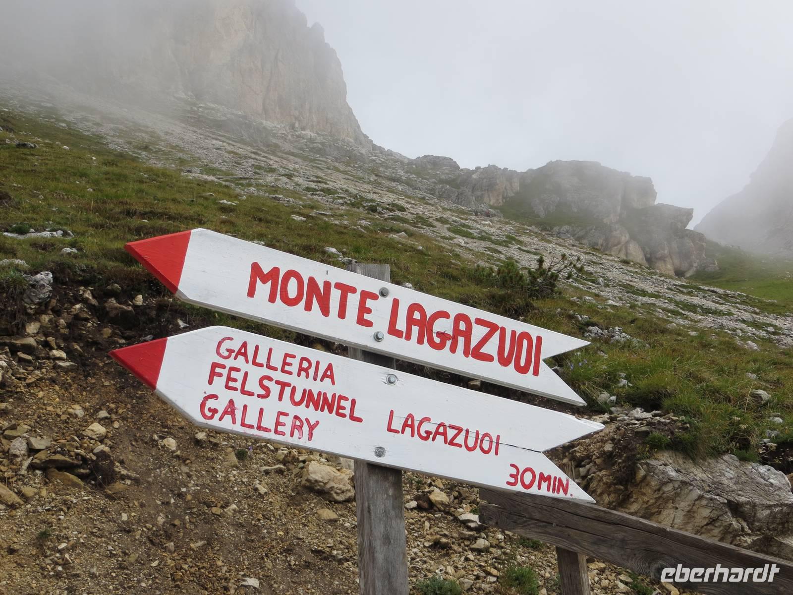 Was macht m,an an einem Tag mit Regengefahr und tiefen Wolken? - eine Tour, die nicht zu lang ist und sehr felsorientiert ist:. So entschieden wir uns für den Alpinisteig am Lagazuoui, zumal er auf über einem Kilomneter im ausgehölten Felsen aufsteigt. Am ersten Wandertag war vielleicht die Konditionierung noch nicht so gut vollzogen aber alle hatten gute Bergerfahrung. Vorab prüften wir die vorhandenen Stirn- und Taschenlampen und mieteten Klettersteighelme am Falzaregopass. Nach neun Uhr stiegen wir zunächst über den Hang aufwärts zum Lagazoiu. Unser Wegziel war ein Alpinisteig, ein Weg, den im ersten Weltkrieg die italienischen Alpini-Soldaten - und die kaiserlichen Soldaten der Österreicher machten es ebenso - in den Berg trieben. Über einige mit Drahtseil gesicherte Stellen erreichten wir den Stollen, der 1915 in den Berg getrieben wurde. Nun ging es vierzig Minuten im meist dunklen Kriegsstollen hinauf. Die Touristiker der Neuzeit haben Schwellen quer gelegt, so dass Stufen entstanden. Immer mal wieder ein Loch durch den Fels mit Blick in den Abgrund voller Wolkendunst, einst waren dies waren dies Geschütz- und MG-Stellungen an der „Dolomitenfront" - Weltgeschichte vor nunmehr fast hundert Jahren. Zehntausende Opfer forderte der Stellungskrieg in den Dolomiten; hunderte am Lagazoiu.