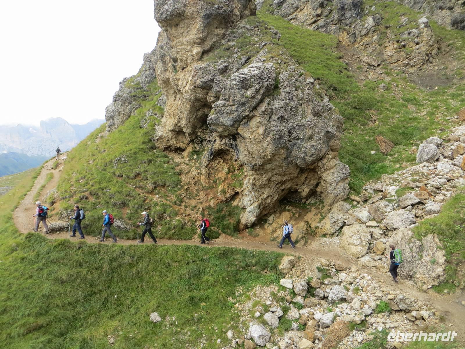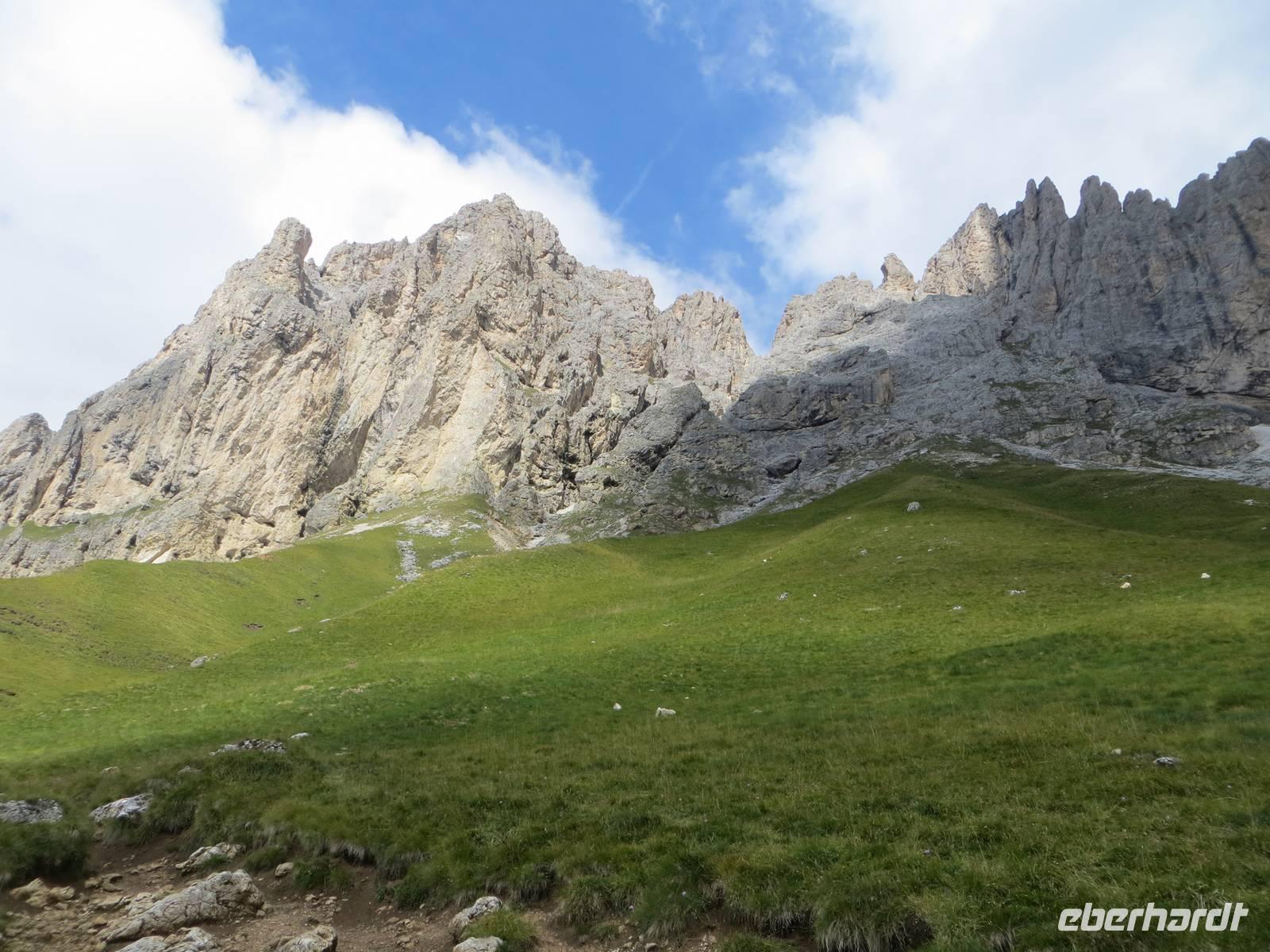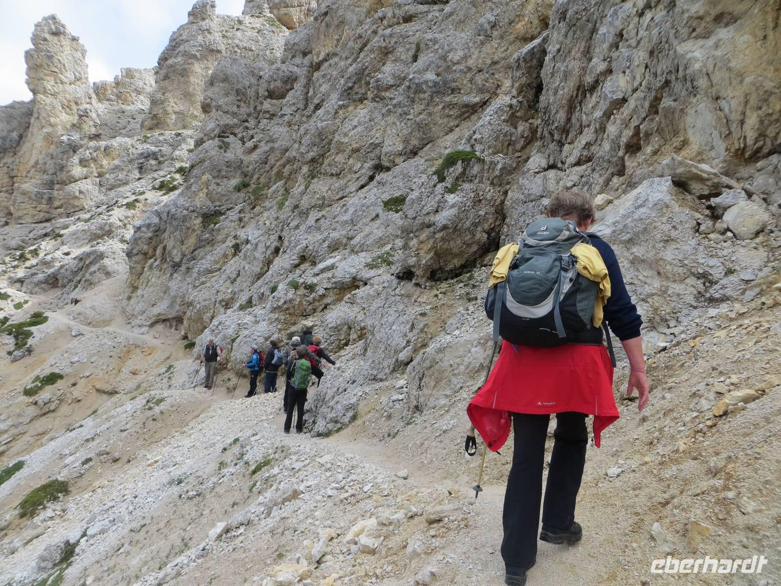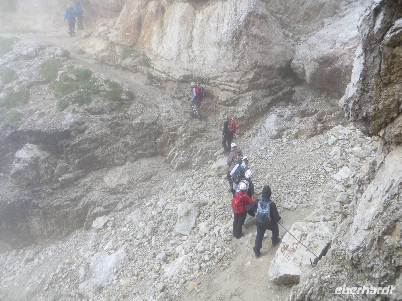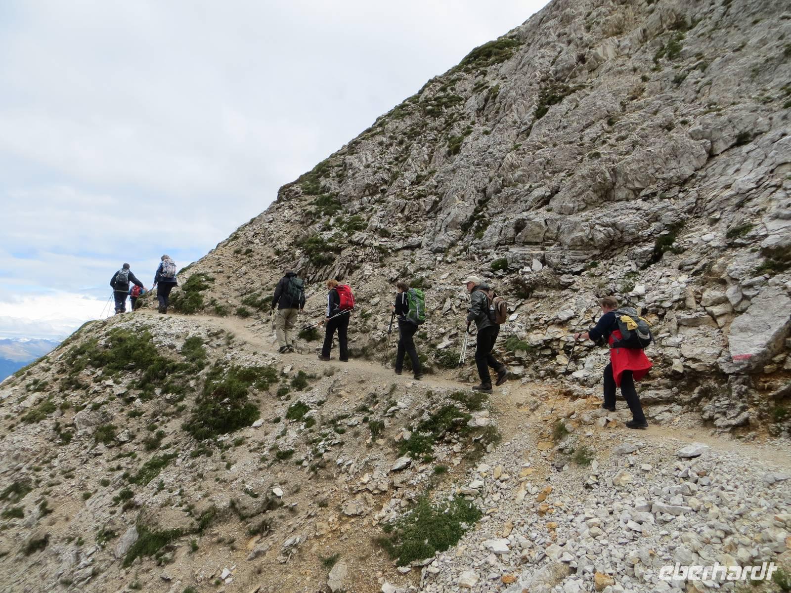 Einer der markantesten Felsstöcke der Dolomiten stand heute im Programm. Unterhalb des Gipfelaufbaus und über Klettersteige lässt er sich in einer Höhe von über zweitausend Metren umqueren und überqueren. Das Programm schreibt hierfür eine der leichteren Möglichkeiten , aber immer noch als „anspruchsvoll" (!) aus. 15 km teilweise schmaler Hochgebirgspfad, schottrige Abschüssigkeit, Höhenmeter im Aufstieg und Abstieg, sowie ein fast klettersteigartiger, kettengesicherter Aufstieg hinter der Kölner Hütte (Rosengartenhütte) rechtfertigen diese Eberhardt-Bewertung auf jeden Fall.