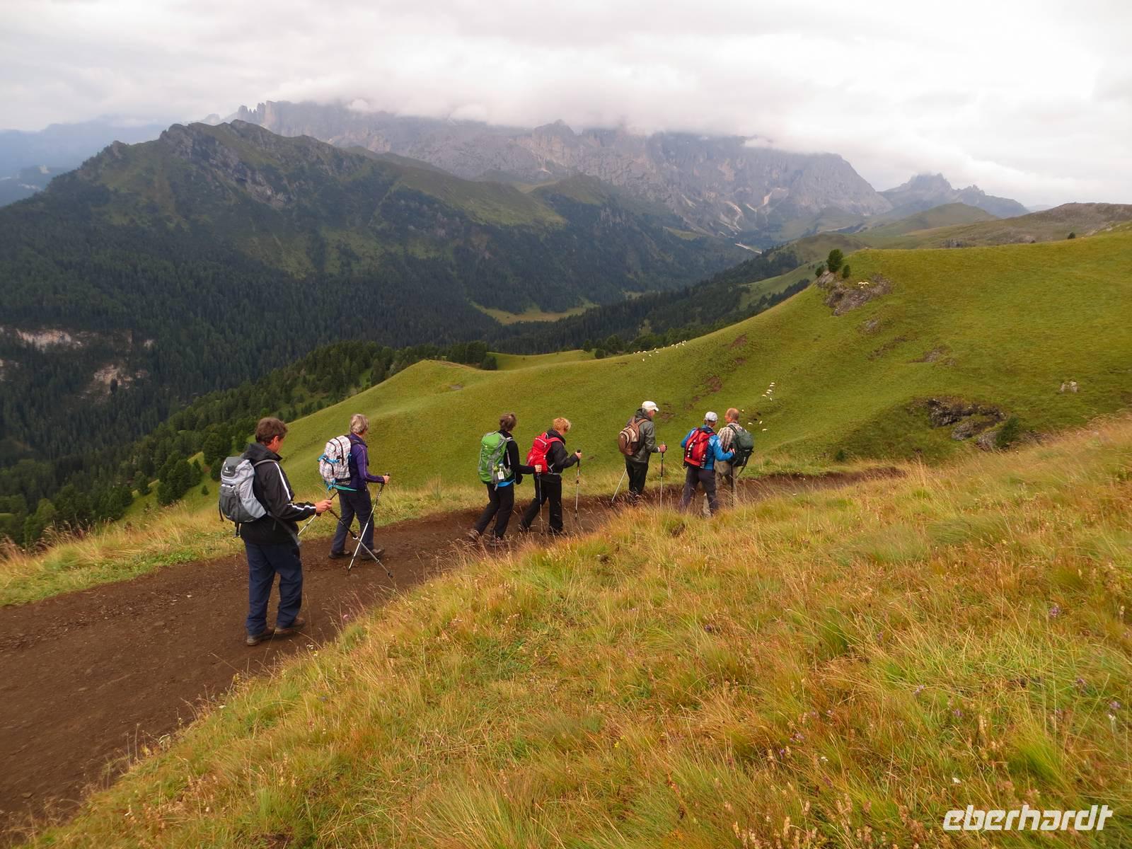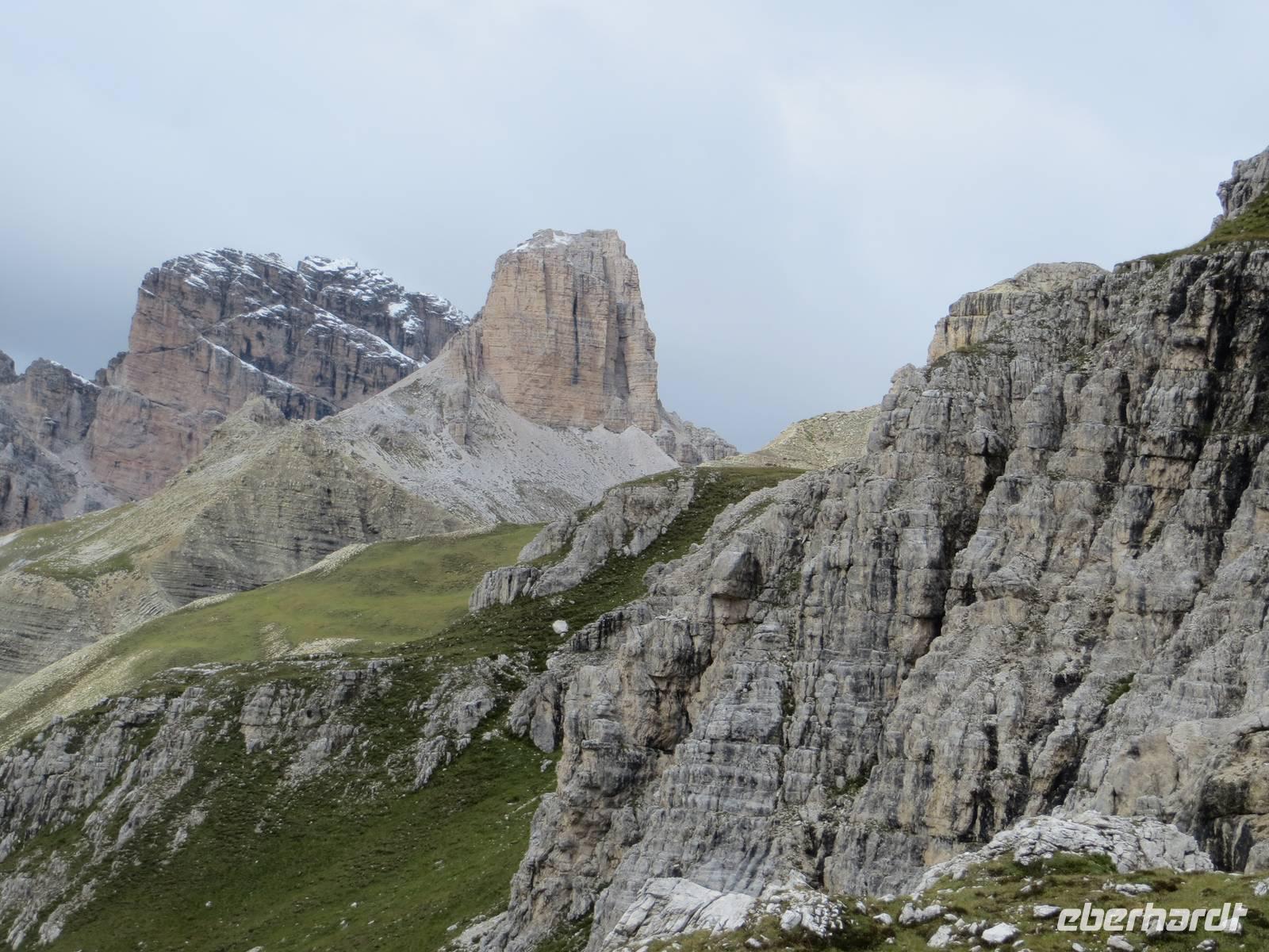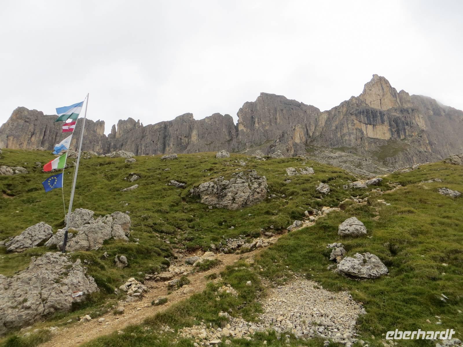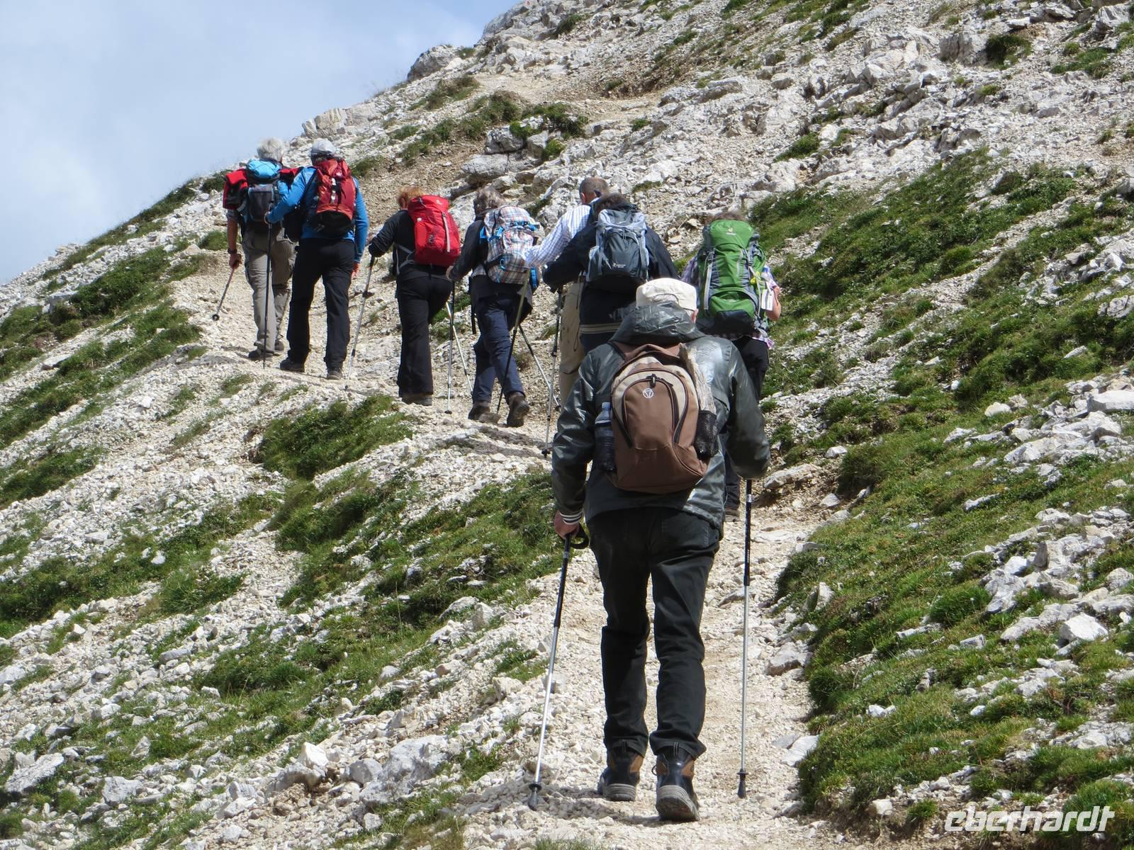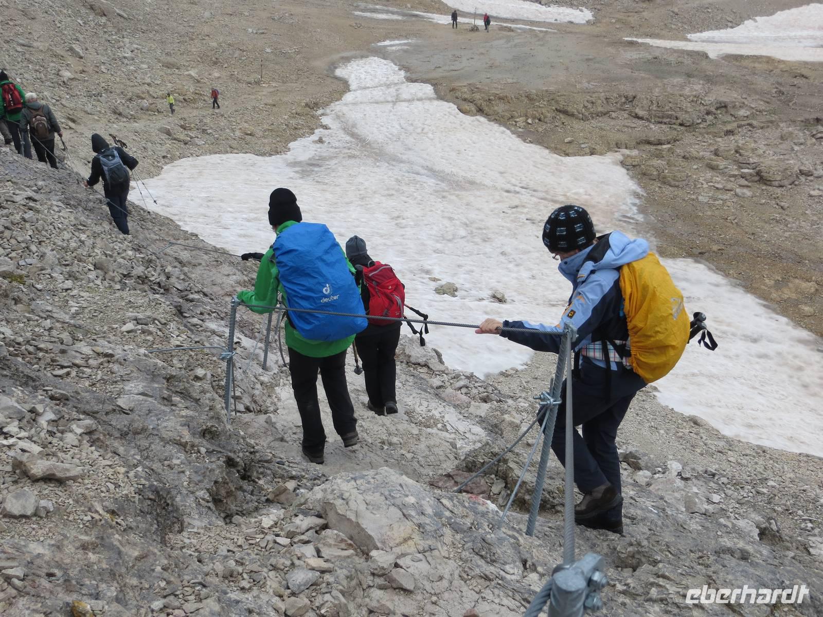 Einer der markantesten Felsstöcke der Dolomiten stand heute im Programm. Unterhalb des Gipfelaufbaus und über Klettersteige lässt er sich in einer Höhe von über zweitausend Metren umqueren und überqueren. Das Programm schreibt hierfür eine der leichteren Möglichkeiten , aber immer noch als „anspruchsvoll" (!) aus. 15 km teilweise schmaler Hochgebirgspfad, schottrige Abschüssigkeit, Höhenmeter im Aufstieg und Abstieg, sowie ein fast klettersteigartiger, kettengesicherter Aufstieg hinter der Kölner Hütte (Rosengartenhütte) rechtfertigen diese Eberhardt-Bewertung auf jeden Fall.