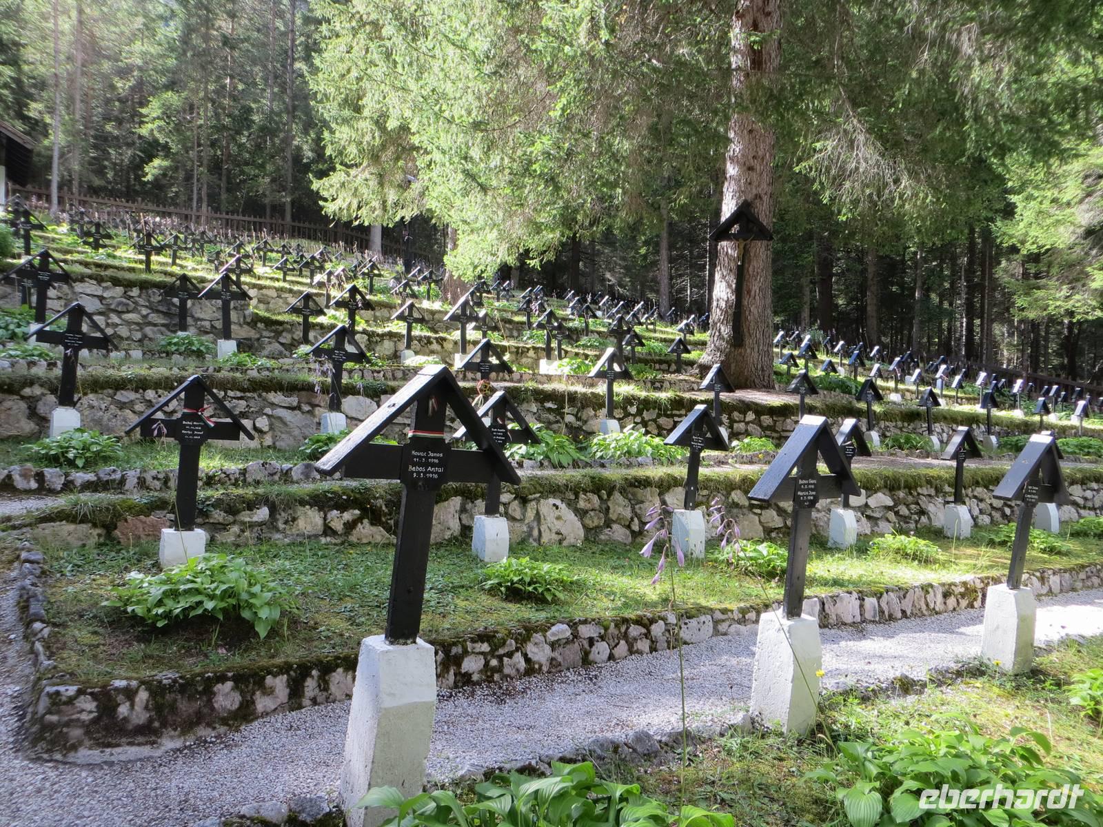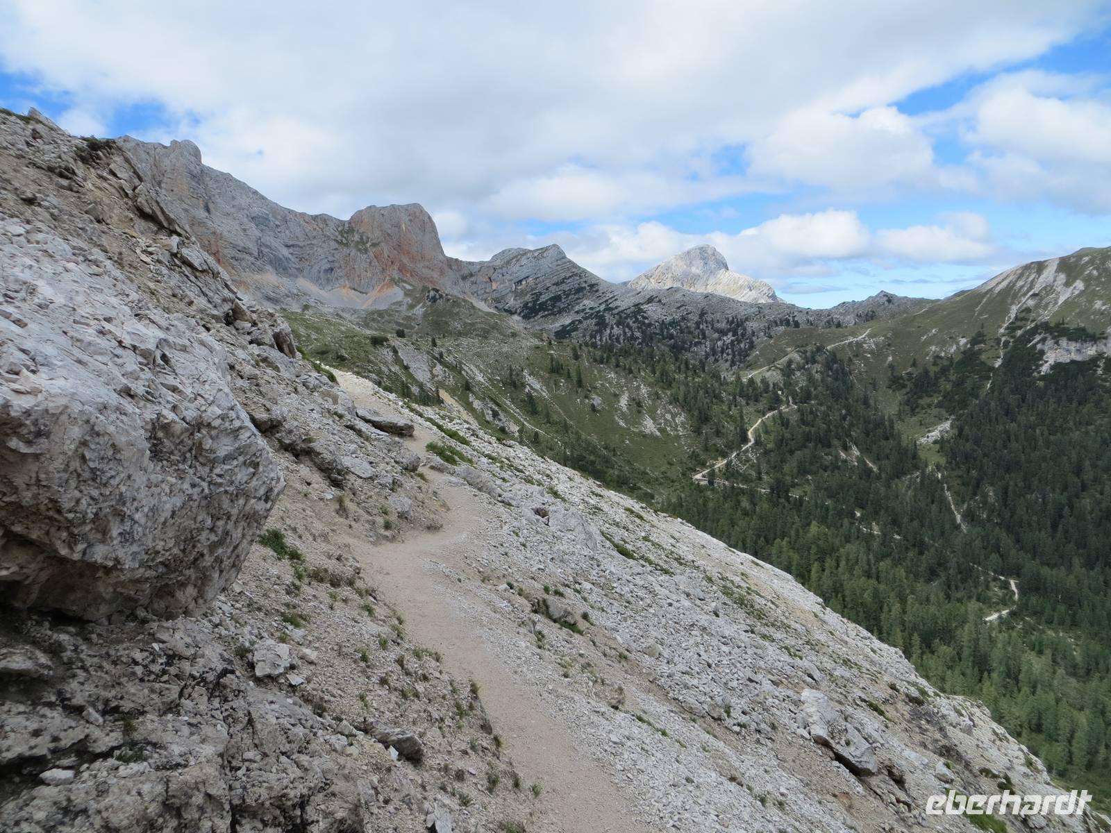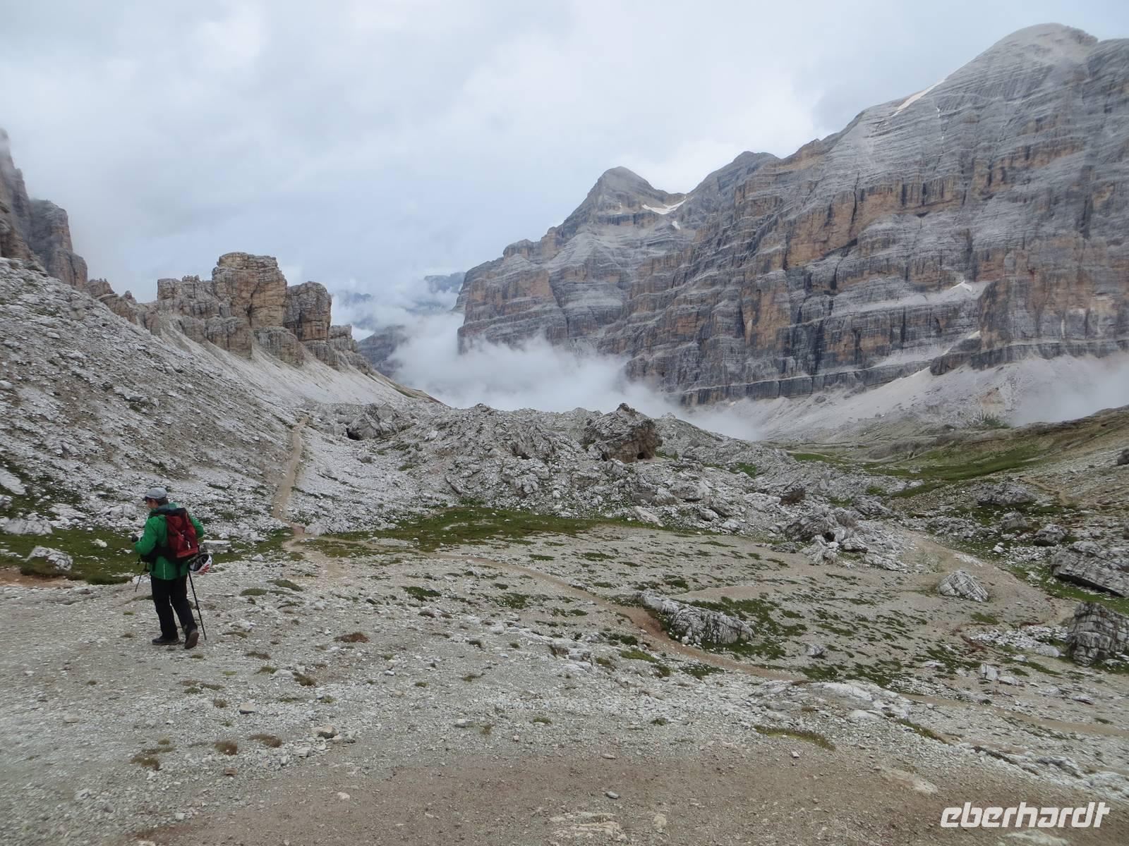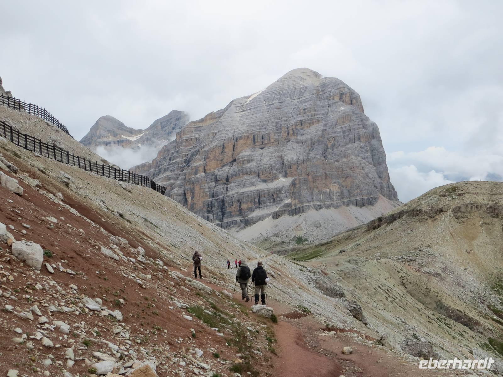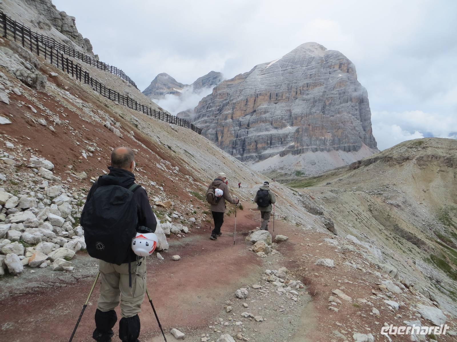 Freundlicheres Kapitel: Kurzes Aufatmen beim Austritt aus dem Stollen mit ohne die sonst grandiosem Blick auf die Tofane. Dann noch einige hunderte Meter bis zur oberen Seilbahnstation, teilweise durch alte Schützengräben.