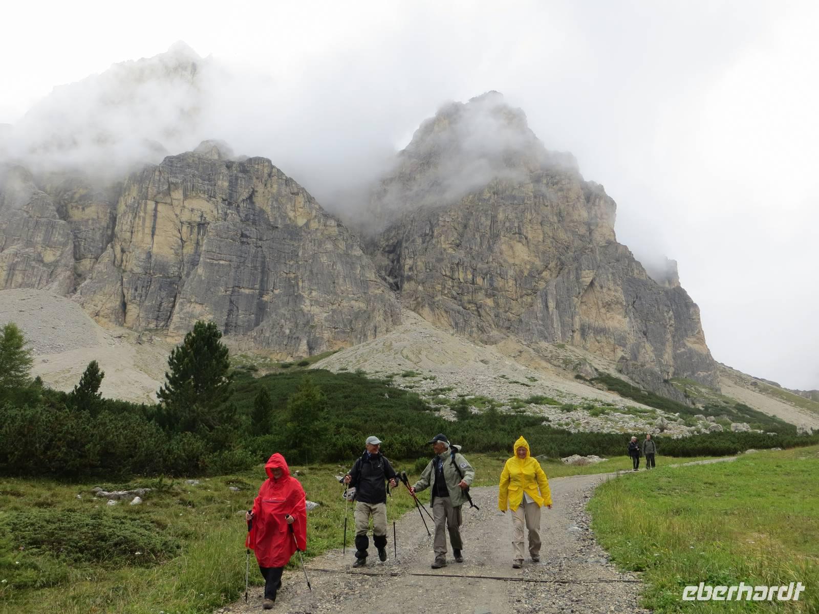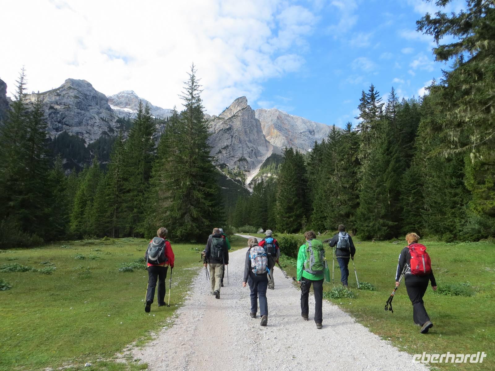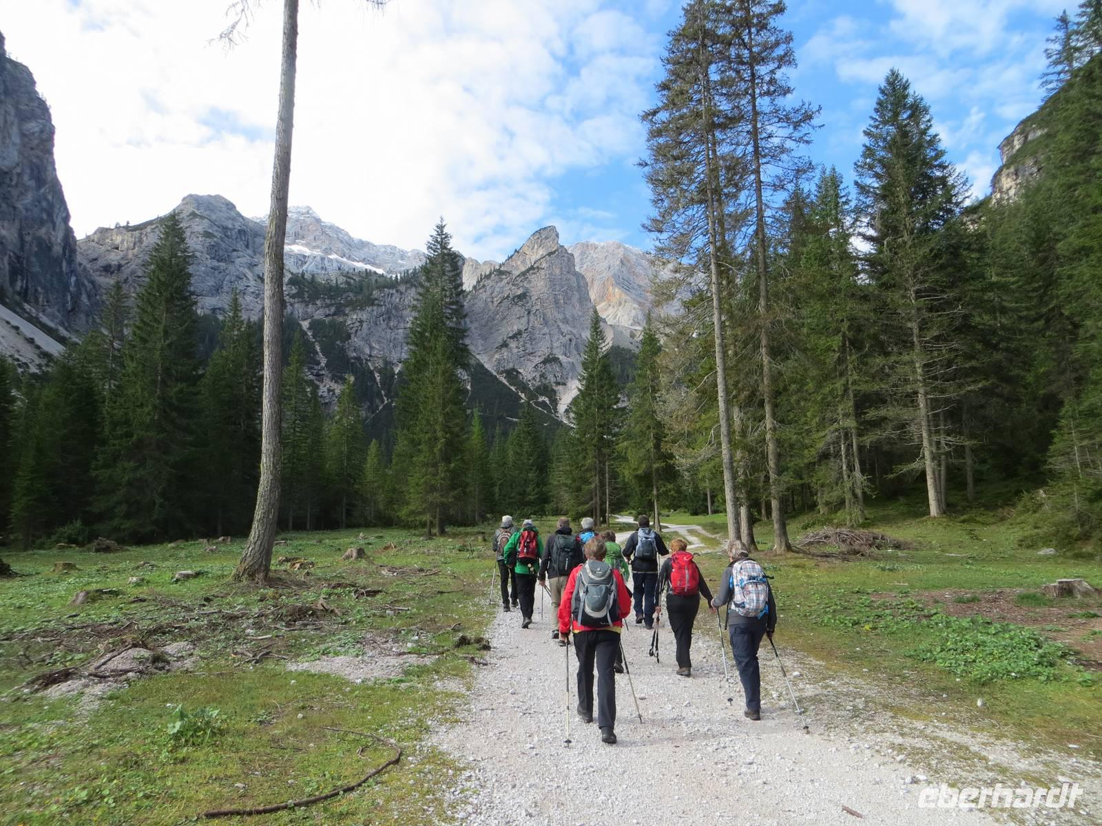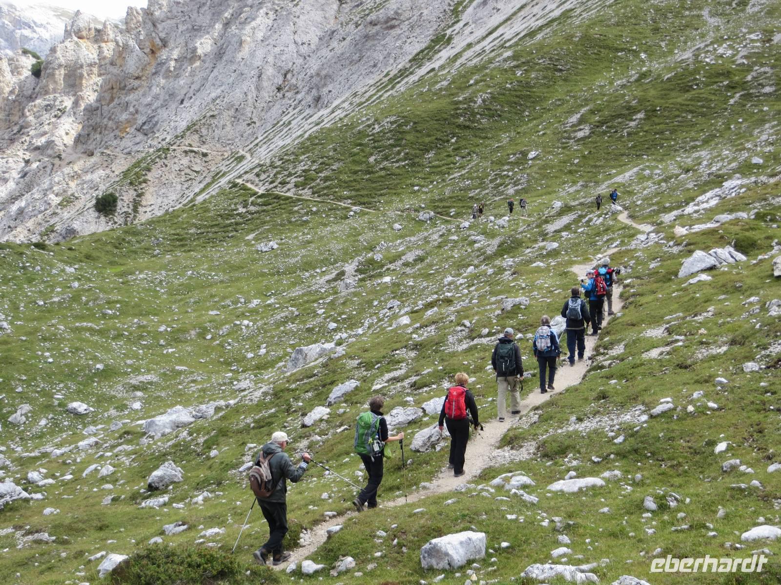 Endlich ein sonniger Tag, zumindest am Morgen. Nach knapp einstündiger Busfahrt waren wir schon kurz vor Neun auf dem Parkplatz Brückele im Pragsertal. Nun ging es bald steil hinauf; sechshundertfünfzig Höhenmeter bis zur Rossalm in 2138 M üNN. Nach zwei Stunden hatten alle Gäste dies geschafft- Auf schmalem Weg ging es dann nochmals leicht aufwärts und auf schmalem Pfad am Hang entlang. An einigen Stellen gaben Ketten zusätzliche Sicherheit. Nach 850 bewältigten Höhenmetern erreichten wir einen unscheinbaren Pass zwischen den Gaiseln: Zeit zur Mittagsrast. Vor uns tat sich der Blick zu den Drei Zinnen auf. Den Patternsattel, gestern unser höchster Wanderpunkt, konnten wir gut erkennen. Bald ging es nun steinig-geröllig hinab, da war wohl doch der Aufstieg fast angenehmer. Die letzte Stunde des Abstiegs war dann eher unkompliziert , so dass wir nach sieben Stunden den Busparkplatz erreichten. Es hatte sich eingetrübt, aber wir hatten eine Wanderung im Trockenen mit beeindruckenden Ausblicken in alpinem Gelände.