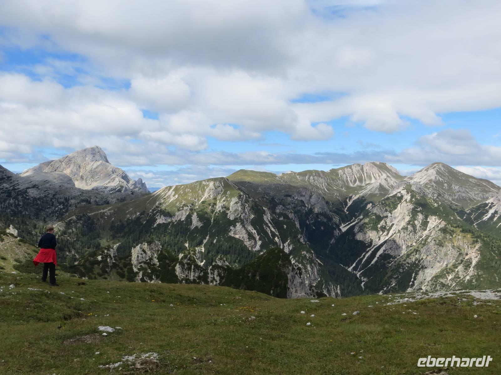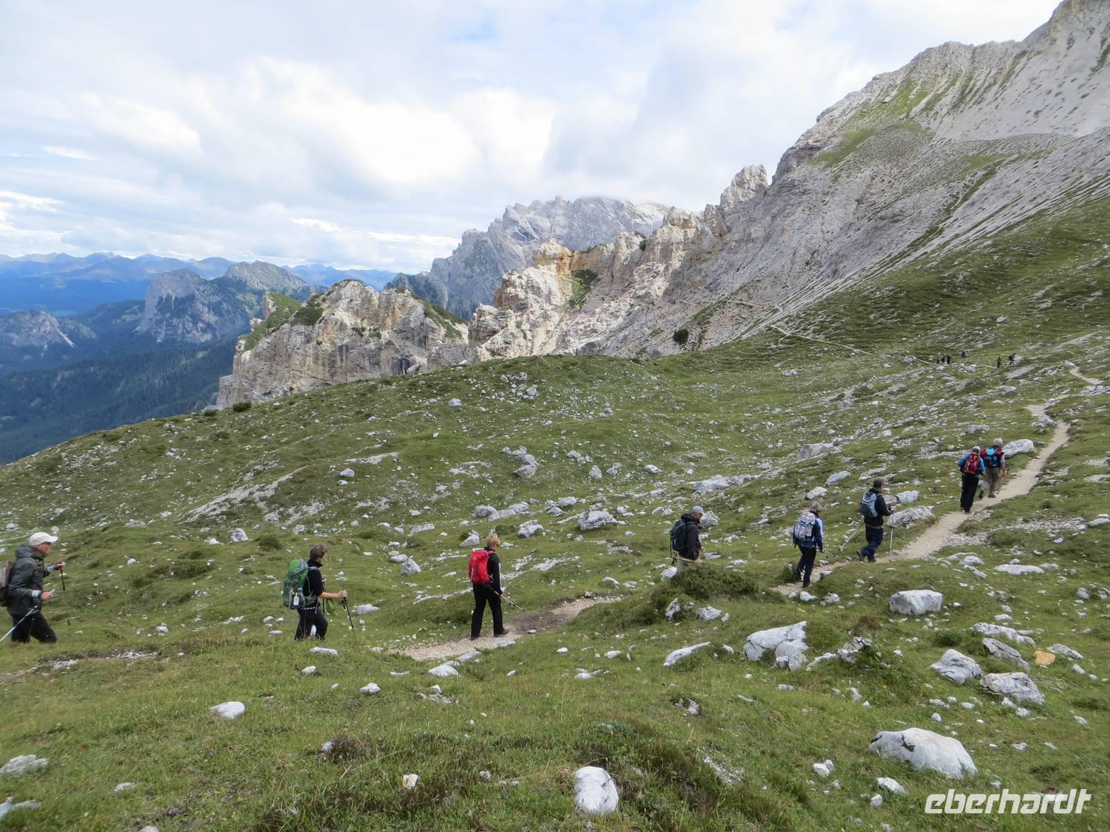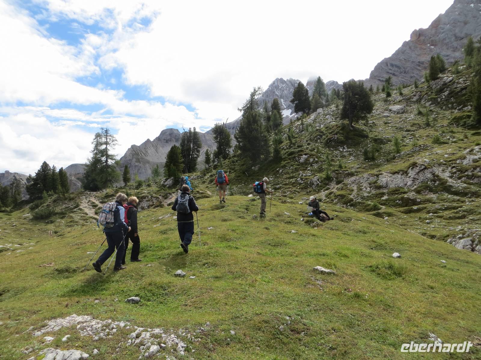 Endlich ein sonniger Tag, zumindest am Morgen. Nach knapp einstündiger Busfahrt waren wir schon kurz vor Neun auf dem Parkplatz Brückele im Pragsertal. Nun ging es bald steil hinauf; sechshundertfünfzig Höhenmeter bis zur Rossalm in 2138 M üNN. Nach zwei Stunden hatten alle Gäste dies geschafft- Auf schmalem Weg ging es dann nochmals leicht aufwärts und auf schmalem Pfad am Hang entlang. An einigen Stellen gaben Ketten zusätzliche Sicherheit. Nach 850 bewältigten Höhenmetern erreichten wir einen unscheinbaren Pass zwischen den Gaiseln: Zeit zur Mittagsrast. Vor uns tat sich der Blick zu den Drei Zinnen auf. Den Patternsattel, gestern unser höchster Wanderpunkt, konnten wir gut erkennen. Bald ging es nun steinig-geröllig hinab, da war wohl doch der Aufstieg fast angenehmer. Die letzte Stunde des Abstiegs war dann eher unkompliziert , so dass wir nach sieben Stunden den Busparkplatz erreichten. Es hatte sich eingetrübt, aber wir hatten eine Wanderung im Trockenen mit beeindruckenden Ausblicken in alpinem Gelände.