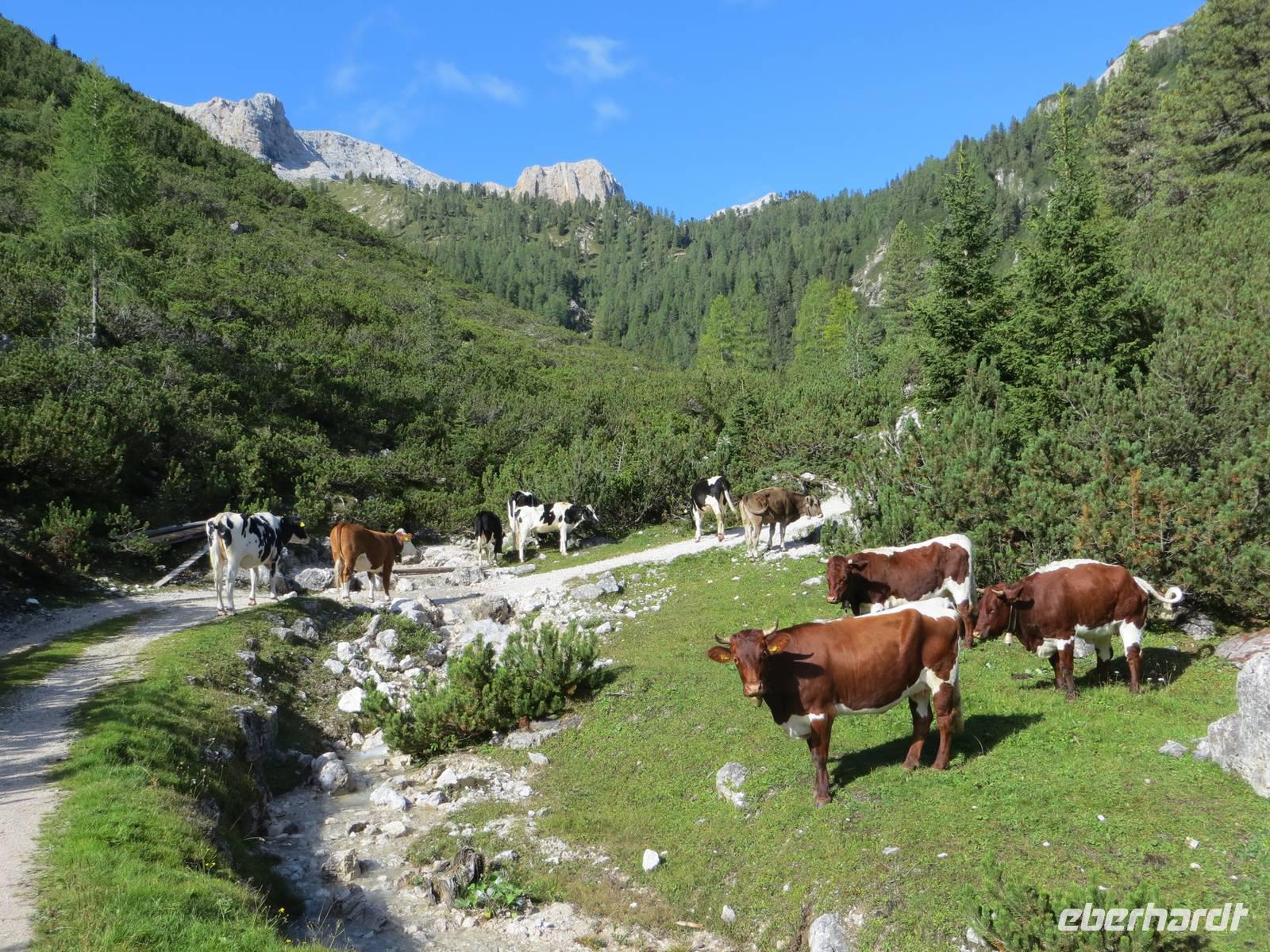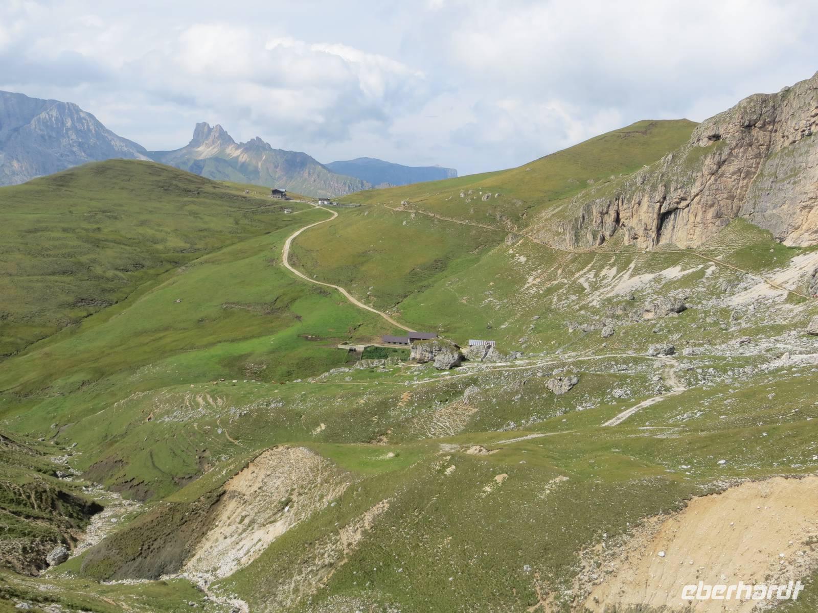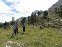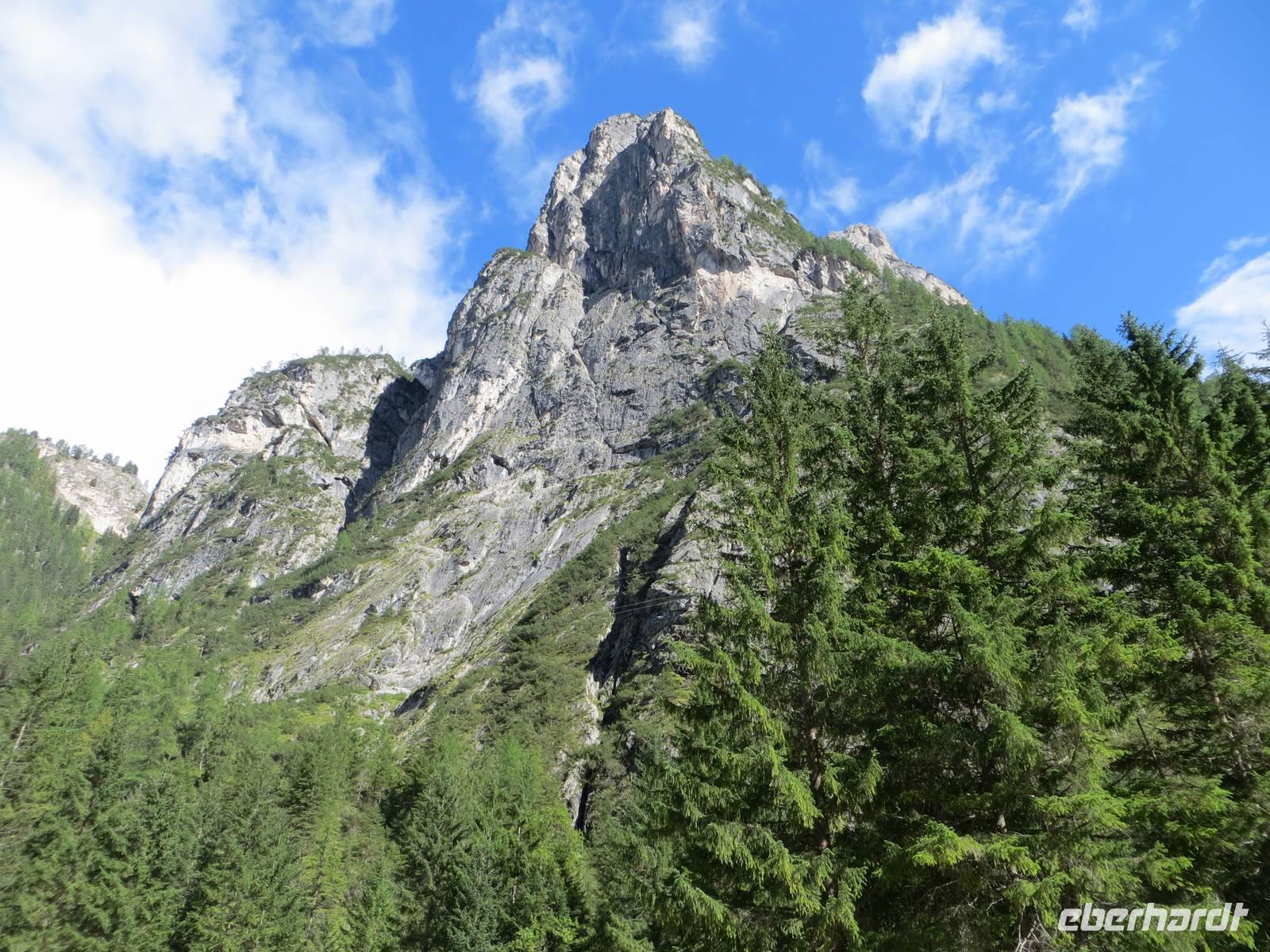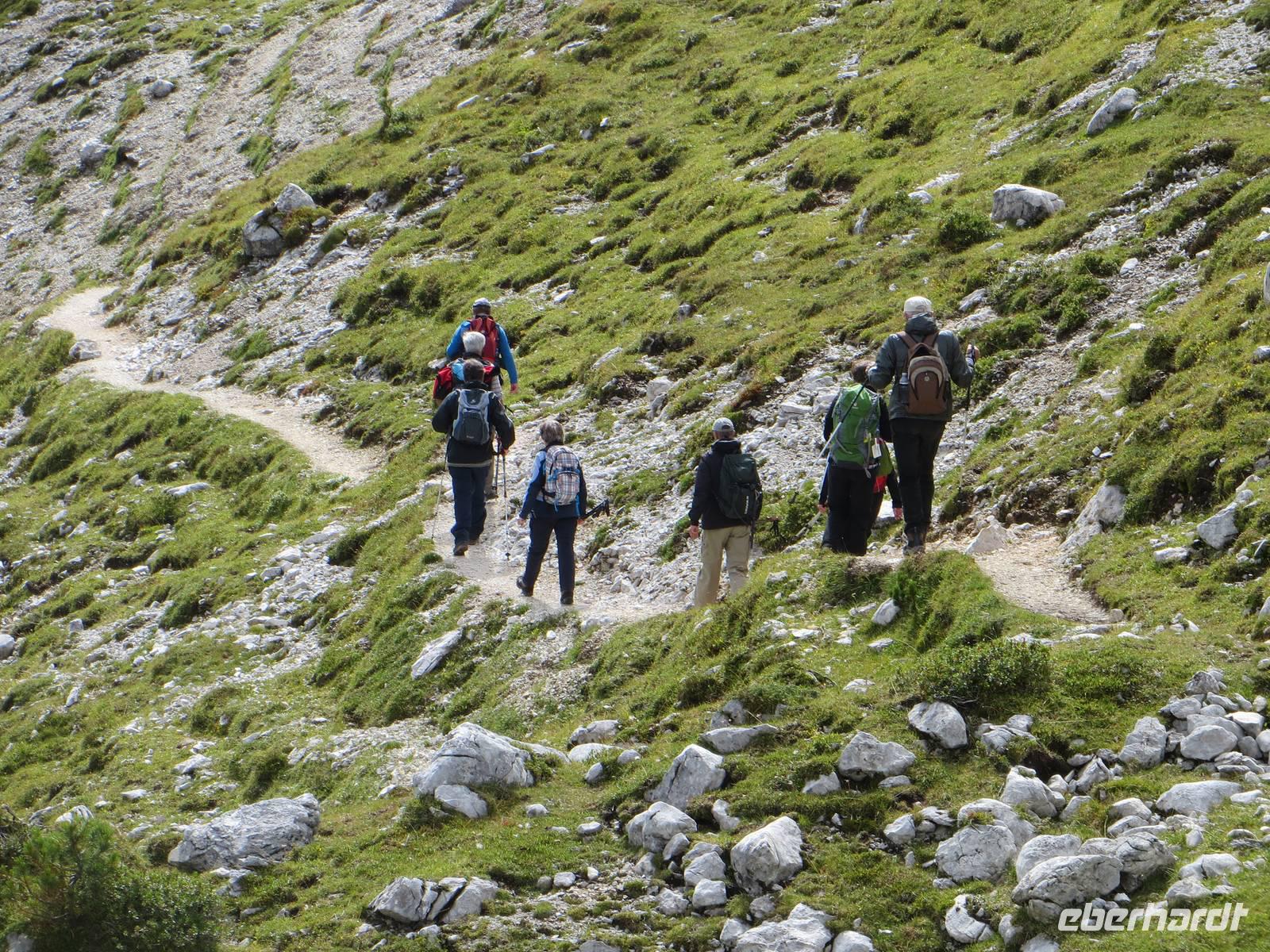 Endlich ein sonniger Tag, zumindest am Morgen. Nach knapp einstündiger Busfahrt waren wir schon kurz vor Neun auf dem Parkplatz Brückele im Pragsertal. Nun ging es bald steil hinauf; sechshundertfünfzig Höhenmeter bis zur Rossalm in 2138 M üNN. Nach zwei Stunden hatten alle Gäste dies geschafft- Auf schmalem Weg ging es dann nochmals leicht aufwärts und auf schmalem Pfad am Hang entlang. An einigen Stellen gaben Ketten zusätzliche Sicherheit. Nach 850 bewältigten Höhenmetern erreichten wir einen unscheinbaren Pass zwischen den Gaiseln: Zeit zur Mittagsrast. Vor uns tat sich der Blick zu den Drei Zinnen auf. Den Patternsattel, gestern unser höchster Wanderpunkt, konnten wir gut erkennen. Bald ging es nun steinig-geröllig hinab, da war wohl doch der Aufstieg fast angenehmer. Die letzte Stunde des Abstiegs war dann eher unkompliziert , so dass wir nach sieben Stunden den Busparkplatz erreichten. Es hatte sich eingetrübt, aber wir hatten eine Wanderung im Trockenen mit beeindruckenden Ausblicken in alpinem Gelände.