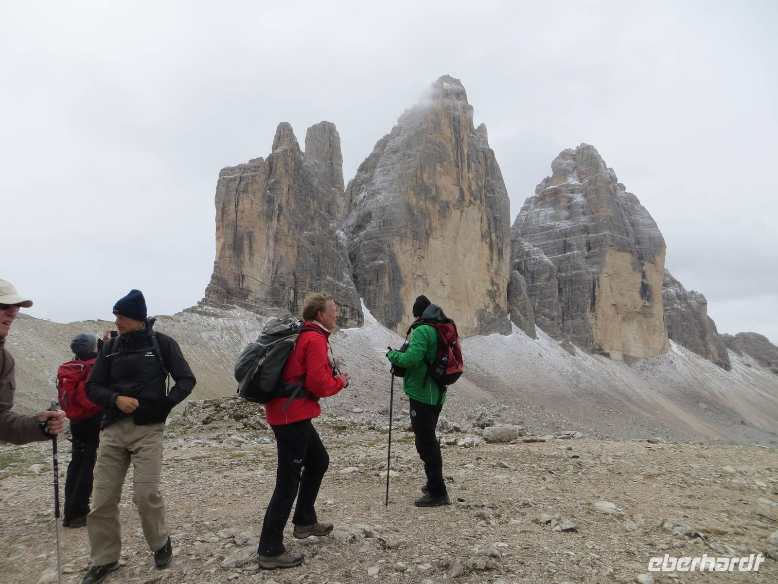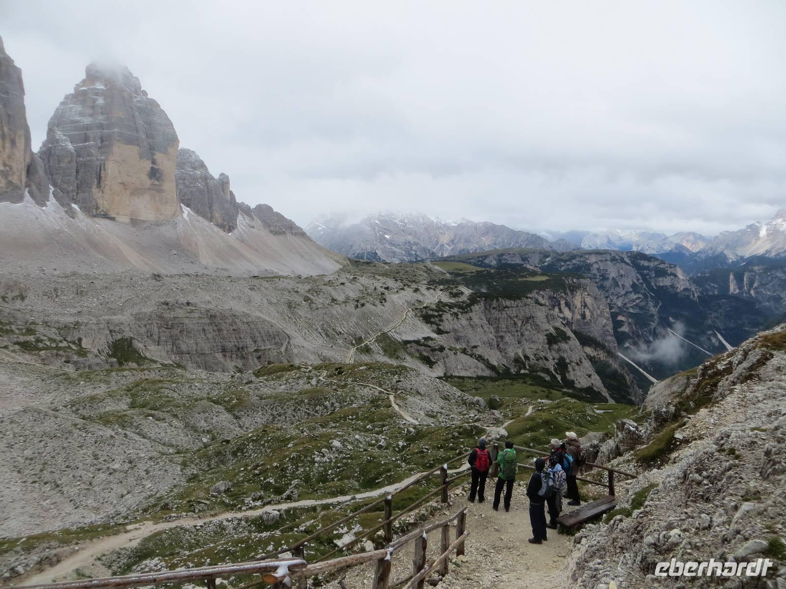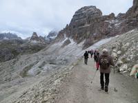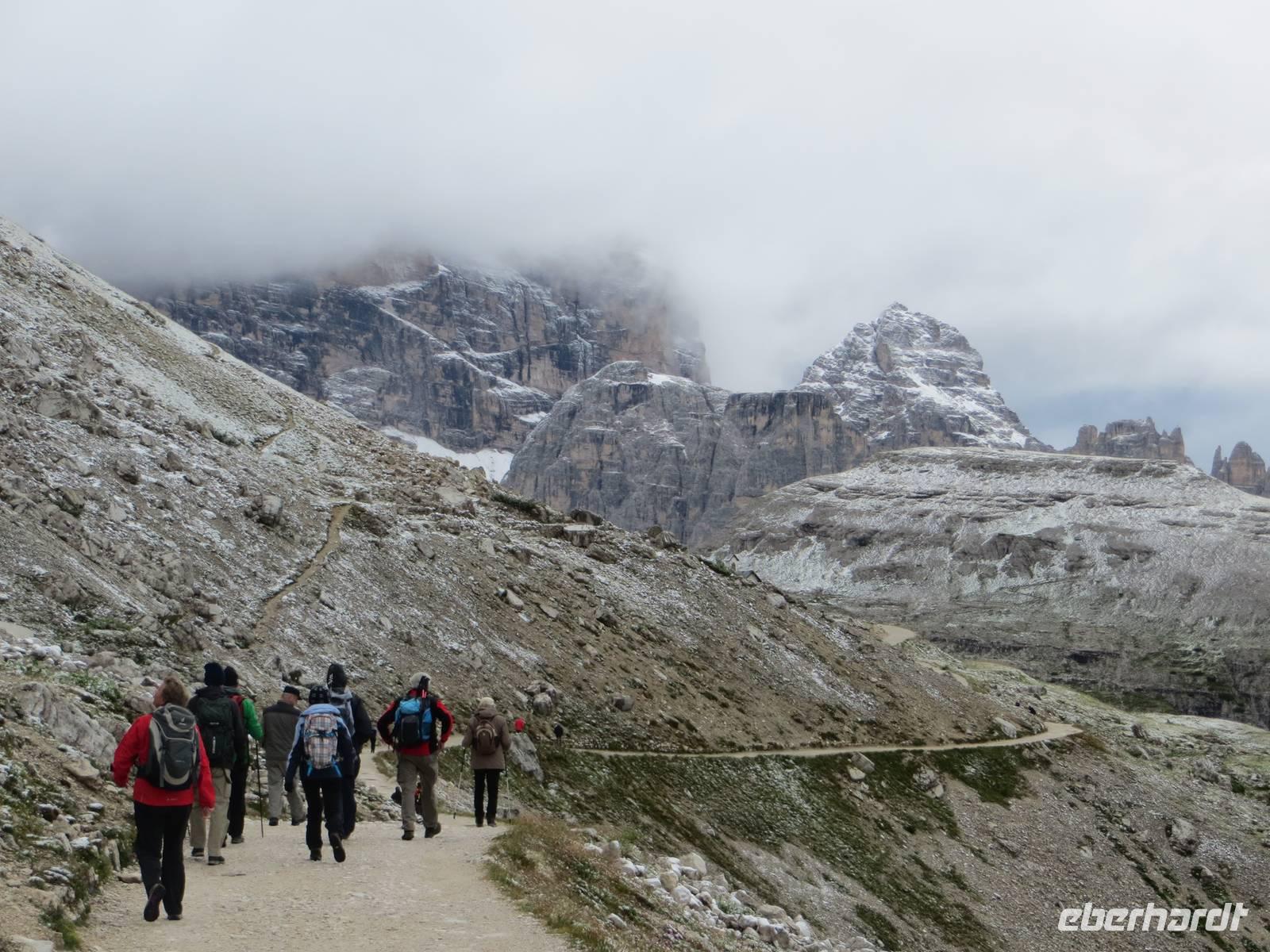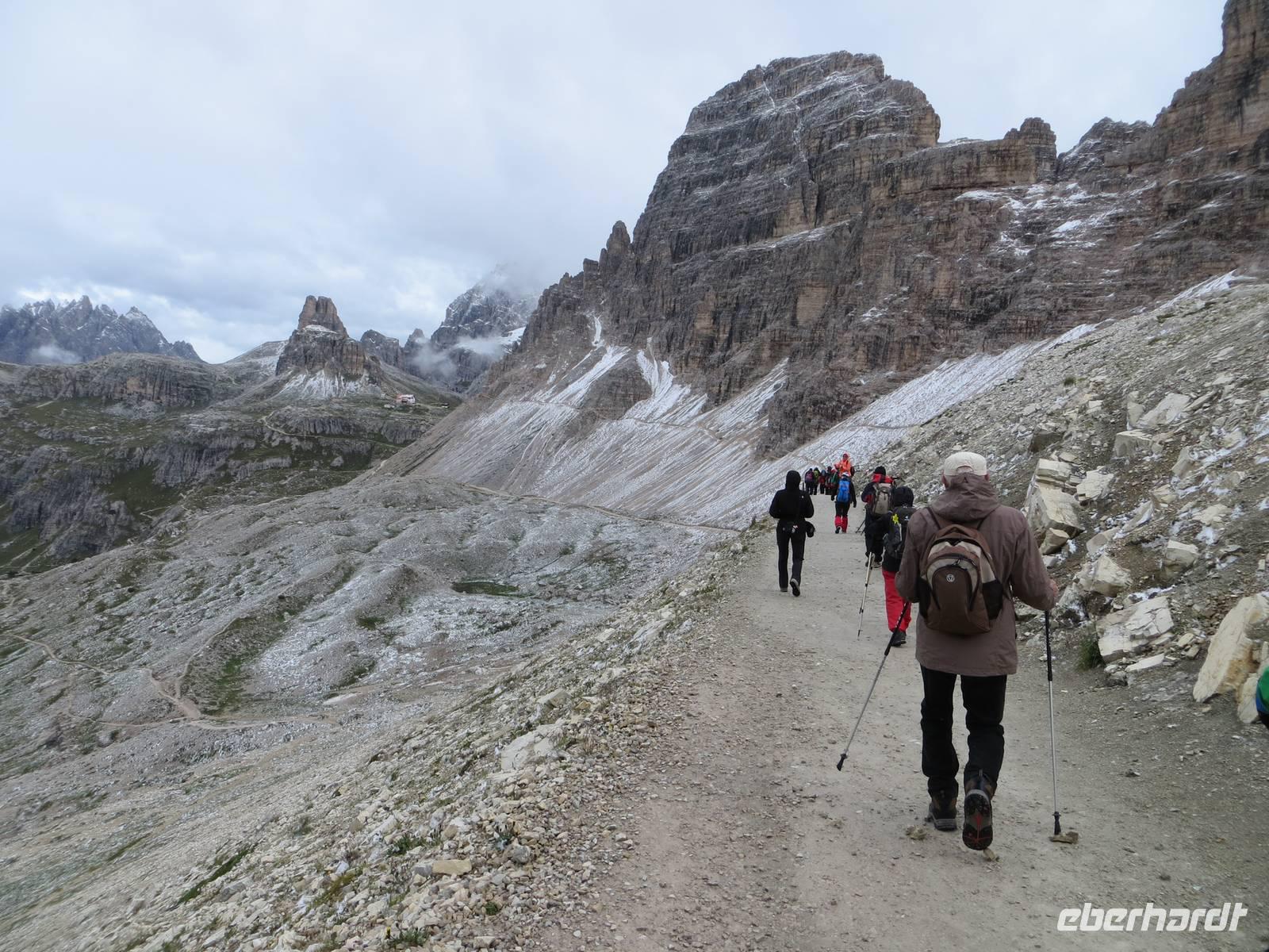 Wir haben uns entschieden, die leichteste Tour des Programms nun am zweiten Tag zu machen, da es in 2300 Meter Höhe geschneit hat.. Nur leichtes Auf und Ab auf gut ausgebauten Wegen boten eine gute chance, auch bei wenigen Graden über Null und bei etwas Schnee am Rande des Weges zu wandern. Nach eineinhalb Stunden Busfahrt und Entrichtung einer Mautgebühr hatten wir die Auronzohütte in 2320 Meter Höhe über NN erreicht. Von hier ging es zunächst an der Ostseite der Zinnen zum Patternsattel, dem heute höchsten Punkt mit 2454 Metern üNN und dann auf der Nordwestseite bis zur Drei-Zinnen-Hütte. Mit diesem schmalen Weg ein kleiner Test der Trittfestigkeit. Mittagspause an der Drei-Zinnen-Hütte bei Kälte und Wind, aber Zeit über Sepp Innerkoffler zu sprechen, bis 1915 Hüttenwirt dieser Hütte, der als Standschütze im 1. Weltkrieg über die Nordseite des Patternkofels nach oben stieg und tot nach unten stürzte - wodurch? - wechselbde Legenden der beteiligten Seiten. Vom Weg doch recht gute Sicht auf Toblinger Knoten, Dreischusterspitze, Gaisl, im Süden Monte Christallo und all die Gipfel in einem der zentralsten Gebiete des nördlichen Dolomiten. Gemächlicher Weiterweg an der Nordwestseite der Zinnen, unterhalb der Wände mit exponierten Kletterwegen über die Langenalm zum Bus an der Auronzohütte. Auf der Rückfahrt dann noch Fotostopps am Misurina-See bei zunehmend blauem Himmel und am Soldatenfriedhof Nasswand . Die polnischen, krainischen, ungarischen Namen der Toten luden ein zu einem kleinen Ausflug in die Geschichte des österreichisch-ungarischen Vielvölkerstaates und der Nachkriegsstaatenordnung Europas. An Toblach und Bruneck vorbei, mit Stopp an einer Polizeikontrolle, erreichten wir zu guter Spätnachmittagszeit das Hotel und konnten entspannen und Kräfte sammeln für den kommenden Tag.