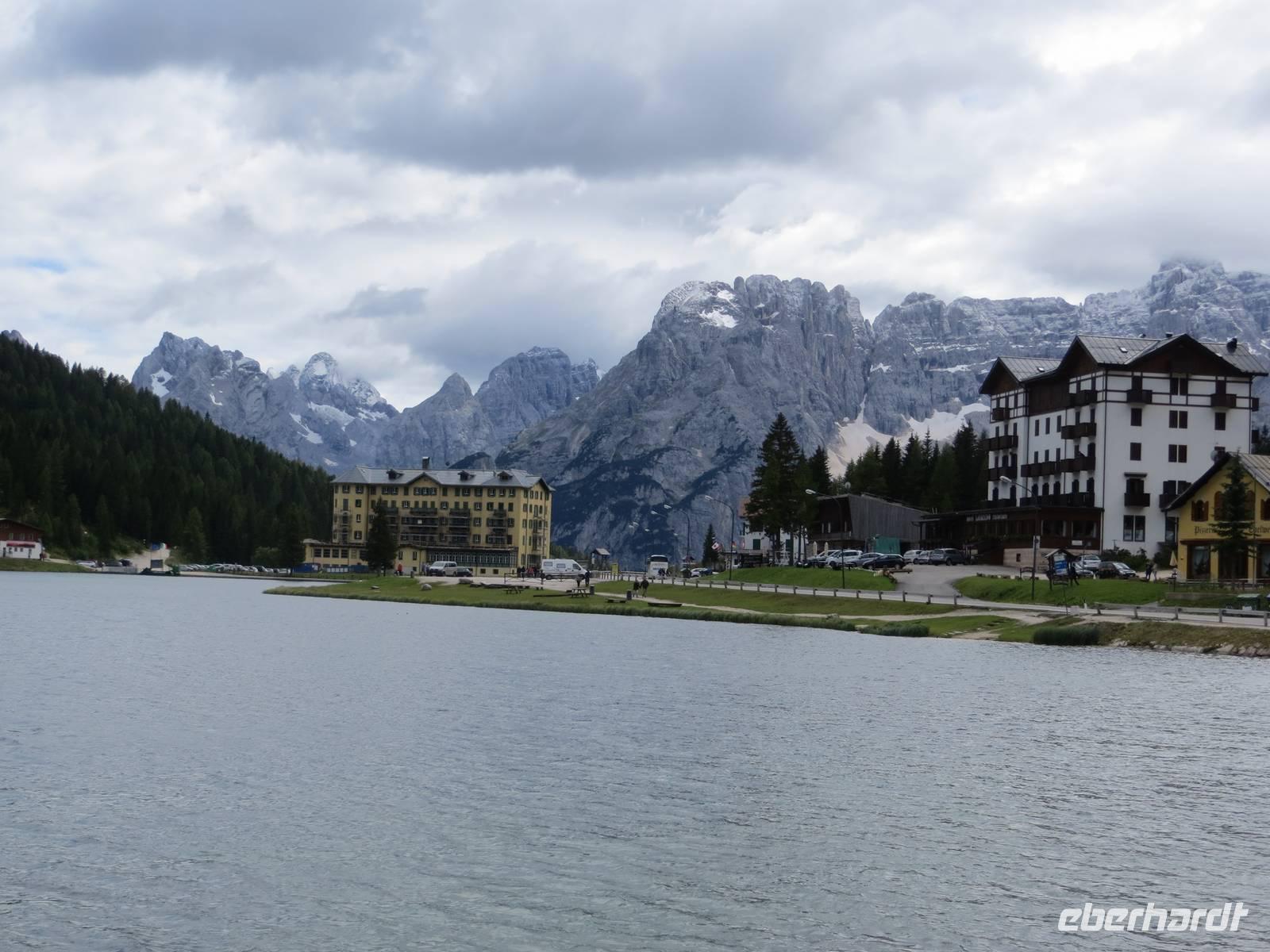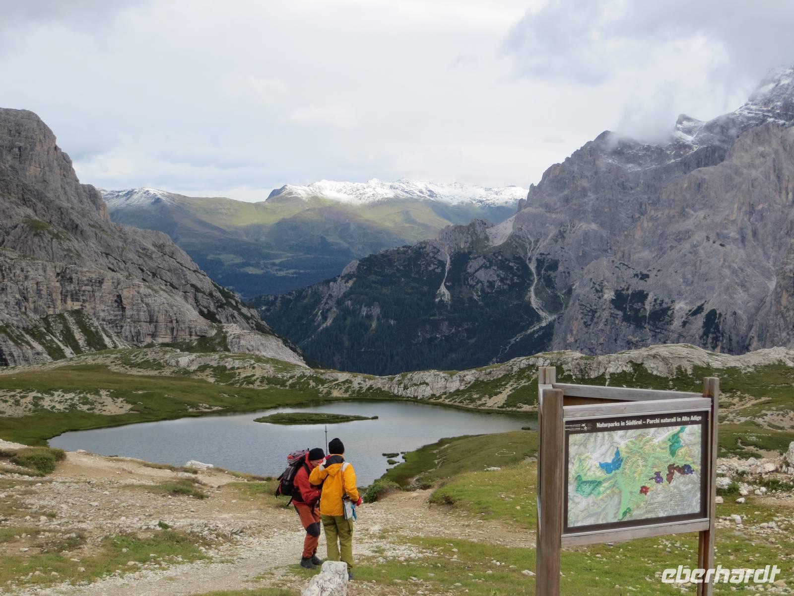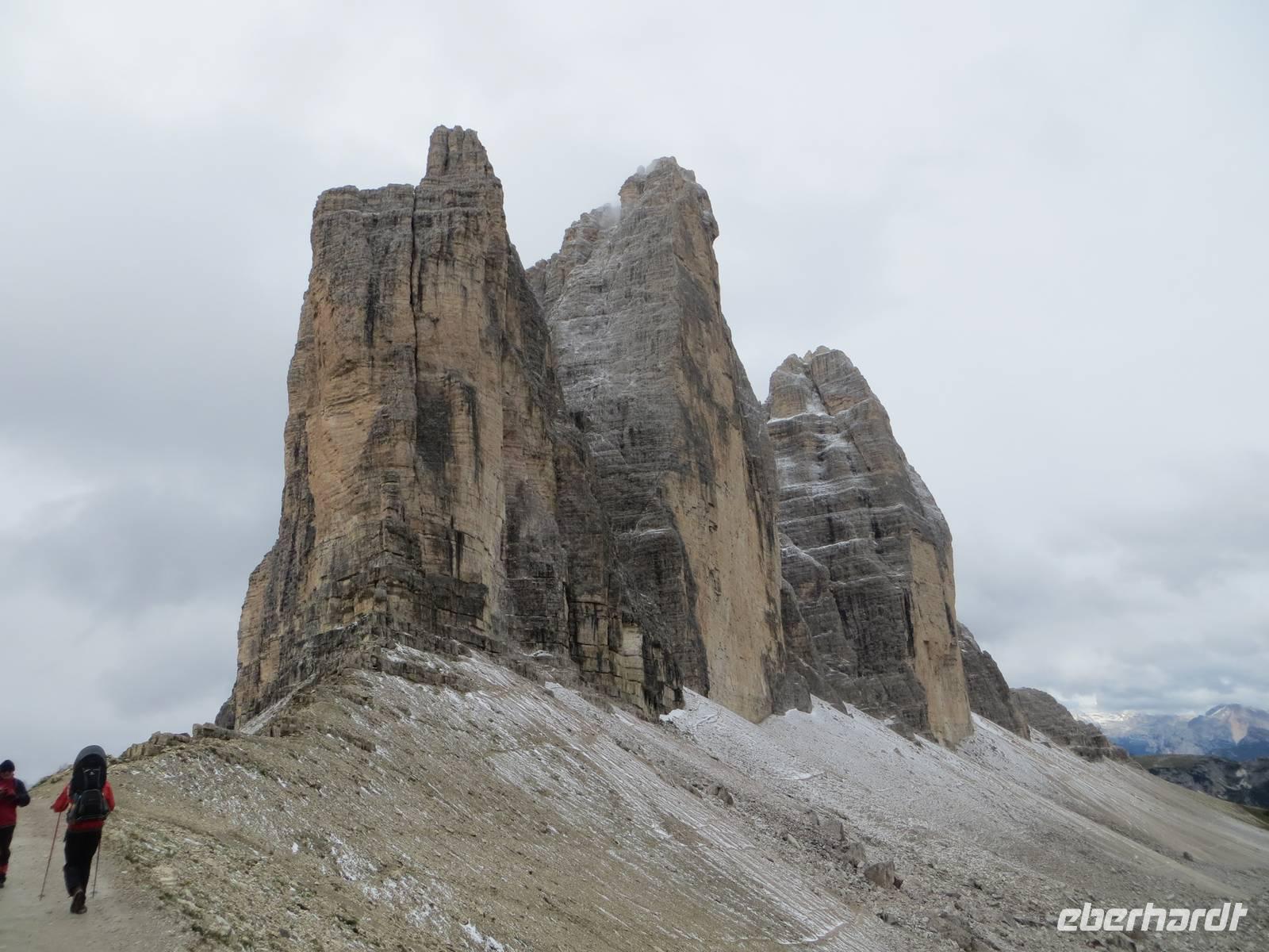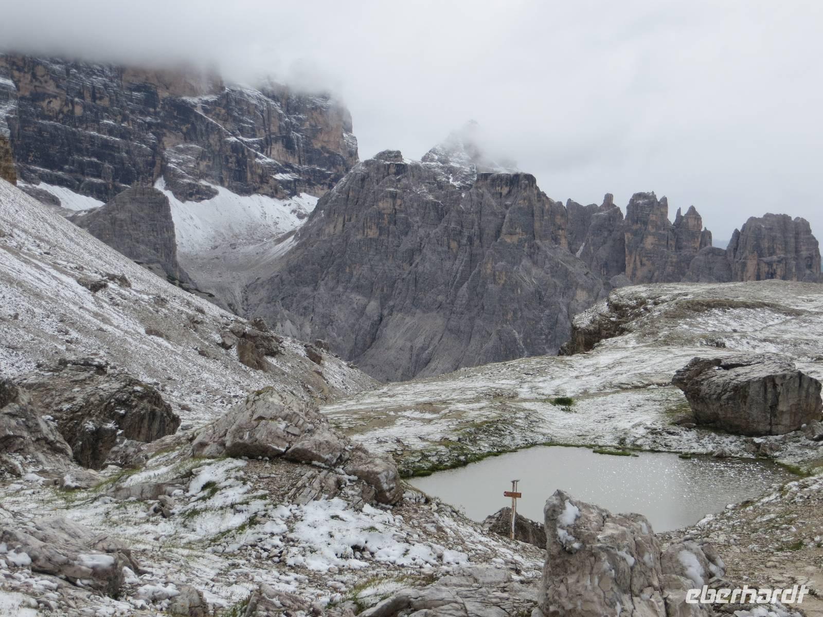 Wir haben uns entschieden, die leichteste Tour des Programms nun am zweiten Tag zu machen, da es in 2300 Meter Höhe geschneit hat.. Nur leichtes Auf und Ab auf gut ausgebauten Wegen boten eine gute chance, auch bei wenigen Graden über Null und bei etwas Schnee am Rande des Weges zu wandern. Nach eineinhalb Stunden Busfahrt und Entrichtung einer Mautgebühr hatten wir die Auronzohütte in 2320 Meter Höhe über NN erreicht. Von hier ging es zunächst an der Ostseite der Zinnen zum Patternsattel, dem heute höchsten Punkt mit 2454 Metern üNN und dann auf der Nordwestseite bis zur Drei-Zinnen-Hütte. Mit diesem schmalen Weg ein kleiner Test der Trittfestigkeit. Mittagspause an der Drei-Zinnen-Hütte bei Kälte und Wind, aber Zeit über Sepp Innerkoffler zu sprechen, bis 1915 Hüttenwirt dieser Hütte, der als Standschütze im 1. Weltkrieg über die Nordseite des Patternkofels nach oben stieg und tot nach unten stürzte - wodurch? - wechselbde Legenden der beteiligten Seiten. Vom Weg doch recht gute Sicht auf Toblinger Knoten, Dreischusterspitze, Gaisl, im Süden Monte Christallo und all die Gipfel in einem der zentralsten Gebiete des nördlichen Dolomiten. Gemächlicher Weiterweg an der Nordwestseite der Zinnen, unterhalb der Wände mit exponierten Kletterwegen über die Langenalm zum Bus an der Auronzohütte. Auf der Rückfahrt dann noch Fotostopps am Misurina-See bei zunehmend blauem Himmel und am Soldatenfriedhof Nasswand . Die polnischen, krainischen, ungarischen Namen der Toten luden ein zu einem kleinen Ausflug in die Geschichte des österreichisch-ungarischen Vielvölkerstaates und der Nachkriegsstaatenordnung Europas. An Toblach und Bruneck vorbei, mit Stopp an einer Polizeikontrolle, erreichten wir zu guter Spätnachmittagszeit das Hotel und konnten entspannen und Kräfte sammeln für den kommenden Tag.