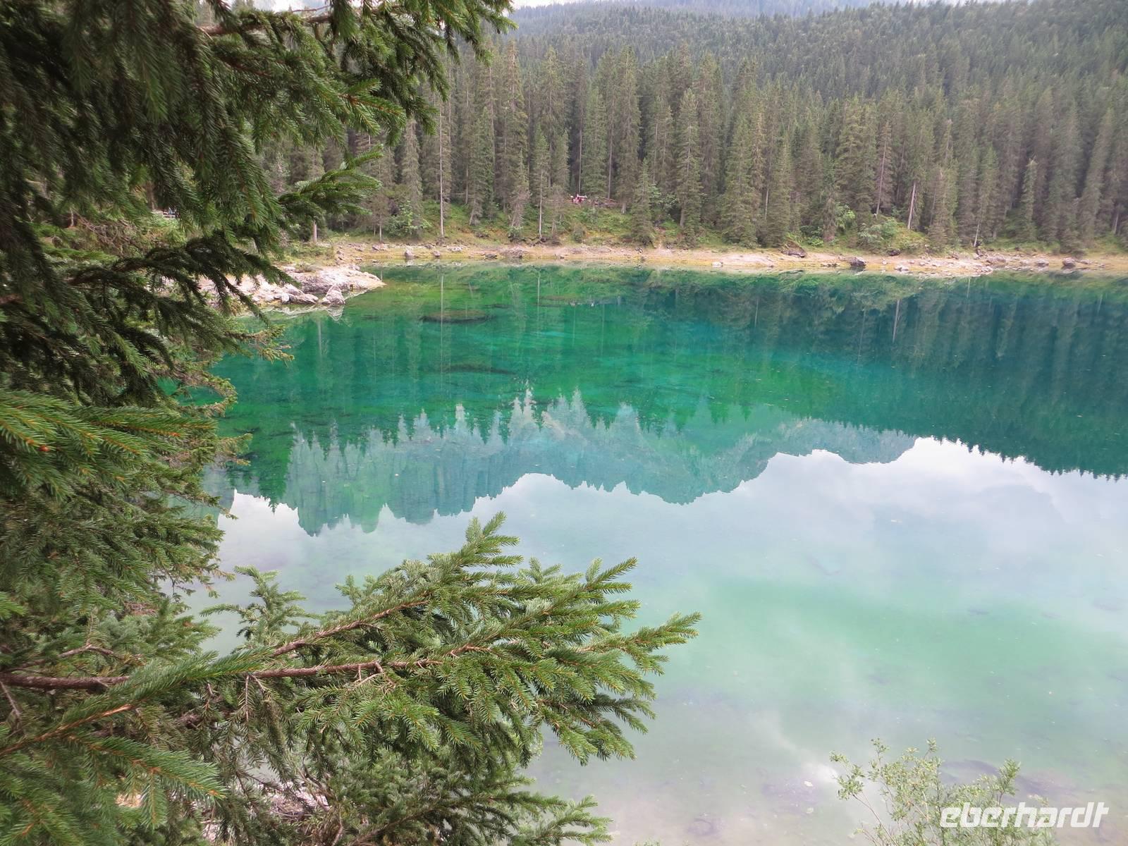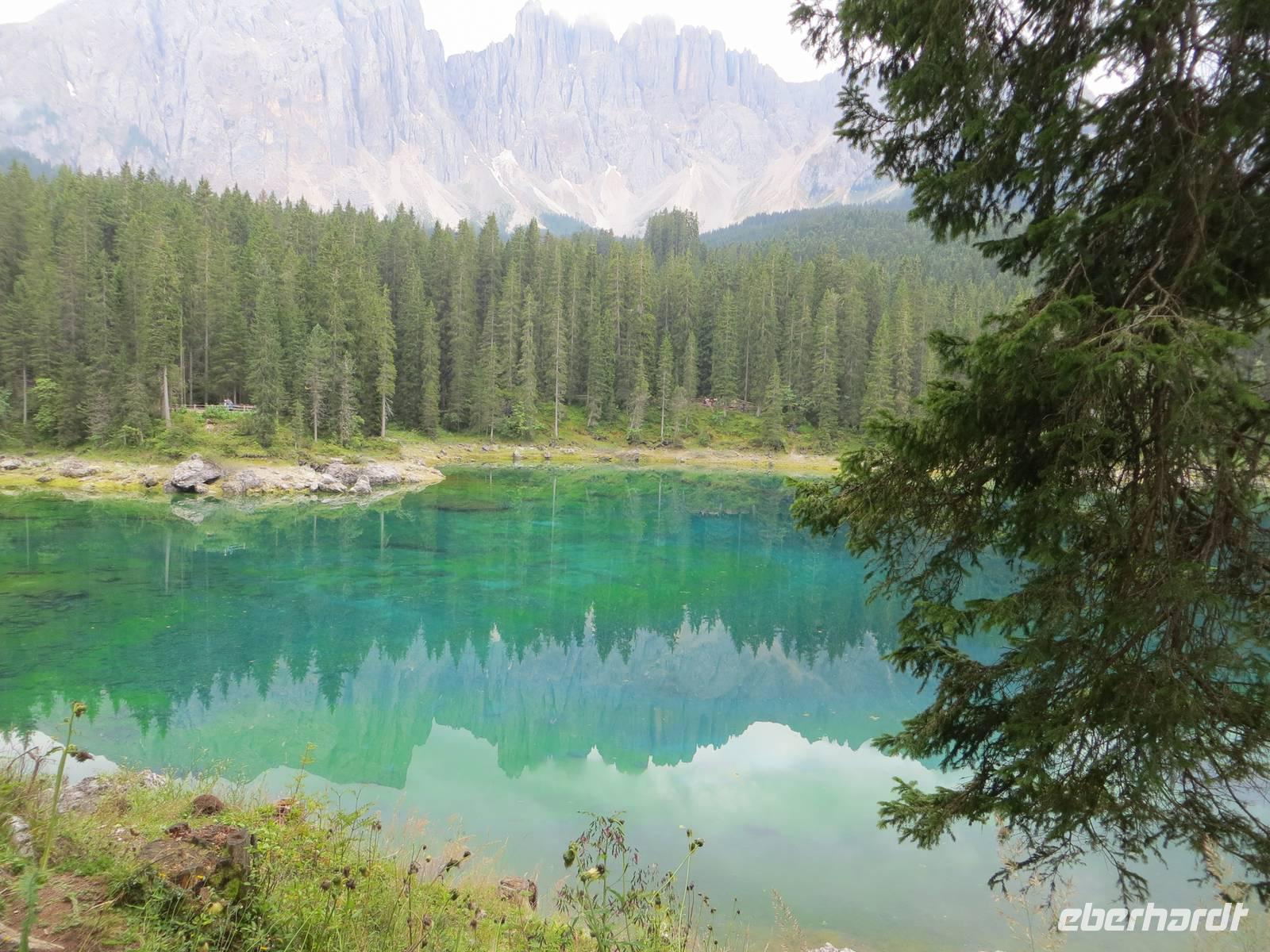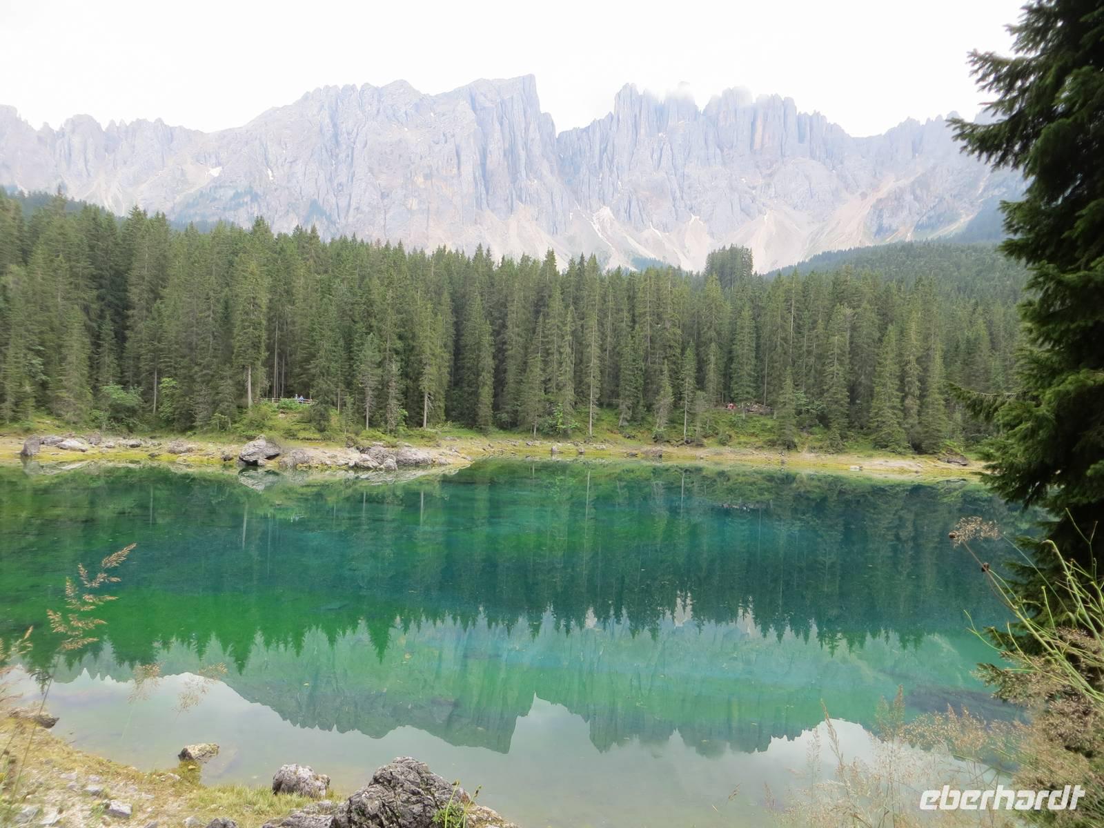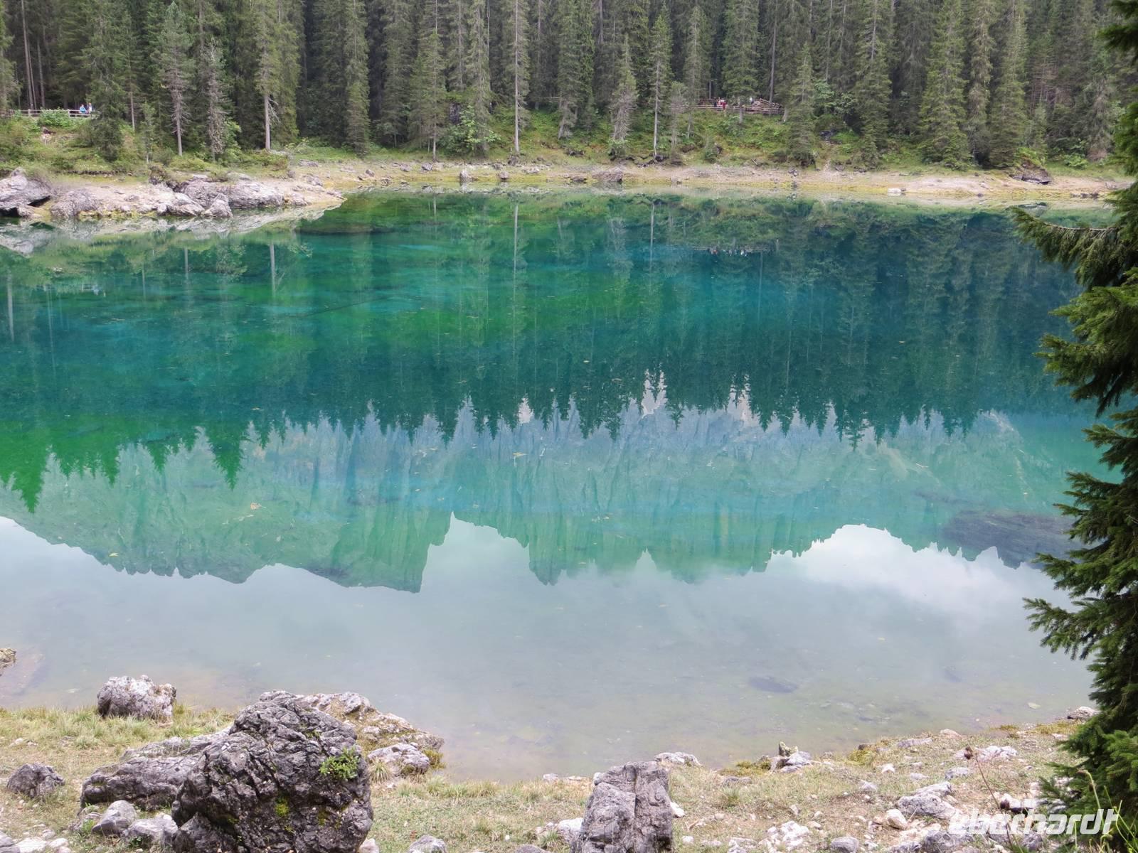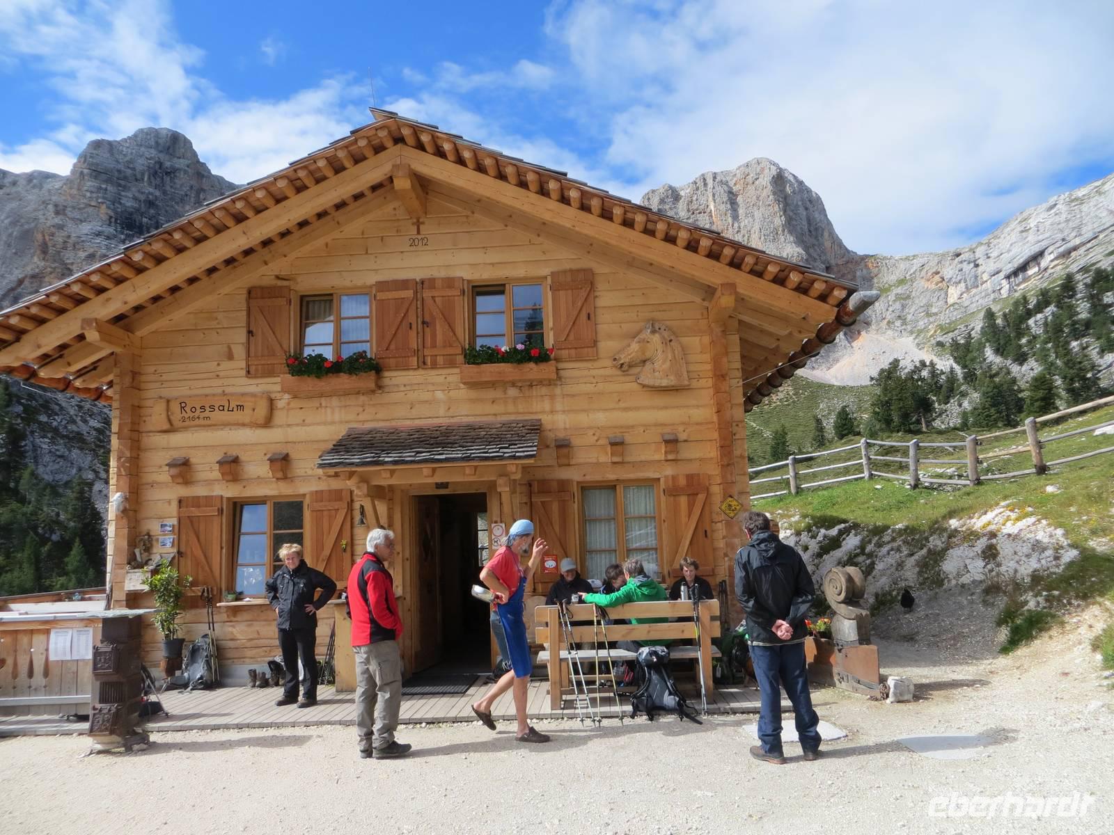 Mit der Erfahrung von vieri Wandertagen teilte sich die Gruppe: eine Gruppe durchstieg das Tschagerjoch, die andere umrundete die Südspitze des Massivs auf interessantem aber unkompliziertem Weg. Die Rotwandhütte an der Südostseite des Rosengartens war bedeutende Zwischenstation in der Runde beider Gruppen. Das kühle Wetter lud aber nicht zum Warten der Igel auf die Hasen ein. So nahmen die Gruppen den Abstieg differenziert vor. Auf der Fahrt zum Hotel stoppten wir noch am Karersee, wo sich im türkisblauen Wasser der Latemar spiegelte, bevor wir über das Eisacktal zurück in das Pustertal gelangten.