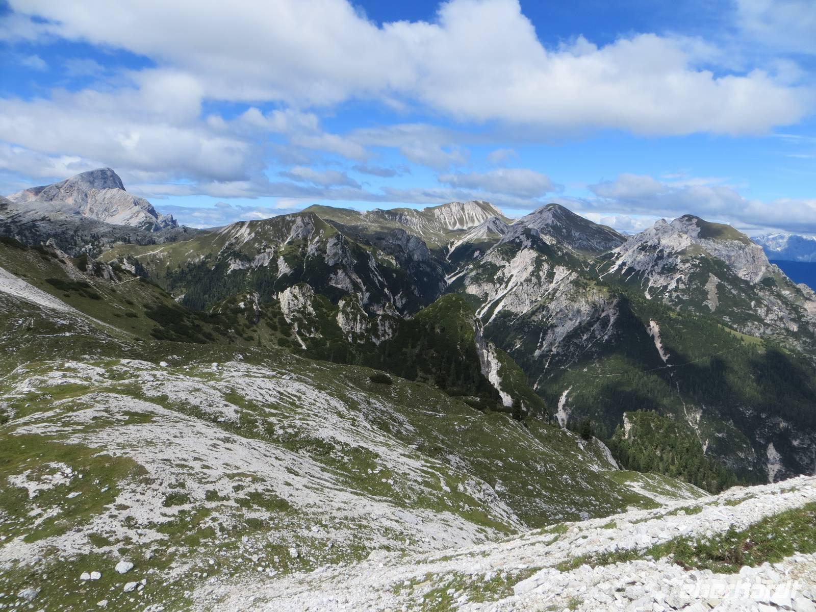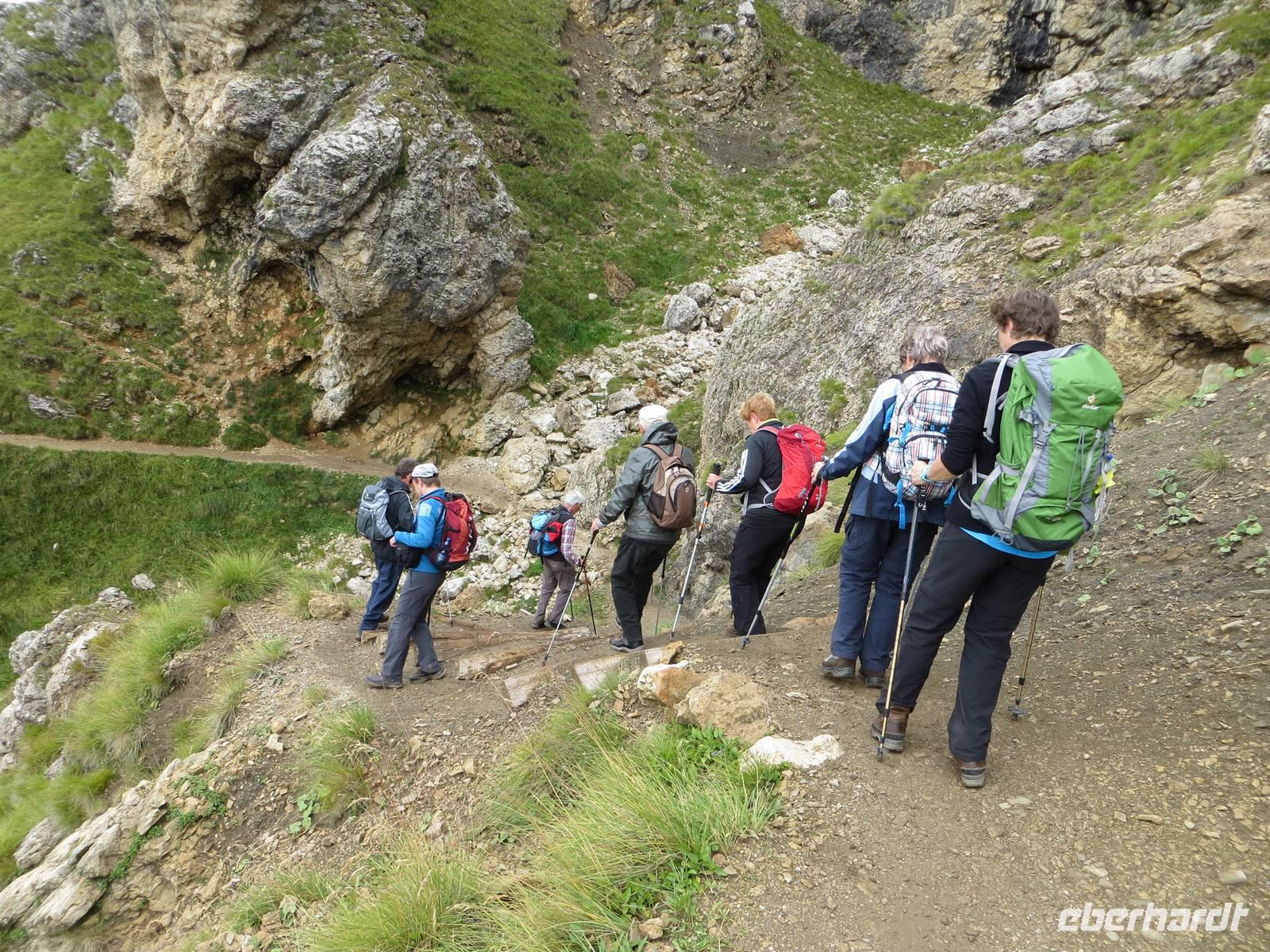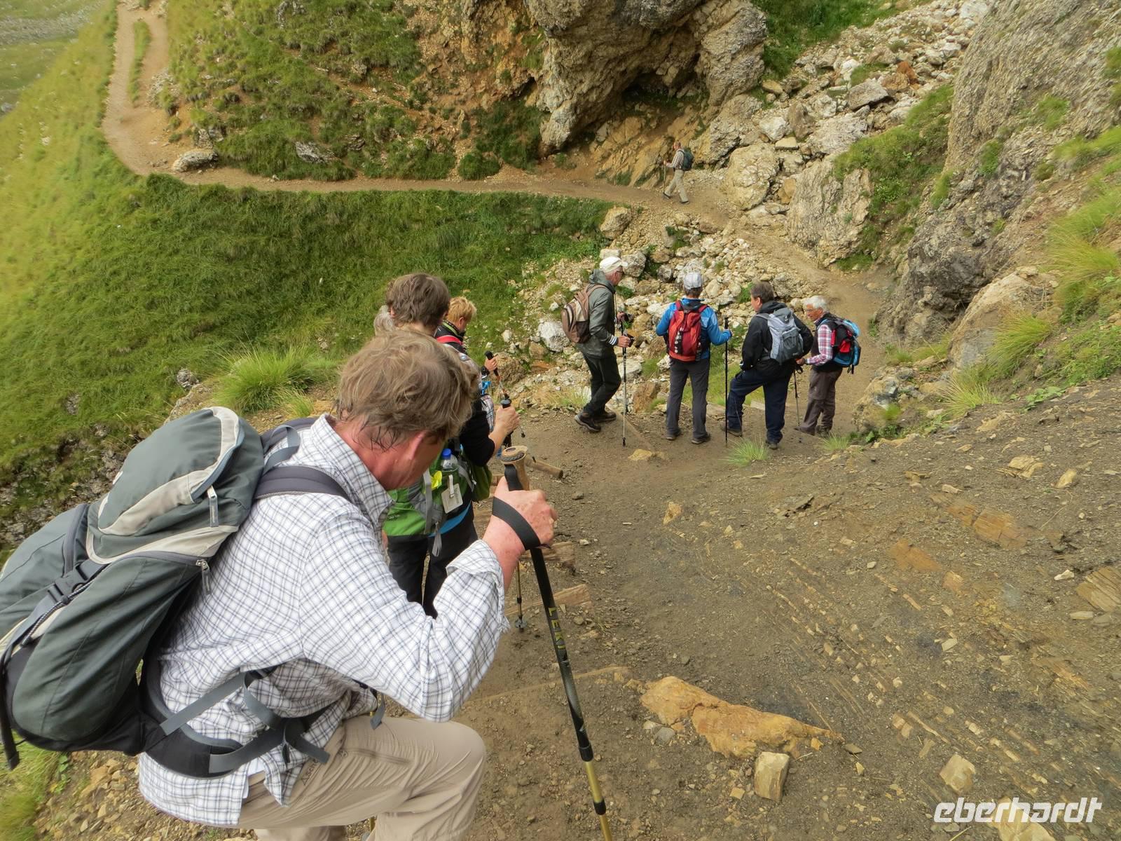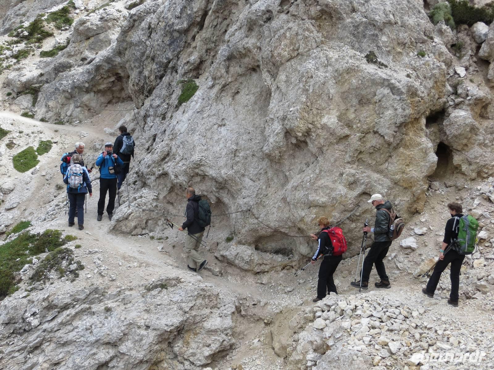 Nach der Pause stiegen fast alle Wanderer ab: vorbei an zahlreichen einstigen Unterständen und Kavernen ging es im hohen Dolomitgestein mit Blicke auf die Toffane-Gruppe, dann steil hinab.Zum Sonntagnachmittag brachte uns der Bus durchs Gadertal zurück zum Hotel, wo die gedeckte Sonntags-Kaffeetafel wartete.