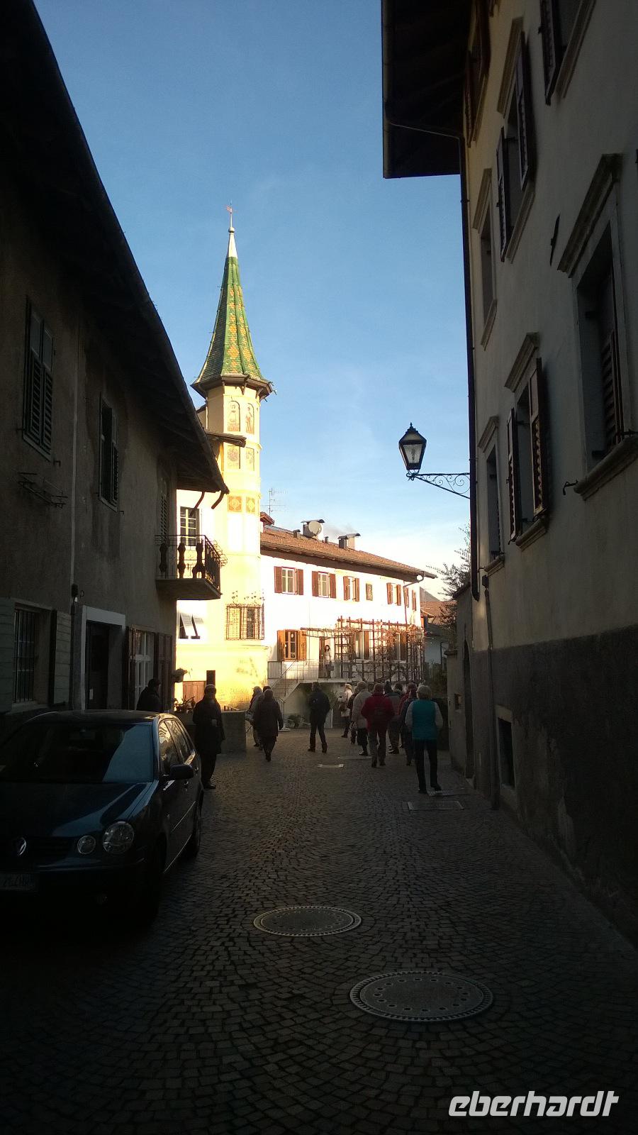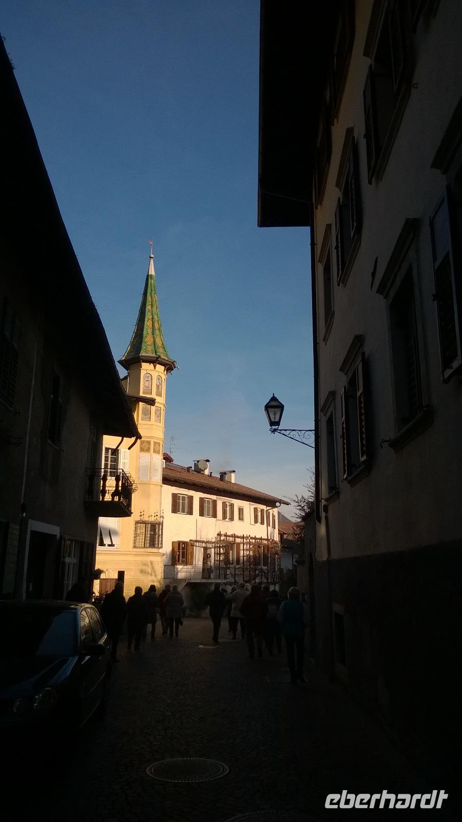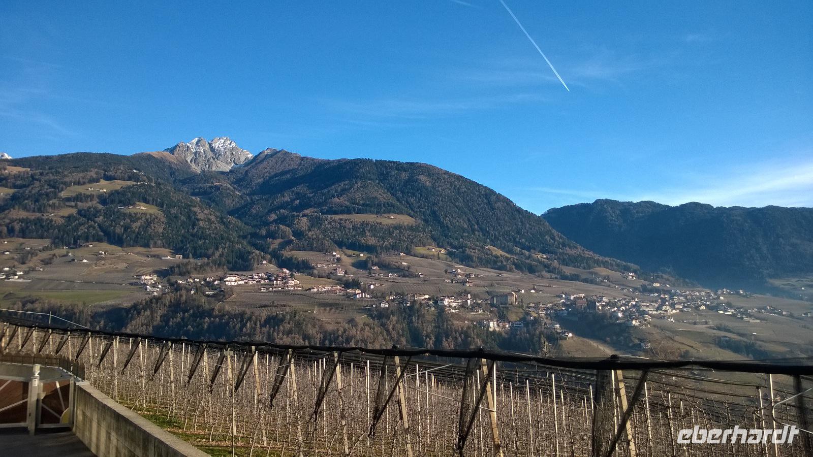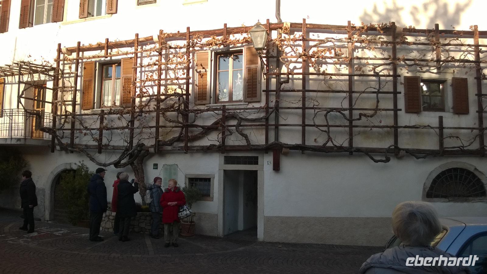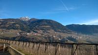 Heute, am zweiten Weihnachtsfeiertag lockt uns das Städtchen Meran zur Stadtbesichtigung. Unsere Stadtführerin Luise schlendert mit uns durch die Stadt und erklärt viel über die Geschichte und die Lebensart der Südtiroler. Meran ist wirklich hübsch und bei einer kurzen Freizeit lässt es sich gemütlich durch die hübschen Laubengänge bummeln. Zum Mittagessen führt uns der Weg auf die Anhöhen bei Meran. Dort im kleinen Örtchen Kuens, liegt am Hang zwischen Weinbergen der Hilberkeller. Die Aussicht und der Sonnenschein sind phantastisch und lediglich die Verheißung eines leckeren Mittagessens kann uns in den Hilberkeller locken. Der ist zum Glück auch sehr gemütlich und die Kellnerin sehr sympathisch, sodass wir hier mit Vergnügen ein Weihnachtsessen genießen. Pappsatt und befriedigt fahren wir danach wieder zurück ins Hotel. Ob heute abend noch das großartige Drei-Gänge-Menü des guten Hotelkochs reinpasst?