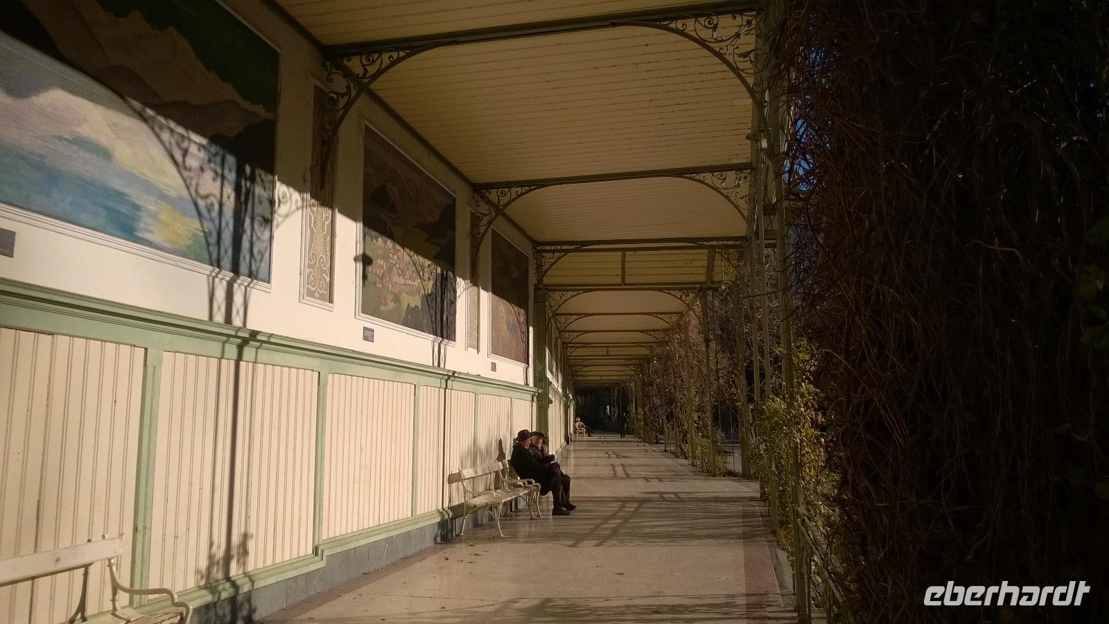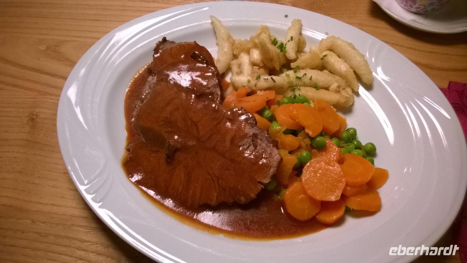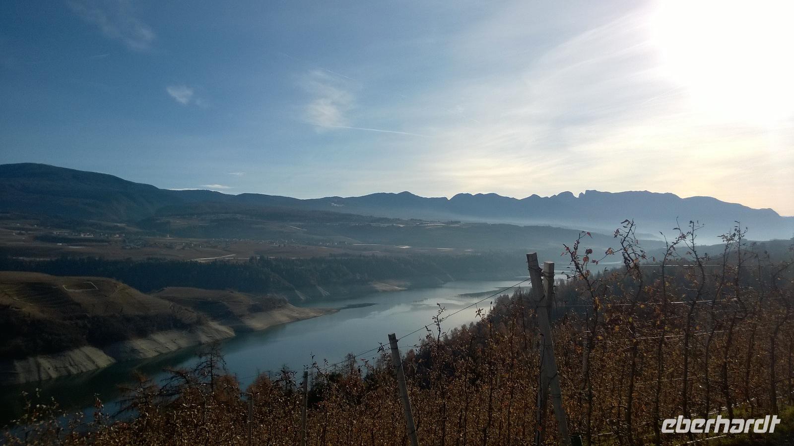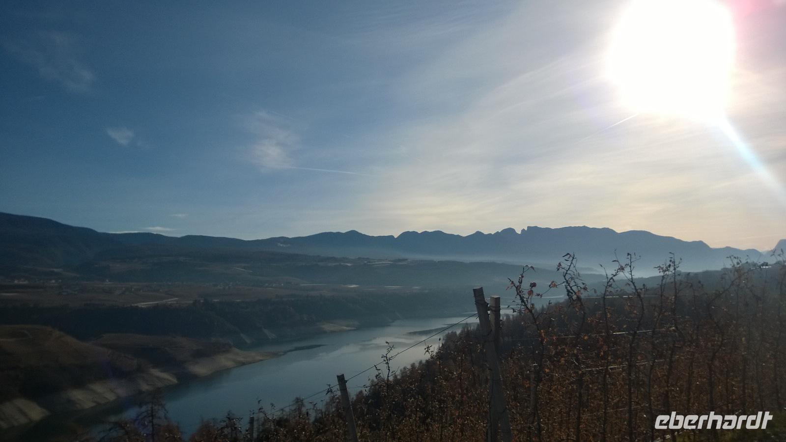 Heute, am zweiten Weihnachtsfeiertag lockt uns das Städtchen Meran zur Stadtbesichtigung. Unsere Stadtführerin Luise schlendert mit uns durch die Stadt und erklärt viel über die Geschichte und die Lebensart der Südtiroler. Meran ist wirklich hübsch und bei einer kurzen Freizeit lässt es sich gemütlich durch die hübschen Laubengänge bummeln. Zum Mittagessen führt uns der Weg auf die Anhöhen bei Meran. Dort im kleinen Örtchen Kuens, liegt am Hang zwischen Weinbergen der Hilberkeller. Die Aussicht und der Sonnenschein sind phantastisch und lediglich die Verheißung eines leckeren Mittagessens kann uns in den Hilberkeller locken. Der ist zum Glück auch sehr gemütlich und die Kellnerin sehr sympathisch, sodass wir hier mit Vergnügen ein Weihnachtsessen genießen. Pappsatt und befriedigt fahren wir danach wieder zurück ins Hotel. Ob heute abend noch das großartige Drei-Gänge-Menü des guten Hotelkochs reinpasst?