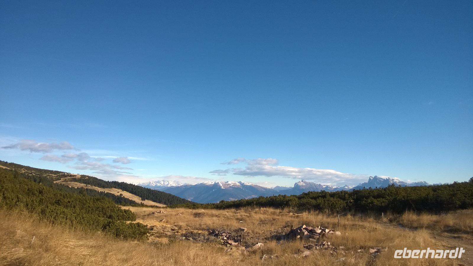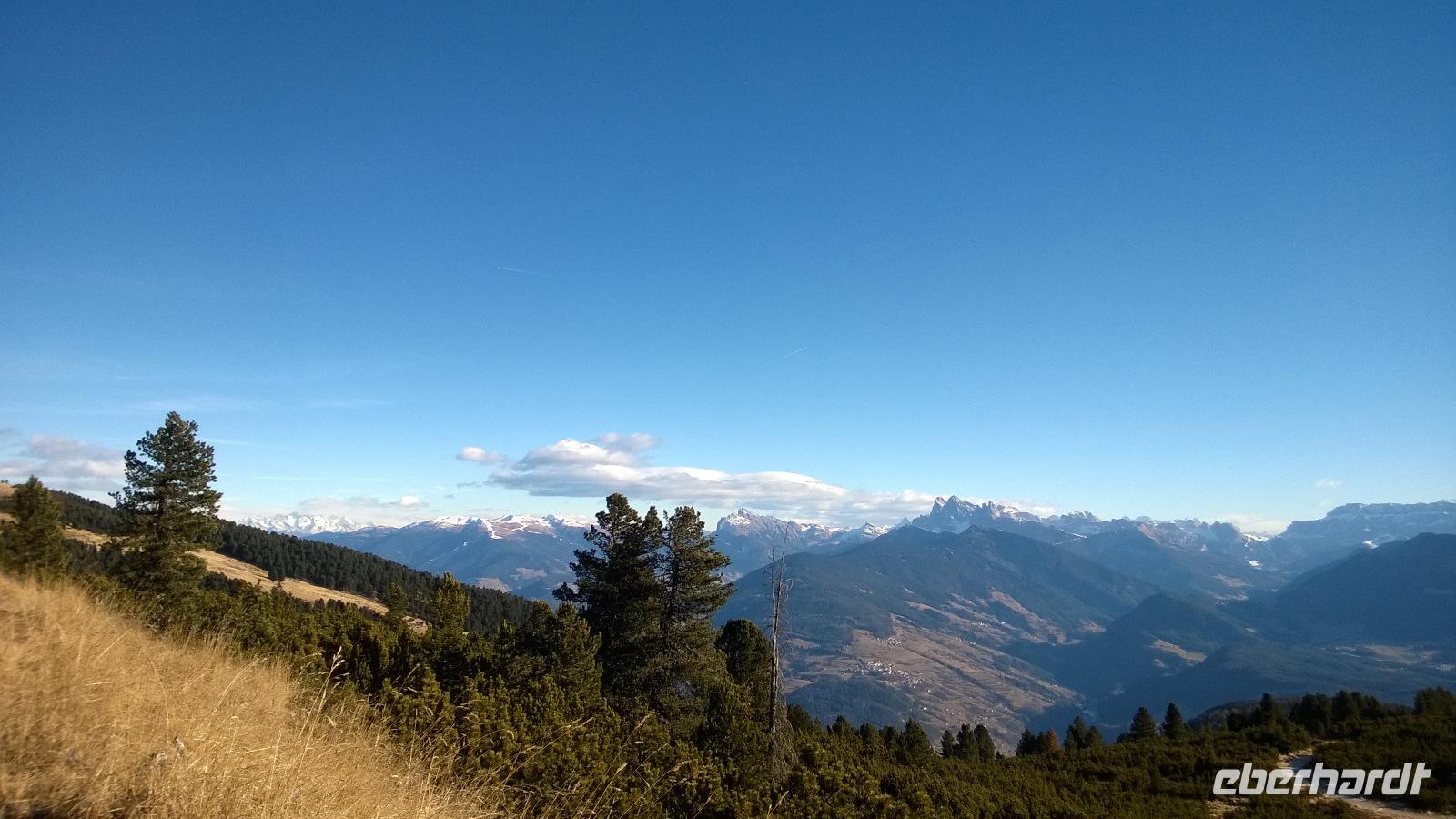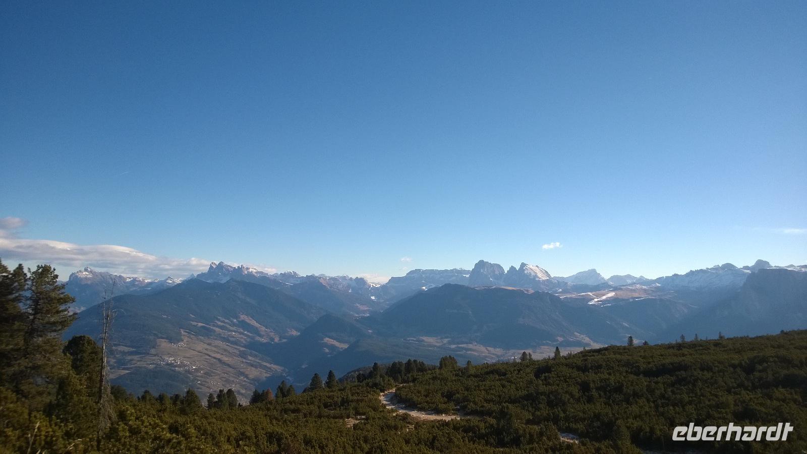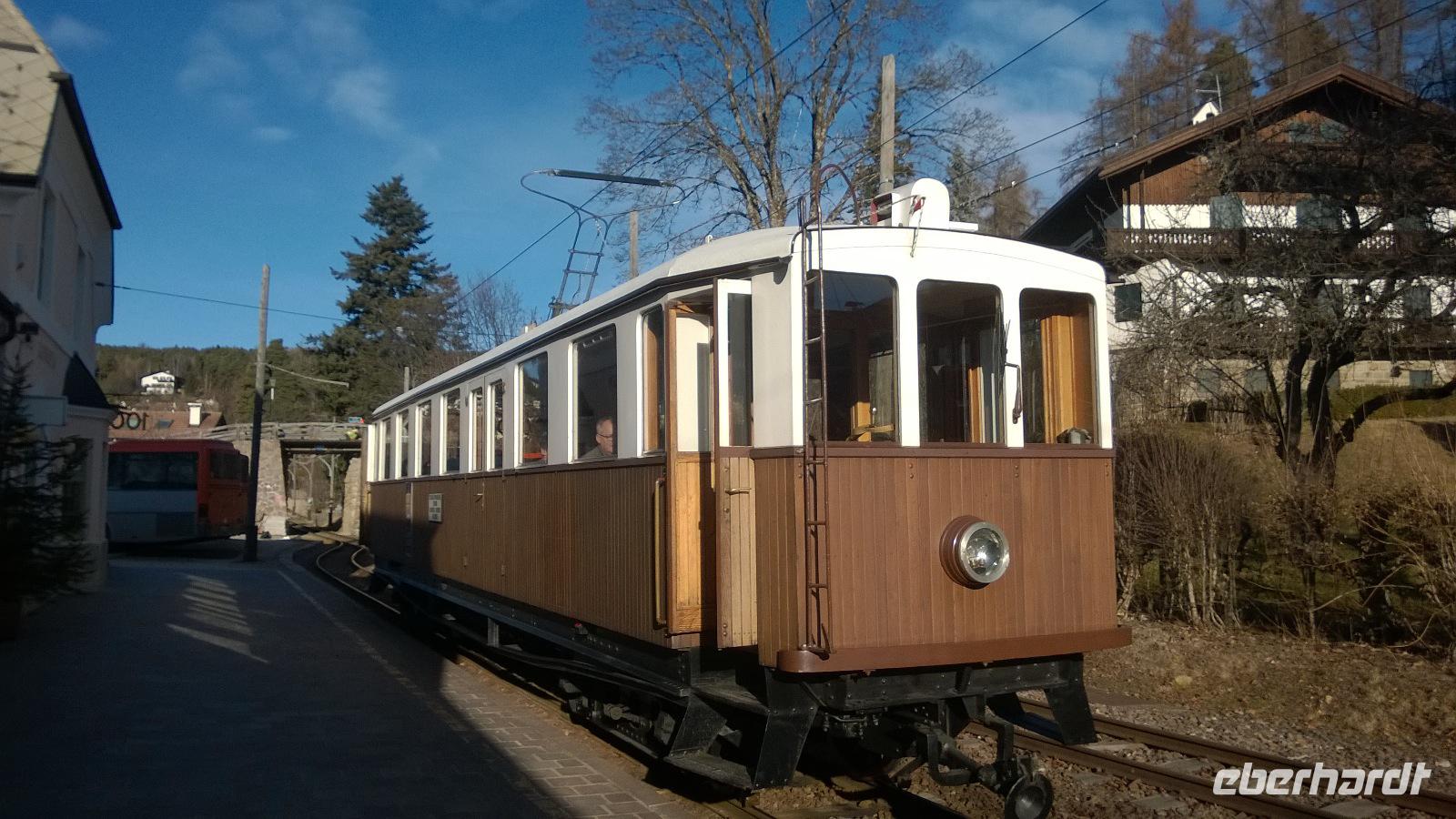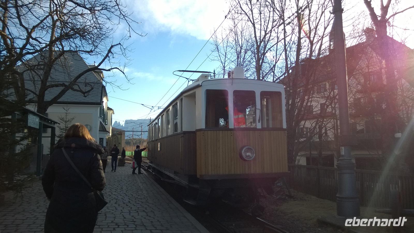Der Berg ruft! Namentlich das Rittner Horn. Ein paar Mutige fahren heute mit der Seilbahn von Bozen nach Oberbozen. Der Ausblick, den wir von der Gondel über die Stadt haben, ist grandios. Vom kleinen Bahnhof in Oberbozen geht es dann mit einer historischen Schmalspurbahn weiter nach Klobenstein. Die Sonne scheint, wir scheinen mit unseren dicksten Wintersachen viel zu warm angezogen zu sein und pellen uns erst einmal aus. ....aber der harte Winter wartet schon um die Ecke. In Klobenstein wartet Frank schon auf uns und bringt uns mit dem Bus in Gefilde, die nicht mal ein Navi kennt. Es geht immer höher und über kleine Straßen zur Seilbahn vom Rittner Horn. Hier setzen wir uns mit all den kleinen und großen Skifahrern in die Gondeln und lassen uns auf die Höhe der Schwarzseespitzen, etwas unterhalb des eigentlichen Gipfels des Rittner Horns bringen. Eigentlich wollten wir hier gerne auf dem Panorama-Rundwanderweg ein Stündchen gemütlich spazieren gehen. Aber der Wind ist so eisig kalt und bringt selbst den großen Frank zum Wanken, sodass nur ein paar ganz emsige Wanderer eine kleine Gehrunde wagen. Und die reicht schon vollkommen aus, um am Ende als Eis am Stiel in der Bergschenke einzukehren und ein heißes Getränk sehr zu genießen. Auch von hier aus hat man einen schönen Blick über die umliegenden Dolomiten, denn wie jeden Tag auf unserer Reise haben wir das beste Wetter, das man sich vorstellen kann.