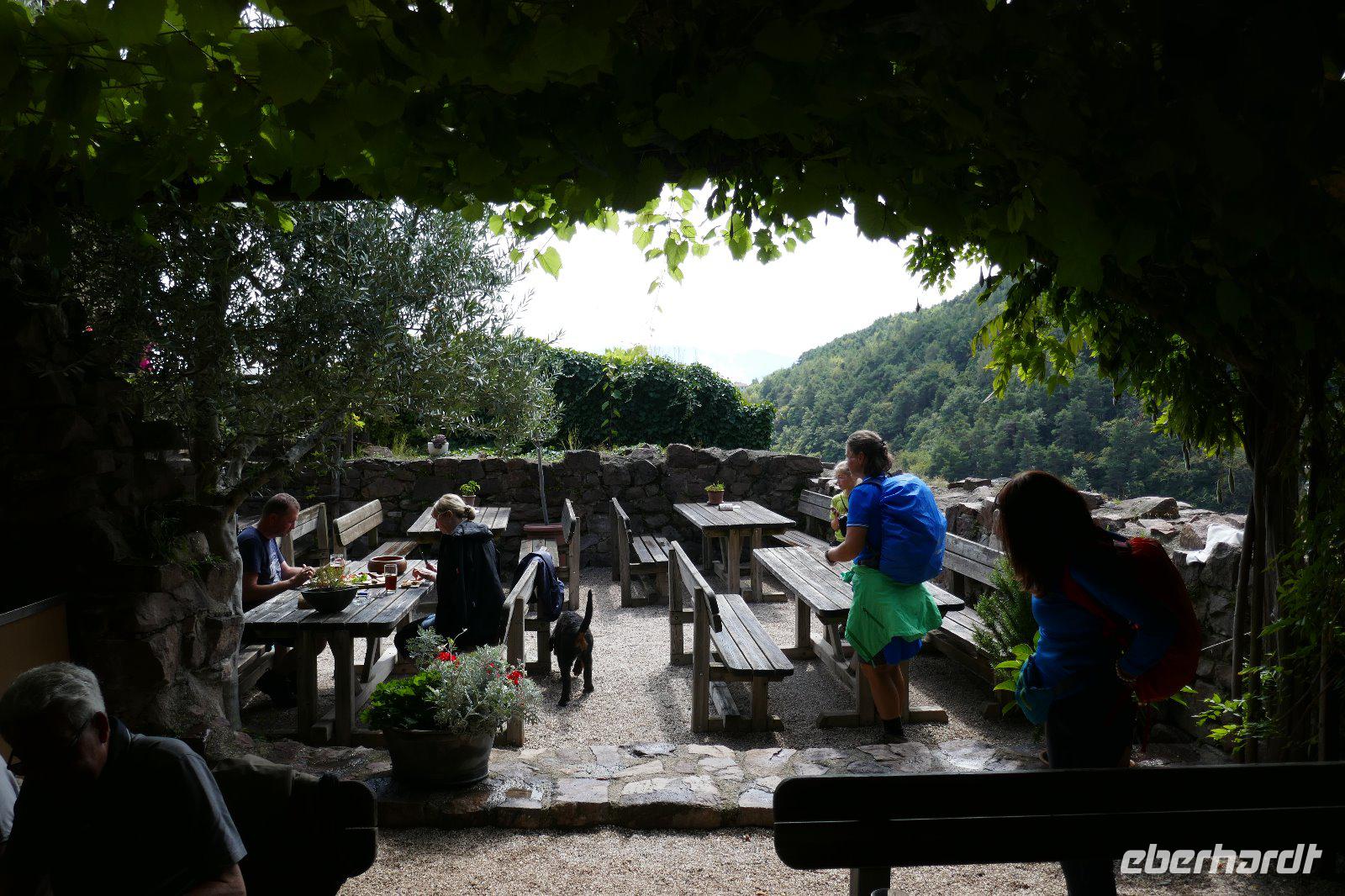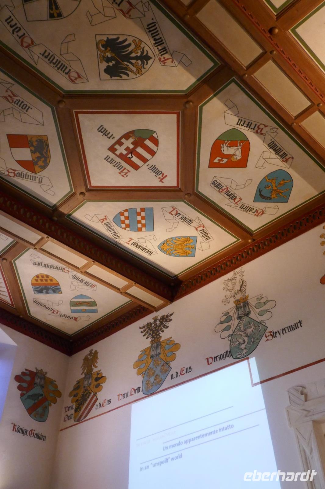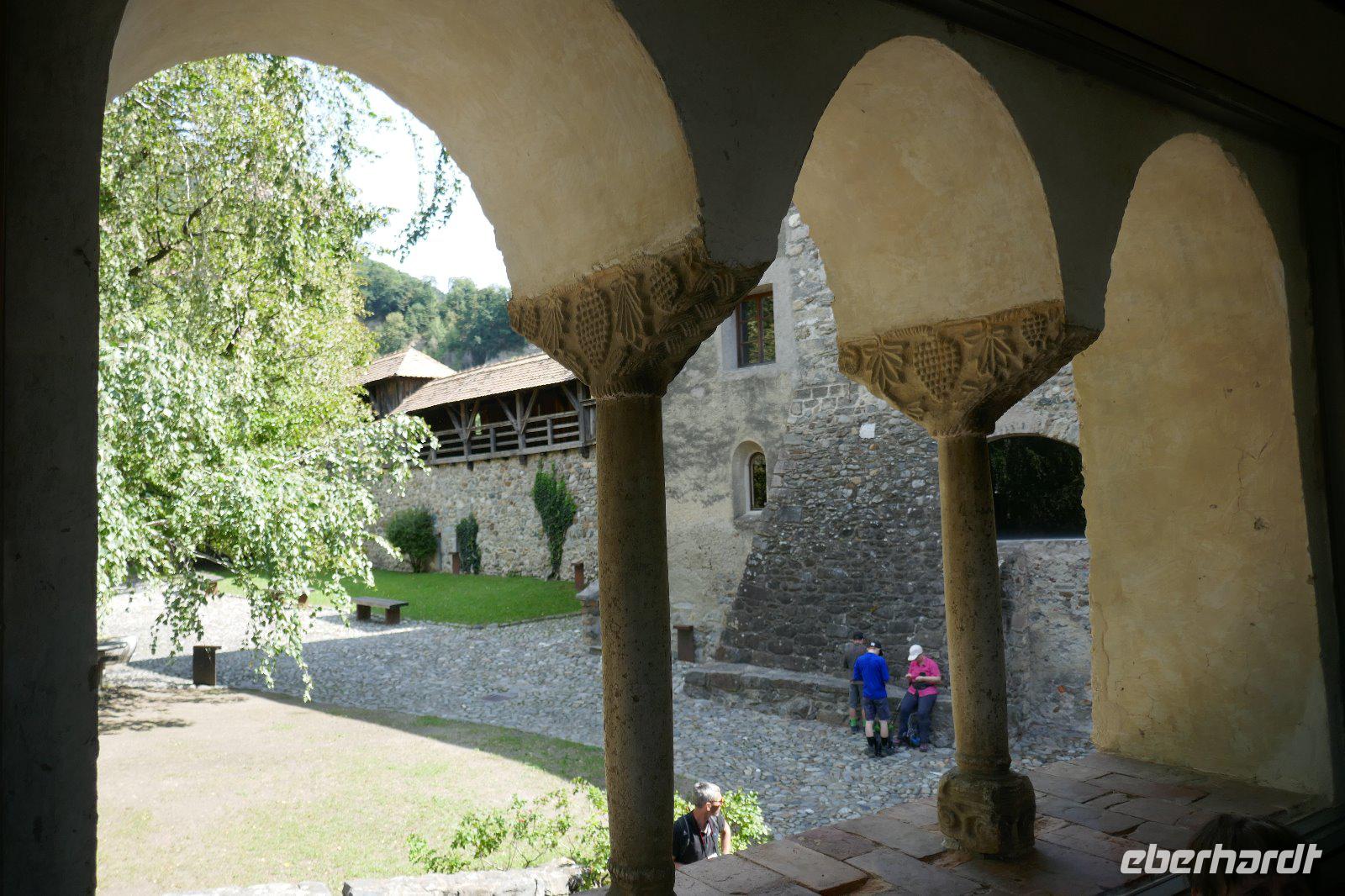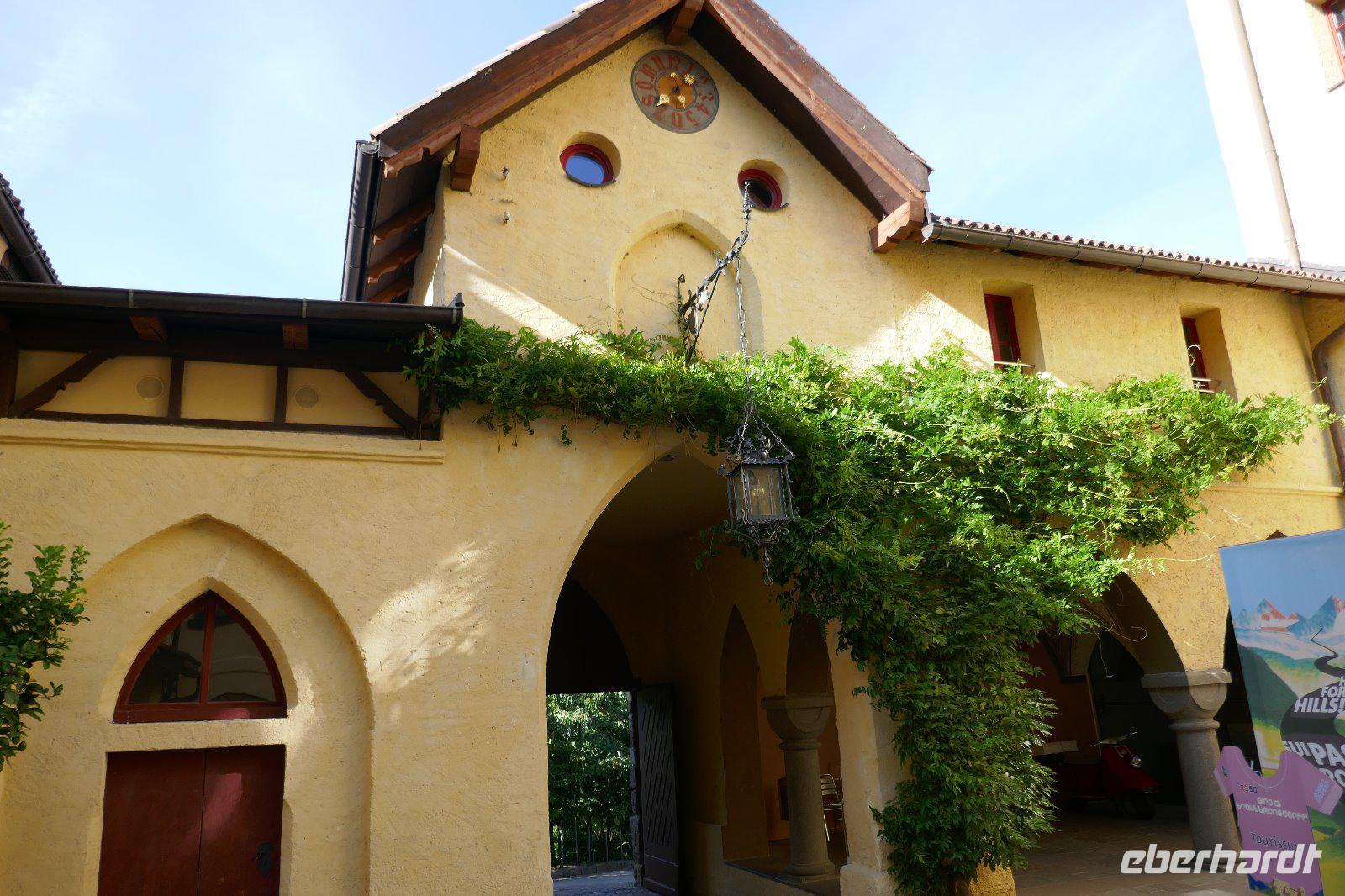 Hoch über dem Etschtal ragt auf steilen Felswänden die Wehr- u. Trotzburg Hocheppan in den Himmel. Einst gehörte sie den Landesfürsten von Tirol bis sie dann 1911 in den Besitz der Grafen von Enzenberg ging. Heute nach Renovierung u. Konservierung ist sie im Besitz der Gemeinde. Wir tauchten bei einem Rundgang und Führung ein in die Zeit des Mittelalters. Vieles zum Leben auf der Burg und dem Schicksal der Burg wurde berichtet. Im Rahmen der Führung erreichten wir auch die Burgkapelle. Im Inneren der Burgkapelle verstecken sich bekannte Wandmalereien, sehr gut erhaltene romanische Fresken mit typischen Motiven der Traditionen in der Umgebung. Hier ist eine Frau abgebildet, die Knödel isst, ein seltenes Motiv, das immer wieder Aufmerksamkeit erregt. Zu bewundern auch der Stil der Fresken, der viel vom byzantinischen Stil hatte. Nicht umsonst wird die Kapelle auch die „Sixtinische Kapelle" der Alpen genannt. Die Burgschänke lud zum Mittagsimbiss geradezu ein bevor es dann wieder zurück zum Hotel ging.