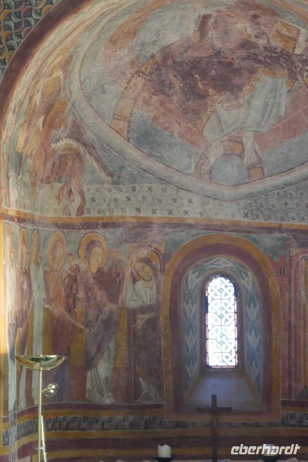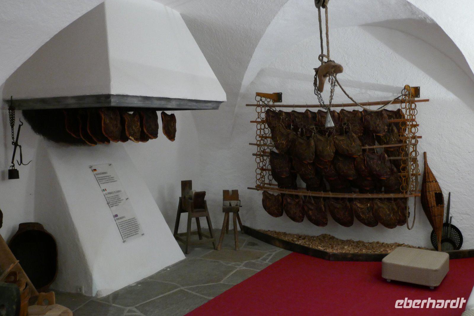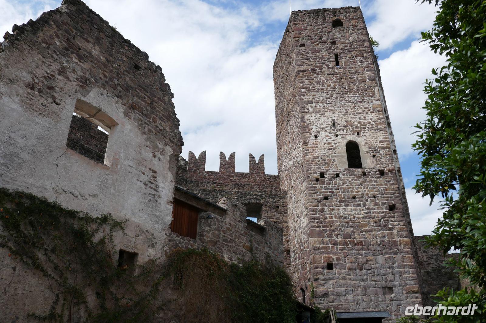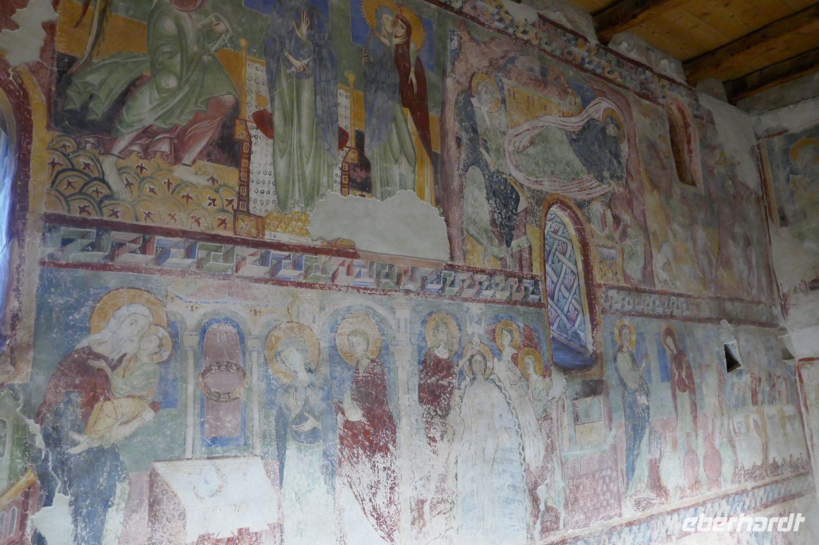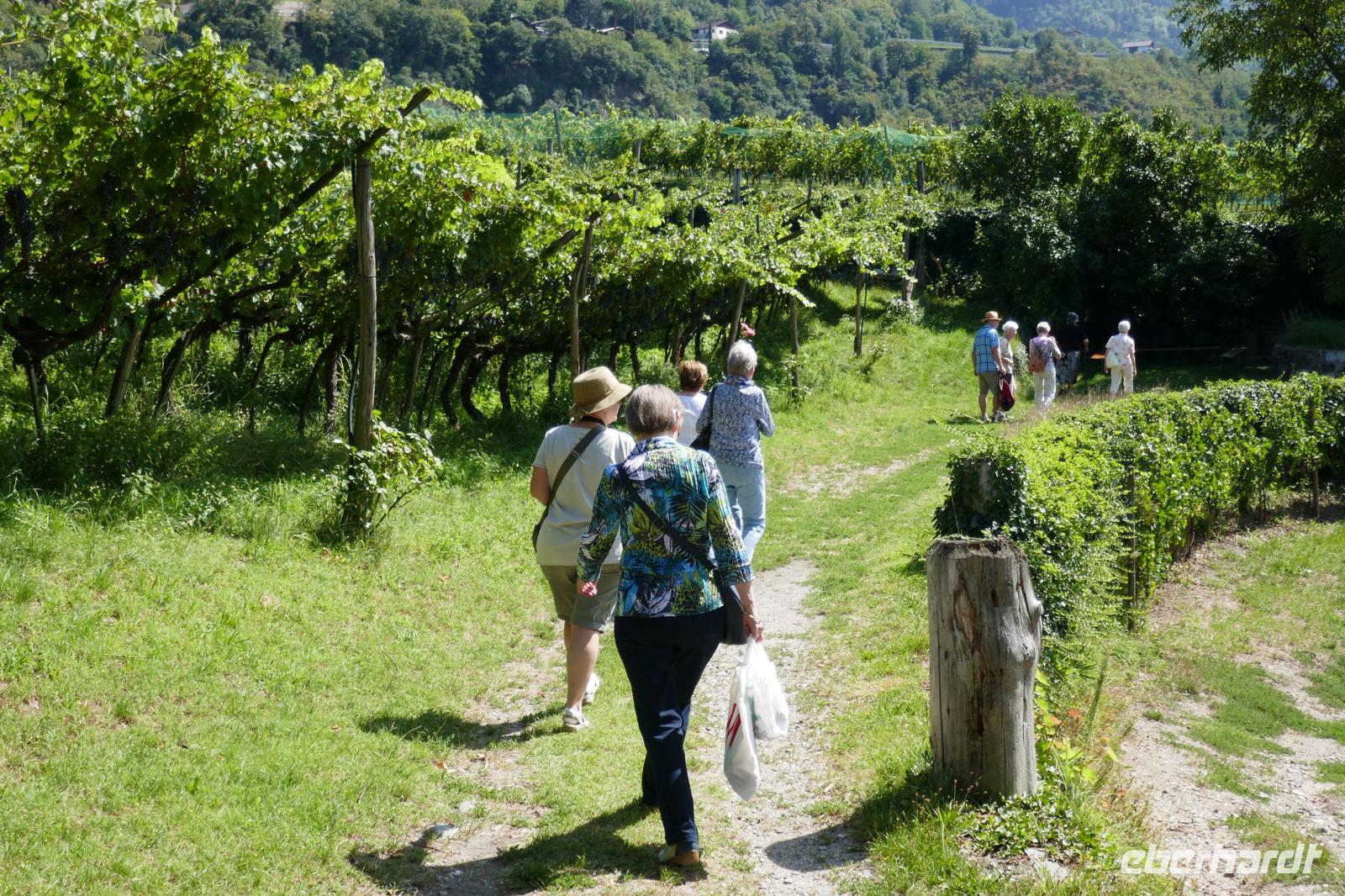 Hoch über dem Etschtal ragt auf steilen Felswänden die Wehr- u. Trotzburg Hocheppan in den Himmel. Einst gehörte sie den Landesfürsten von Tirol bis sie dann 1911 in den Besitz der Grafen von Enzenberg ging. Heute nach Renovierung u. Konservierung ist sie im Besitz der Gemeinde. Wir tauchten bei einem Rundgang und Führung ein in die Zeit des Mittelalters. Vieles zum Leben auf der Burg und dem Schicksal der Burg wurde berichtet. Im Rahmen der Führung erreichten wir auch die Burgkapelle. Im Inneren der Burgkapelle verstecken sich bekannte Wandmalereien, sehr gut erhaltene romanische Fresken mit typischen Motiven der Traditionen in der Umgebung. Hier ist eine Frau abgebildet, die Knödel isst, ein seltenes Motiv, das immer wieder Aufmerksamkeit erregt. Zu bewundern auch der Stil der Fresken, der viel vom byzantinischen Stil hatte. Nicht umsonst wird die Kapelle auch die „Sixtinische Kapelle" der Alpen genannt. Die Burgschänke lud zum Mittagsimbiss geradezu ein bevor es dann wieder zurück zum Hotel ging.