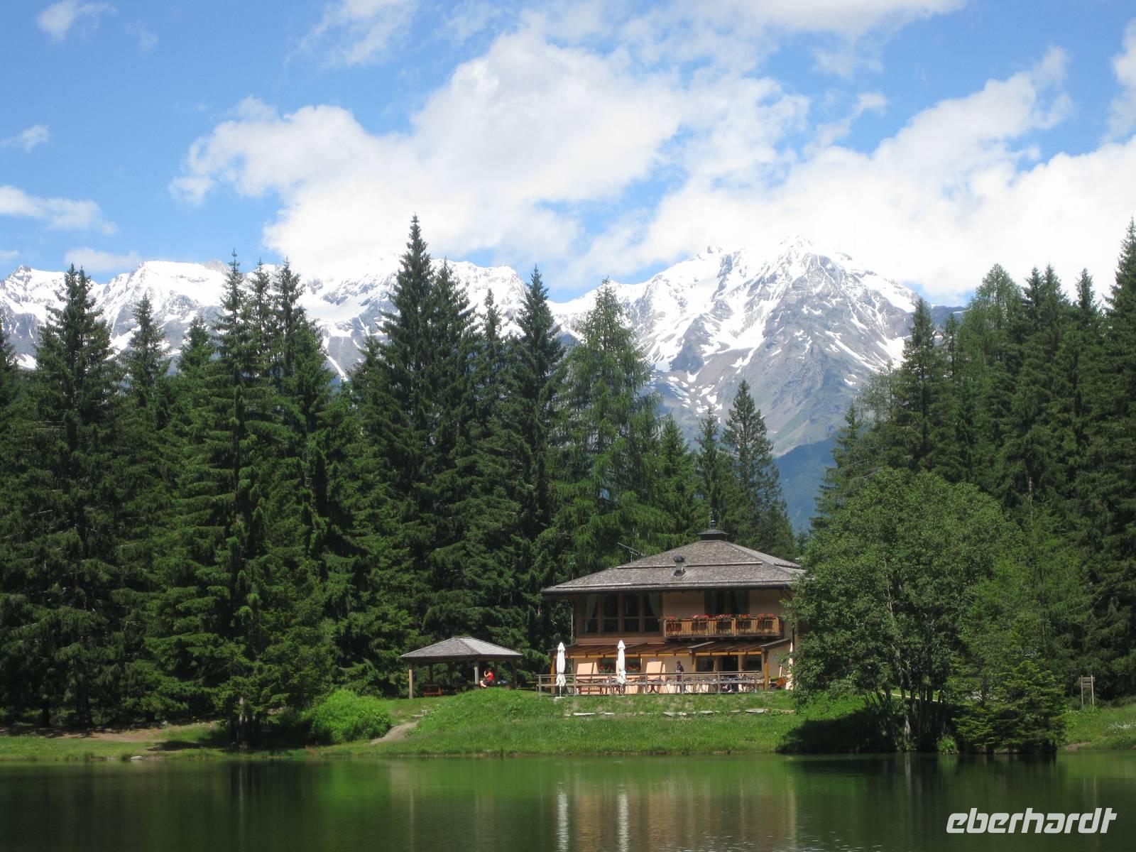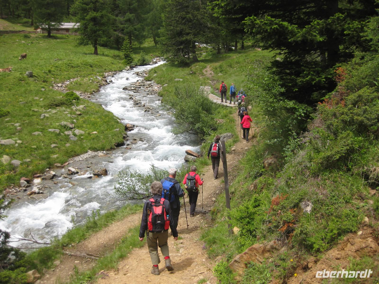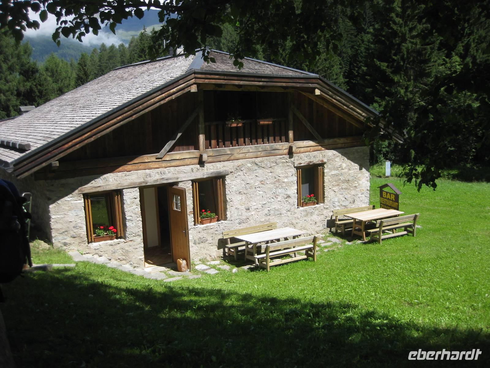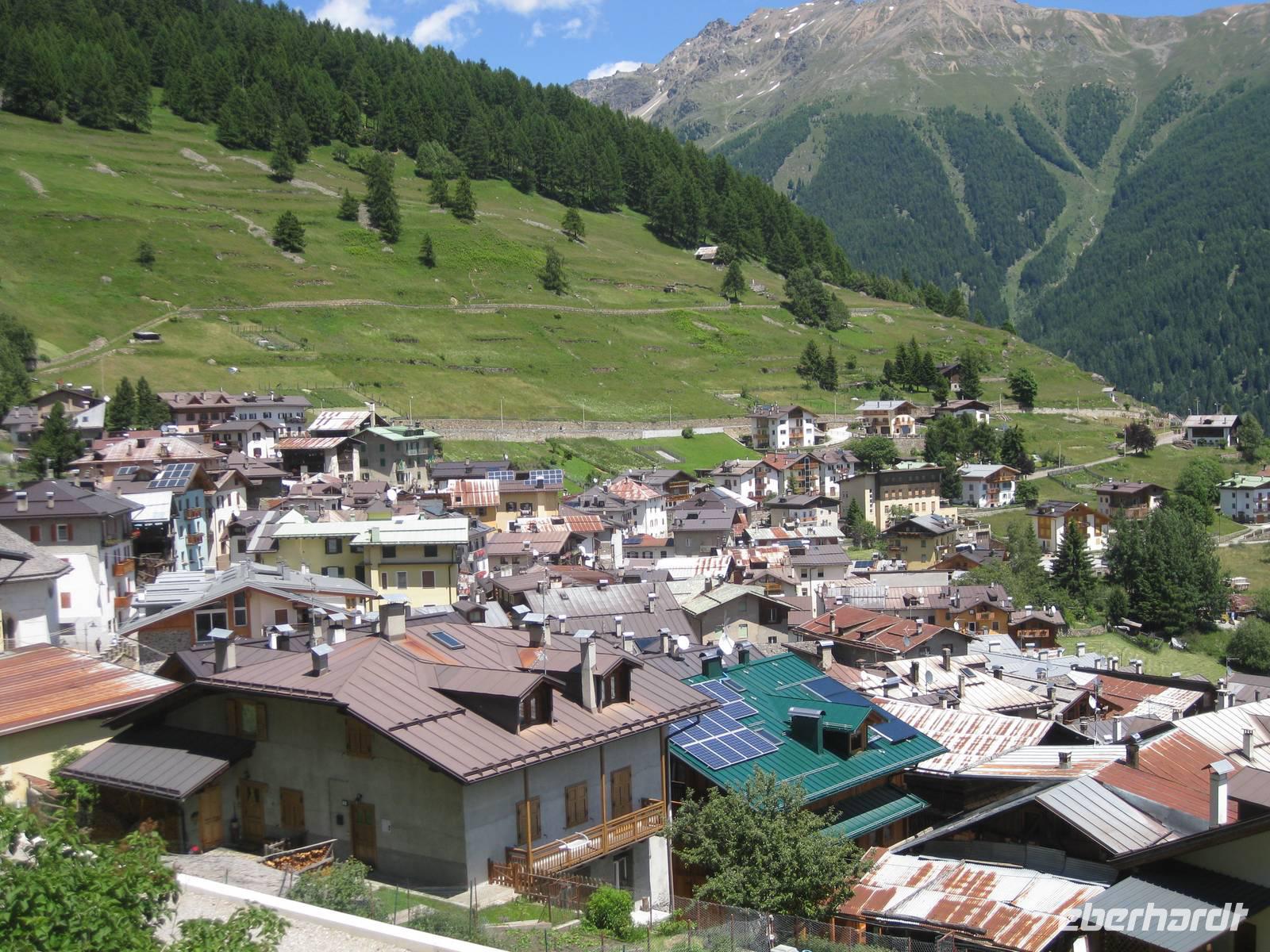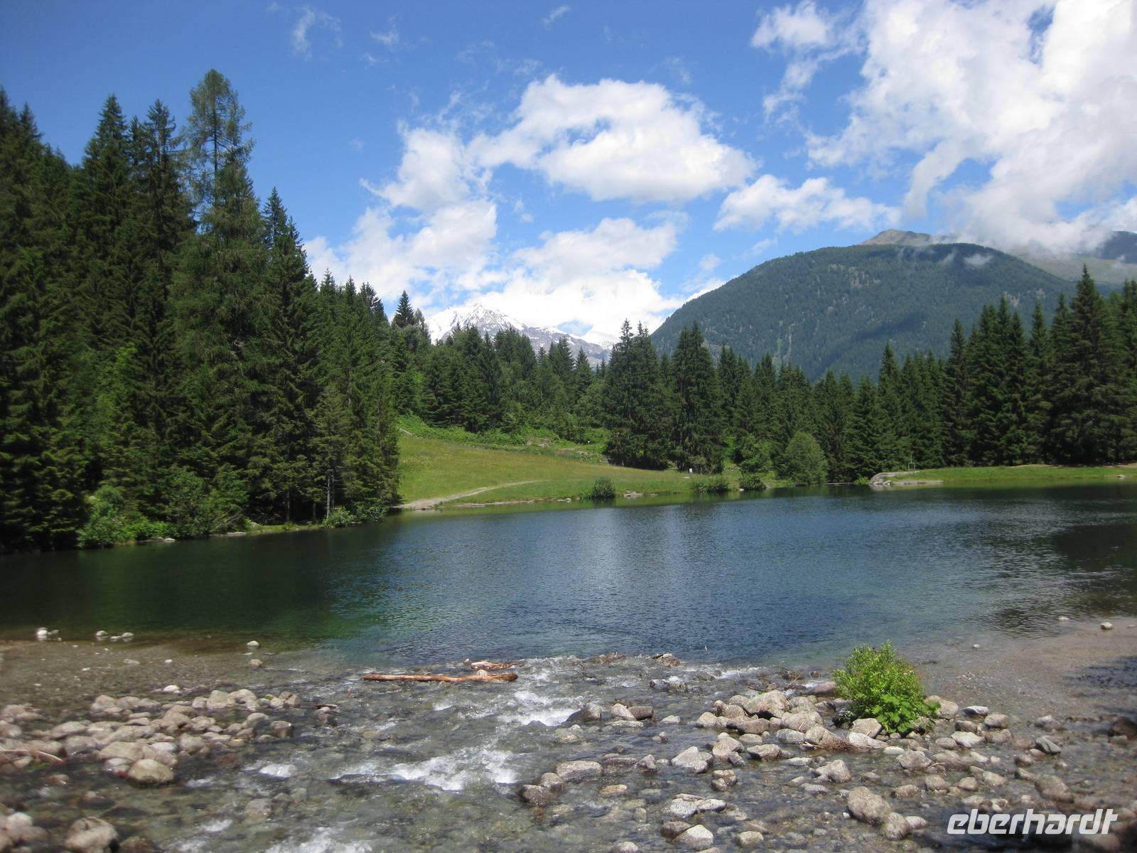 Nachdem wir den richtigen Einstieg zu unserem Wanderweg gefunden haben, laufen wir durch den Wald, mal ein wenig bergauf und mal etwas bergab. Immer wieder gibt es tolle Ausblicke. Wir müssen nicht in der prallen Sonne laufen. Das ist sehr angenehm. Nach einer guten Stunde erreichen wir den Lago Covel (1839 m), einen Bergsee auf einer Hochebene mit einem faszinierenden Panorama rundherum. Hier ist es so schön, dass wir eine längere Pause machen und einfach am Ufer des Sees sitzen bleiben. Nachdem wir uns sattgesehen haben, brechen wir auf und setzen unsere Wanderung fort. Wir kommen an einem Wasserfall vorbei. Am Ortseingang von Peio kommen wir zu einer Kapelle aus dem 16. Jahrhundert. Bei dieser Kapelle befindet sich auch der österreichisch-ungarische Friedhof, wo die Soldaten, die in den Kämpfen des ersten Weltkrieges an der Front hier in den Bergen gefallen sind, bestattet wurden. Eine graue Steinpyramide aus dem Jahr 1916 soll als Mahnmal gegen Kriege dienen. Dann kommen wir in das Dorf Peio. Hier wird viel Holz be- und verarbeitet. Im Cafe "Baita Tre Larici" kehren wir auf Empfehlung von Martina ein und kosten das gute italienische Eis. Dann verlassen wir Peio und laufen auf dem Naturlehrpfad in Richtung Cogolo. Der Weg geht nun nur noch bergab bis in's Tal. In Pegaia überqueren wir das Flüsschen und laufen das letzte Stück im Tal bis zu unserem Hotel.