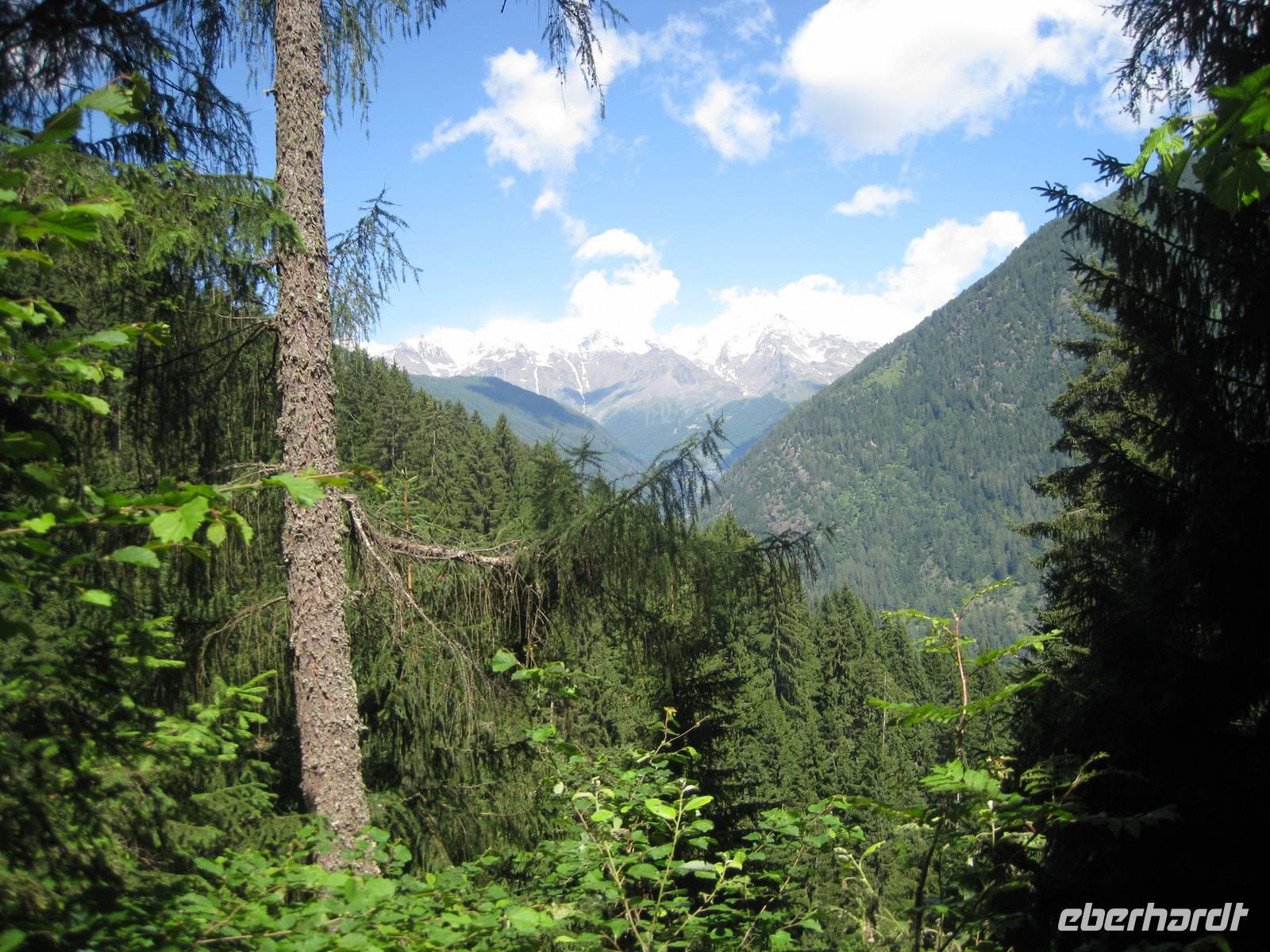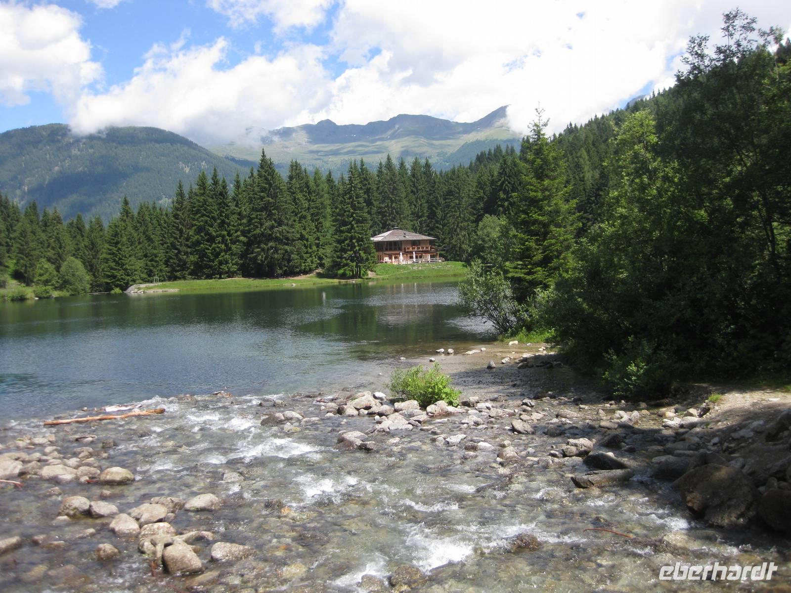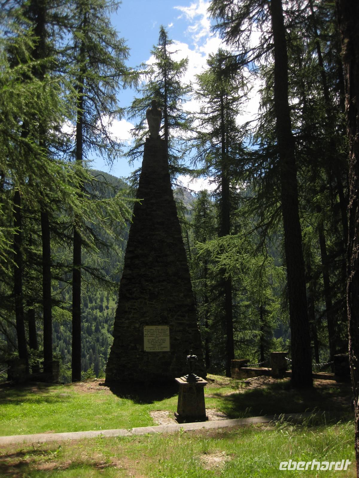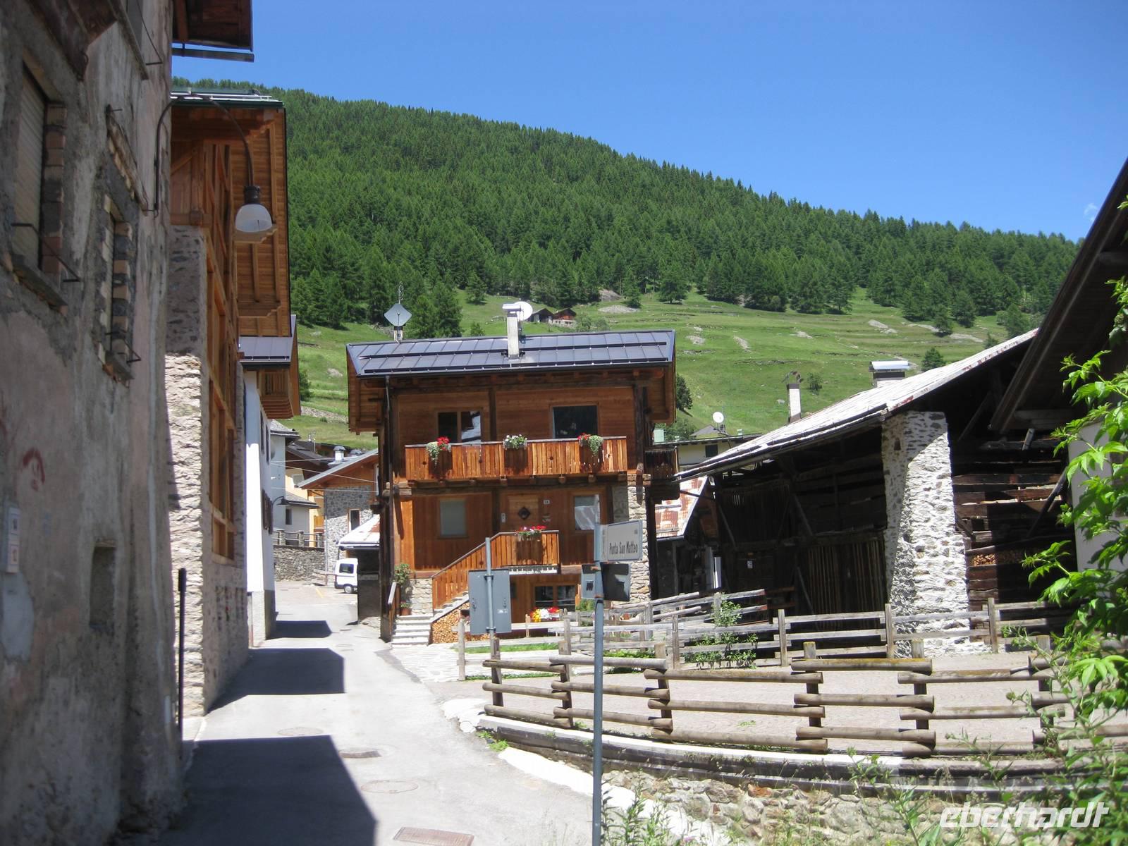 Nachdem wir den richtigen Einstieg zu unserem Wanderweg gefunden haben, laufen wir durch den Wald, mal ein wenig bergauf und mal etwas bergab. Immer wieder gibt es tolle Ausblicke. Wir müssen nicht in der prallen Sonne laufen. Das ist sehr angenehm. Nach einer guten Stunde erreichen wir den Lago Covel (1839 m), einen Bergsee auf einer Hochebene mit einem faszinierenden Panorama rundherum. Hier ist es so schön, dass wir eine längere Pause machen und einfach am Ufer des Sees sitzen bleiben. Nachdem wir uns sattgesehen haben, brechen wir auf und setzen unsere Wanderung fort. Wir kommen an einem Wasserfall vorbei. Am Ortseingang von Peio kommen wir zu einer Kapelle aus dem 16. Jahrhundert. Bei dieser Kapelle befindet sich auch der österreichisch-ungarische Friedhof, wo die Soldaten, die in den Kämpfen des ersten Weltkrieges an der Front hier in den Bergen gefallen sind, bestattet wurden. Eine graue Steinpyramide aus dem Jahr 1916 soll als Mahnmal gegen Kriege dienen. Dann kommen wir in das Dorf Peio. Hier wird viel Holz be- und verarbeitet. Im Cafe "Baita Tre Larici" kehren wir auf Empfehlung von Martina ein und kosten das gute italienische Eis. Dann verlassen wir Peio und laufen auf dem Naturlehrpfad in Richtung Cogolo. Der Weg geht nun nur noch bergab bis in's Tal. In Pegaia überqueren wir das Flüsschen und laufen das letzte Stück im Tal bis zu unserem Hotel.