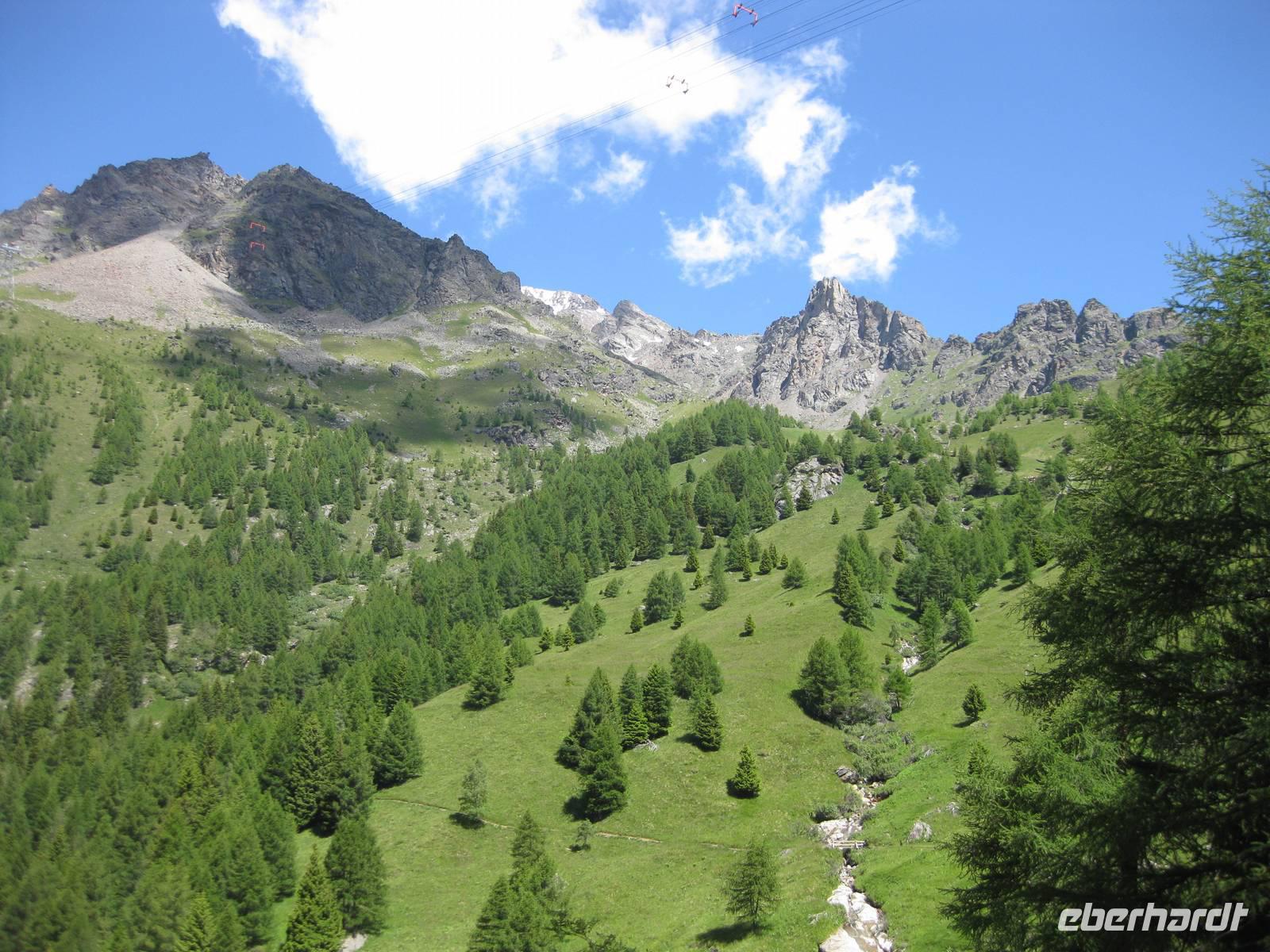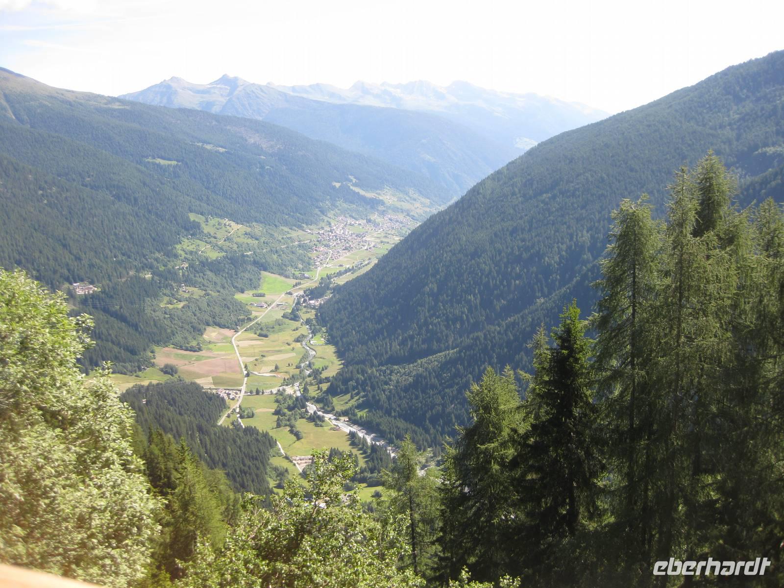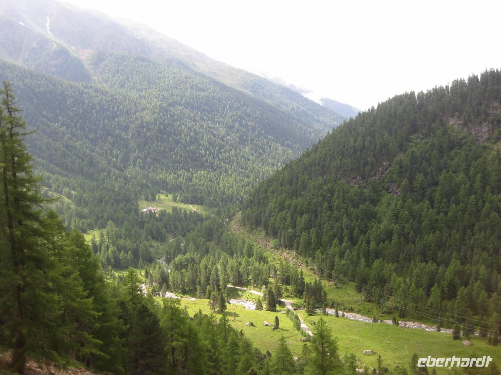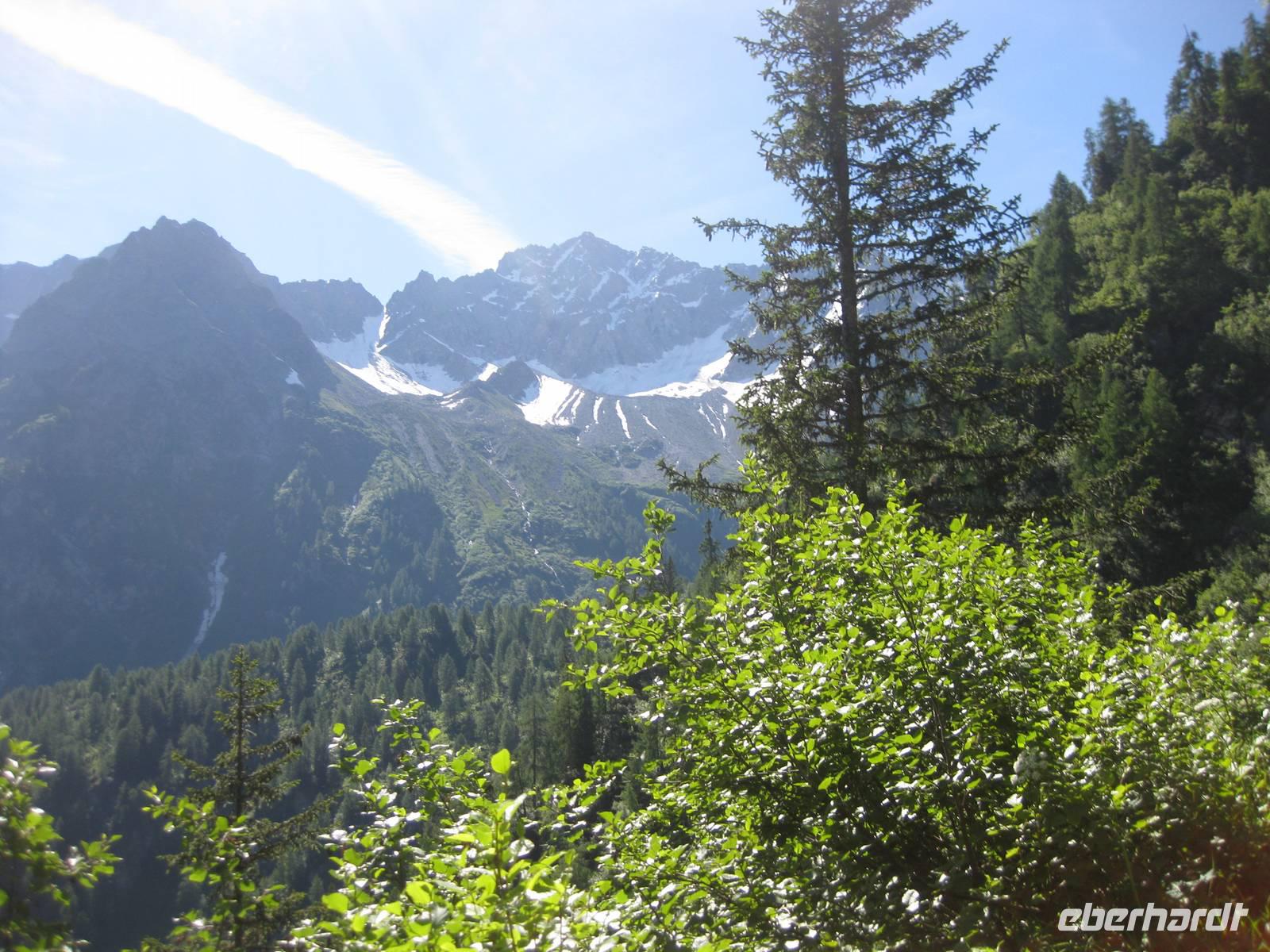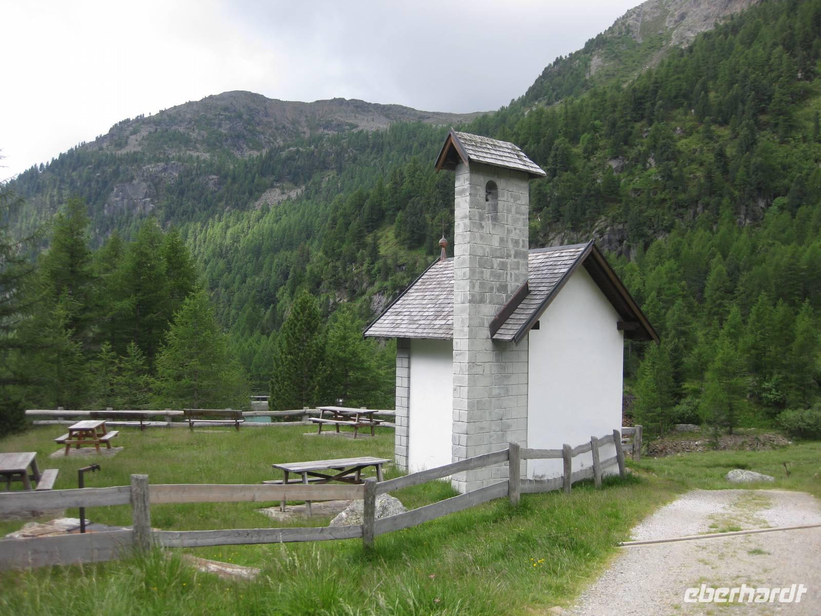 Nachdem wir den richtigen Einstieg zu unserem Wanderweg gefunden haben, laufen wir durch den Wald, mal ein wenig bergauf und mal etwas bergab. Immer wieder gibt es tolle Ausblicke. Wir müssen nicht in der prallen Sonne laufen. Das ist sehr angenehm. Nach einer guten Stunde erreichen wir den Lago Covel (1839 m), einen Bergsee auf einer Hochebene mit einem faszinierenden Panorama rundherum. Hier ist es so schön, dass wir eine längere Pause machen und einfach am Ufer des Sees sitzen bleiben. Nachdem wir uns sattgesehen haben, brechen wir auf und setzen unsere Wanderung fort. Wir kommen an einem Wasserfall vorbei. Am Ortseingang von Peio kommen wir zu einer Kapelle aus dem 16. Jahrhundert. Bei dieser Kapelle befindet sich auch der österreichisch-ungarische Friedhof, wo die Soldaten, die in den Kämpfen des ersten Weltkrieges an der Front hier in den Bergen gefallen sind, bestattet wurden. Eine graue Steinpyramide aus dem Jahr 1916 soll als Mahnmal gegen Kriege dienen. Dann kommen wir in das Dorf Peio. Hier wird viel Holz be- und verarbeitet. Im Cafe "Baita Tre Larici" kehren wir auf Empfehlung von Martina ein und kosten das gute italienische Eis. Dann verlassen wir Peio und laufen auf dem Naturlehrpfad in Richtung Cogolo. Der Weg geht nun nur noch bergab bis in's Tal. In Pegaia überqueren wir das Flüsschen und laufen das letzte Stück im Tal bis zu unserem Hotel.