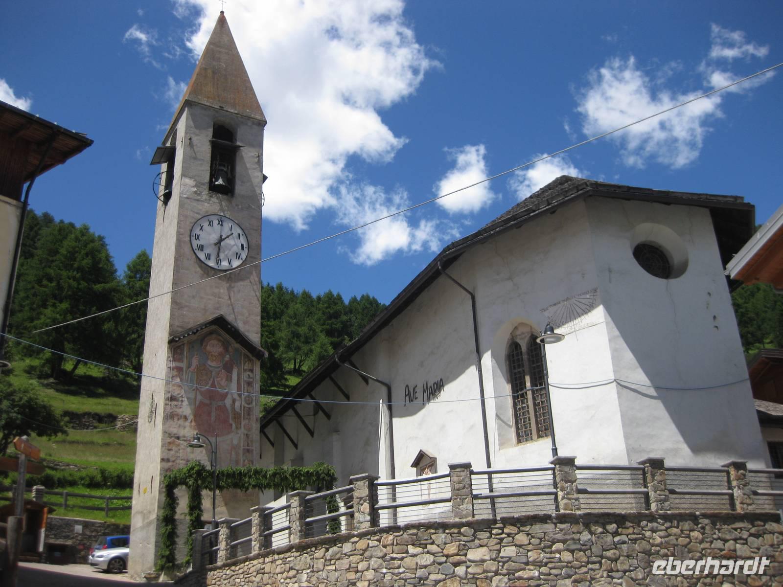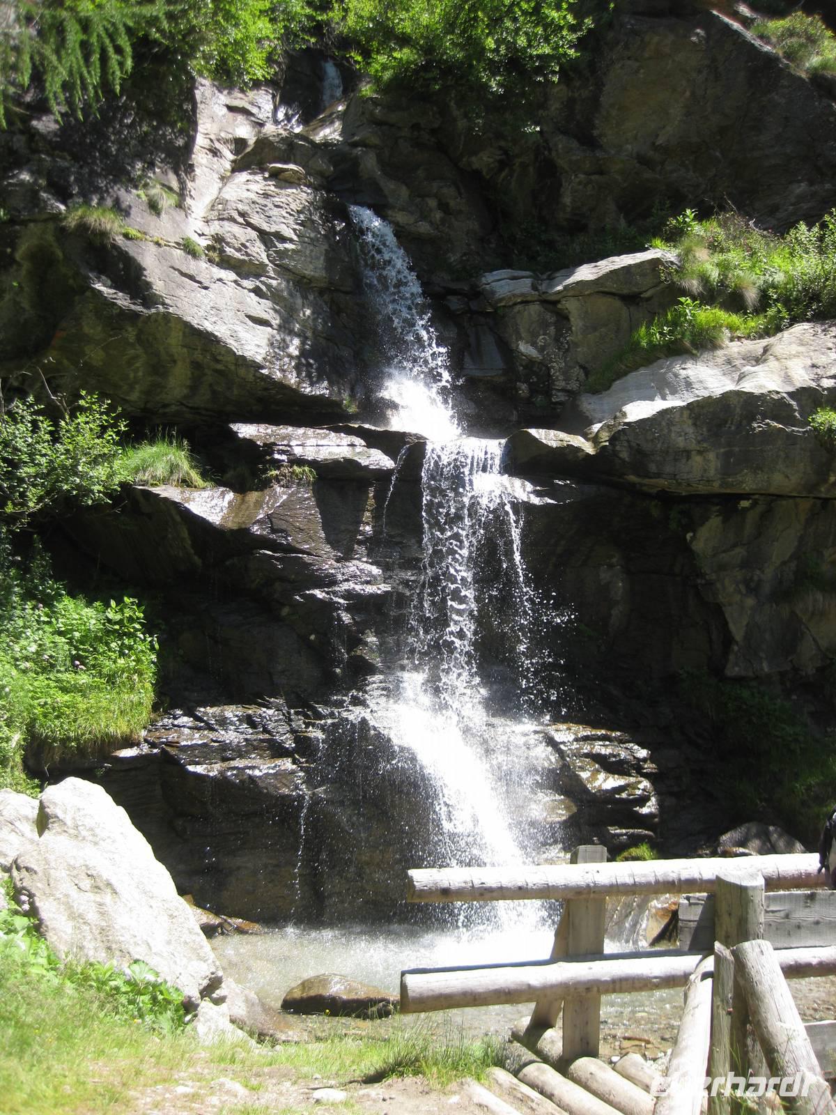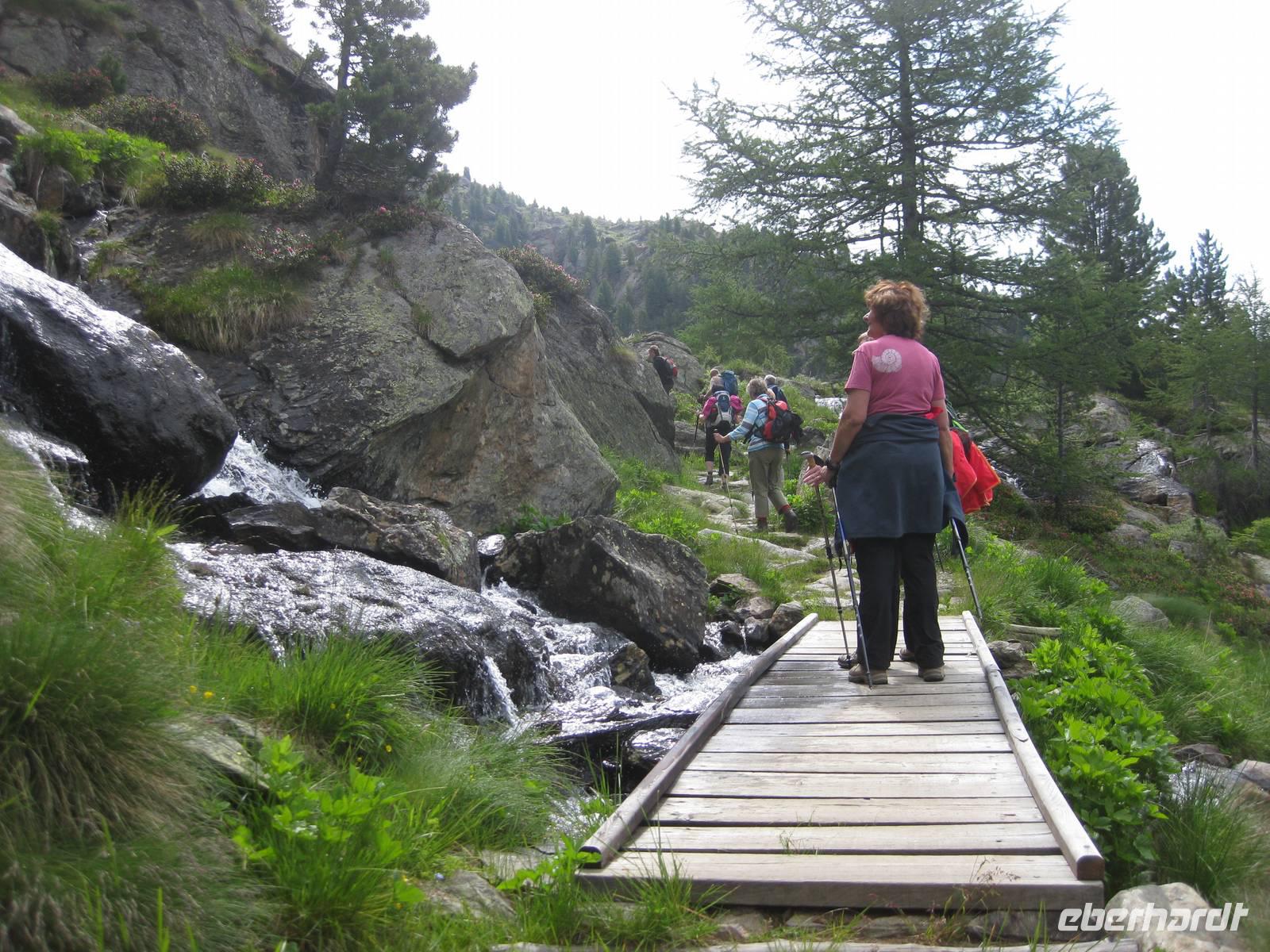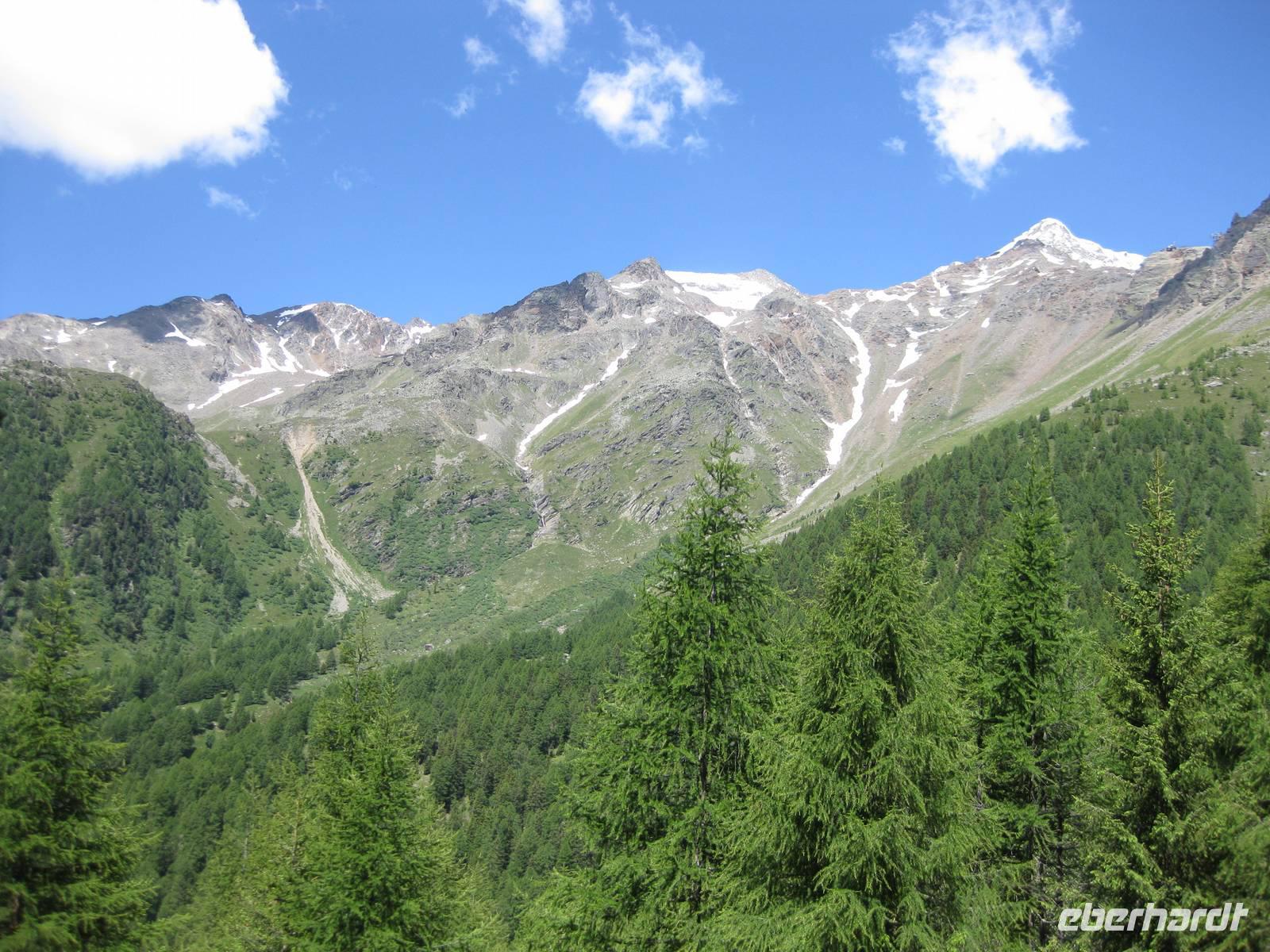 Nachdem wir den richtigen Einstieg zu unserem Wanderweg gefunden haben, laufen wir durch den Wald, mal ein wenig bergauf und mal etwas bergab. Immer wieder gibt es tolle Ausblicke. Wir müssen nicht in der prallen Sonne laufen. Das ist sehr angenehm. Nach einer guten Stunde erreichen wir den Lago Covel (1839 m), einen Bergsee auf einer Hochebene mit einem faszinierenden Panorama rundherum. Hier ist es so schön, dass wir eine längere Pause machen und einfach am Ufer des Sees sitzen bleiben. Nachdem wir uns sattgesehen haben, brechen wir auf und setzen unsere Wanderung fort. Wir kommen an einem Wasserfall vorbei. Am Ortseingang von Peio kommen wir zu einer Kapelle aus dem 16. Jahrhundert. Bei dieser Kapelle befindet sich auch der österreichisch-ungarische Friedhof, wo die Soldaten, die in den Kämpfen des ersten Weltkrieges an der Front hier in den Bergen gefallen sind, bestattet wurden. Eine graue Steinpyramide aus dem Jahr 1916 soll als Mahnmal gegen Kriege dienen. Dann kommen wir in das Dorf Peio. Hier wird viel Holz be- und verarbeitet. Im Cafe "Baita Tre Larici" kehren wir auf Empfehlung von Martina ein und kosten das gute italienische Eis. Dann verlassen wir Peio und laufen auf dem Naturlehrpfad in Richtung Cogolo. Der Weg geht nun nur noch bergab bis in's Tal. In Pegaia überqueren wir das Flüsschen und laufen das letzte Stück im Tal bis zu unserem Hotel.