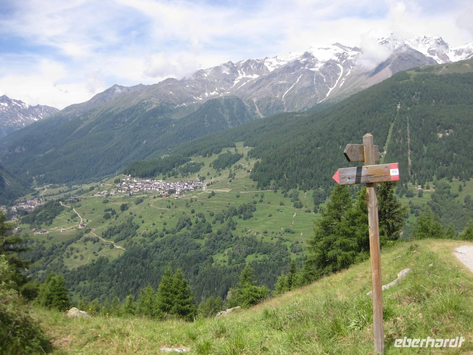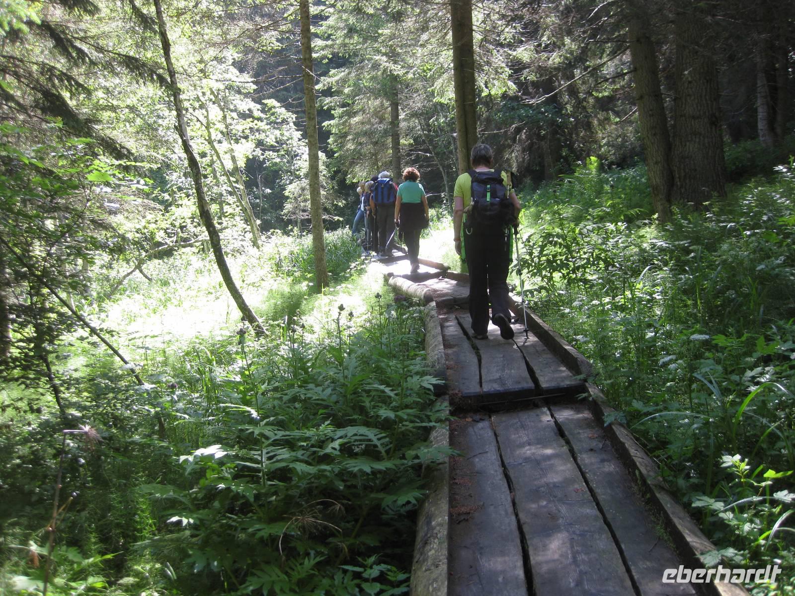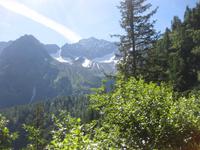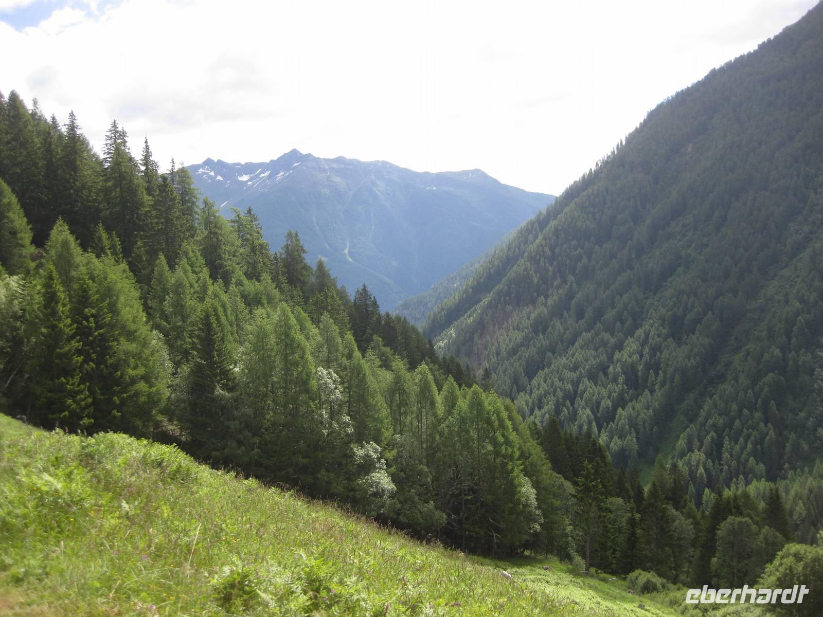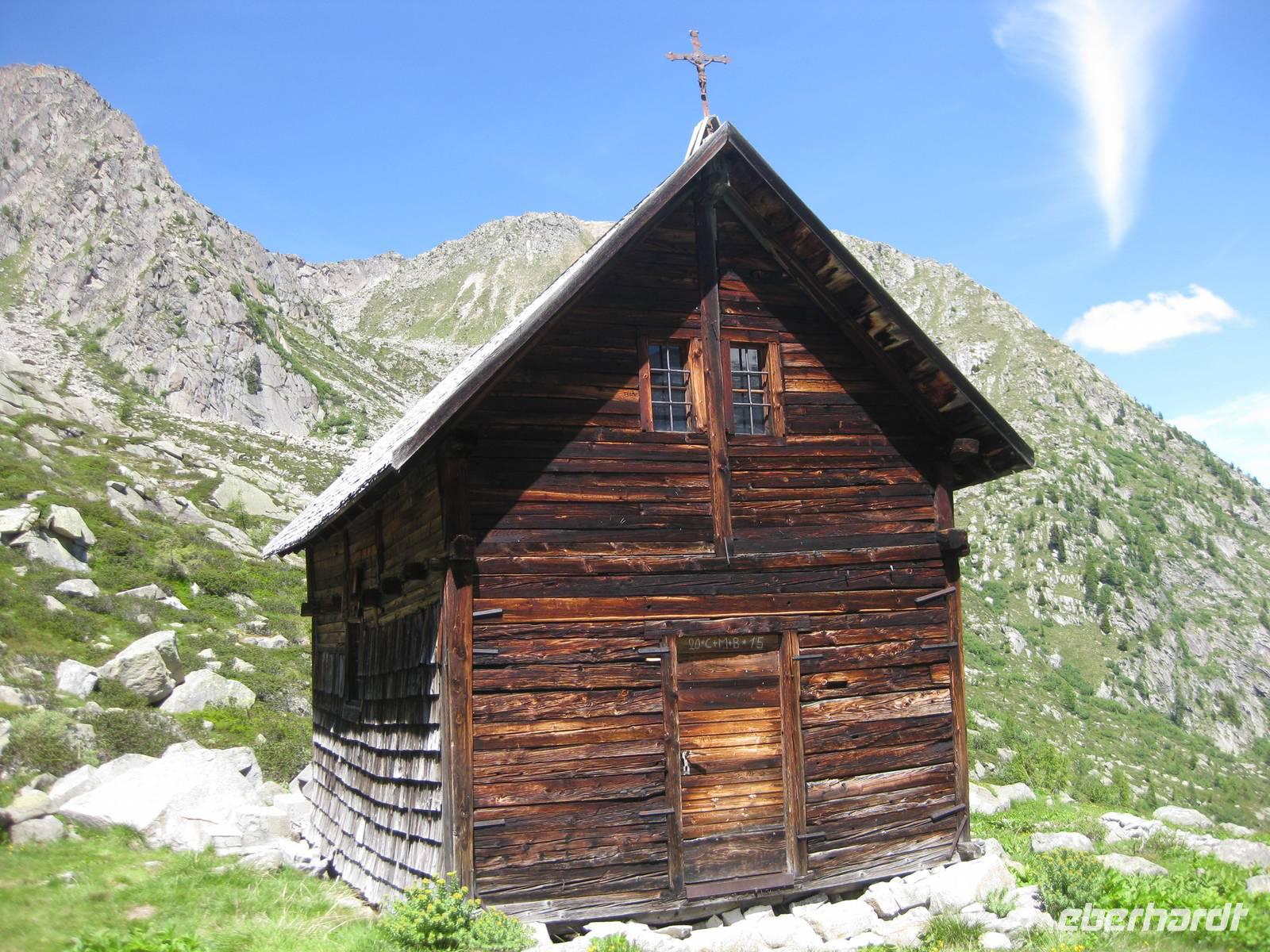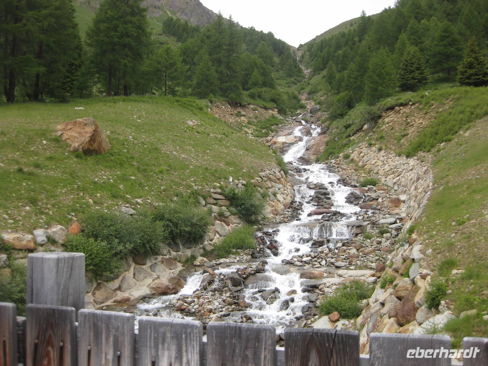 Nachdem wir den richtigen Einstieg zu unserem Wanderweg gefunden haben, laufen wir durch den Wald, mal ein wenig bergauf und mal etwas bergab. Immer wieder gibt es tolle Ausblicke. Wir müssen nicht in der prallen Sonne laufen. Das ist sehr angenehm. Nach einer guten Stunde erreichen wir den Lago Covel (1839 m), einen Bergsee auf einer Hochebene mit einem faszinierenden Panorama rundherum. Hier ist es so schön, dass wir eine längere Pause machen und einfach am Ufer des Sees sitzen bleiben. Nachdem wir uns sattgesehen haben, brechen wir auf und setzen unsere Wanderung fort. Wir kommen an einem Wasserfall vorbei. Am Ortseingang von Peio kommen wir zu einer Kapelle aus dem 16. Jahrhundert. Bei dieser Kapelle befindet sich auch der österreichisch-ungarische Friedhof, wo die Soldaten, die in den Kämpfen des ersten Weltkrieges an der Front hier in den Bergen gefallen sind, bestattet wurden. Eine graue Steinpyramide aus dem Jahr 1916 soll als Mahnmal gegen Kriege dienen. Dann kommen wir in das Dorf Peio. Hier wird viel Holz be- und verarbeitet. Im Cafe "Baita Tre Larici" kehren wir auf Empfehlung von Martina ein und kosten das gute italienische Eis. Dann verlassen wir Peio und laufen auf dem Naturlehrpfad in Richtung Cogolo. Der Weg geht nun nur noch bergab bis in's Tal. In Pegaia überqueren wir das Flüsschen und laufen das letzte Stück im Tal bis zu unserem Hotel.