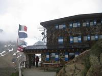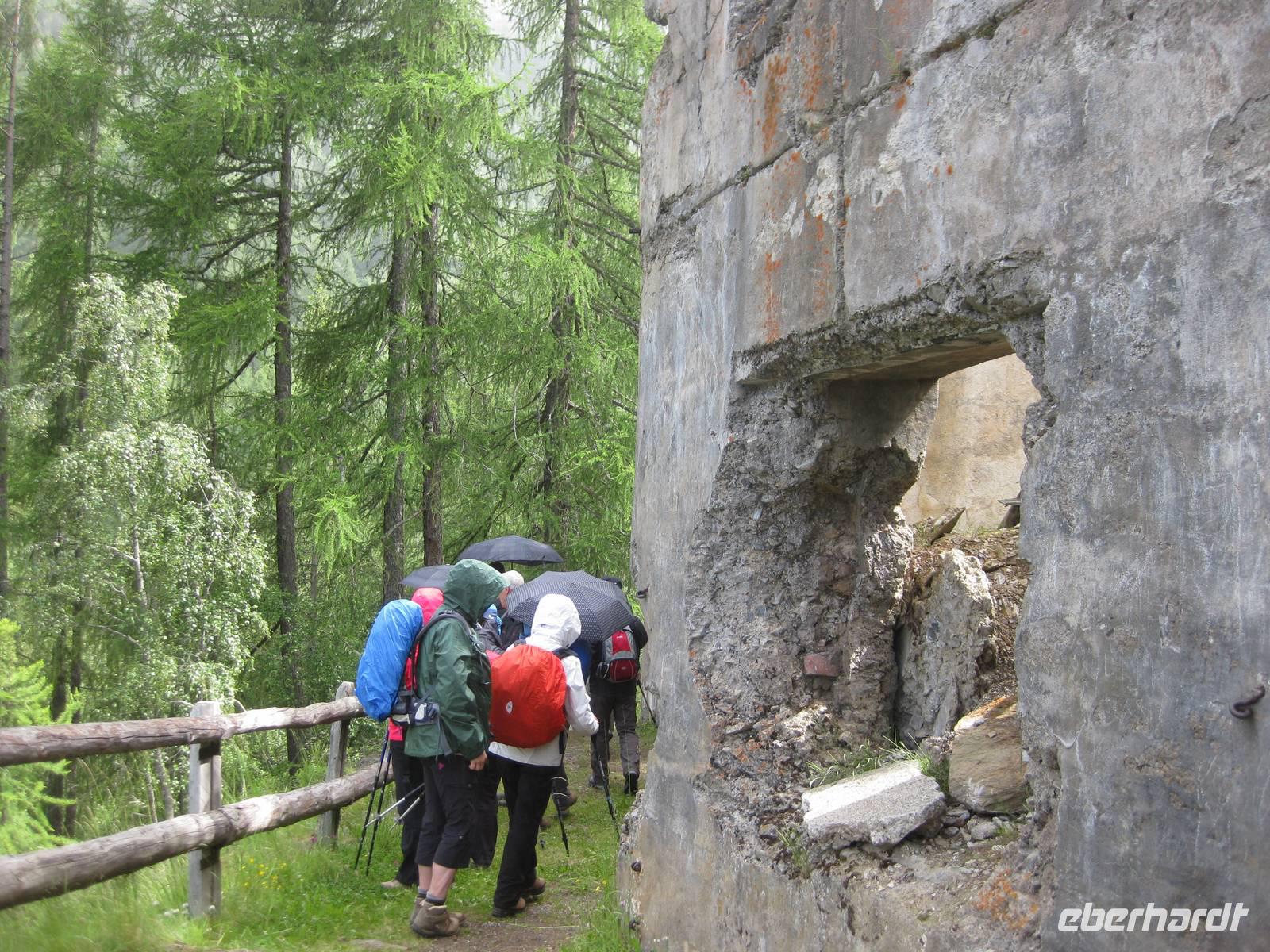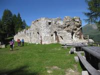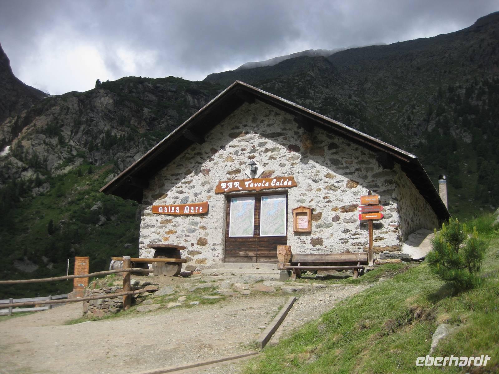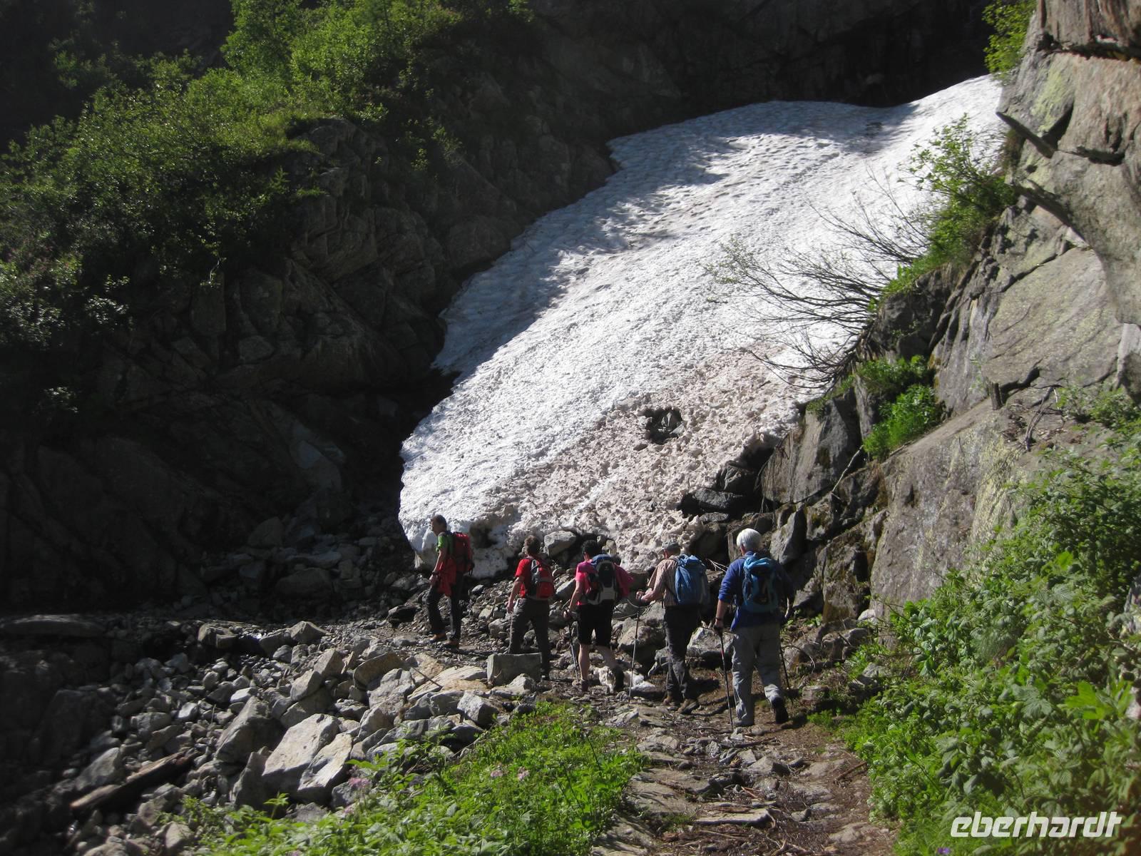 Um 9.30 Uhr erreichen wir den Parkplatz in 1884 m Höhe, laufen zu den Ruinen der Festung vor und genießen die tolle Aussicht über das Tal bis zum Tonale-Pass. Dann starten wir zu unserer Wanderung. Wir laufen zunächst auf einem schmalen, sanft ansteigenden Weg. Dieser bietet einige Überraschungen. Wir müssen durch einen Tunnel, hinter einem Wasserfall entlang - eine kleine Dusche ist da schon möglich und unmittelbar an einem Schneefeld vorbei. Dann geht es steiler über Granitgestein auf der Ostseite des Croz di Stavel nach oben und auf der anderen Seite wacht die gewaltige Nordwand der 3558 m hohen Presanella Bergkette über uns. Wir blicken auf eine atemberaubende wunderschöne Hochgebirgslandschaft mit Gletschern, Schnee- und Geröllfeldern, herabstürzenden Bächen und der typischen Vegetation. Wir können die Schutzhütte schon sehen. Das letzte Stück des Weges ist noch mal eine Herausforderung, es geht noch etwas steiler hinauf und der Weg führt uns über große und kleine Steine, deren Überquerung schon eine gewisse Sportlichkeit erfordert.