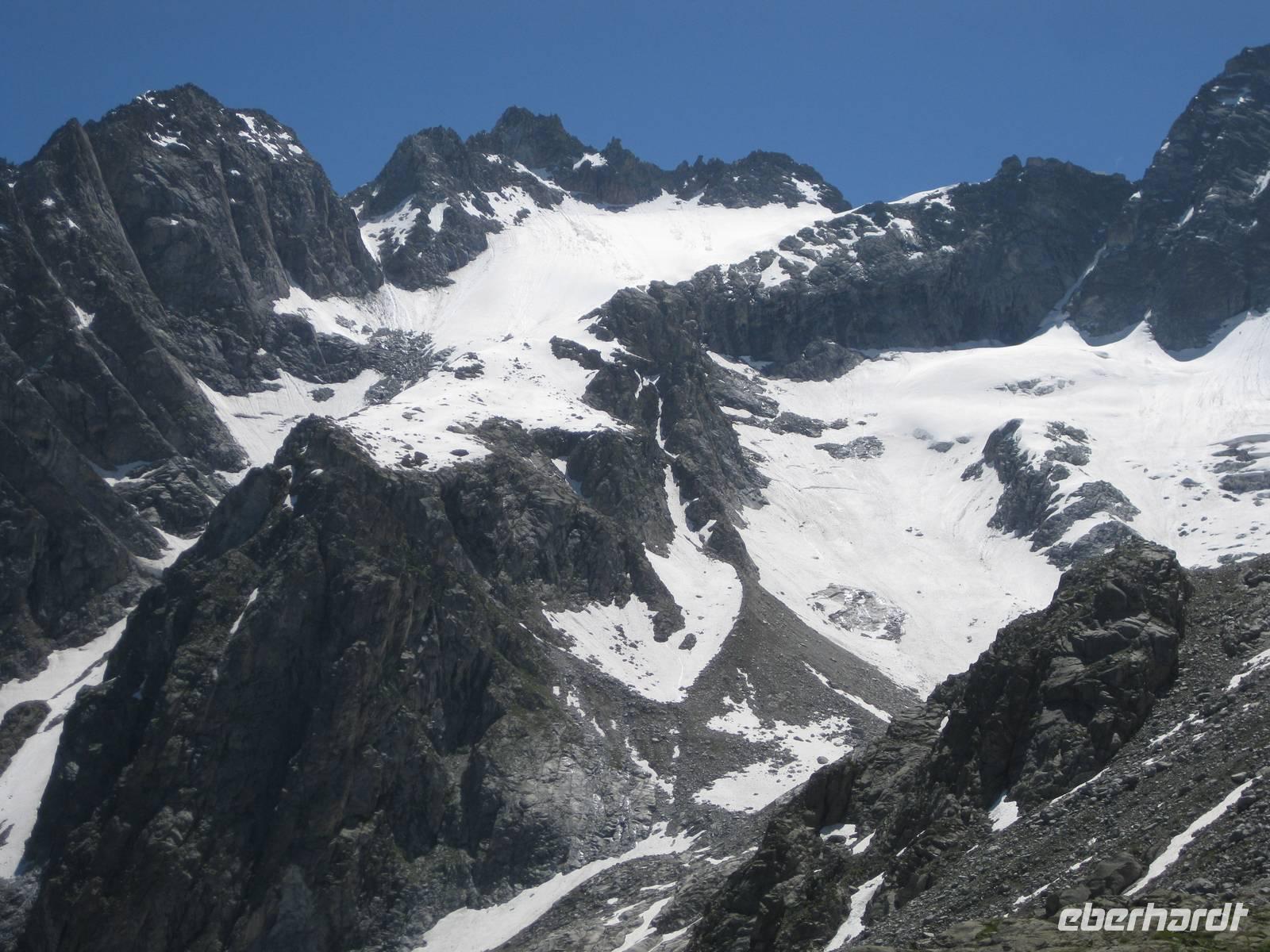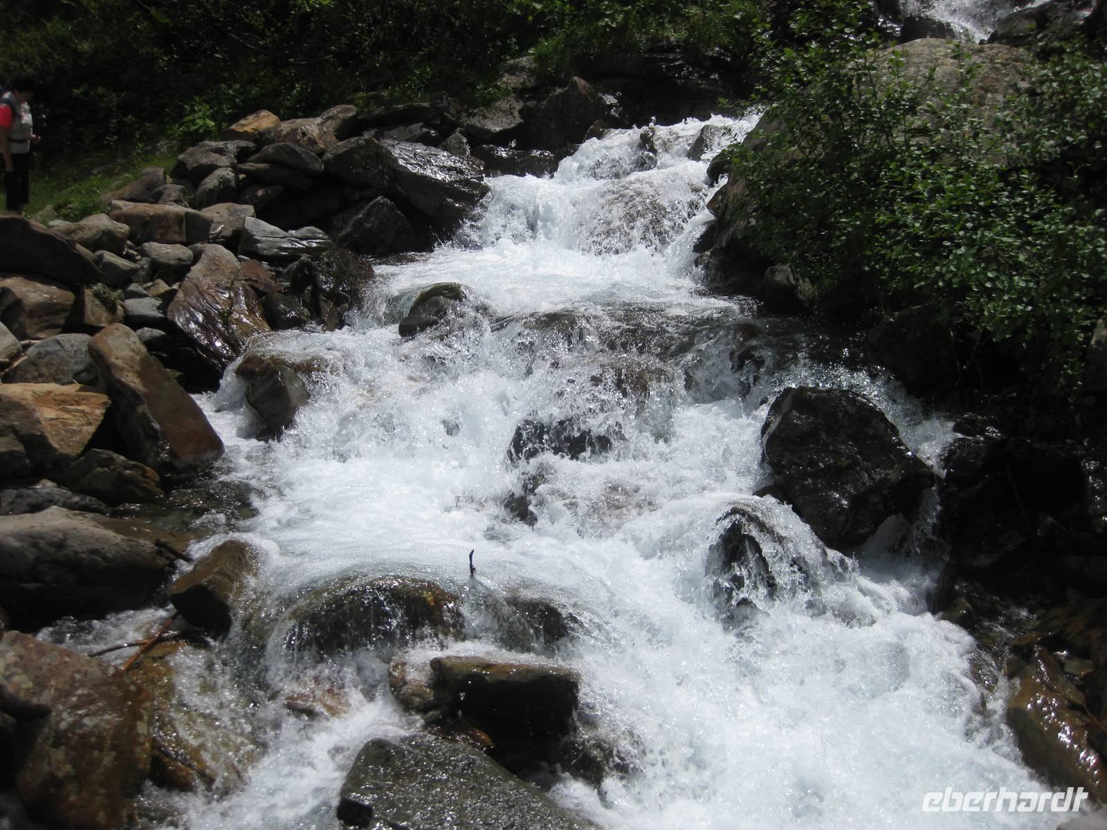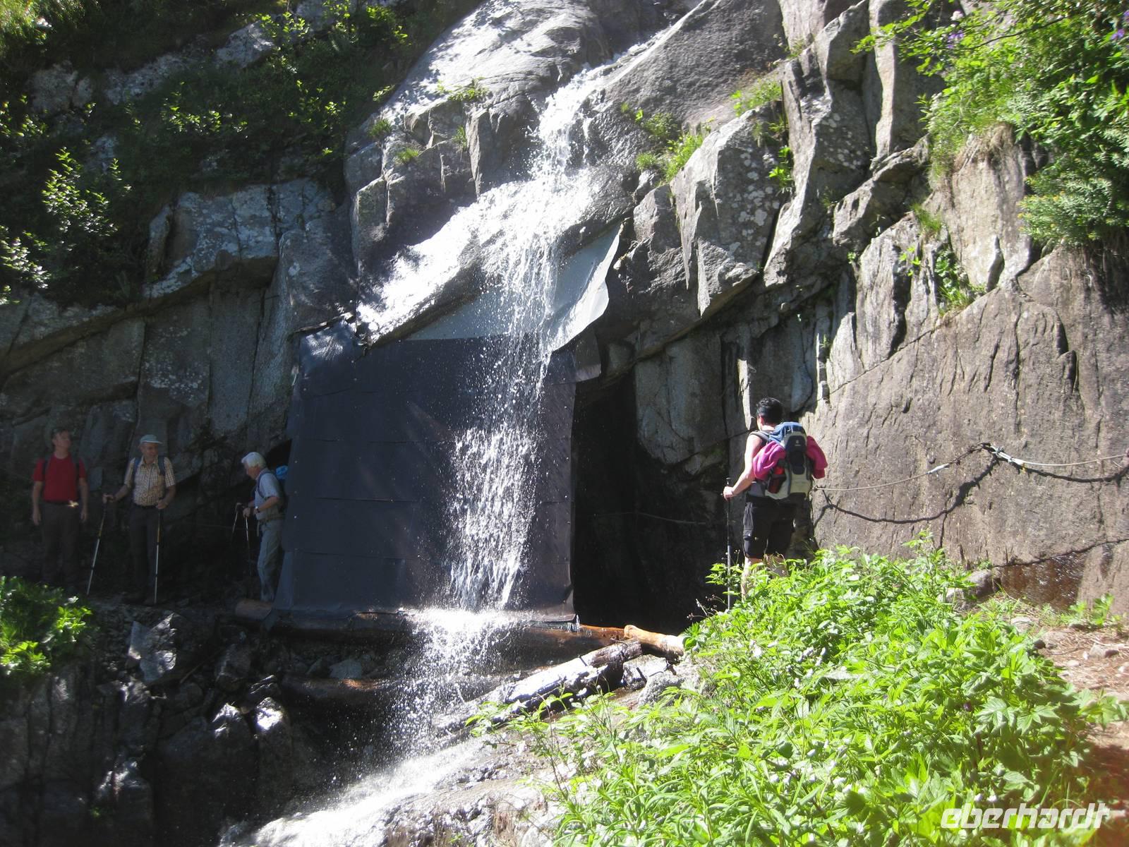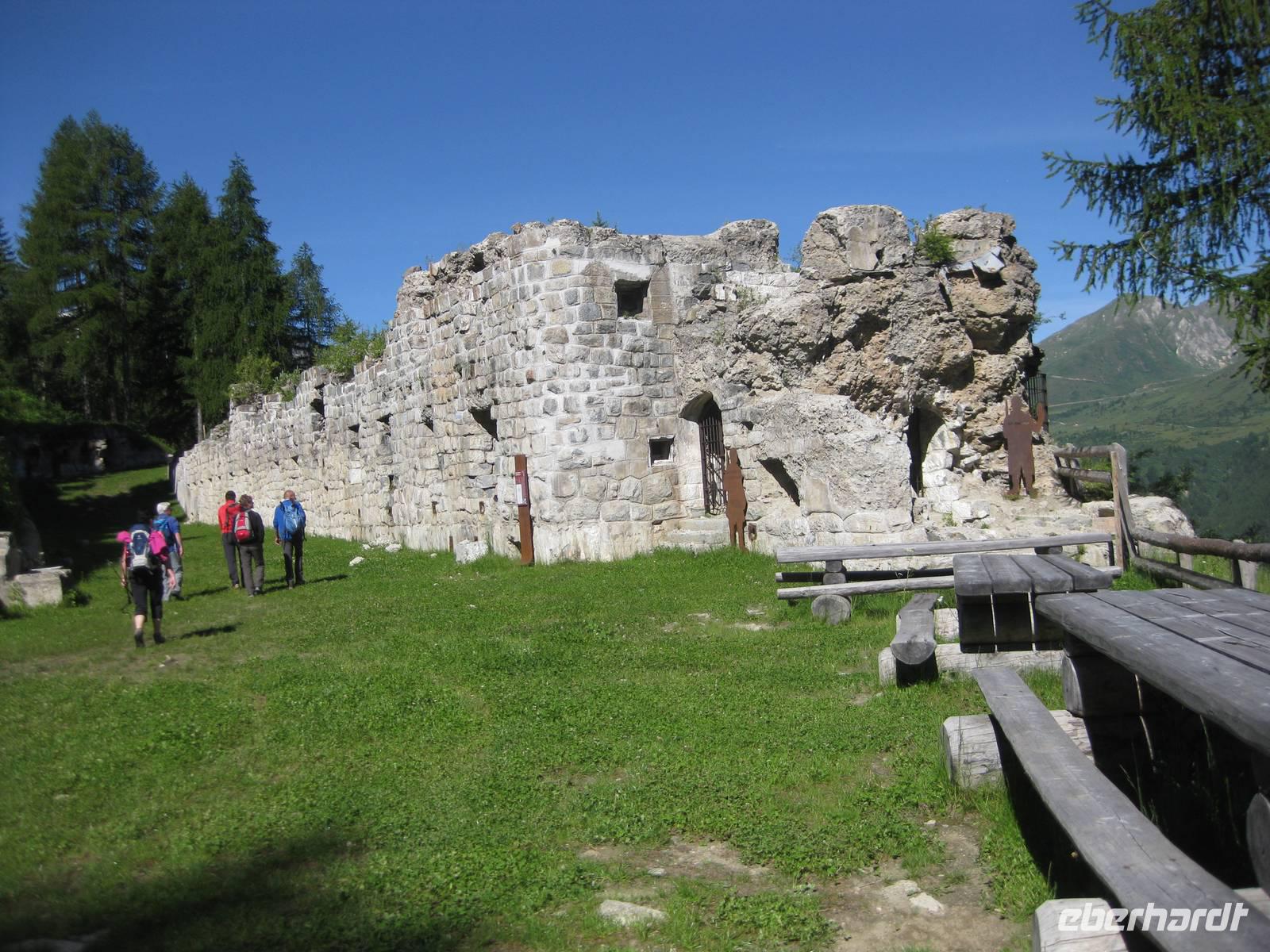 Um 9.30 Uhr erreichen wir den Parkplatz in 1884 m Höhe, laufen zu den Ruinen der Festung vor und genießen die tolle Aussicht über das Tal bis zum Tonale-Pass. Dann starten wir zu unserer Wanderung. Wir laufen zunächst auf einem schmalen, sanft ansteigenden Weg. Dieser bietet einige Überraschungen. Wir müssen durch einen Tunnel, hinter einem Wasserfall entlang - eine kleine Dusche ist da schon möglich und unmittelbar an einem Schneefeld vorbei. Dann geht es steiler über Granitgestein auf der Ostseite des Croz di Stavel nach oben und auf der anderen Seite wacht die gewaltige Nordwand der 3558 m hohen Presanella Bergkette über uns. Wir blicken auf eine atemberaubende wunderschöne Hochgebirgslandschaft mit Gletschern, Schnee- und Geröllfeldern, herabstürzenden Bächen und der typischen Vegetation. Wir können die Schutzhütte schon sehen. Das letzte Stück des Weges ist noch mal eine Herausforderung, es geht noch etwas steiler hinauf und der Weg führt uns über große und kleine Steine, deren Überquerung schon eine gewisse Sportlichkeit erfordert.