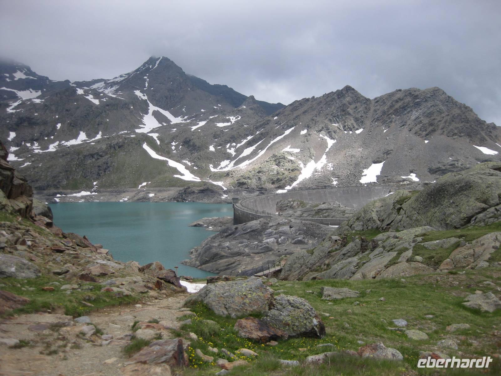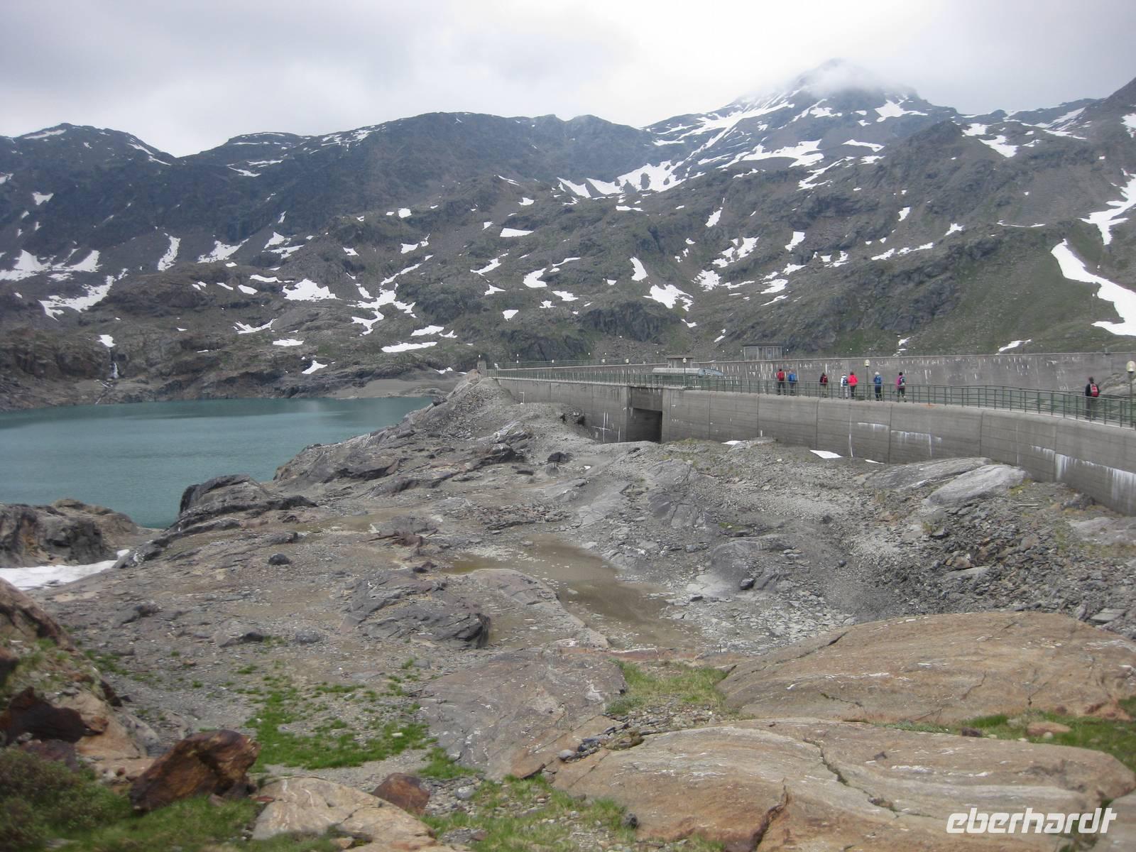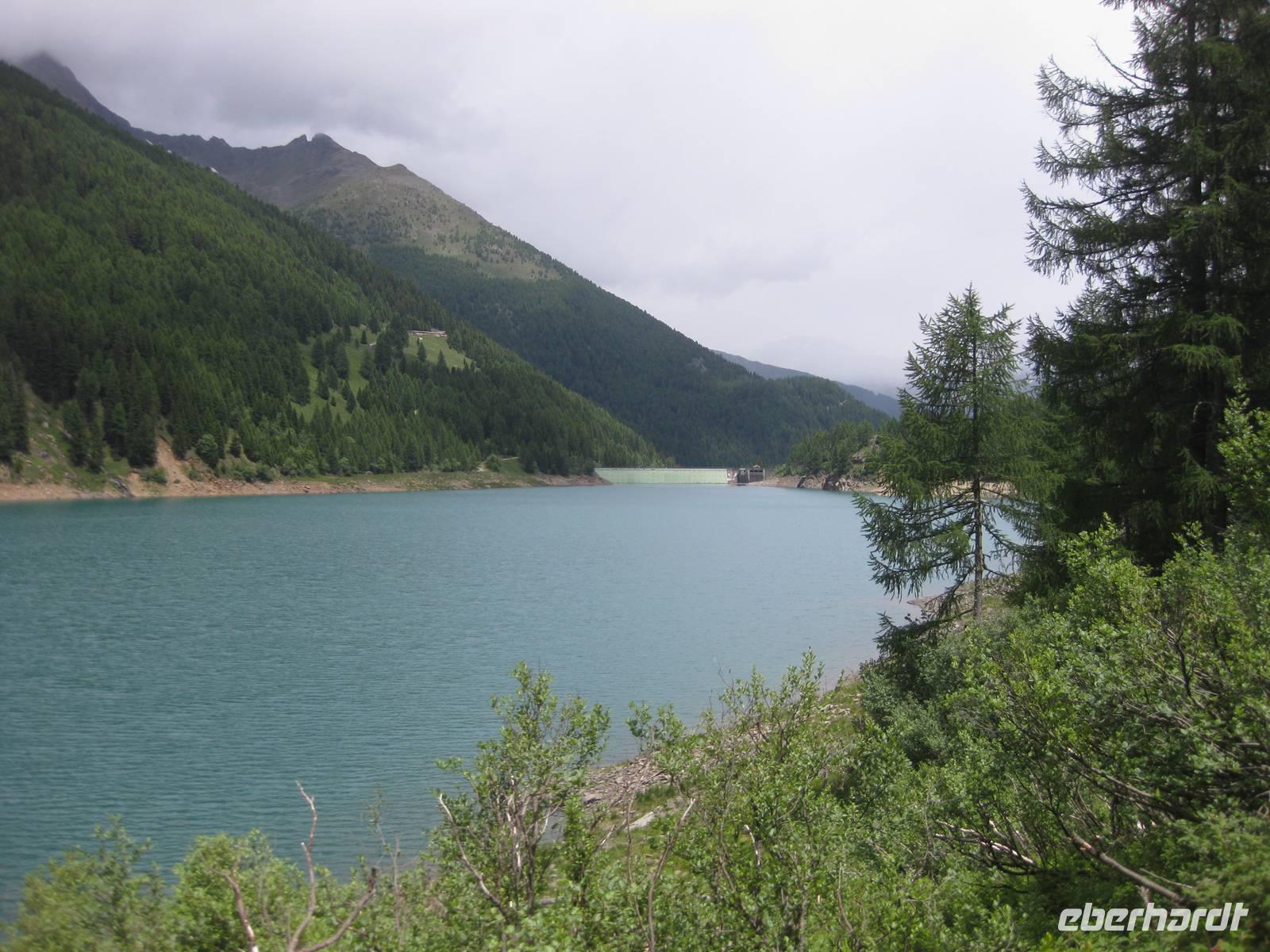 Nach drei Stunden Wanderung erreichen wir die Larcher Hütte in 2607 m Höhe. Hier oben, mit faszinierendem Blick auf den Cevedale-Gletscher, ist es schon ganz schön rauh. In der Hütte machen wir Mittagspause, essen eine leckere Gemüsesuppe, trinken etwas und wer will, kann auch noch etwas Süßes zu sich nehmen. Dann geht es weiter. Wir müssen noch 100 Höhenmeter bezwingen, über Felsgeröll und Schneefelder, dann haben wir den höchsten Punkt unserer heutigen Wanderung erreicht und über den Grat hinweg geht es auch schon wieder ein ganz klein wenig abwärts zum Lago Marmotta, einem der fünf Seen, die heute an unserem Weg liegen. Ein kurzer Halt, um den Blick auf die umliegenden Berge mit ihren Schneefeldern und Gletschern zu genießen. Das ist schon gewaltig. In der Ferne hören wir die Murmeltiere pfeifen "Vorsicht, Touristen!". Dann geht es weiter. Vorerst so ziemlich in einer Höhe mit wunderschönen Blicken auf die Berge und Täler rundherum bis wir den kleineren Lago Nero erreichen. Und gleich in unmittelbarer Nähe befindet sich der viel größere Stausee Lago del Careser (2603 m). Zur Zeit ist er nicht sehr voll. Wir laufen über die Staumauer und dann geht es auf einem kurvenreichen Bergweg wieder hinab bis zum ersten Stausee, wo die ausgebaute Forststraße beginnt, die wir heute morgen herauf gekommen sind. 17.30 Uhr sind wir wieder an Italos Auto, Martina ist auch schon da. Wir fahren zurück zum Hotel.