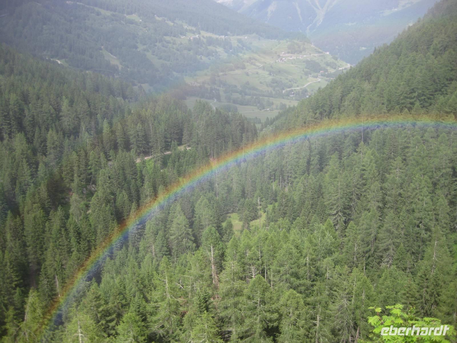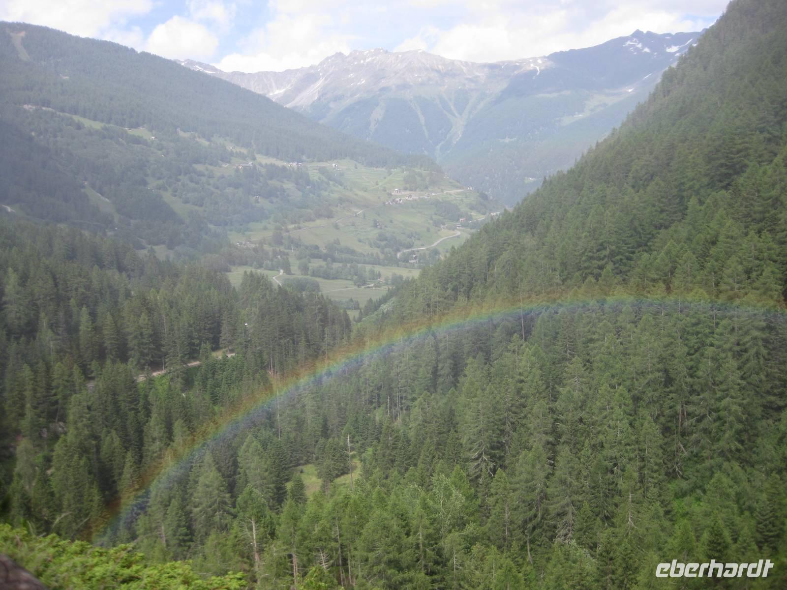 Wir steigen bis zu einer Höhe von 1960 Meter hinauf und überwinden heute ca. 400 Höhenmeter. Auf unserer Wanderung kommen wir auch an verschiedenen Stellen vorbei, wo es noch Spuren vom ersten Weltkrieg 1913 - 1918 gibt. Hier in den Bergen tobten damals harte Kämpfe an der nahe gelegenen Front "guerra bianca", dt. "weißer Krieg", übertragen für Hochgebirge. Das ist sehr interessant, denn dazu wussten wir bisher fast nichts. Auf unserem Weg bieten sich auch immer wieder tolle Ausblicke auf die umliegende Bergwelt, in's Tal hinab und auf den Pian-Palu-Stausee. Die Berge hüllen sich immer wieder mal in Wolken, die sich dann dort oben auch entleeren. Wir hier unten bekommen davon nichts ab. Bei uns scheint sogar die Sonne. Wir wandern eine Runde um den Stausee herum. Dann erreichen wir die "Eisenquelle". In der Hütte daneben machen wir eine längere Rast. Wir stärken uns für die letzte Etappe unserer Wanderung. Und dann nehmen wir den Abstieg in Richtung Parkplatz. Der Weg führt uns ganz sanft im Wald entlang. Wir kommen noch zu einer Festungsruine aus dem ersten Weltkrieg. Wir steigen hinauf und dort erwischt uns dann doch ein kurzer Regenschauer. Und wir bekommen einen phantastischen Regenbogen zu sehen - ein tolles Naturschauspiel. 16.30 Uhr treffen wir wieder auf dem Parkplatz ein. Tiziano, der Chef unseres Hotels, kommt mit seinem "Ferrari", einem schicken Fiat Panda zur Unterstützung von Italo und bringt uns mit zum Hotel.