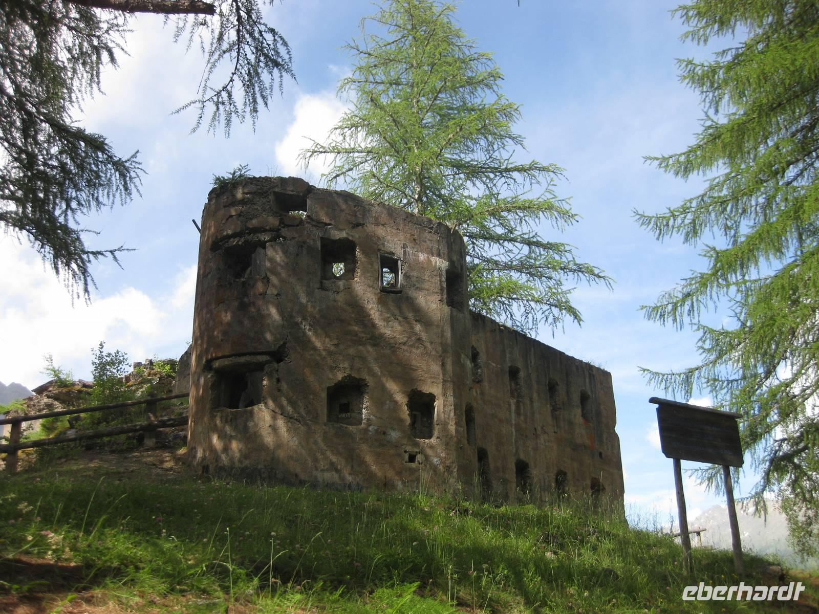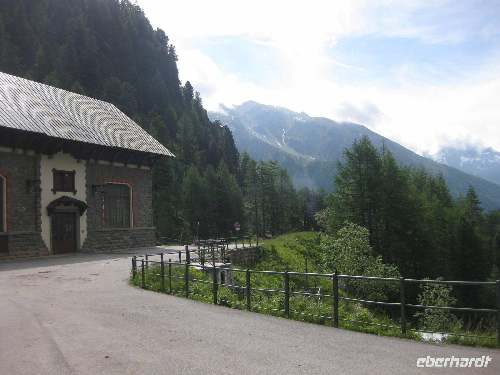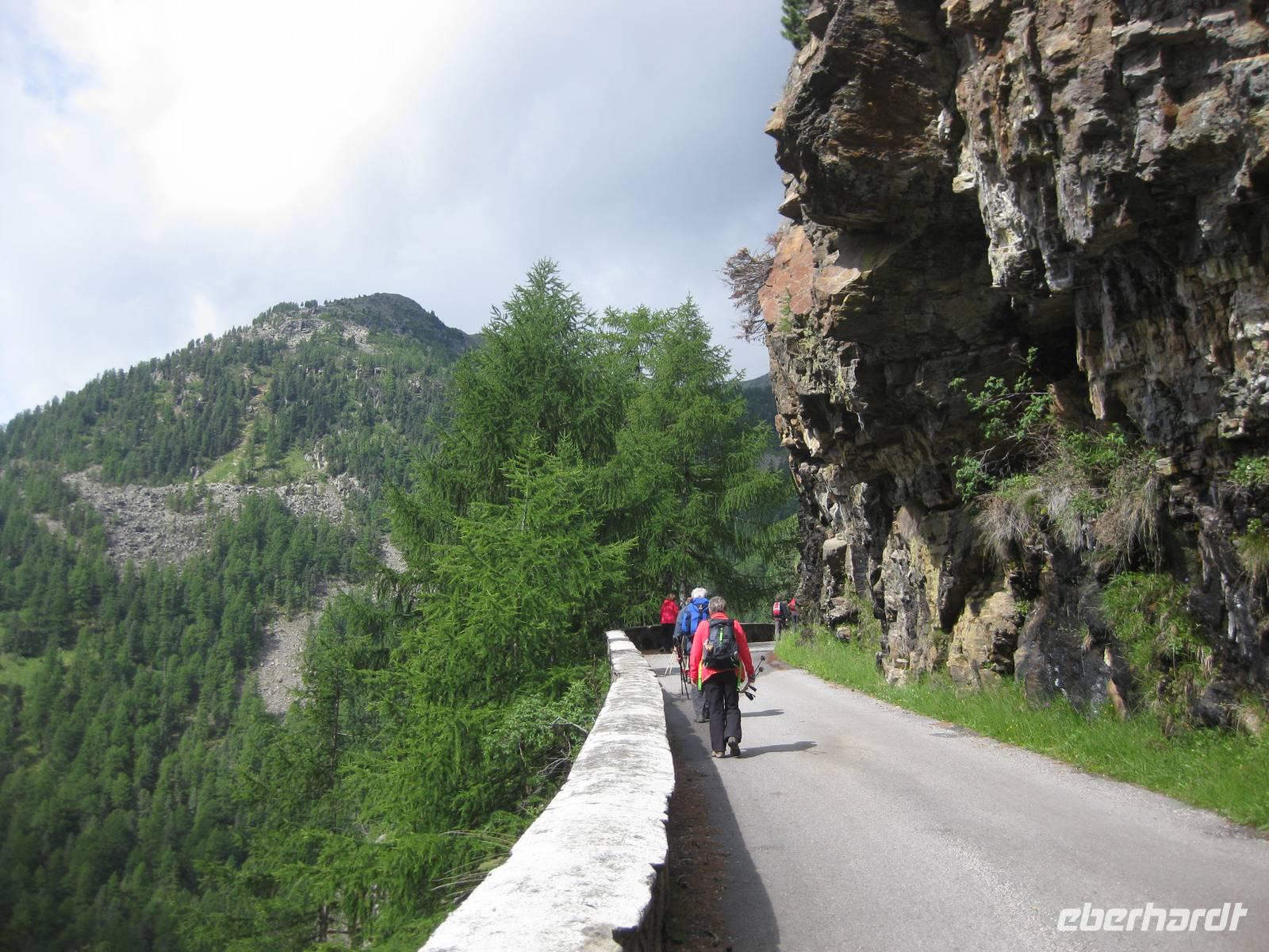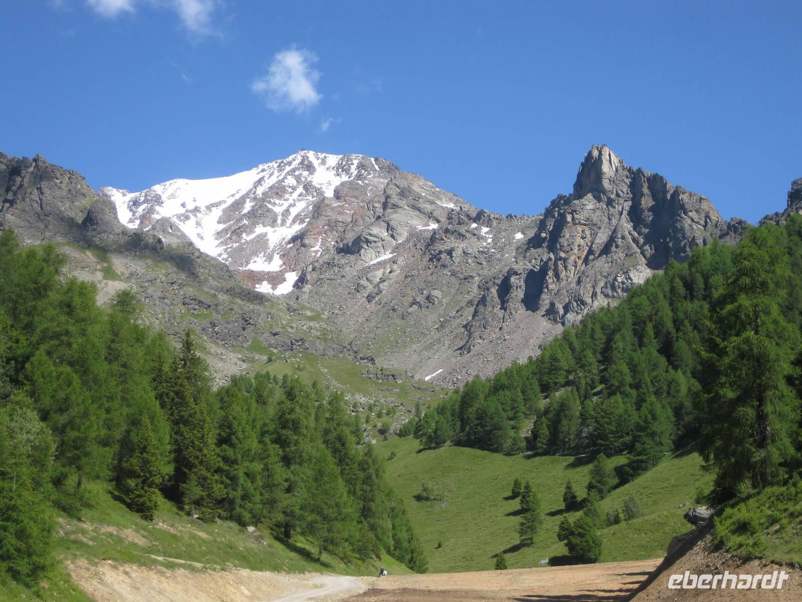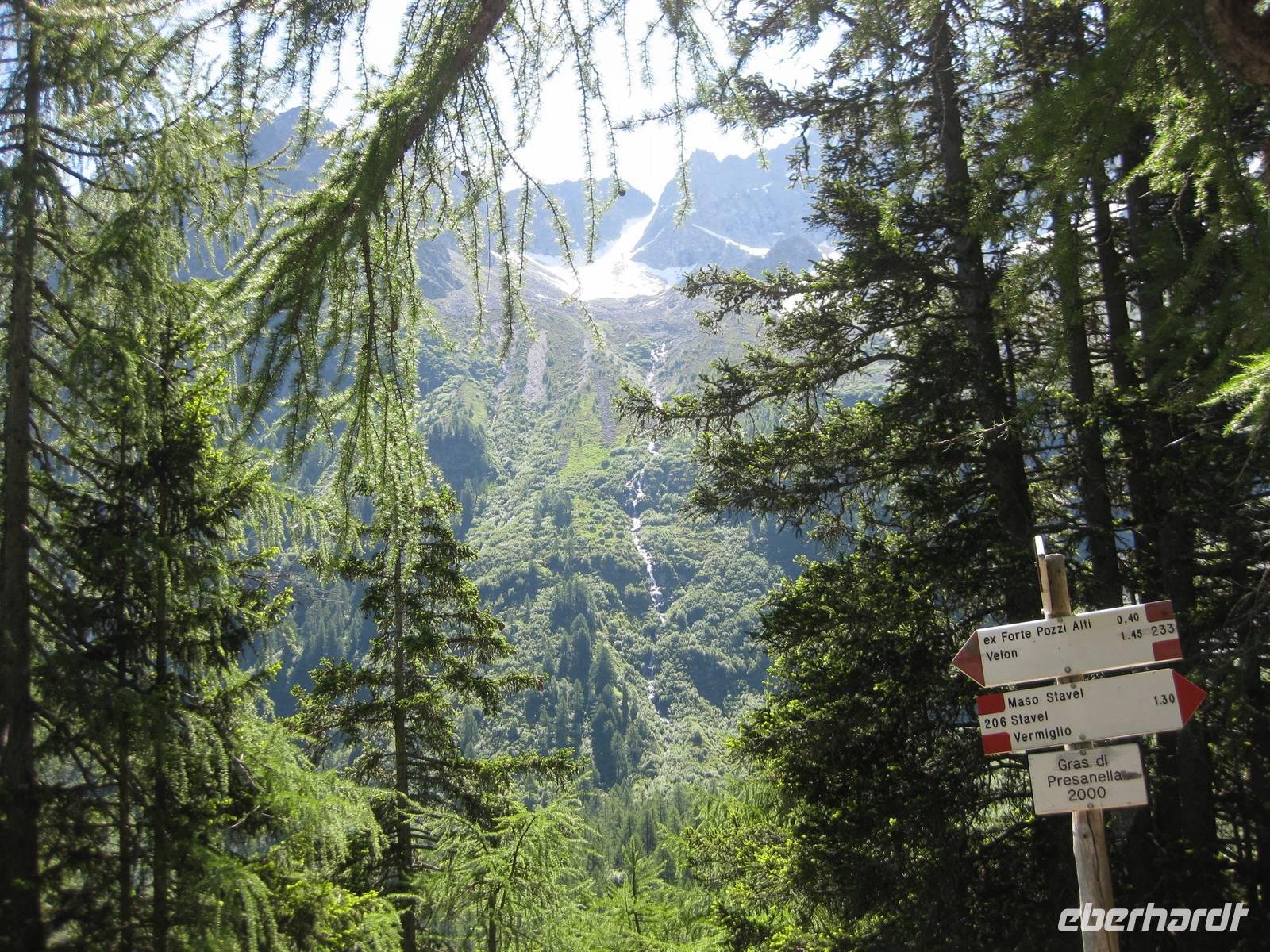 Wir fahren bis Ossana, biegen dort auf die Straße, die zum Tonale-Pass führt, fahren durch Vermiglio und biegen dann in Richtung Stavel ab. Wir fahren die Forststraße hinauf bis zum Parkplatz an der Kriegsstellung Forte Presanella in 1884 m Höhe. Die Fahrt bis dahin ist schon ein kleines Abenteuer: eine schmale Forststraße mit vielen engen Kurven durch den Wald, ab und zu bietet sich ein toller Blick in's Tal hinab und auch hinauf zur Nordwand der Presanella Bergkette. Zum Glück kommt uns kein Auto entgegen, denn es gibt nicht viele Stellen zum Ausweichen.