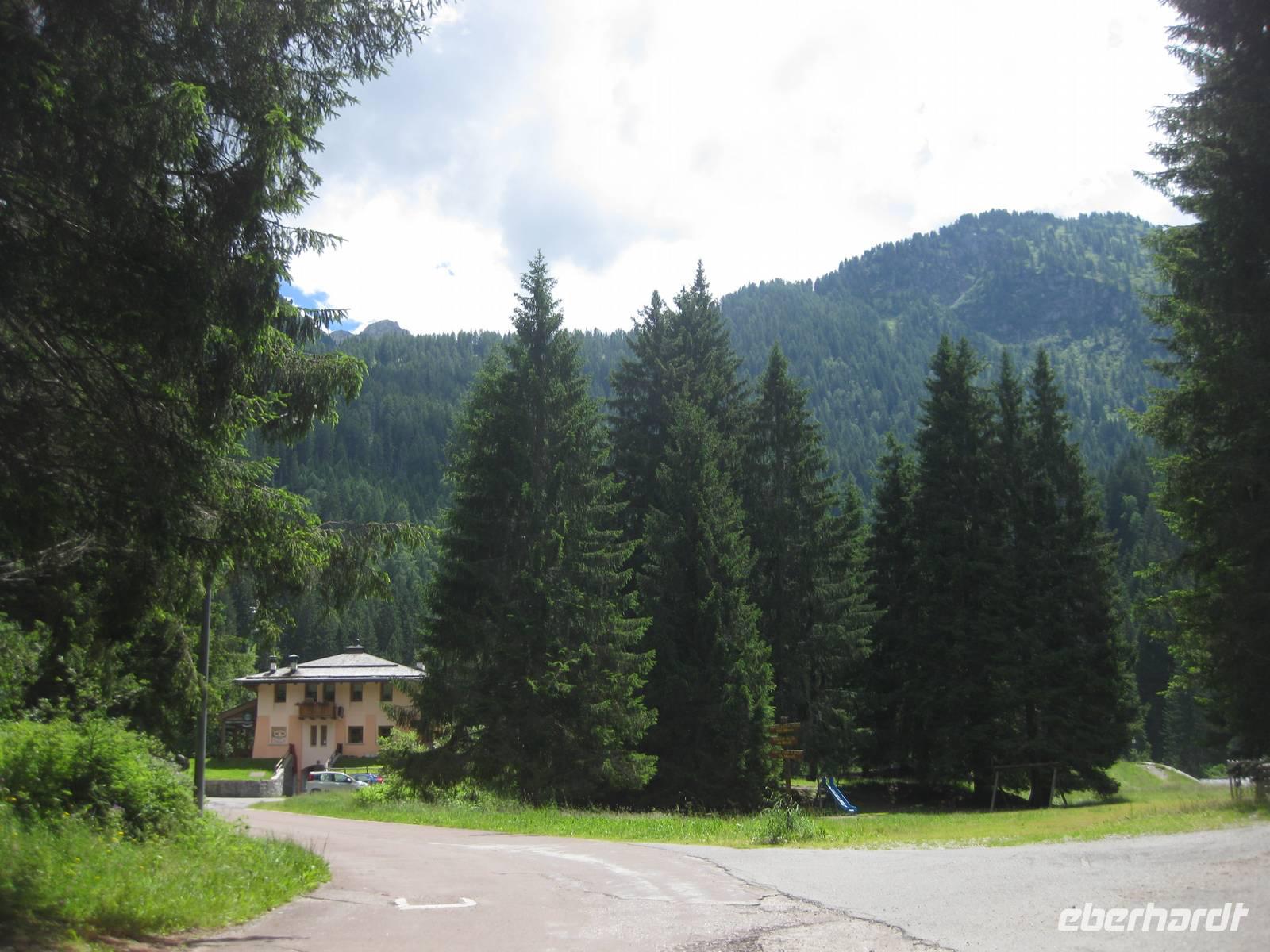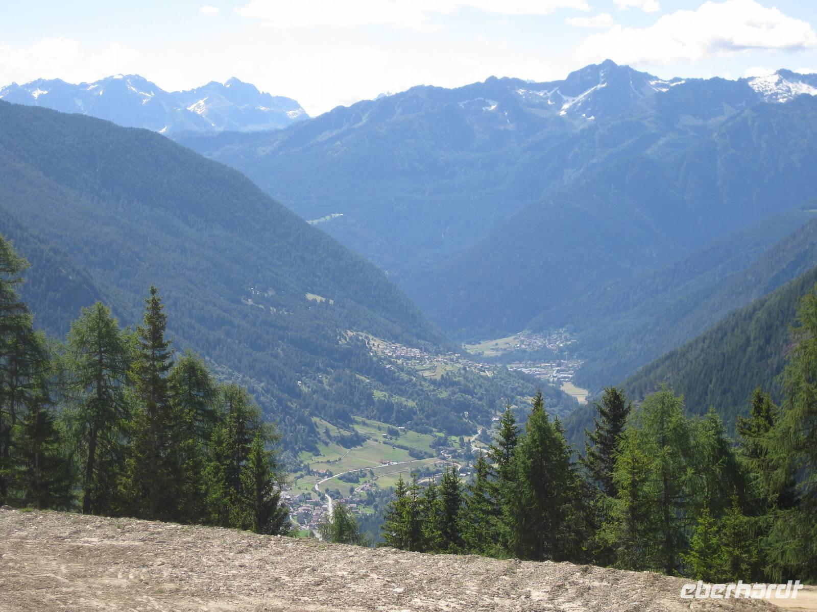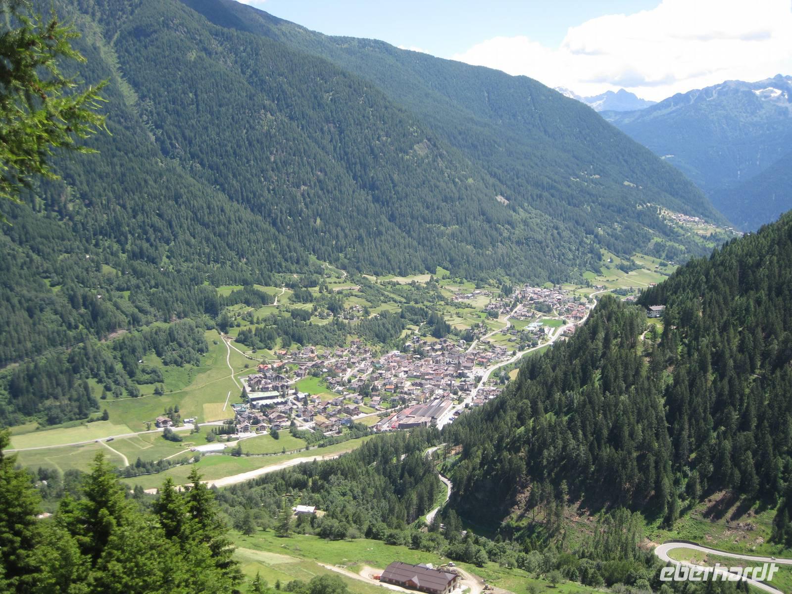 Für den Rückweg nehmen wir wieder einen Weg durch den Wald. Jetzt trübt es sich doch noch etwas ein und wir werden nass. Aber auch dafür sind wir gerüstet. Jeder hat in seinem Rucksack einen Schirm oder eine Regenjacke. Wir laufen bis in den Ort, Martina ist schon voraus geeilt und kommt uns mit dem Bus entgegen. Wir fahren wieder in Richtung Cogolo, das in einem anderen Tal liegt. Und siehe da, hier ist es trocken und die Sonne scheint.