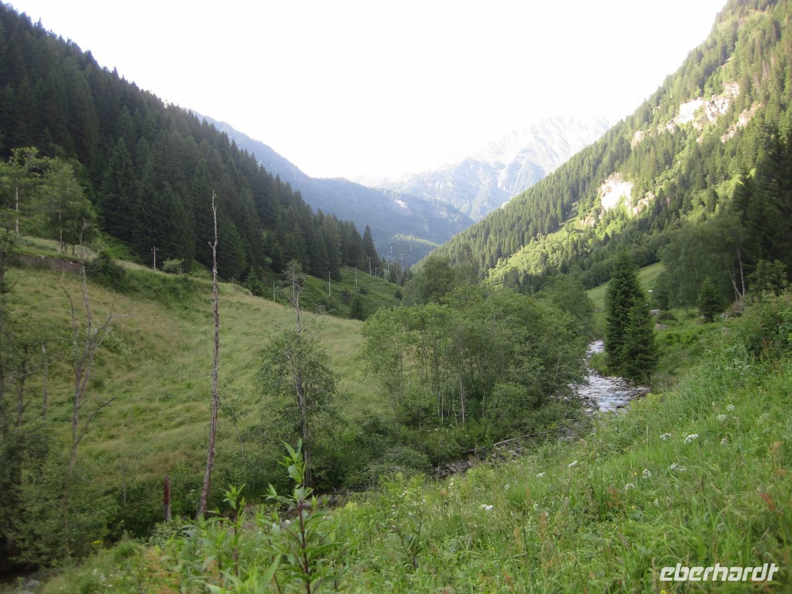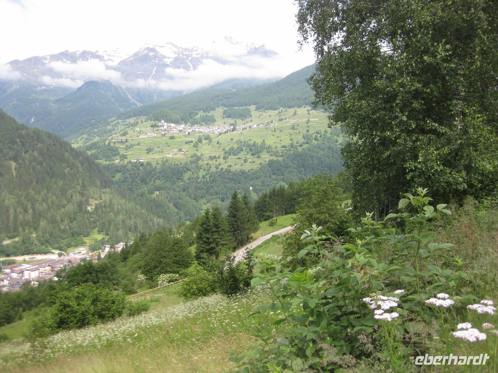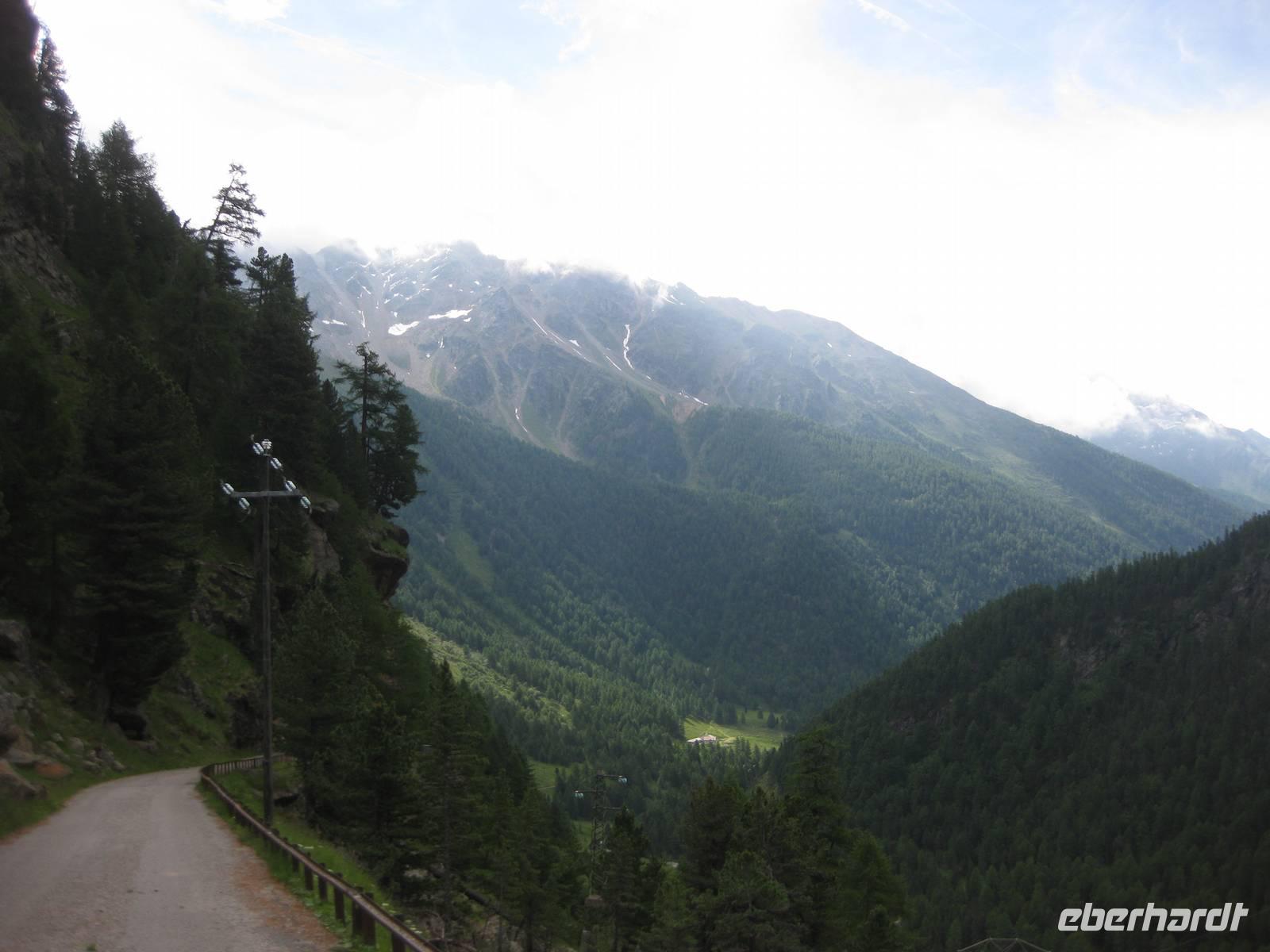 Für den Rückweg nehmen wir wieder einen Weg durch den Wald. Jetzt trübt es sich doch noch etwas ein und wir werden nass. Aber auch dafür sind wir gerüstet. Jeder hat in seinem Rucksack einen Schirm oder eine Regenjacke. Wir laufen bis in den Ort, Martina ist schon voraus geeilt und kommt uns mit dem Bus entgegen. Wir fahren wieder in Richtung Cogolo, das in einem anderen Tal liegt. Und siehe da, hier ist es trocken und die Sonne scheint.