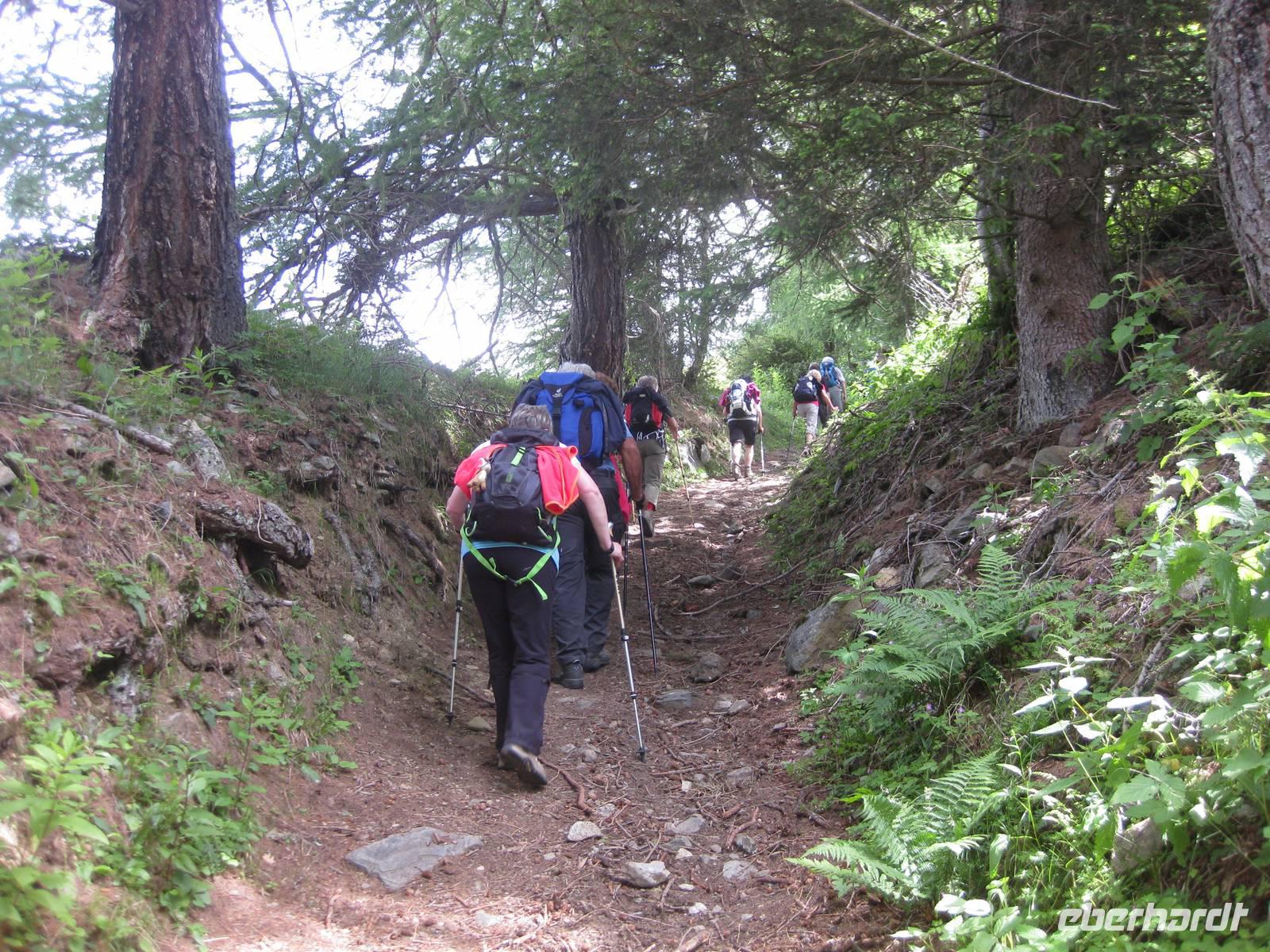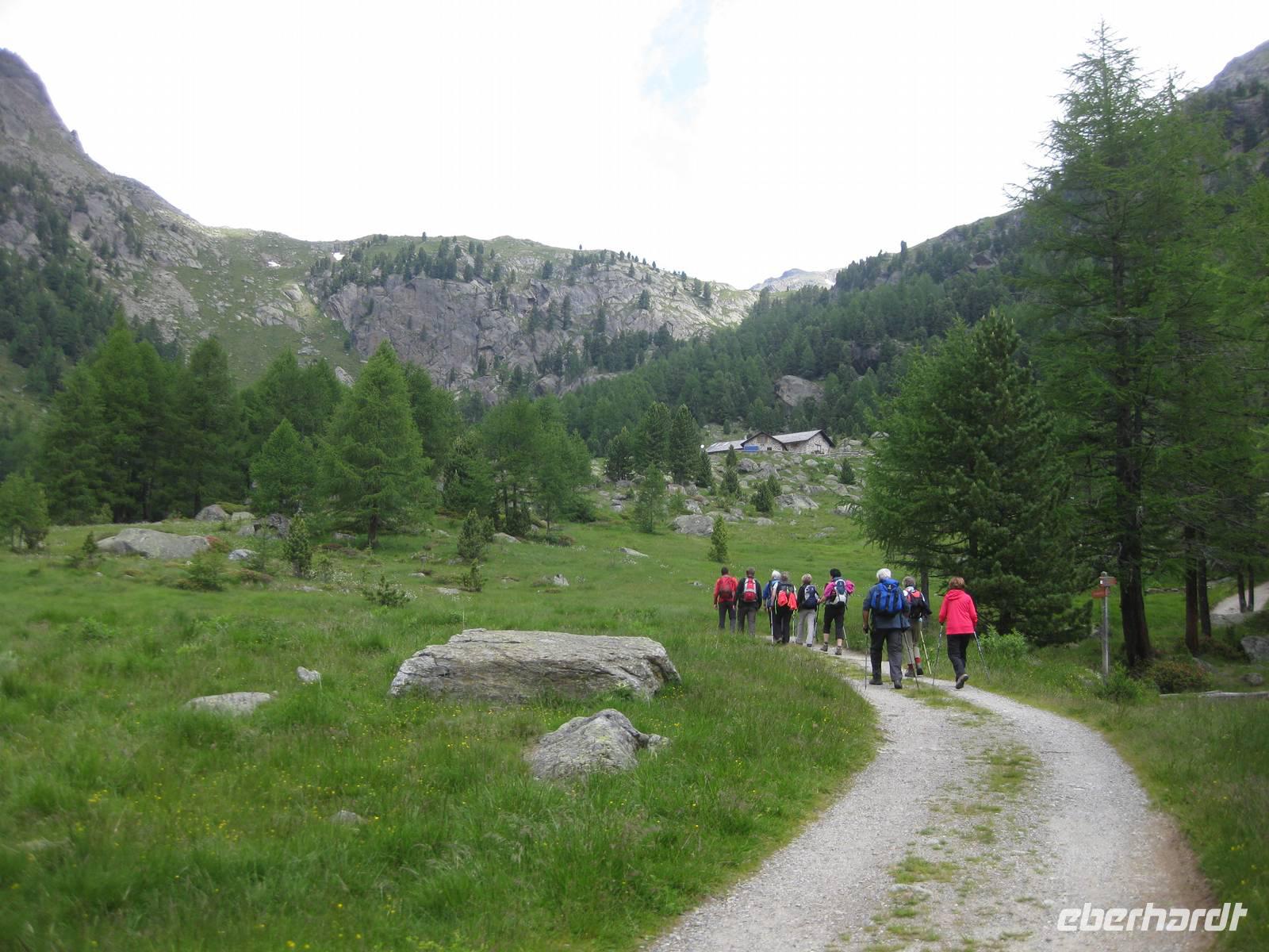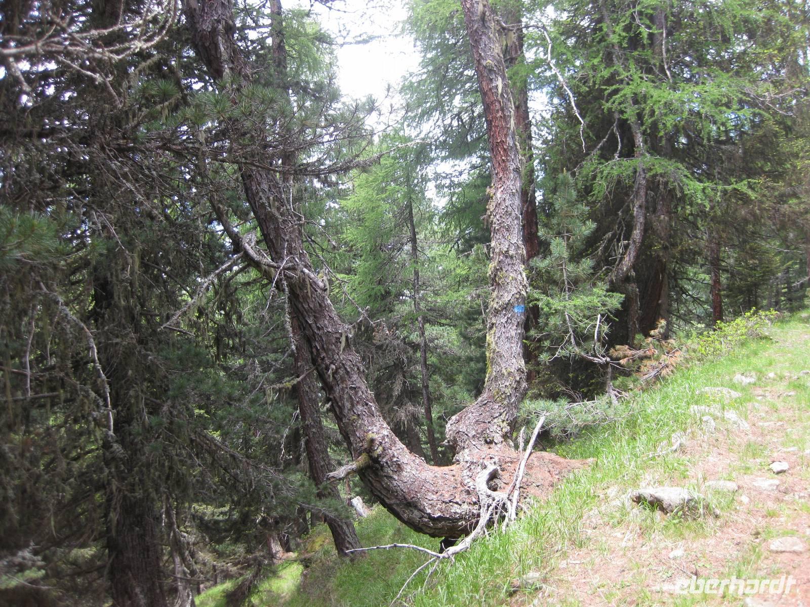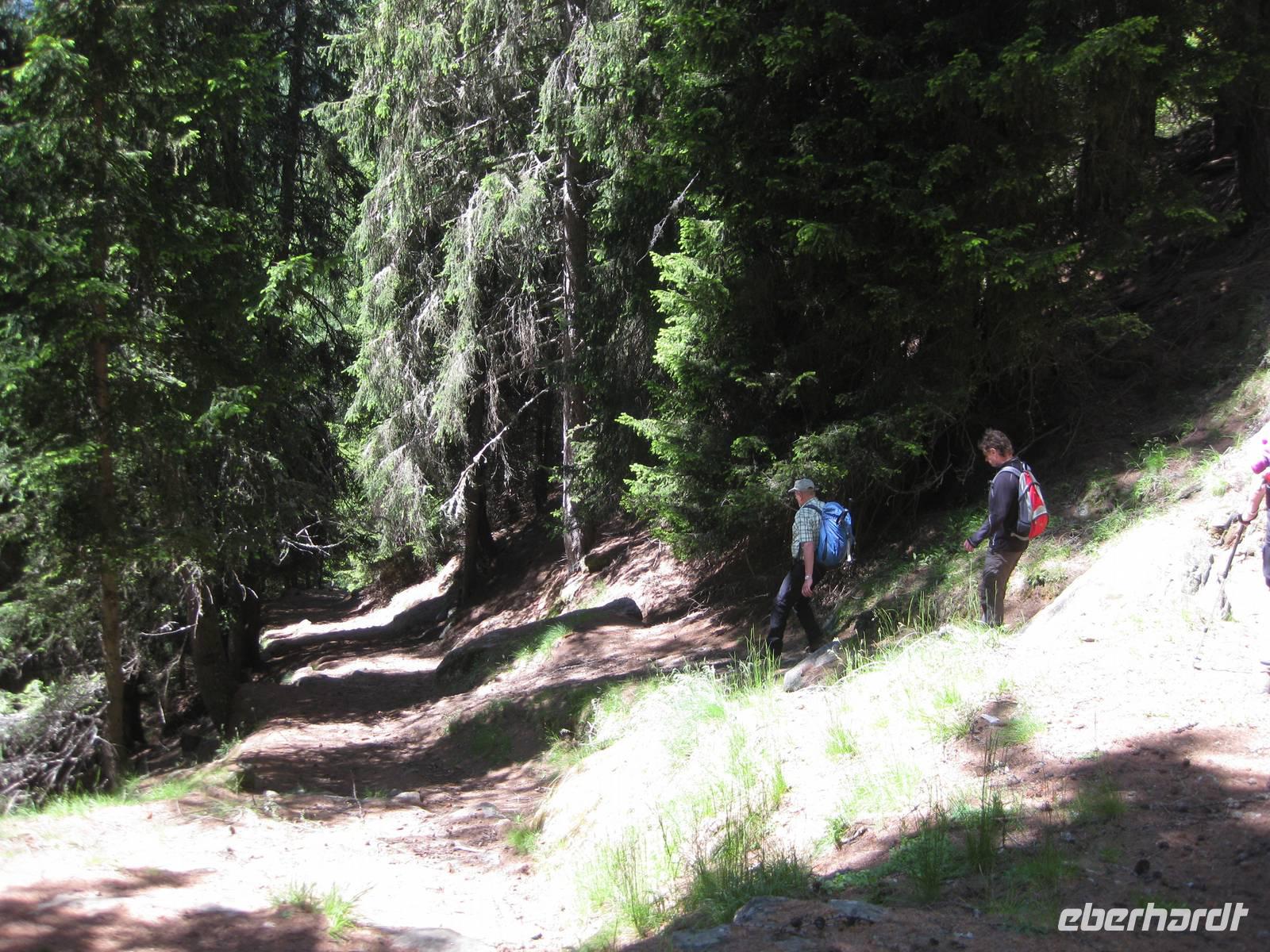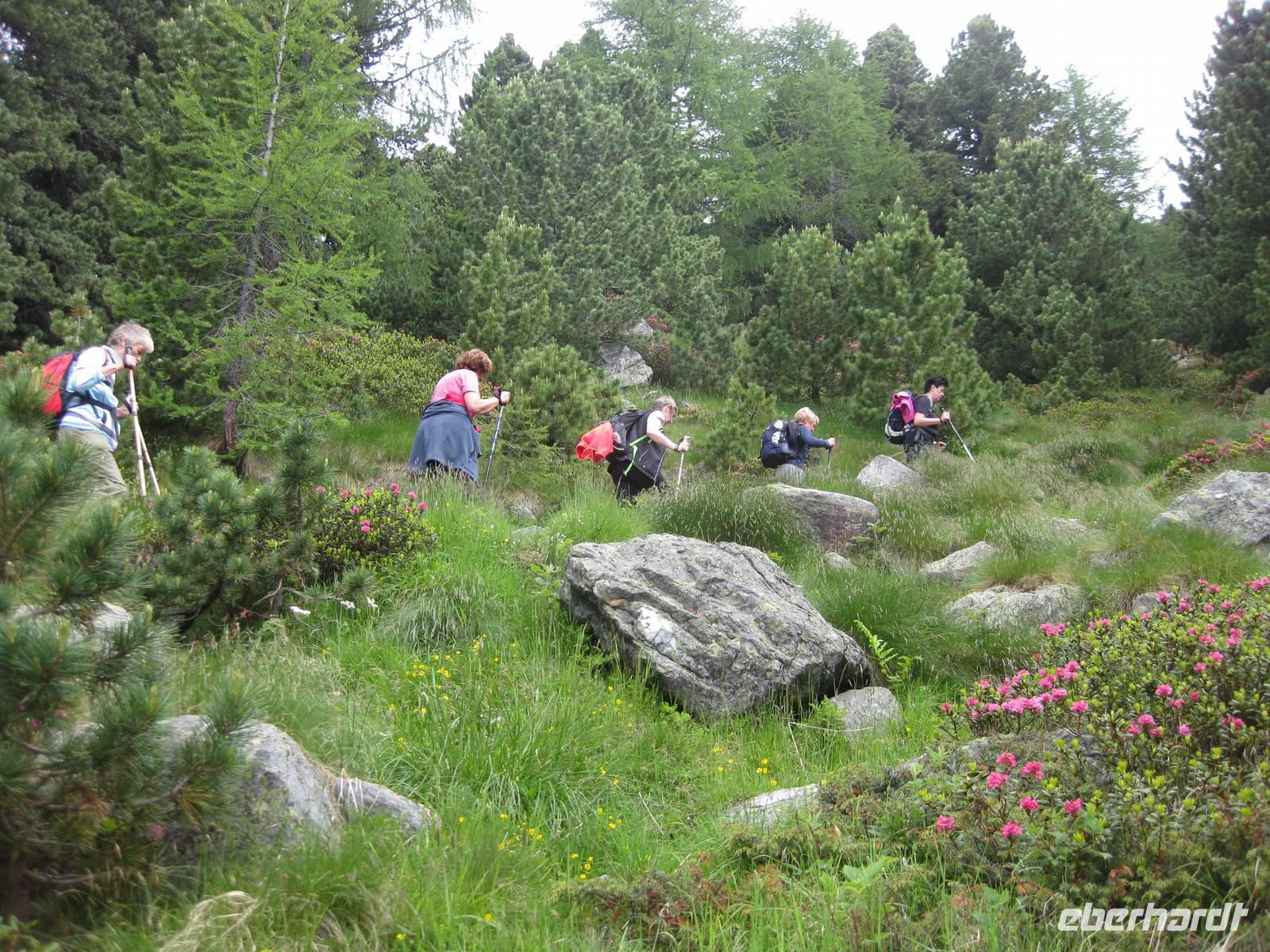 Los geht es. Wir laufen auf einem Forstweg bergauf durch den Wald. Unterwegs erklärt uns Italo die Landschaft, die Gesteine, die Vegetation. Hier wachsen besonders viele Lärchen, die sich dem Klima im Laufe der Jahrhunderte angepasst haben. So können wir auch einige Exemplare bewundern, die älter als 100 Jahre sind.
