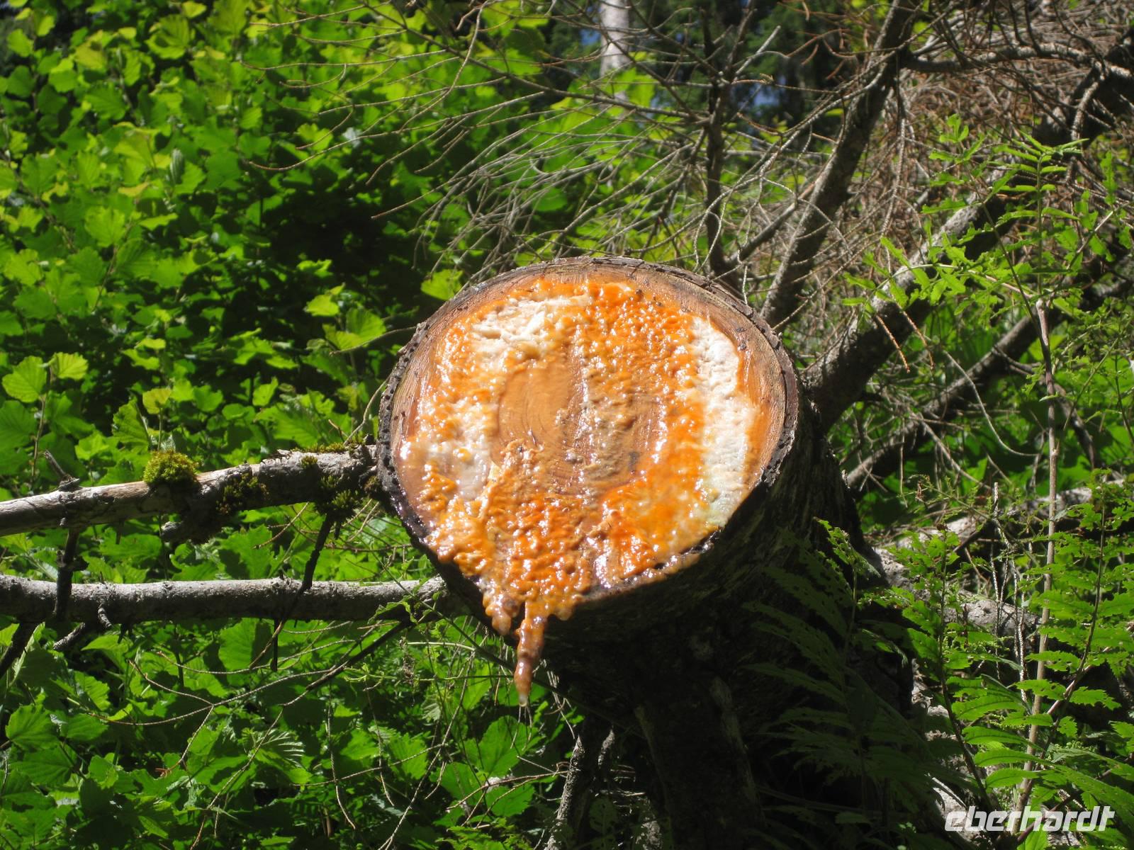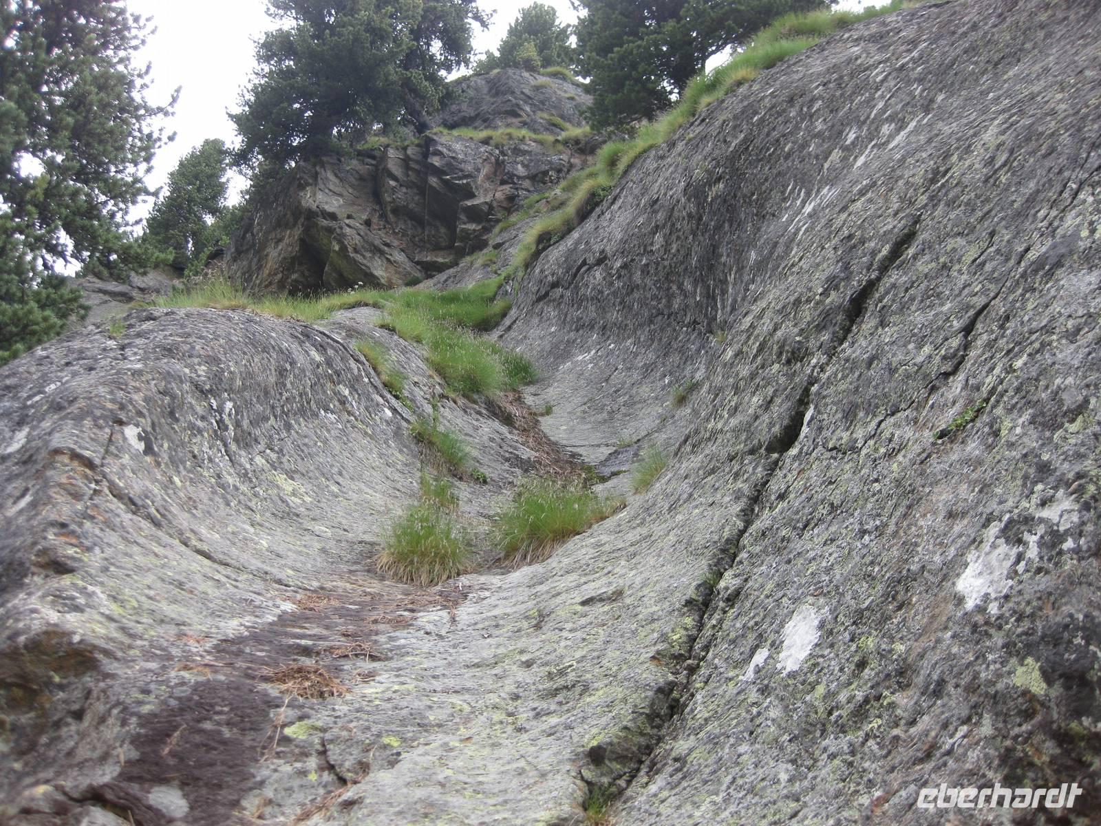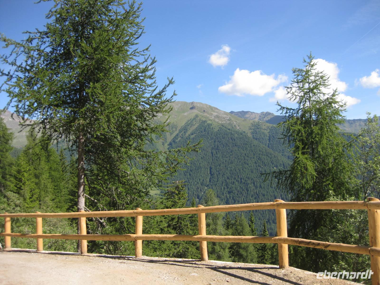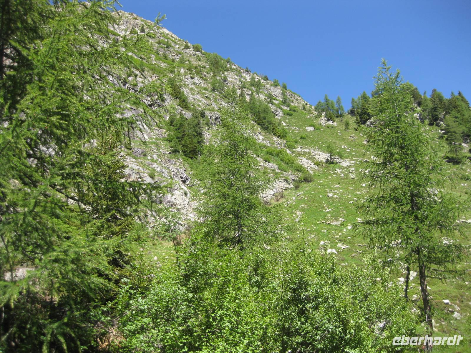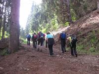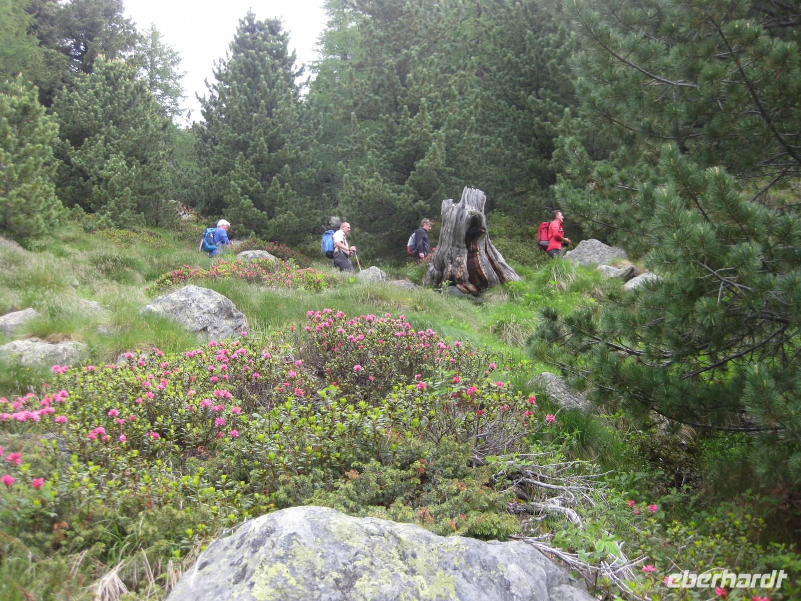 Los geht es. Wir laufen auf einem Forstweg bergauf durch den Wald. Unterwegs erklärt uns Italo die Landschaft, die Gesteine, die Vegetation. Hier wachsen besonders viele Lärchen, die sich dem Klima im Laufe der Jahrhunderte angepasst haben. So können wir auch einige Exemplare bewundern, die älter als 100 Jahre sind.