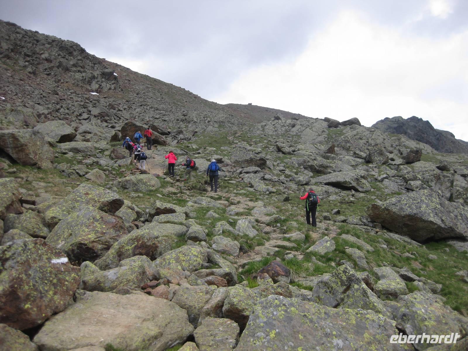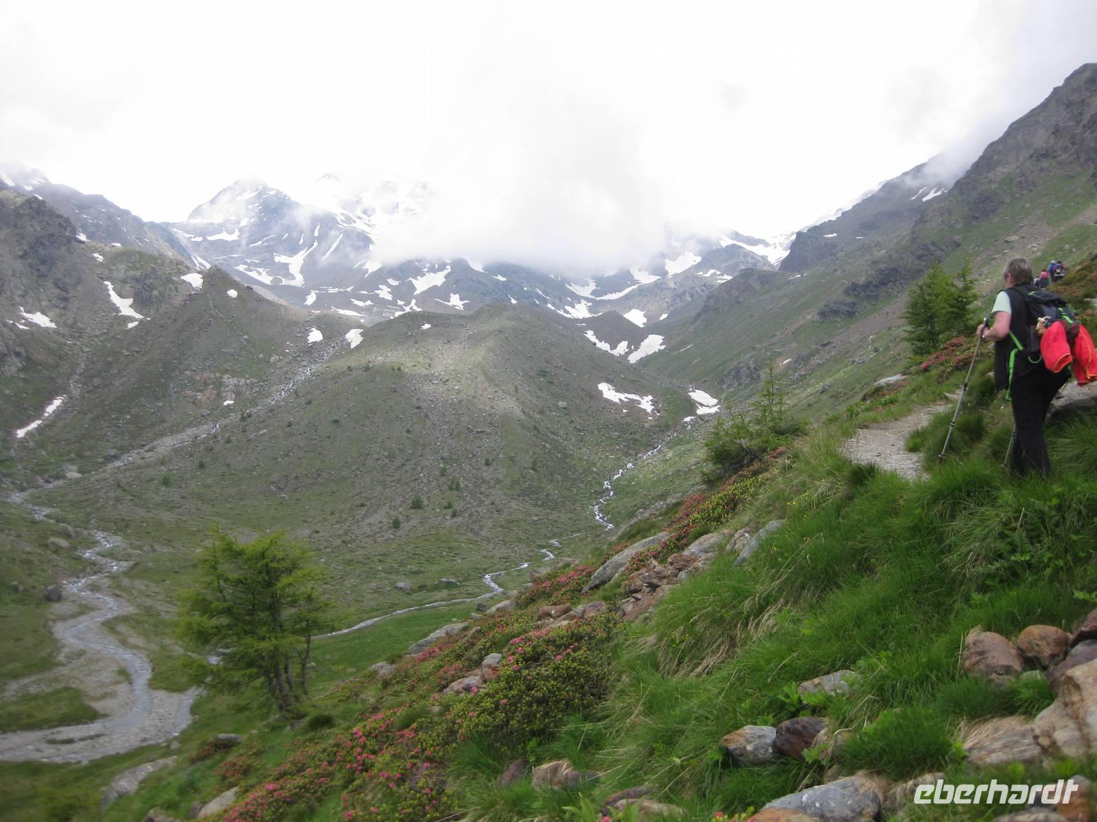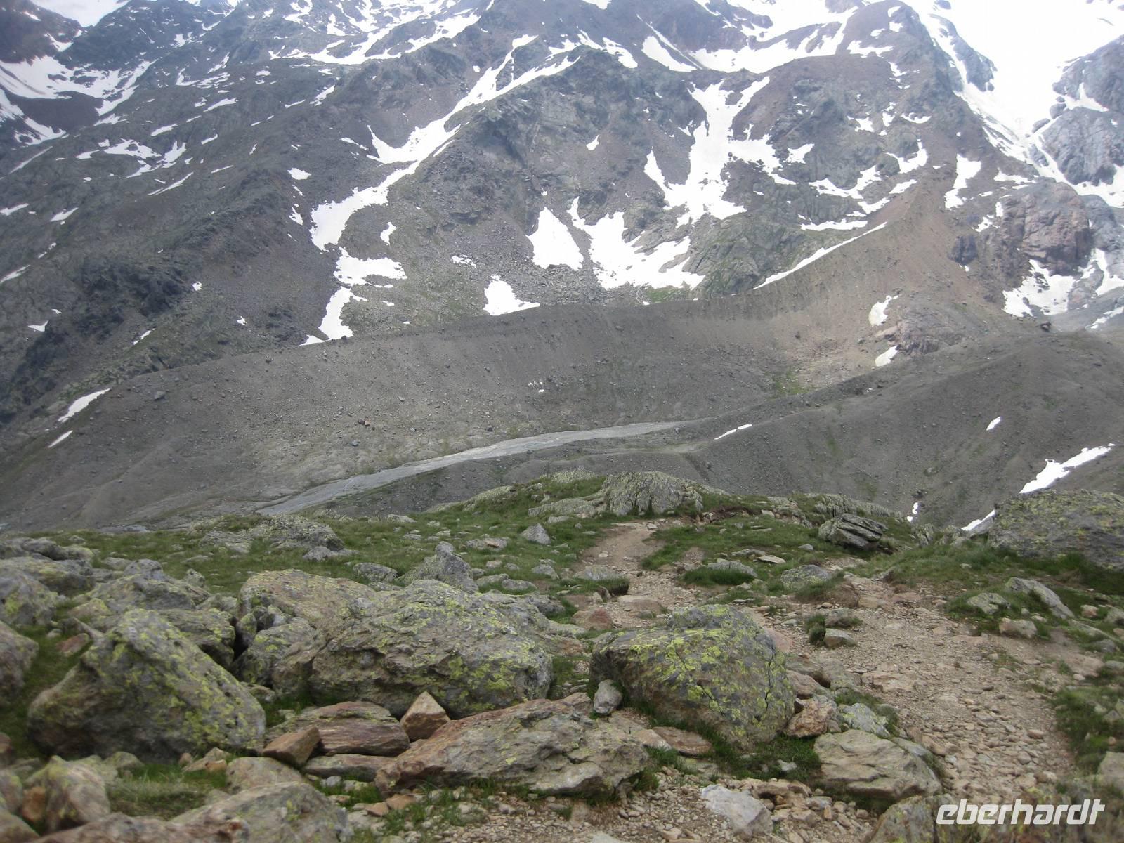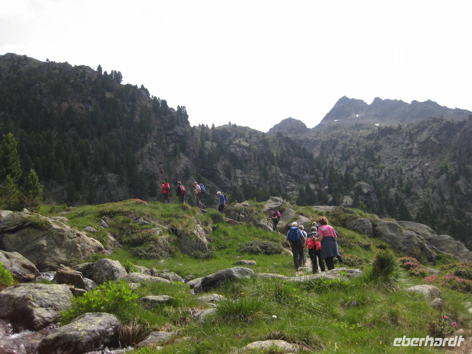 Auf geht's. Erst einmal eine ausgebaute Forststraße bis hinauf zum ersten Stausee. Wir passieren die Malga Mare in fast 2000 m Höhe. Dann geht es auf schmaleren, zum Teil steinigen Wanderwegen, mal leichter und mal steiler bergauf. Wir sind jetzt im Stilfserjoch Nationalpark unterwegs. Noch ist Vegetation vorhanden. Blauer niedriger Enzian und viele andere bunte Gebirgsblumen am Wegesrand erfreuen uns Wanderer. Wir überqueren die Ebene Pozza di Venezia. Hier gibt es noch Latschenkiefern und Gras und viele kleine Gebirgsbächlein. Bald kommen wir in ein Moränental und erblicken in der Ferne ziemlich weit oben unser erstes Ziel, die Larcher Hütte. Hier gibt es kaum noch Vegetation, nur niedrige Pflanzen wie Alpenrosen, Gebirgsblumen, Gras und Moos. Und man kann so richtig die früheren Spuren des Gletschers verfolgen. Der Weg oder besser Pfad geht in halber Höhe entlang und immer bergauf, einmal etwas mehr und einmal etwas weniger.