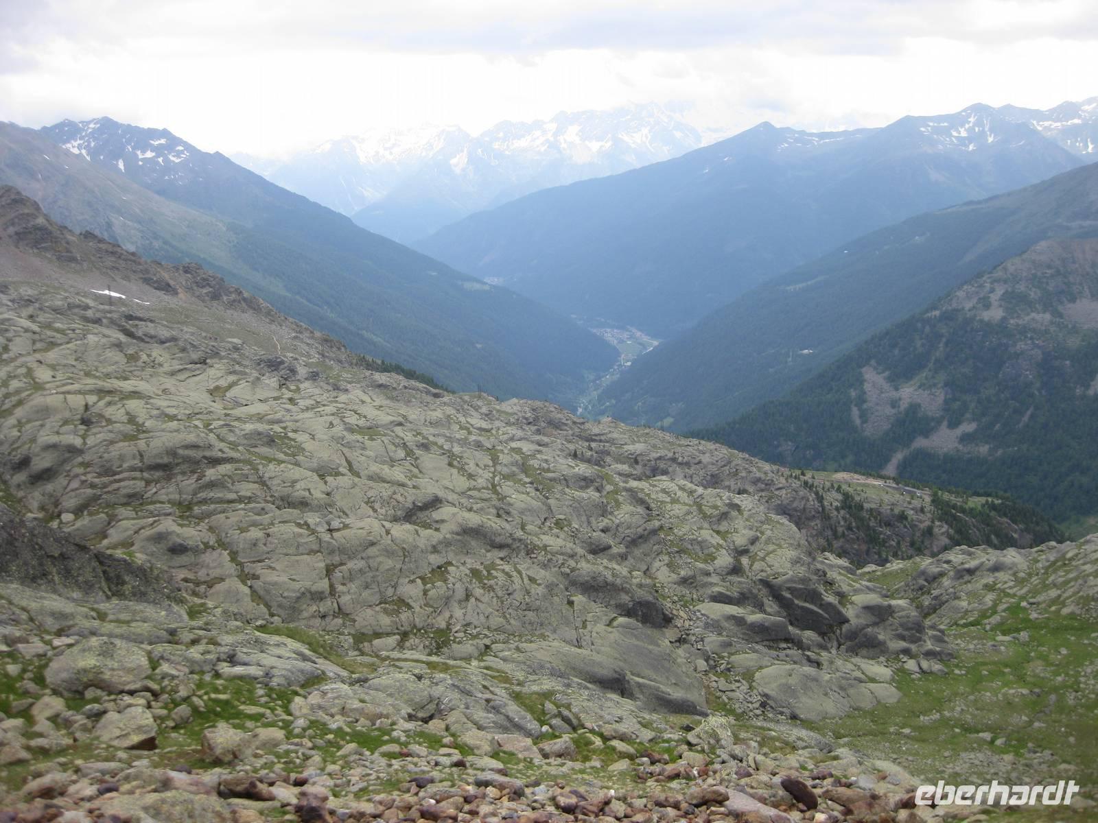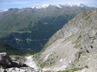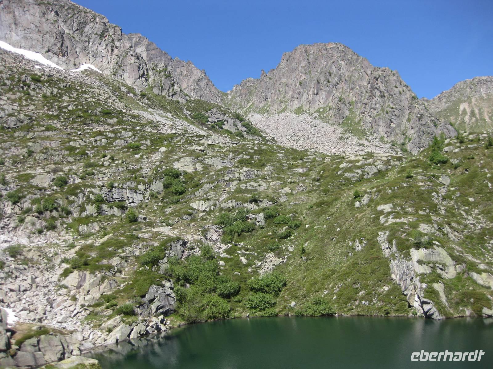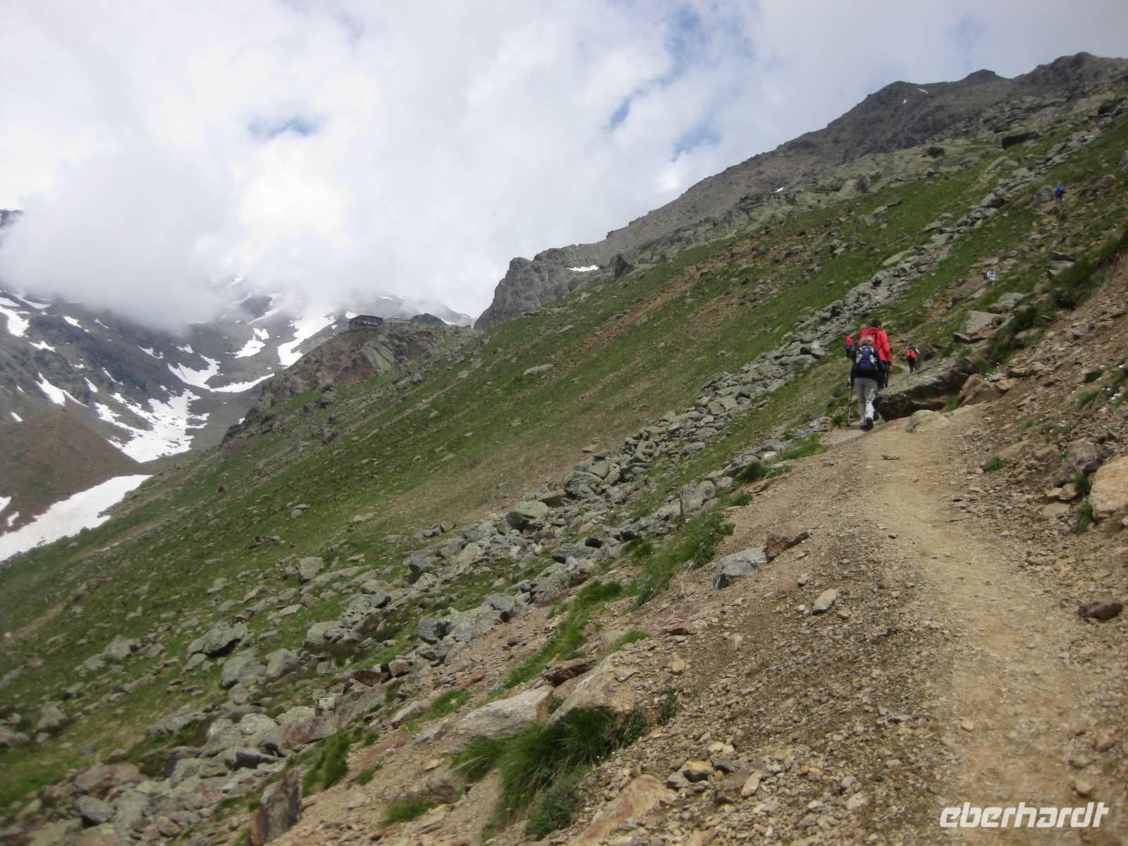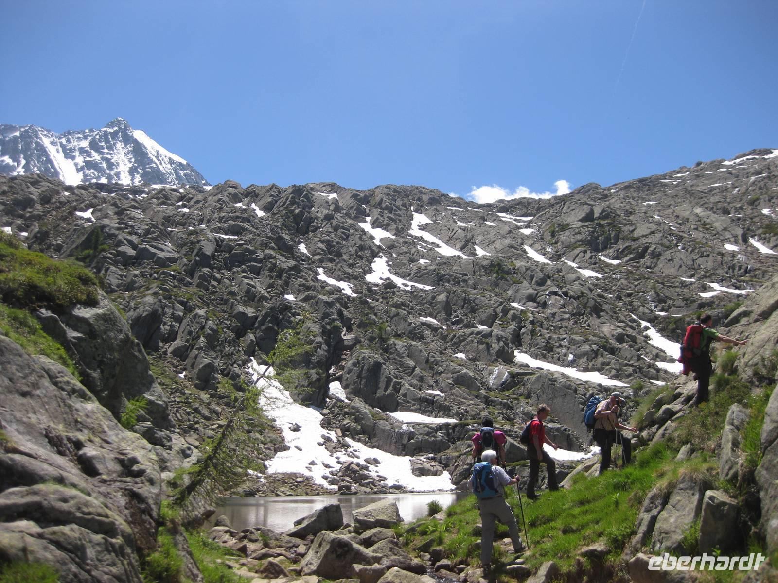 Auf geht's. Erst einmal eine ausgebaute Forststraße bis hinauf zum ersten Stausee. Wir passieren die Malga Mare in fast 2000 m Höhe. Dann geht es auf schmaleren, zum Teil steinigen Wanderwegen, mal leichter und mal steiler bergauf. Wir sind jetzt im Stilfserjoch Nationalpark unterwegs. Noch ist Vegetation vorhanden. Blauer niedriger Enzian und viele andere bunte Gebirgsblumen am Wegesrand erfreuen uns Wanderer. Wir überqueren die Ebene Pozza di Venezia. Hier gibt es noch Latschenkiefern und Gras und viele kleine Gebirgsbächlein. Bald kommen wir in ein Moränental und erblicken in der Ferne ziemlich weit oben unser erstes Ziel, die Larcher Hütte. Hier gibt es kaum noch Vegetation, nur niedrige Pflanzen wie Alpenrosen, Gebirgsblumen, Gras und Moos. Und man kann so richtig die früheren Spuren des Gletschers verfolgen. Der Weg oder besser Pfad geht in halber Höhe entlang und immer bergauf, einmal etwas mehr und einmal etwas weniger.