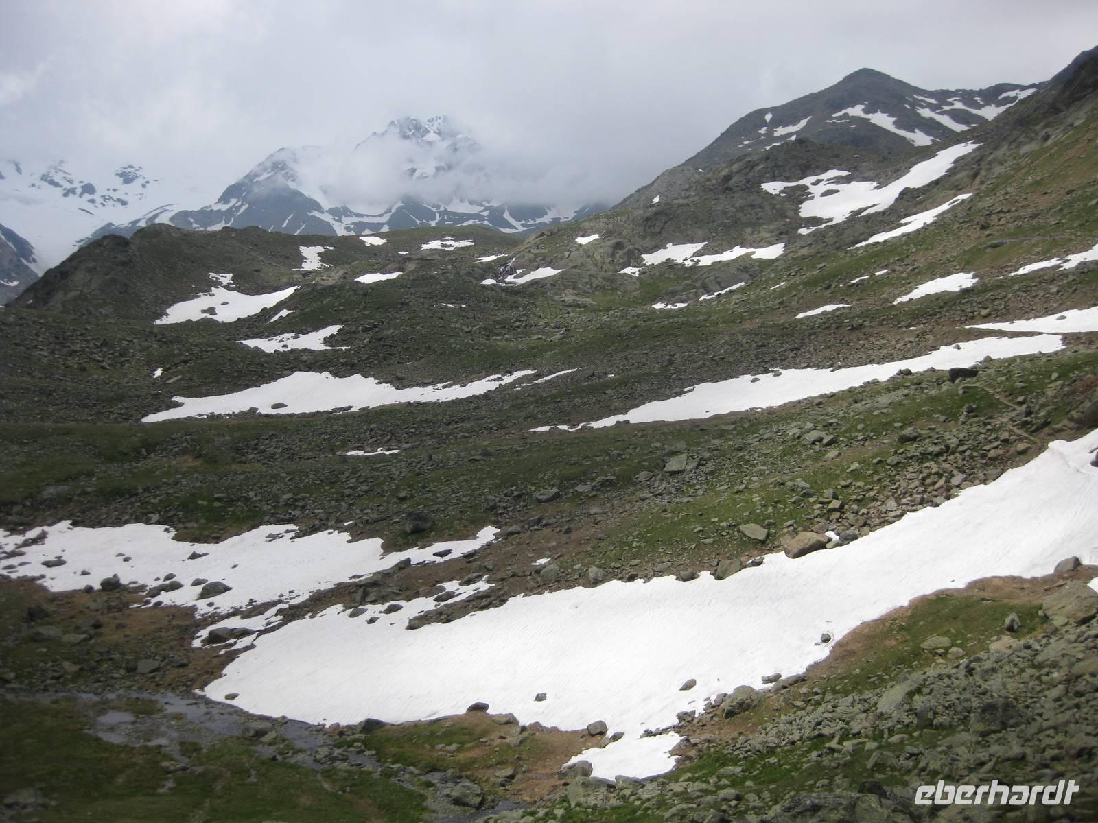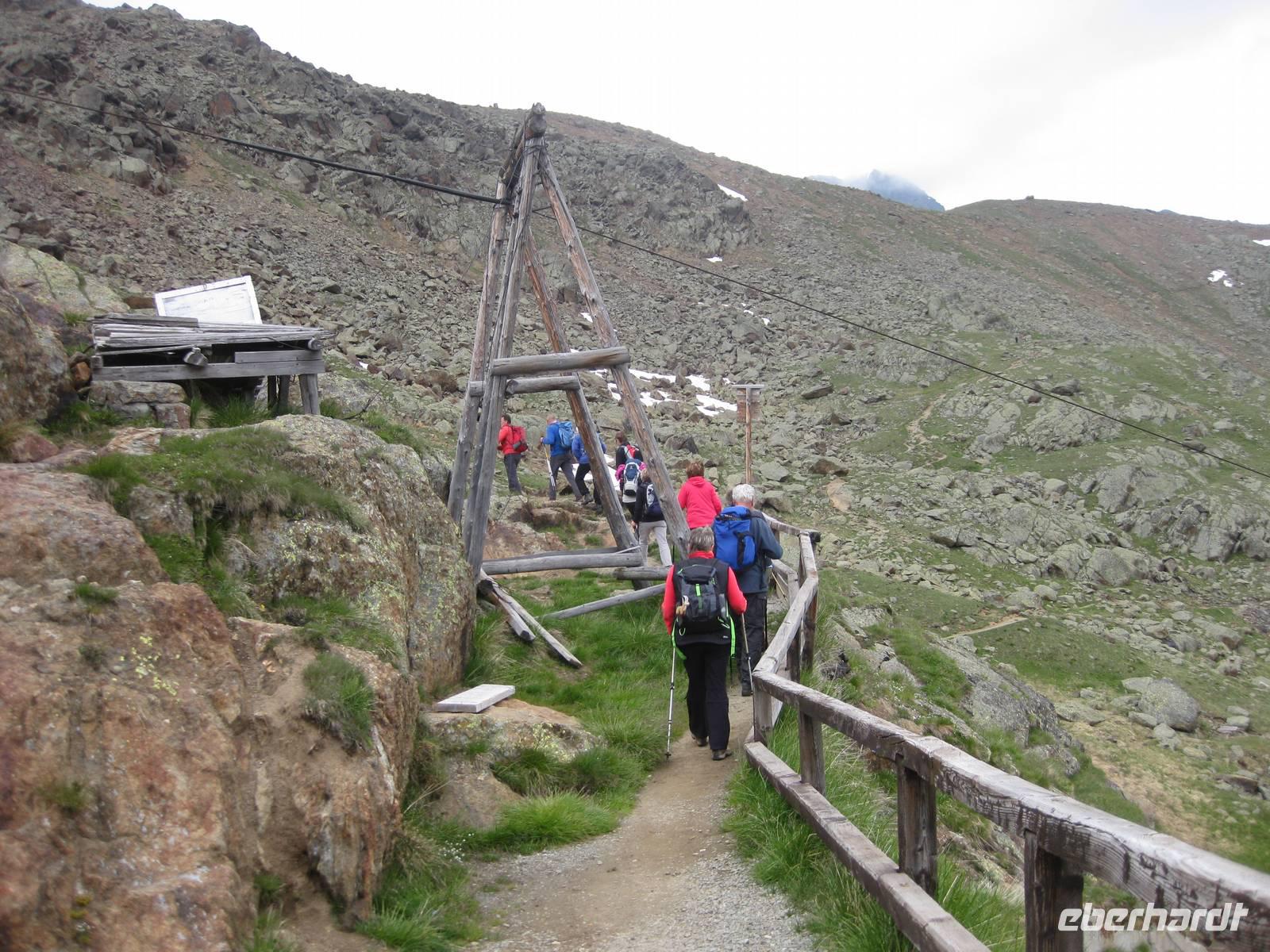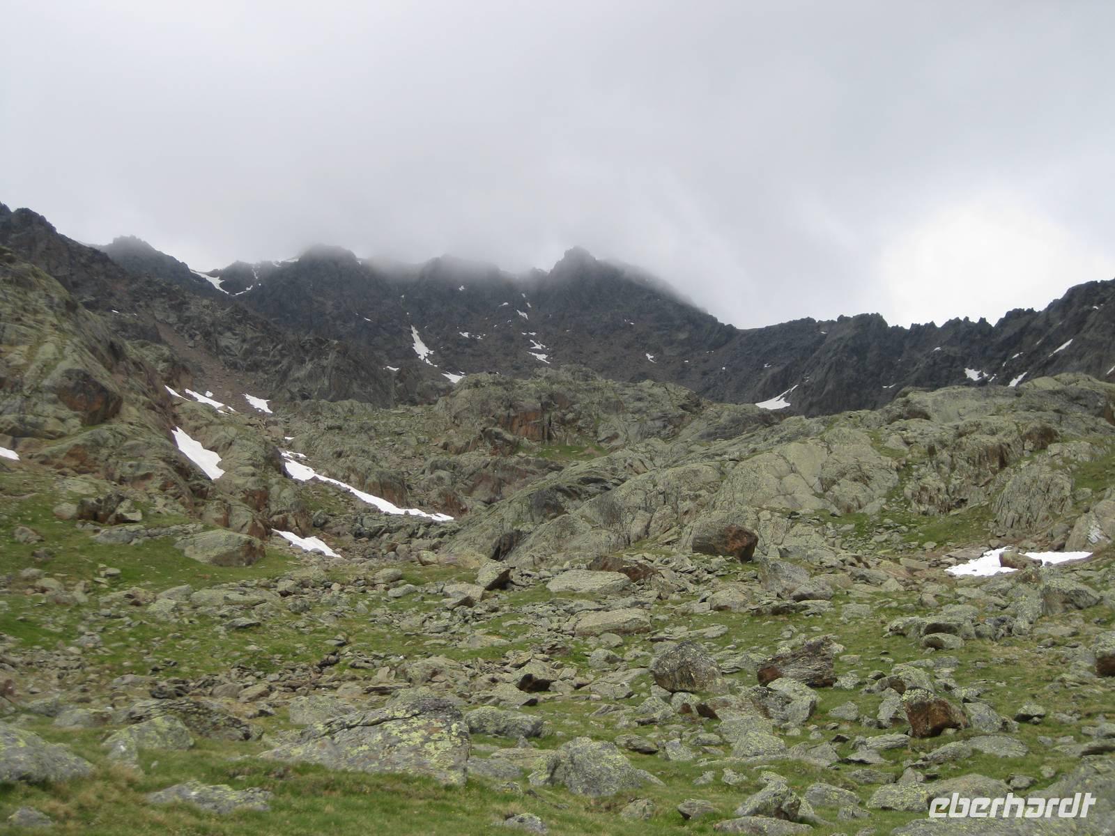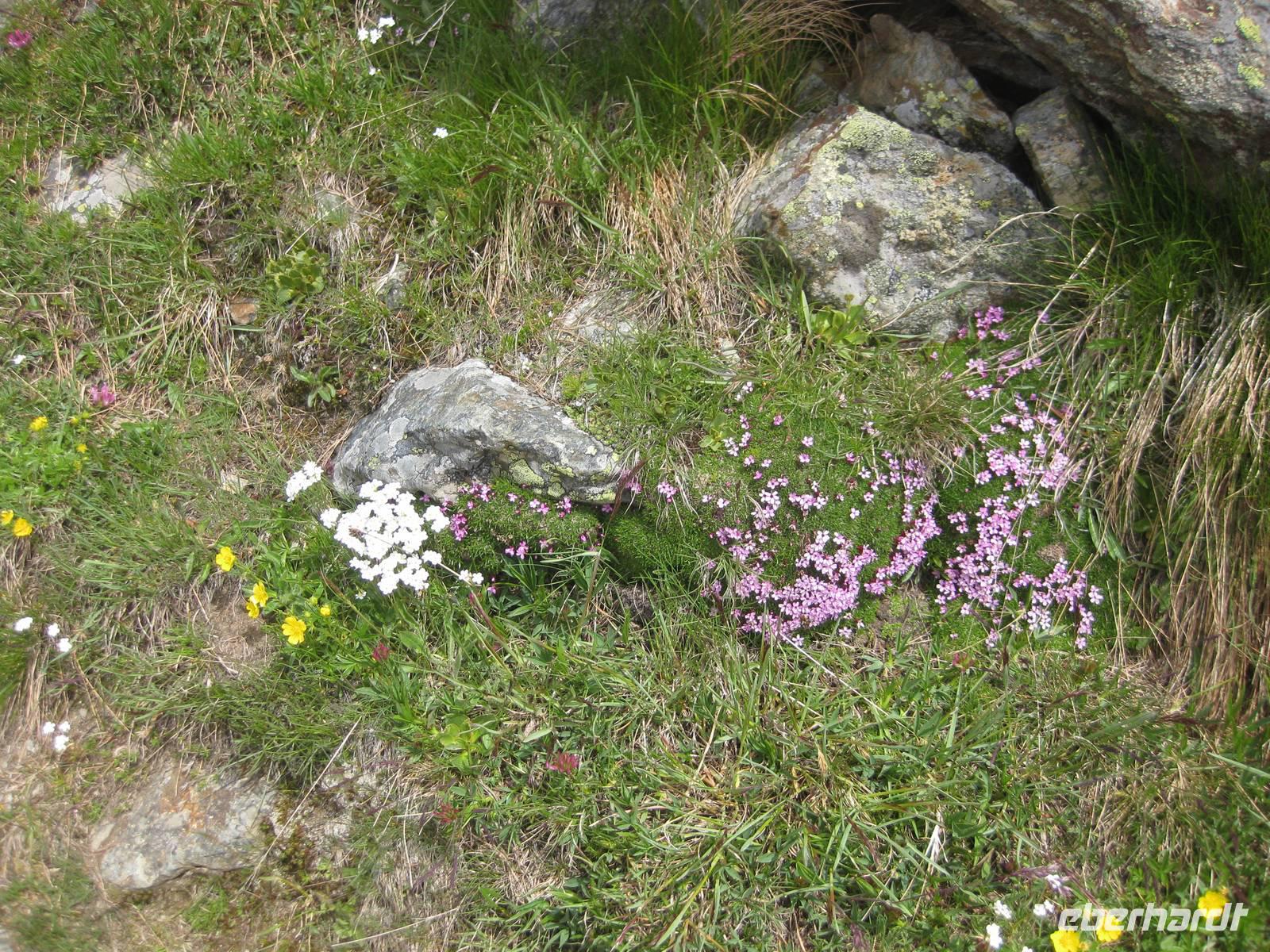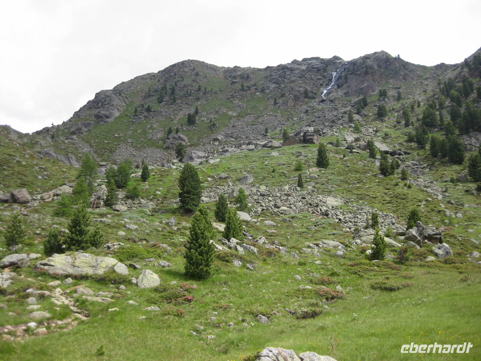 Auf geht's. Erst einmal eine ausgebaute Forststraße bis hinauf zum ersten Stausee. Wir passieren die Malga Mare in fast 2000 m Höhe. Dann geht es auf schmaleren, zum Teil steinigen Wanderwegen, mal leichter und mal steiler bergauf. Wir sind jetzt im Stilfserjoch Nationalpark unterwegs. Noch ist Vegetation vorhanden. Blauer niedriger Enzian und viele andere bunte Gebirgsblumen am Wegesrand erfreuen uns Wanderer. Wir überqueren die Ebene Pozza di Venezia. Hier gibt es noch Latschenkiefern und Gras und viele kleine Gebirgsbächlein. Bald kommen wir in ein Moränental und erblicken in der Ferne ziemlich weit oben unser erstes Ziel, die Larcher Hütte. Hier gibt es kaum noch Vegetation, nur niedrige Pflanzen wie Alpenrosen, Gebirgsblumen, Gras und Moos. Und man kann so richtig die früheren Spuren des Gletschers verfolgen. Der Weg oder besser Pfad geht in halber Höhe entlang und immer bergauf, einmal etwas mehr und einmal etwas weniger.