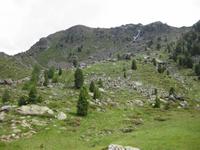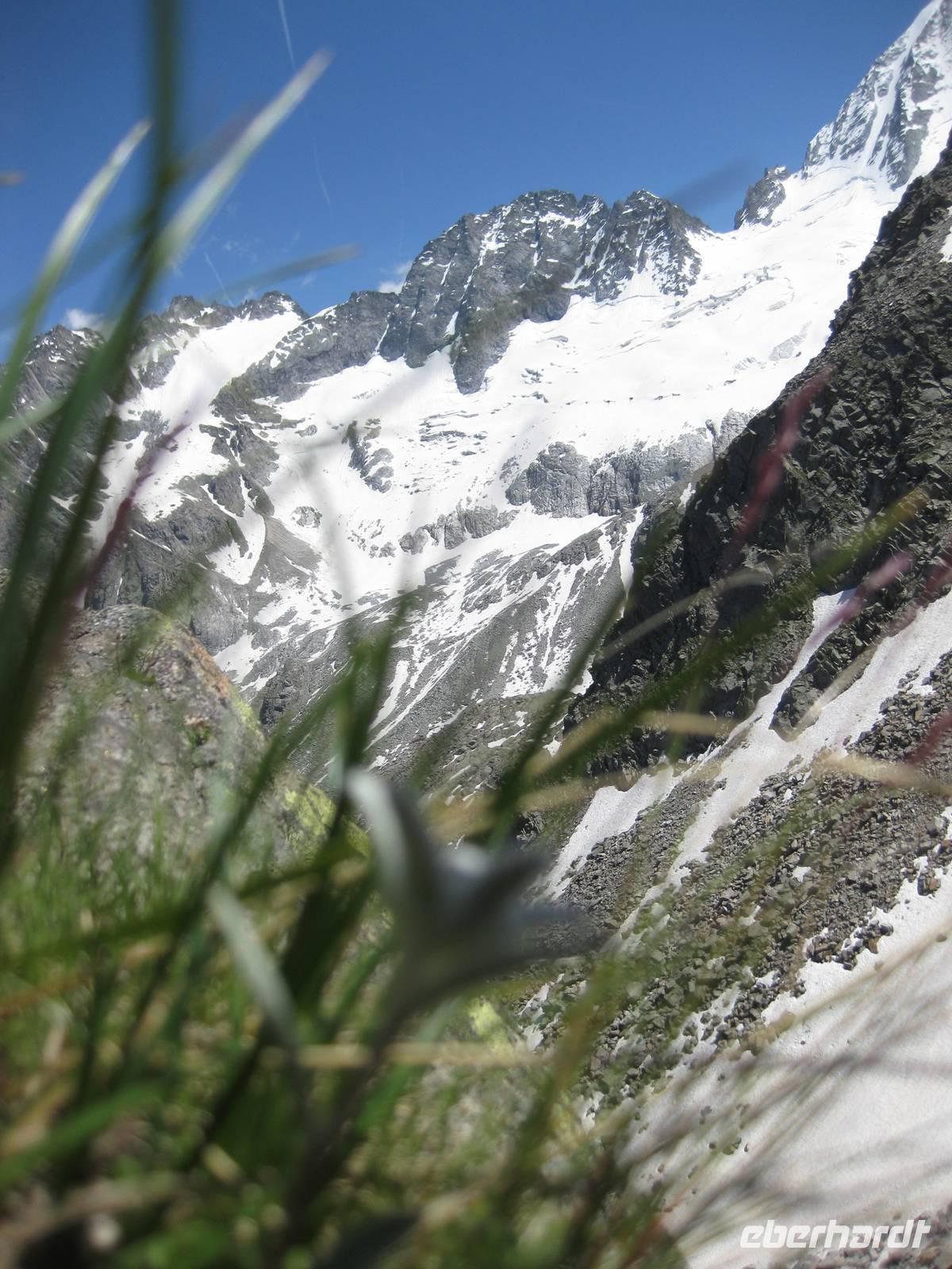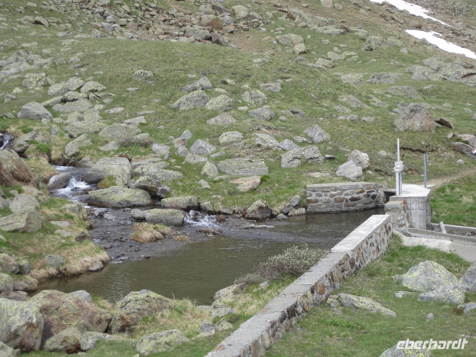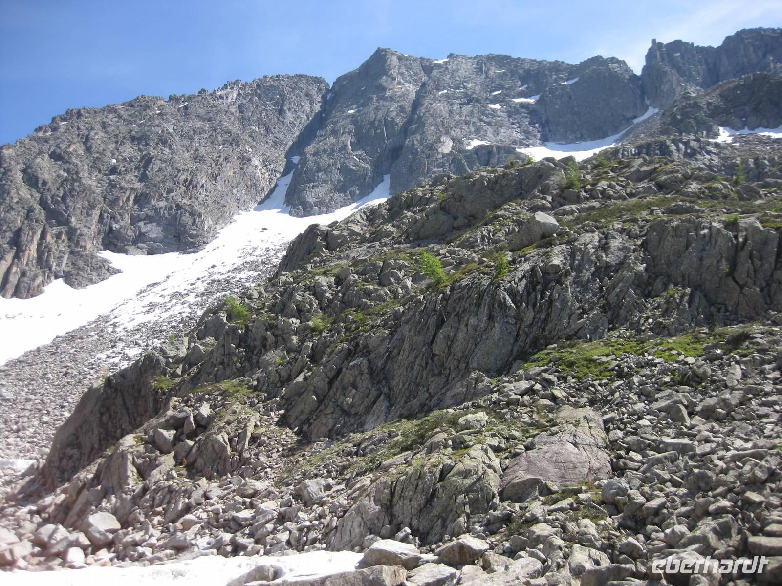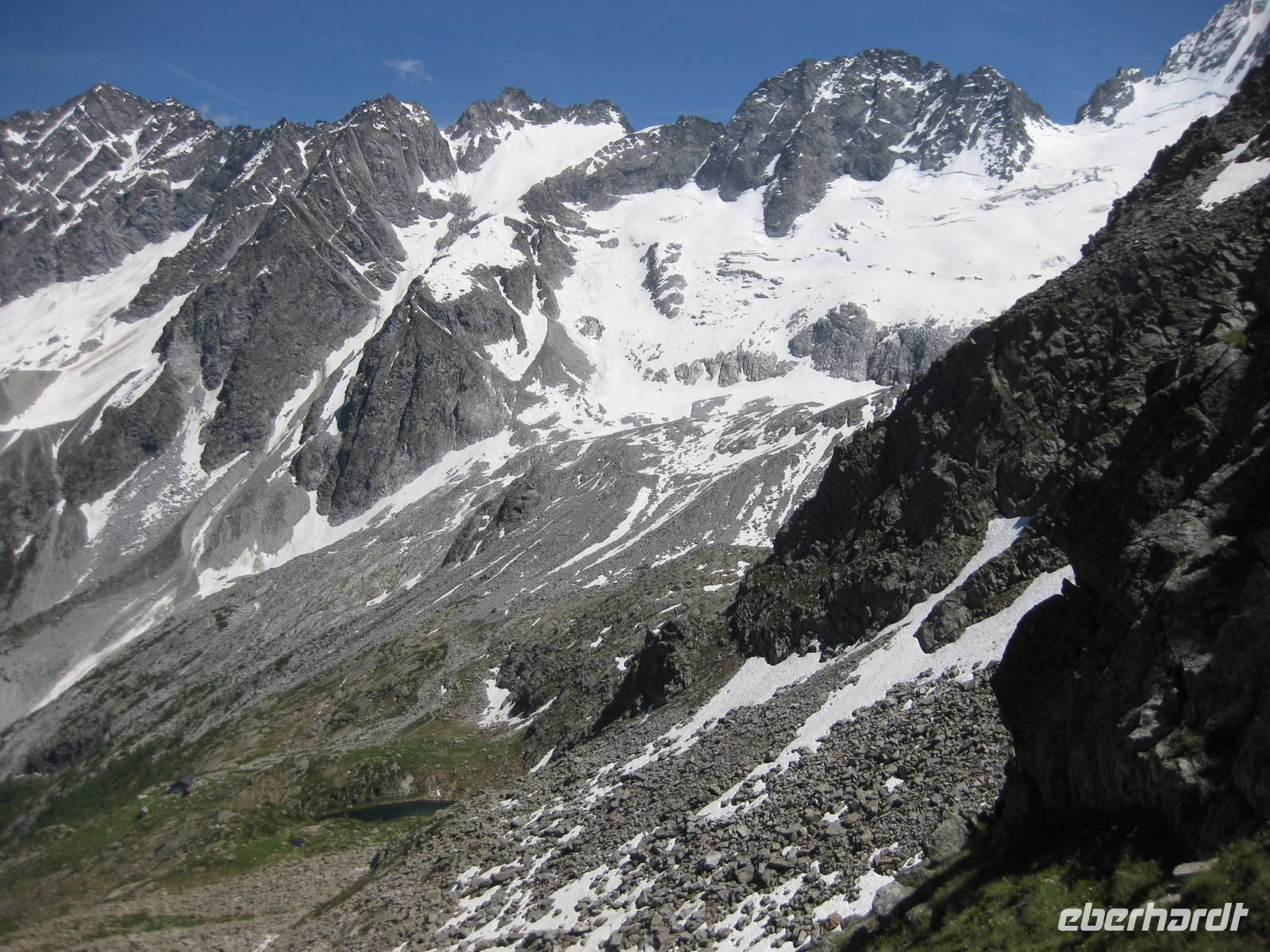 Auf geht's. Erst einmal eine ausgebaute Forststraße bis hinauf zum ersten Stausee. Wir passieren die Malga Mare in fast 2000 m Höhe. Dann geht es auf schmaleren, zum Teil steinigen Wanderwegen, mal leichter und mal steiler bergauf. Wir sind jetzt im Stilfserjoch Nationalpark unterwegs. Noch ist Vegetation vorhanden. Blauer niedriger Enzian und viele andere bunte Gebirgsblumen am Wegesrand erfreuen uns Wanderer. Wir überqueren die Ebene Pozza di Venezia. Hier gibt es noch Latschenkiefern und Gras und viele kleine Gebirgsbächlein. Bald kommen wir in ein Moränental und erblicken in der Ferne ziemlich weit oben unser erstes Ziel, die Larcher Hütte. Hier gibt es kaum noch Vegetation, nur niedrige Pflanzen wie Alpenrosen, Gebirgsblumen, Gras und Moos. Und man kann so richtig die früheren Spuren des Gletschers verfolgen. Der Weg oder besser Pfad geht in halber Höhe entlang und immer bergauf, einmal etwas mehr und einmal etwas weniger.